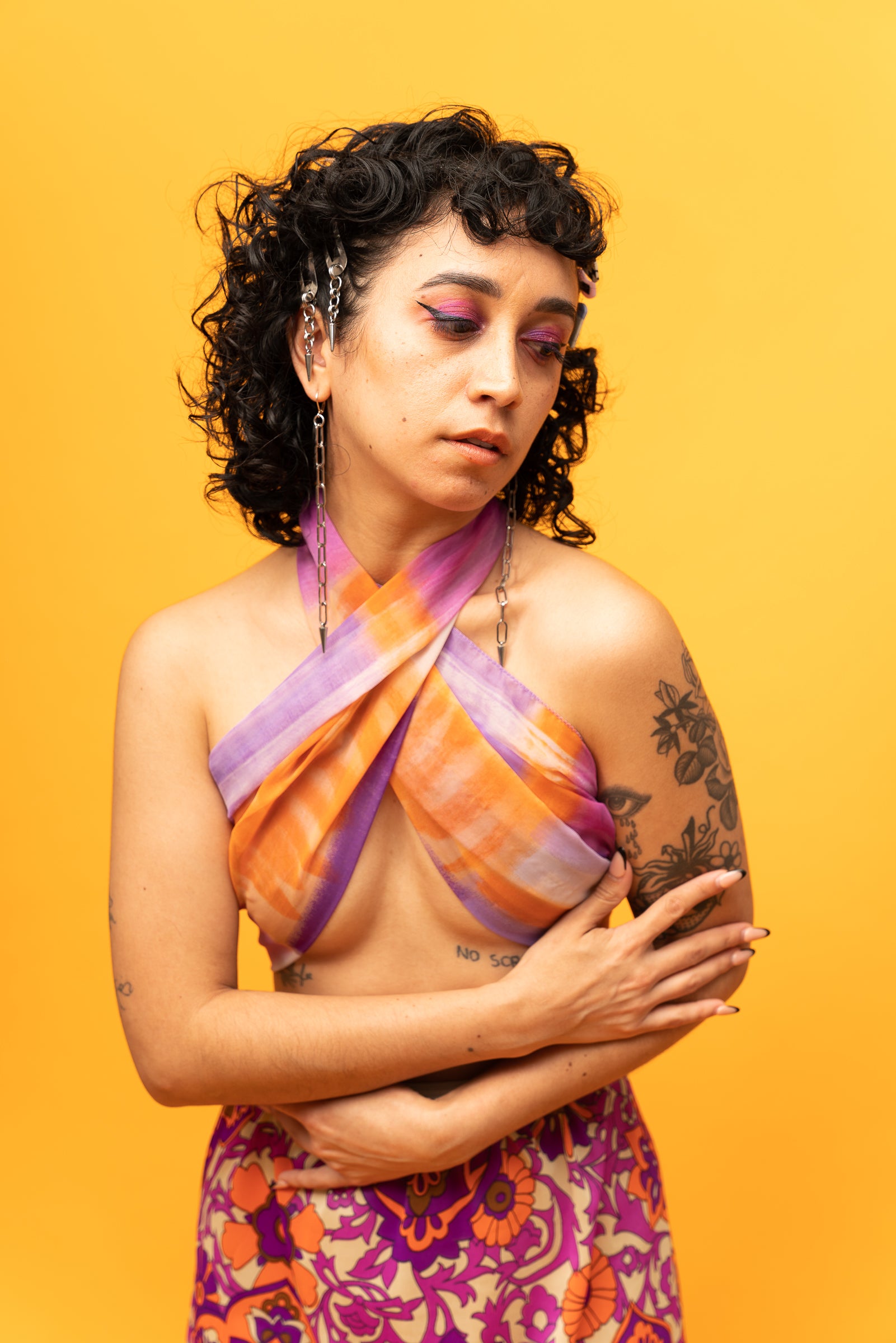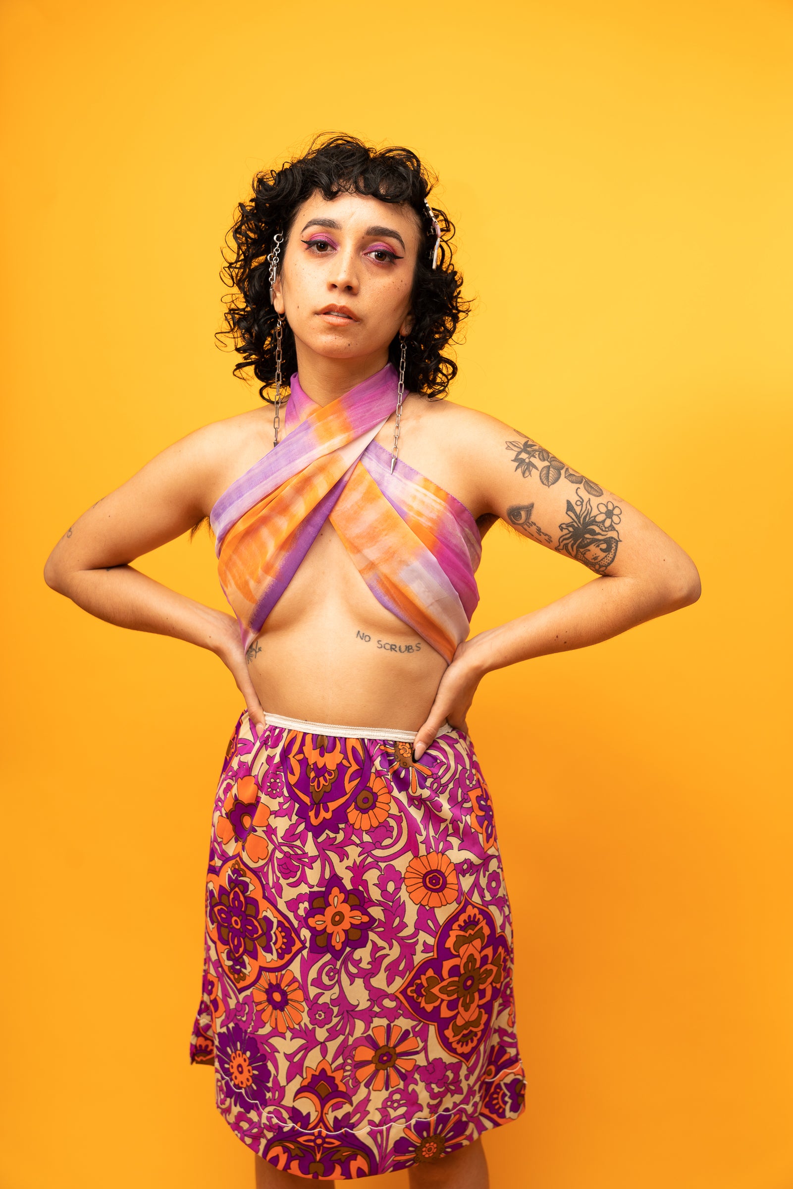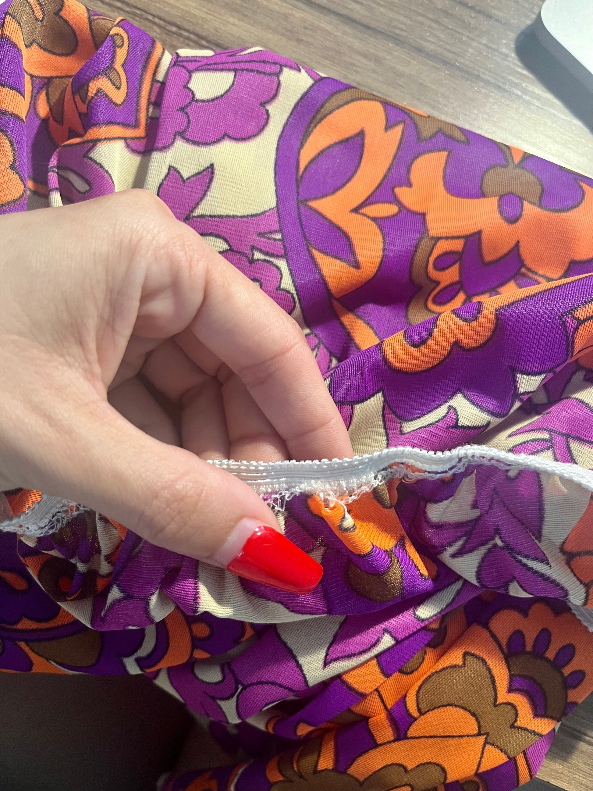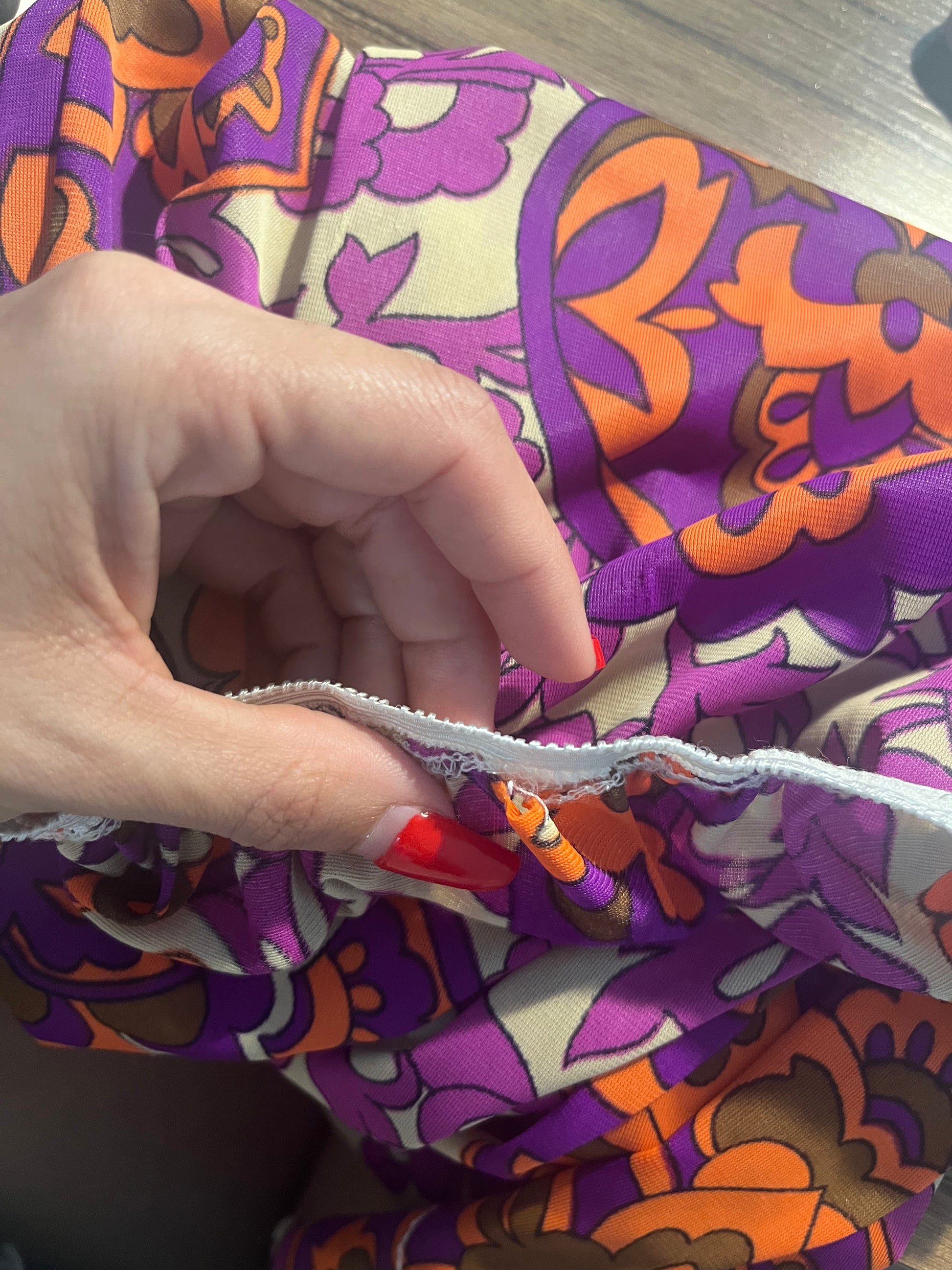 Vintage 60s half slip skirt with an ornate purple/ orange pattern. This pattern & saturated color on a slip skirt is so unique! Pair with your fave scarf or boxy cropped tee for a cute summery look. Fabric is light and stretchy-- feels like nylon. No tags. Best fits an XS-M. Seen on Justina.