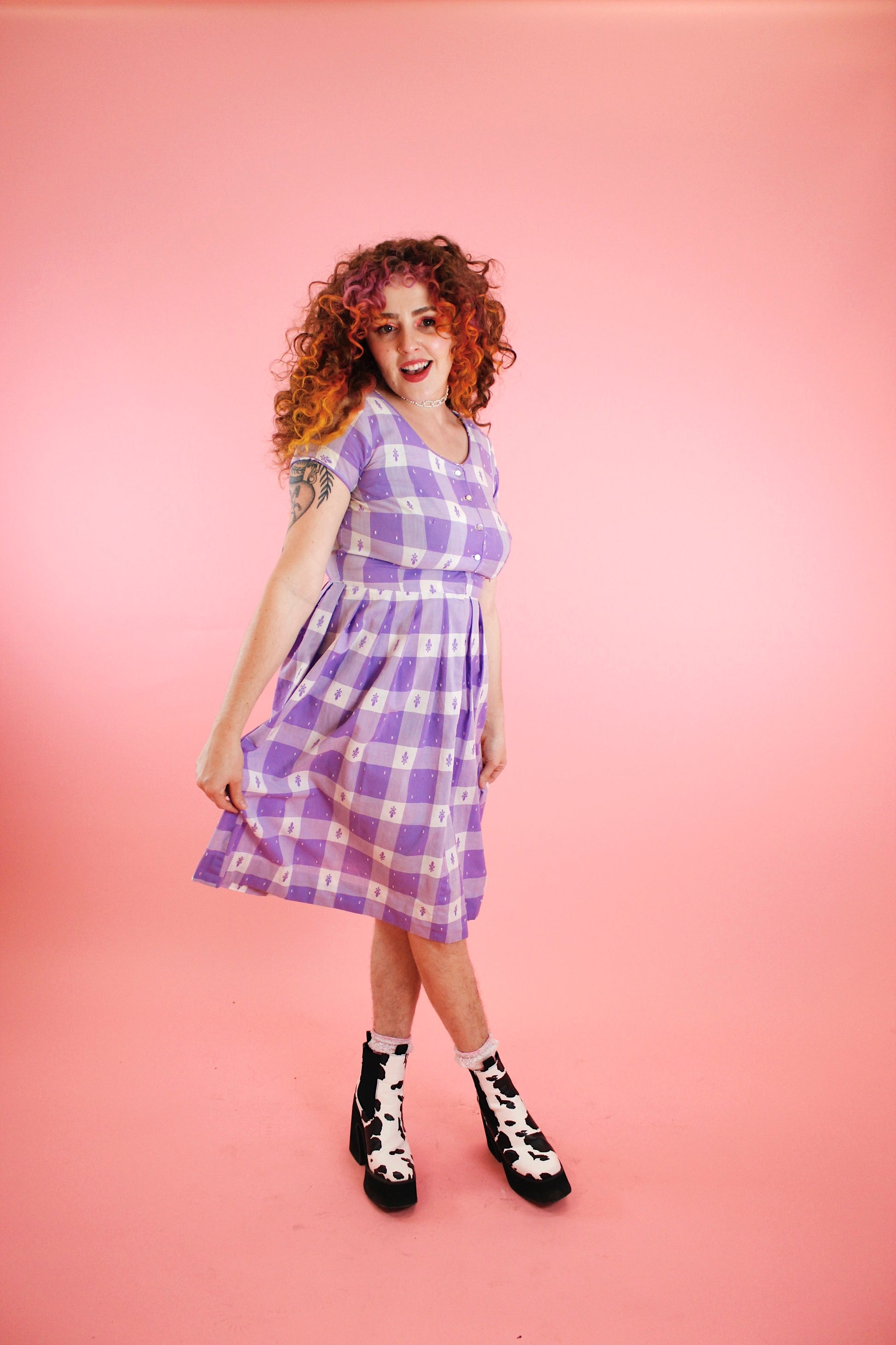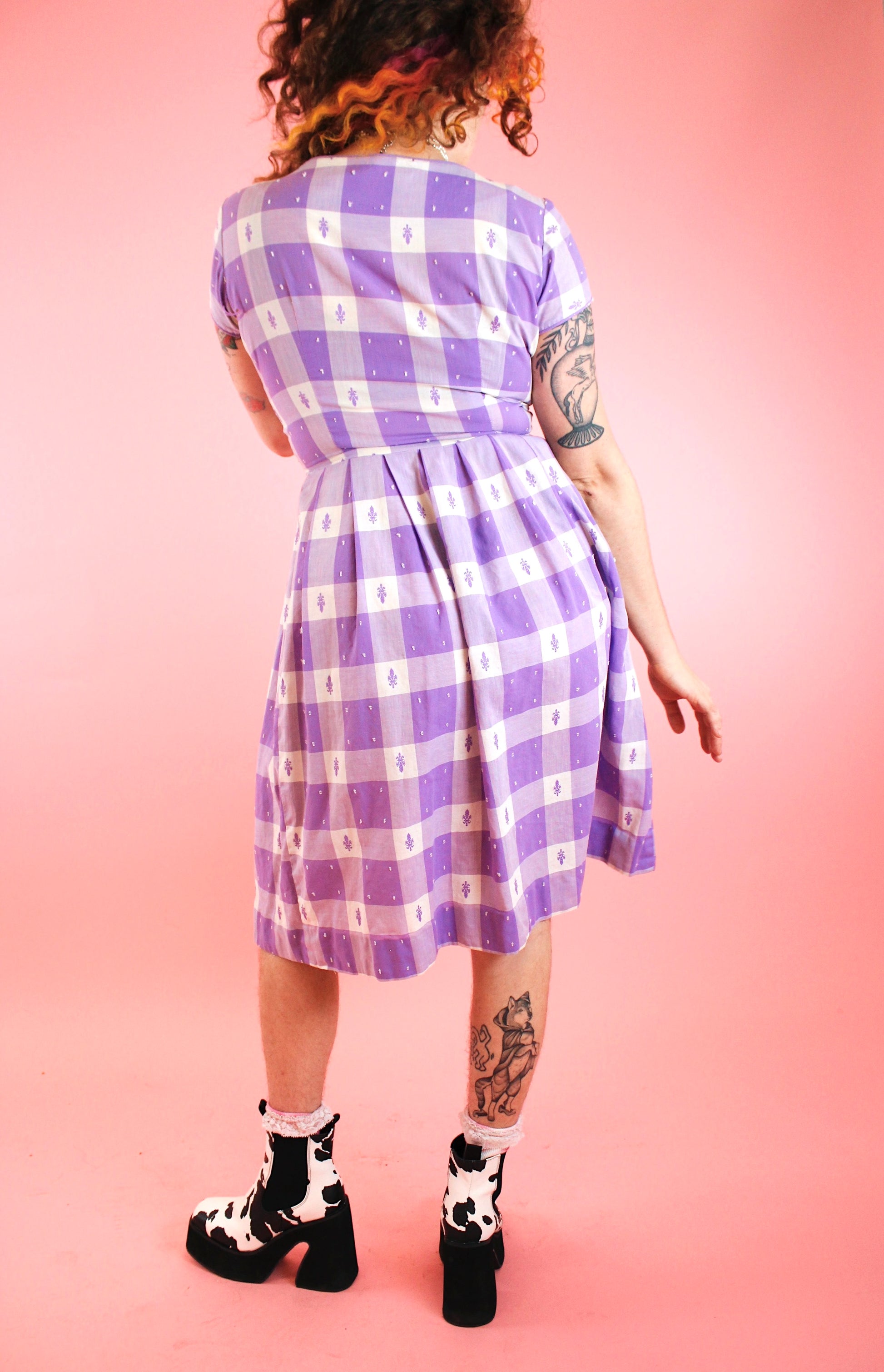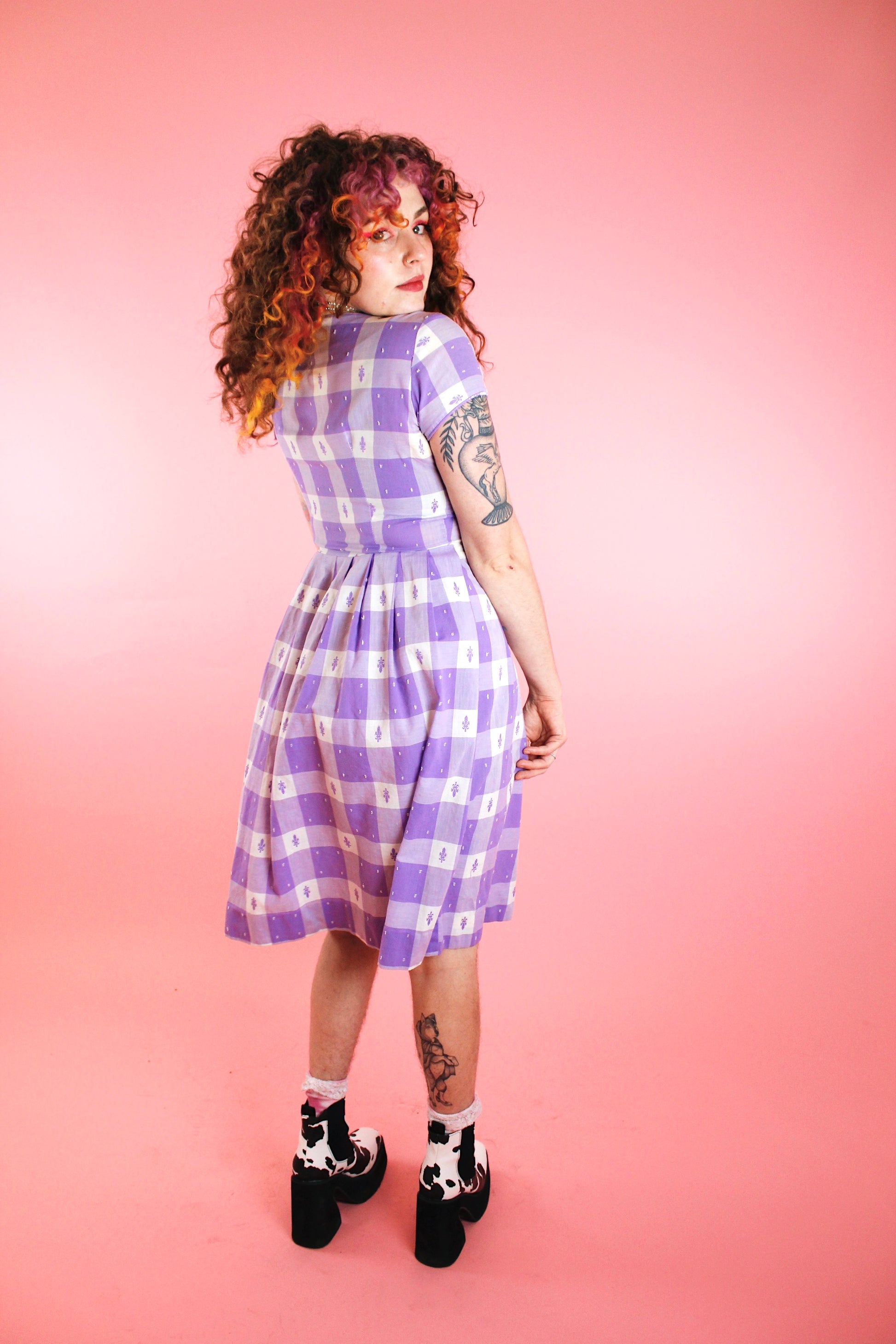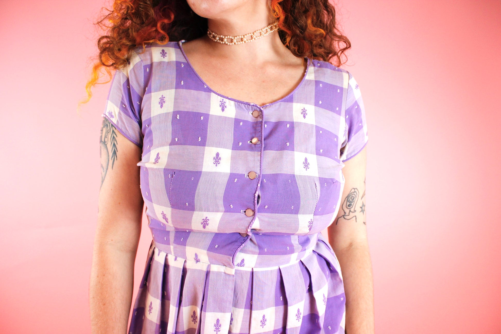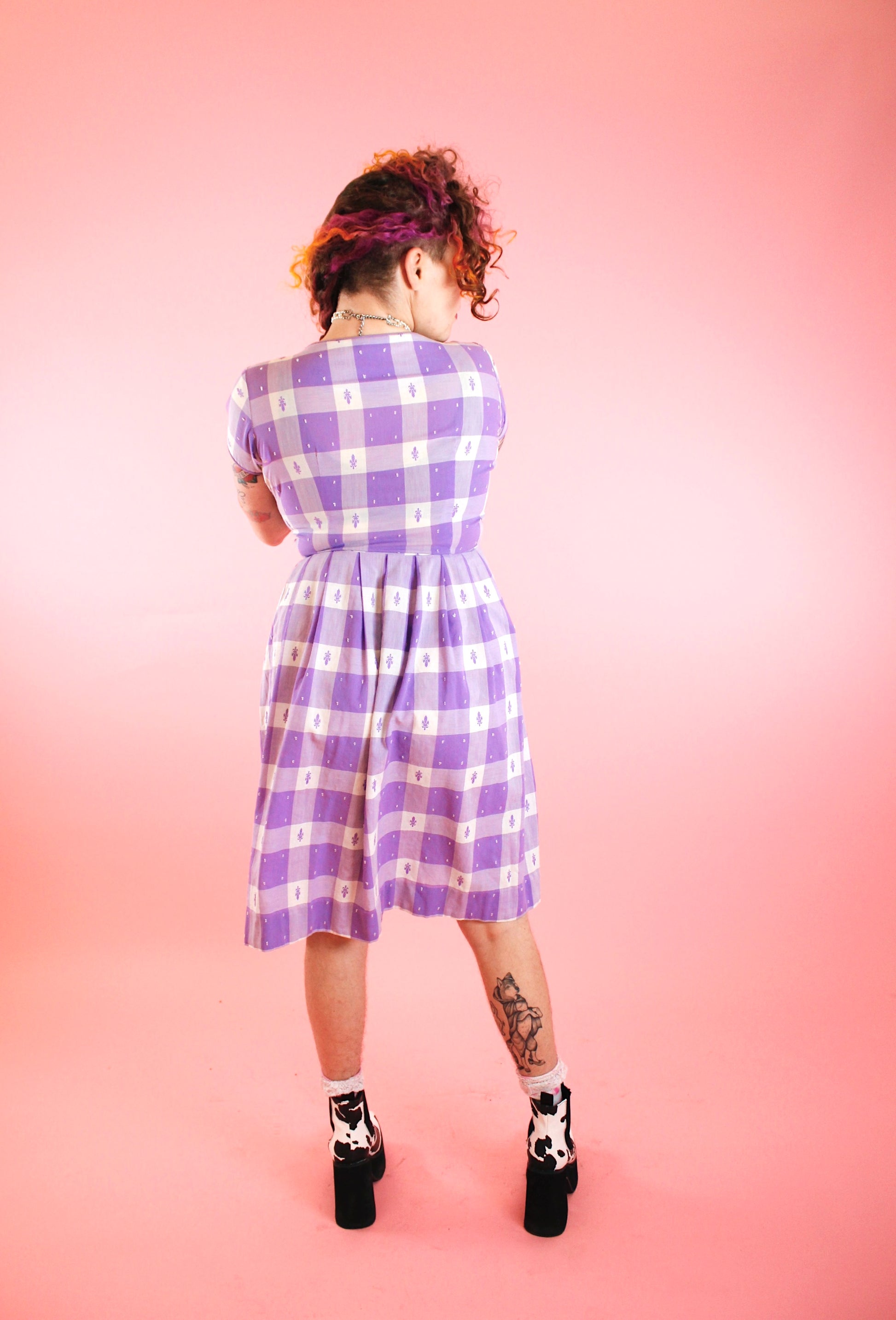 Vintage 50s jumbo gingham print babydoll dress in a fun lavender color. A classic & effortless cottage look. Has semi-translucent pearl pink buttons along the chest. Handmade, fabric feels like a light cotton. Best fits a S-M. Seen on Bailey (fit was a bit snug on the chest & waist, would be best on somebody a tad bit smaller to avoid stressing the fabric).