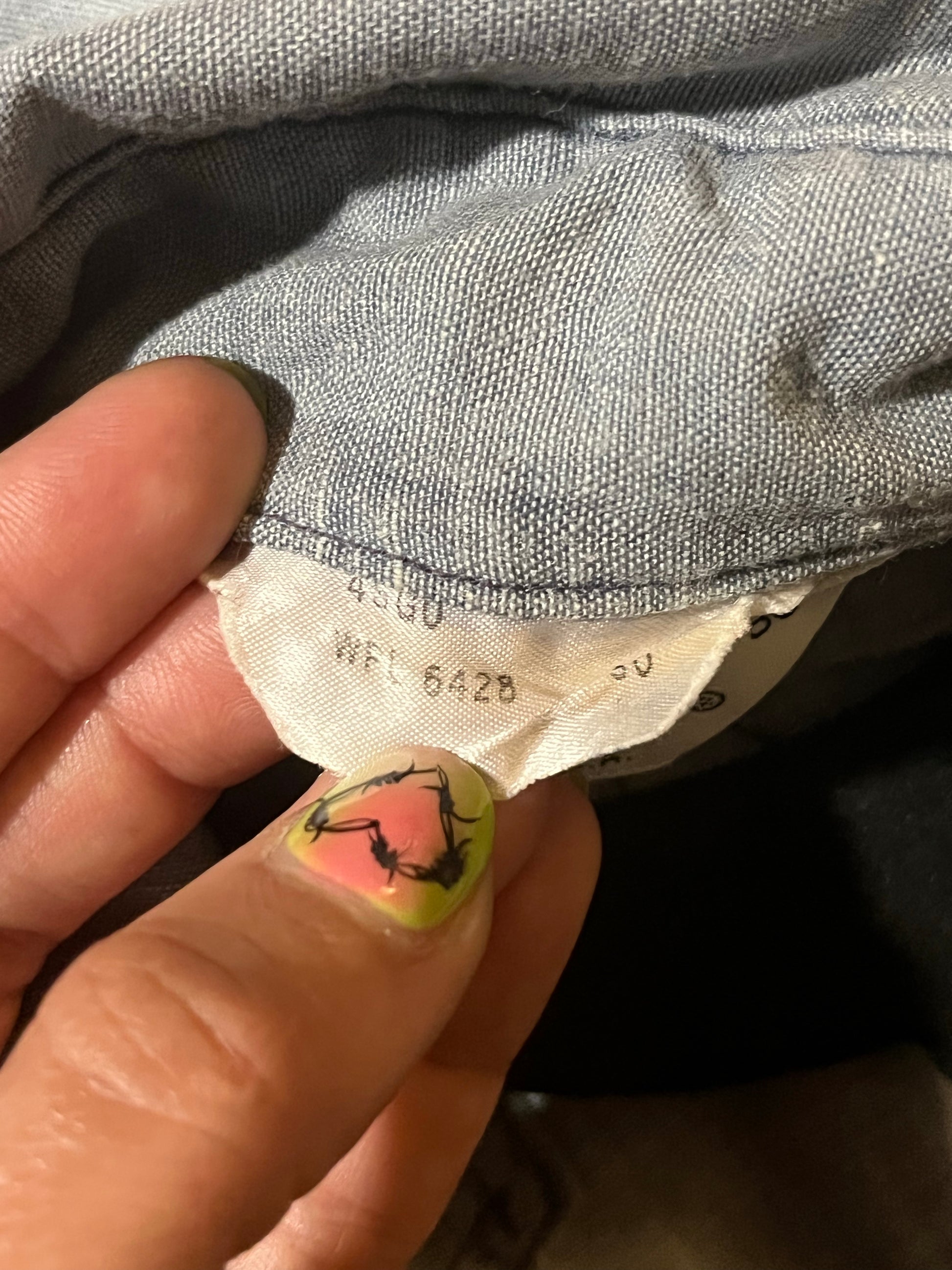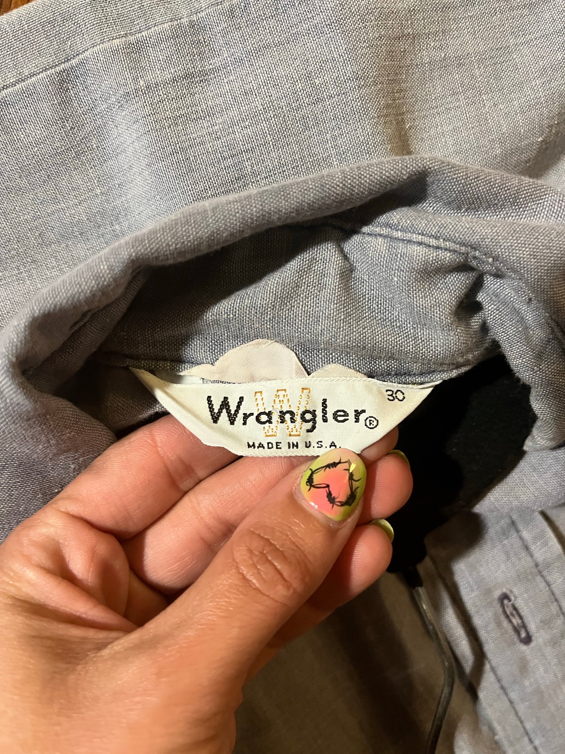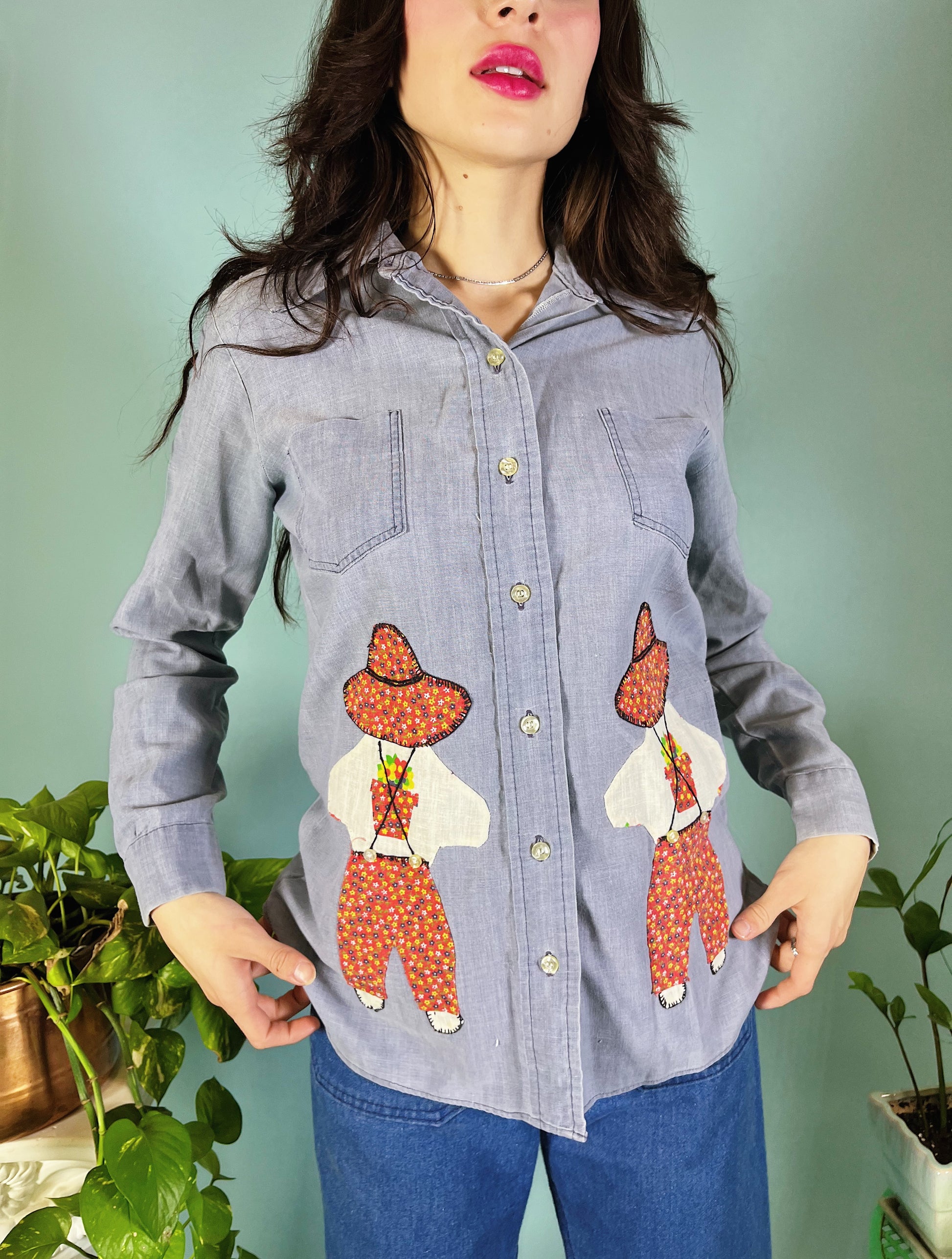 Vintage 60s/70s washed chambray Wrangler button up with hand stitched applique sunbonnet sue patches. So charming! We love the pointy collar and contrast stitching details. Tag size 30. Best fits a S. Seen on Angelica.