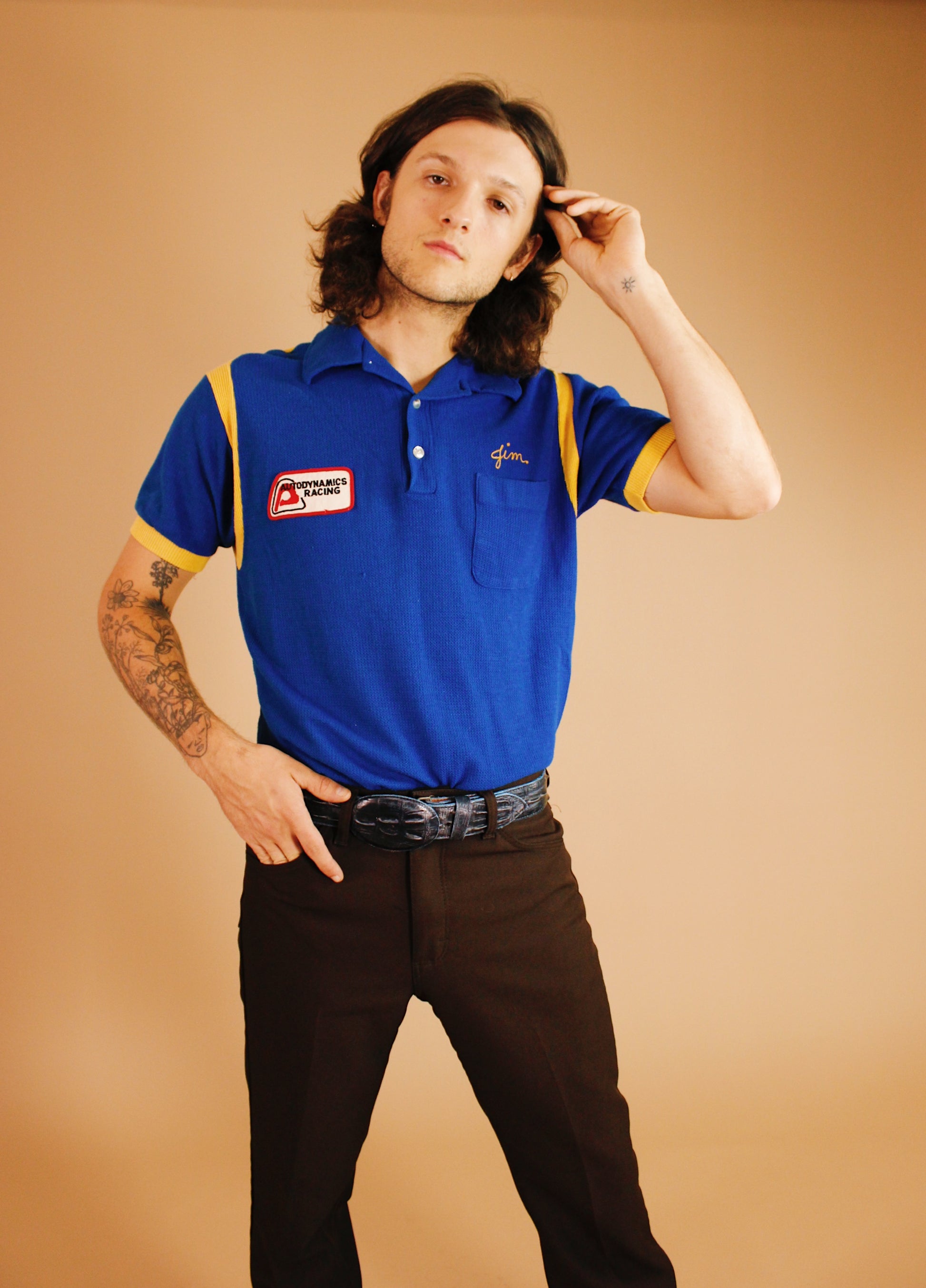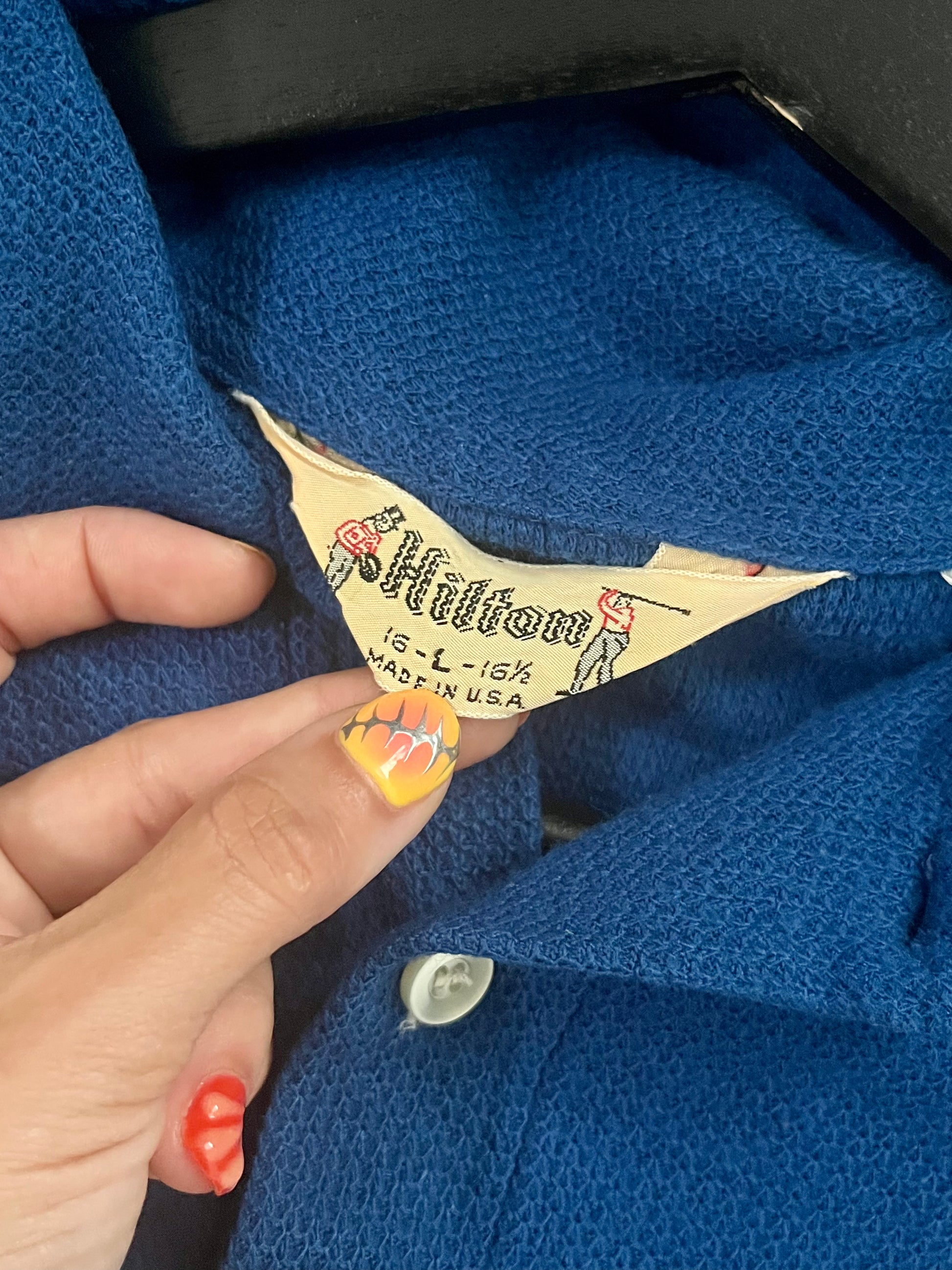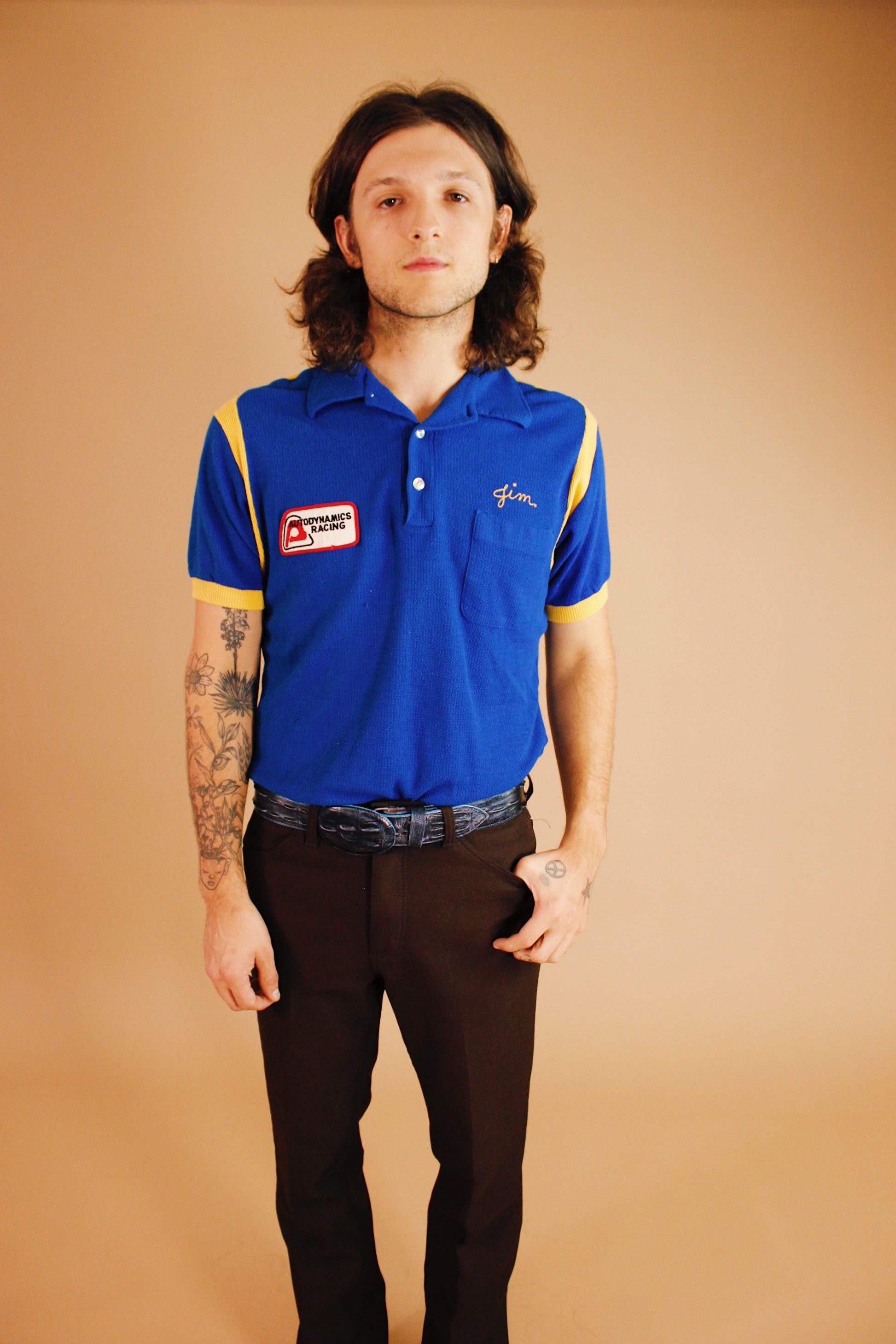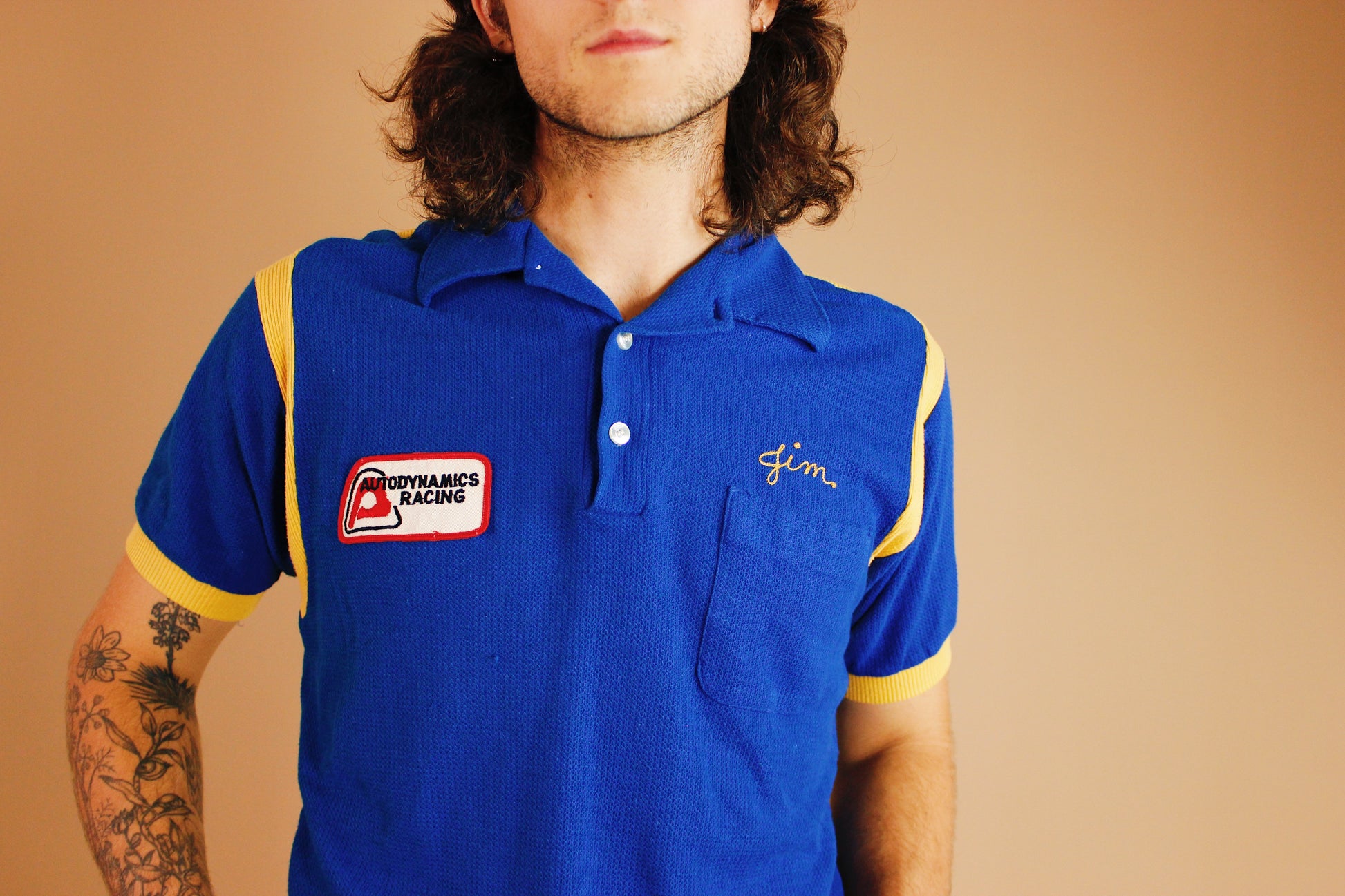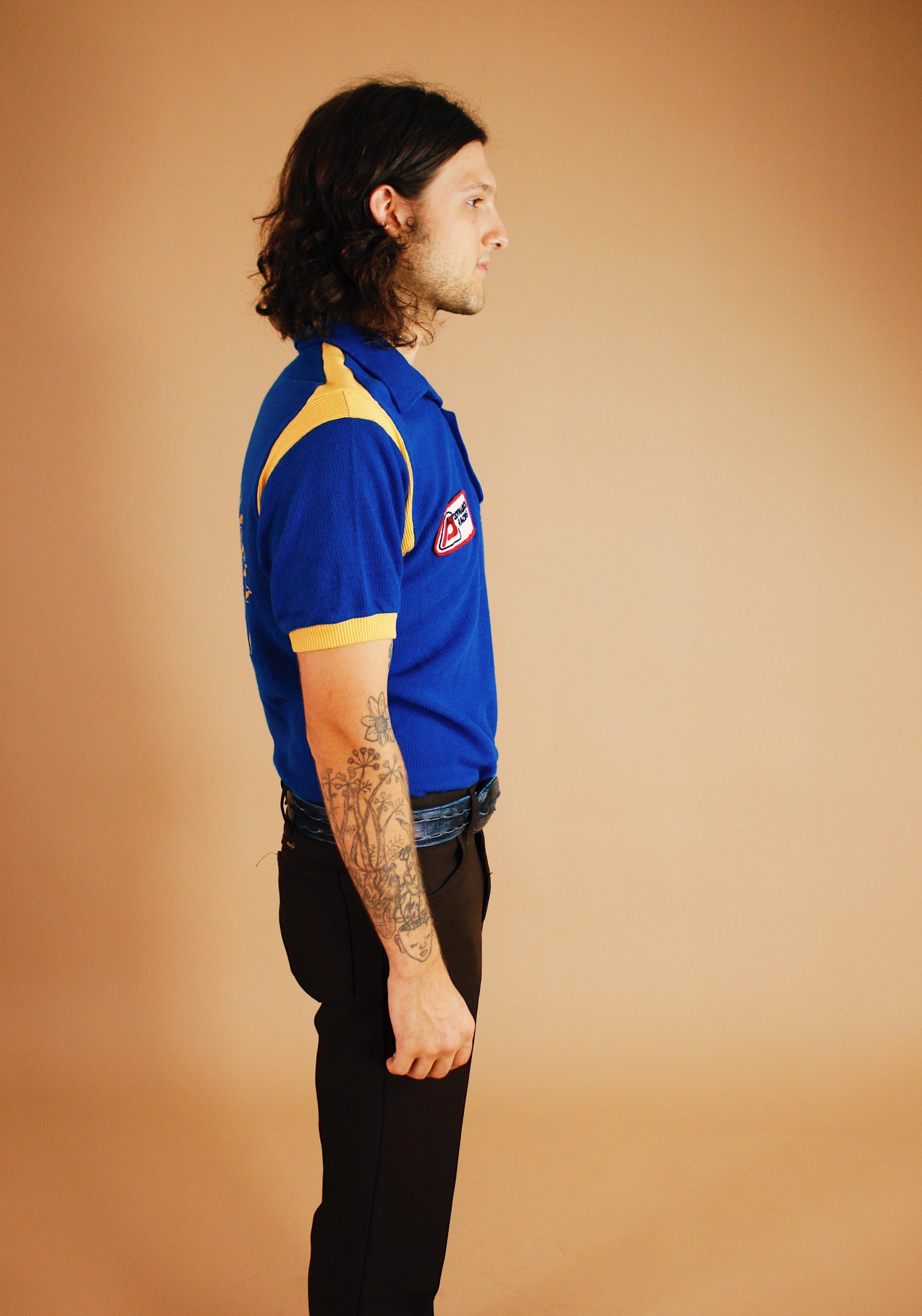 Vintage 60s knit blue and yellow henley racing shirt. Love all of the personal details on this one! From the auto racing patch, chain stitched name, and "sokoby brothers" back graphic there is so much character. It's a wearable piece of history! On a Hilton golf shirt. Tag size L/ 16 1/2, Made in USA. Best fits a M-L. Seen on Sky.