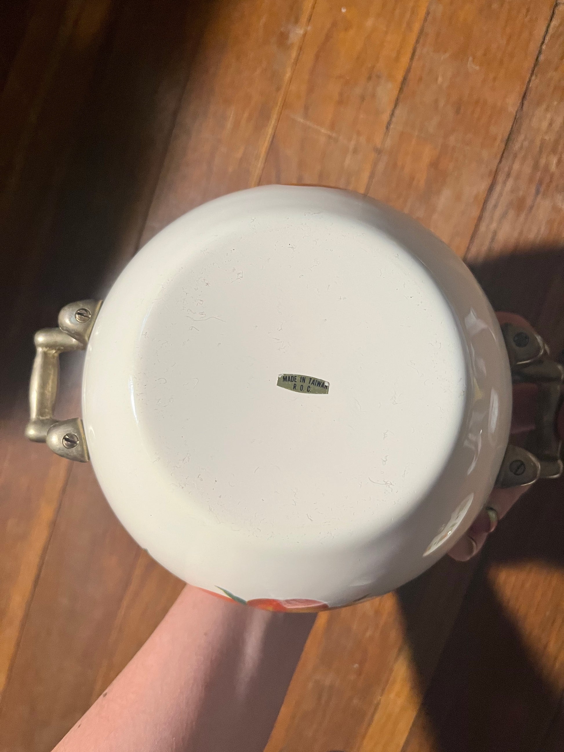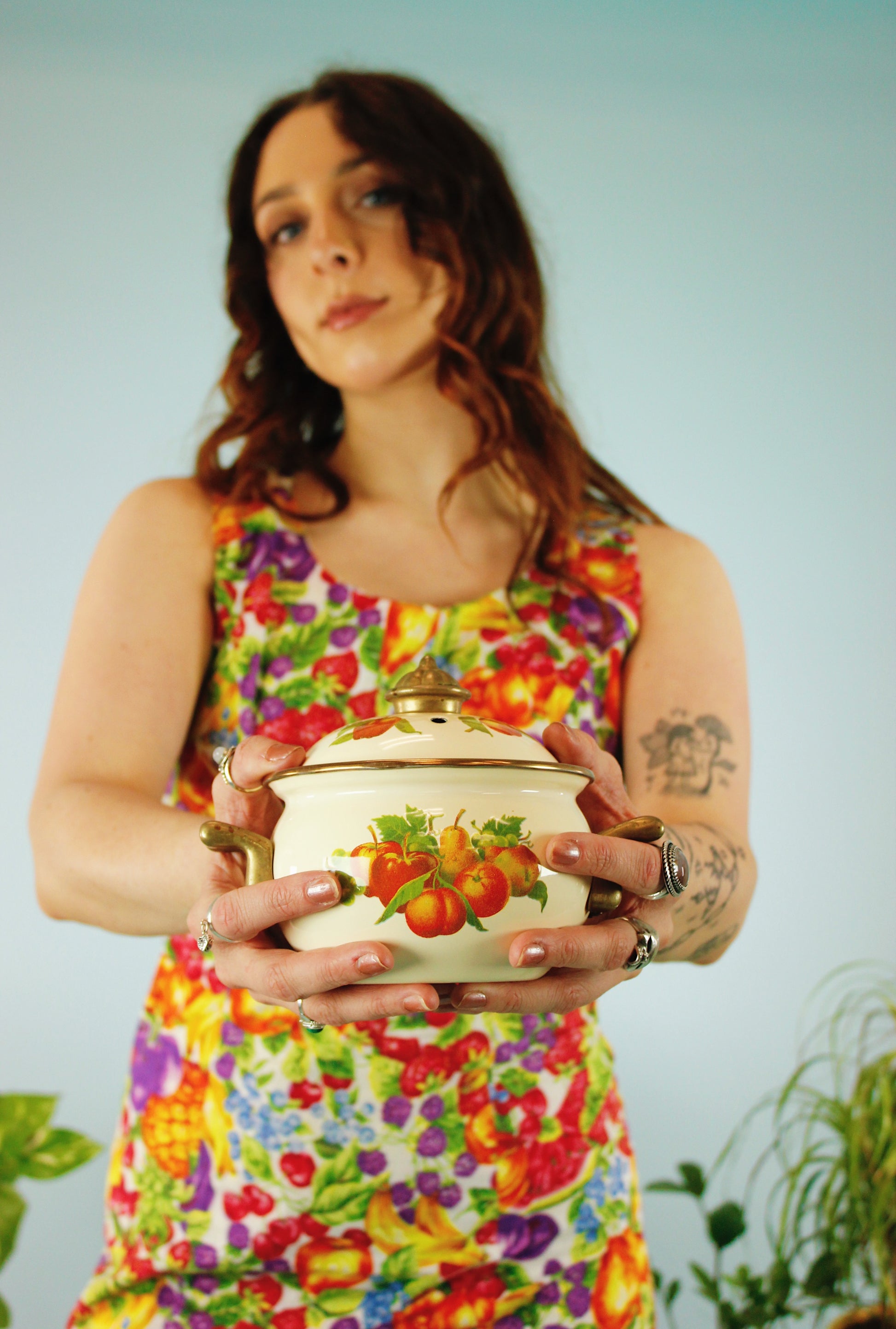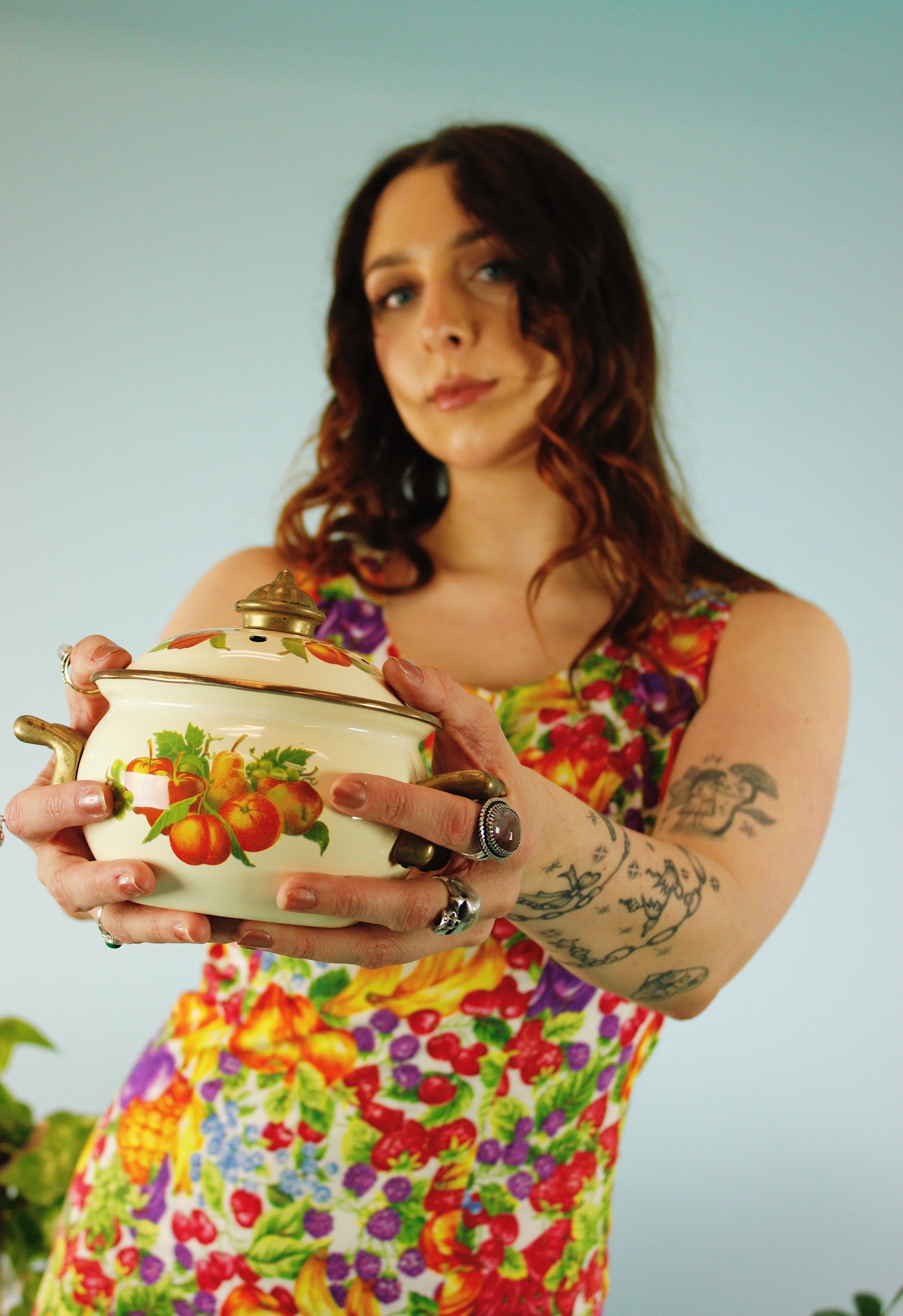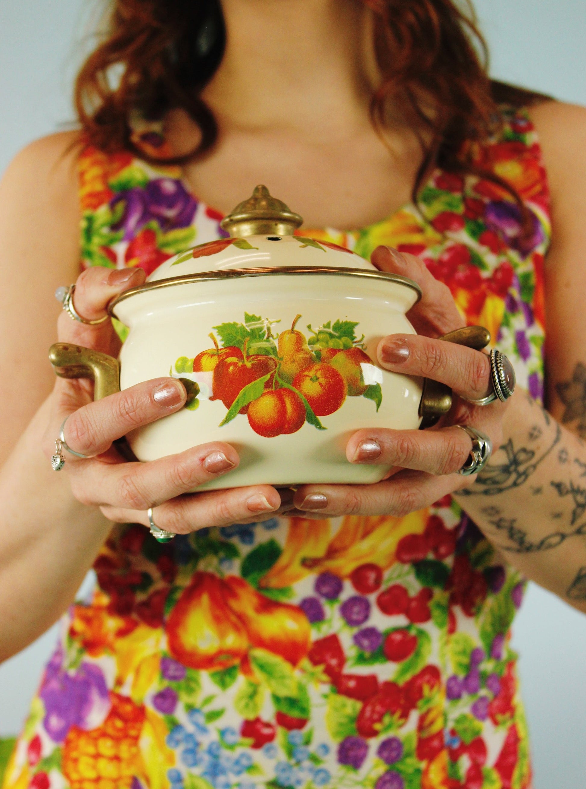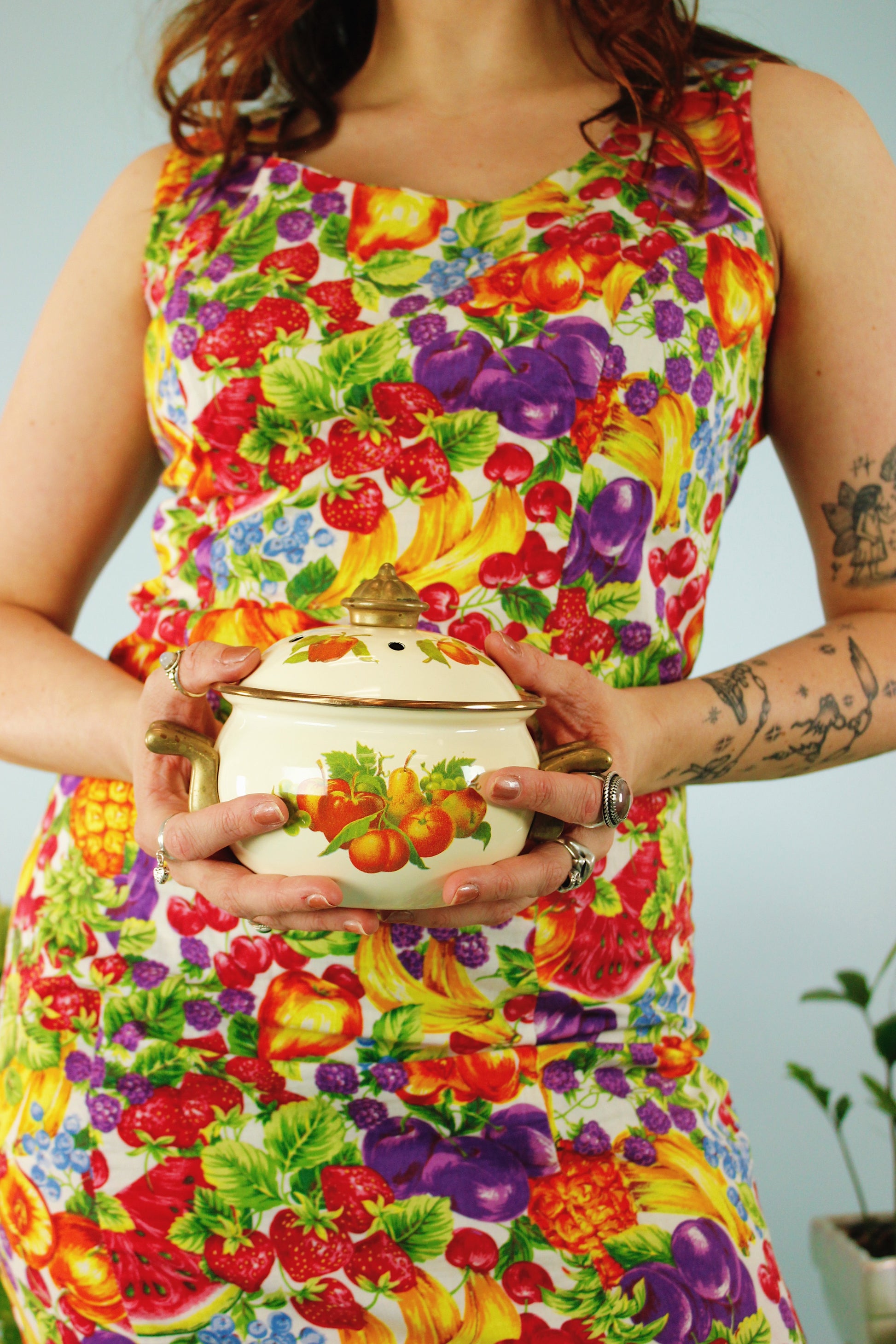 Vintage enamel pot with still life fruit art and brass handles/ lid tip. Love the warm colors and kitschy vibes! Can be used in the kitchen or get creative and make it a planter, office organizer, or anything you set your mind to!