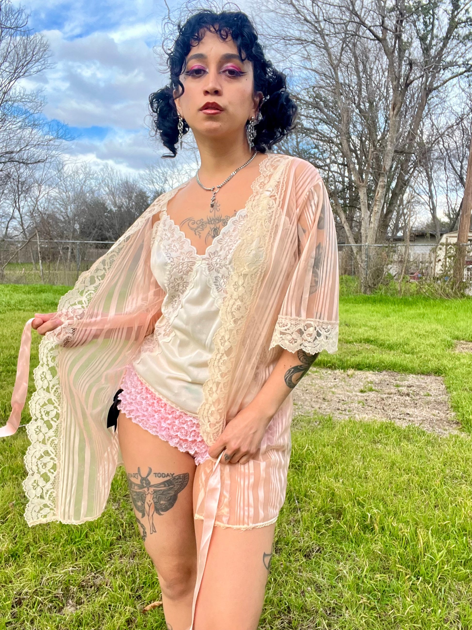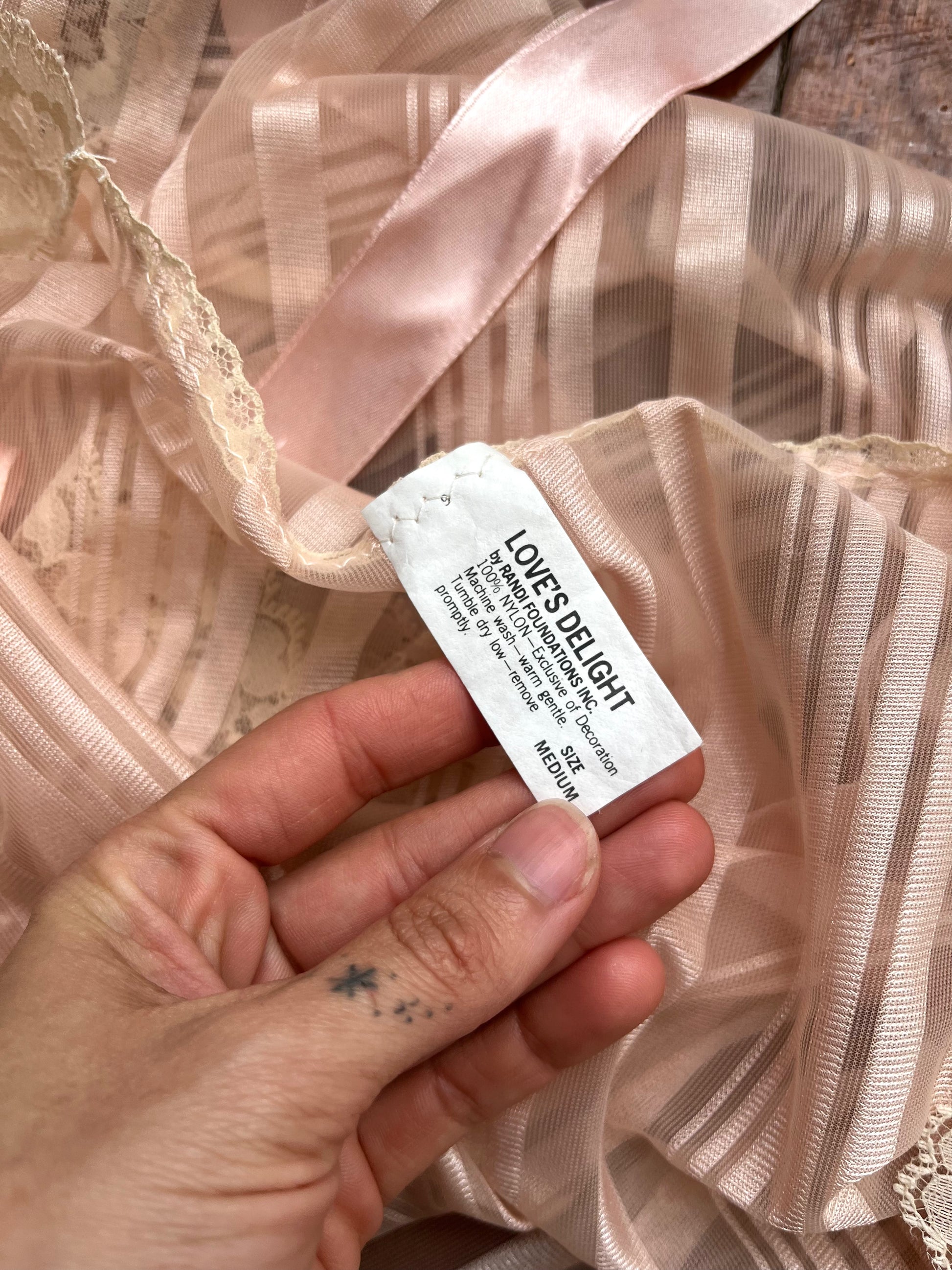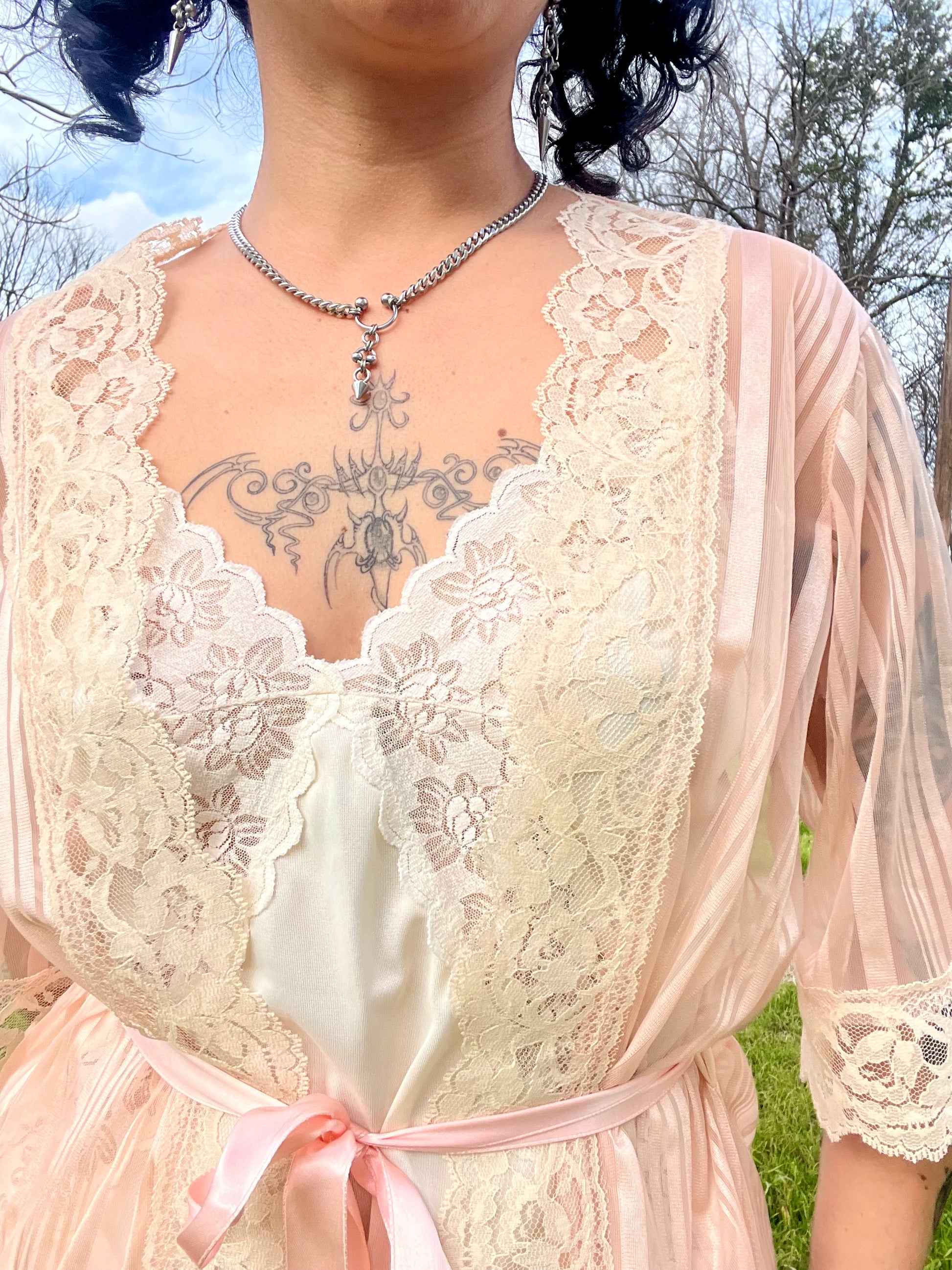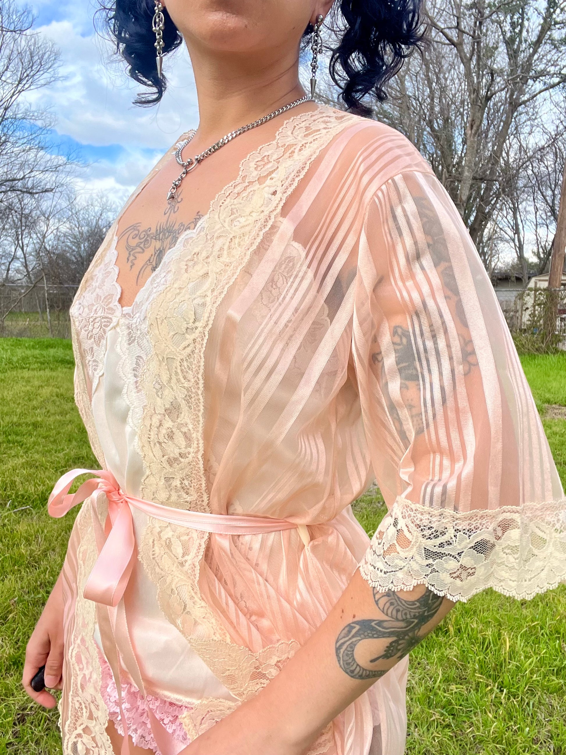 Vintage 70s satin pink & mesh striped robe with beautiful lace details. Comes with a matching pink ribbon. "Love's Delight" by Randi Foundations Inc. 100% Nylon. Tag size M. Best fits an XS-M. Seen on Justina.