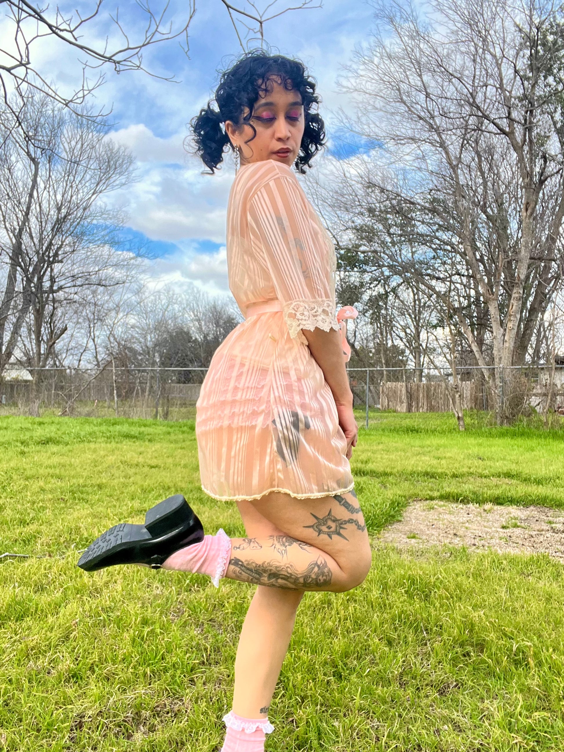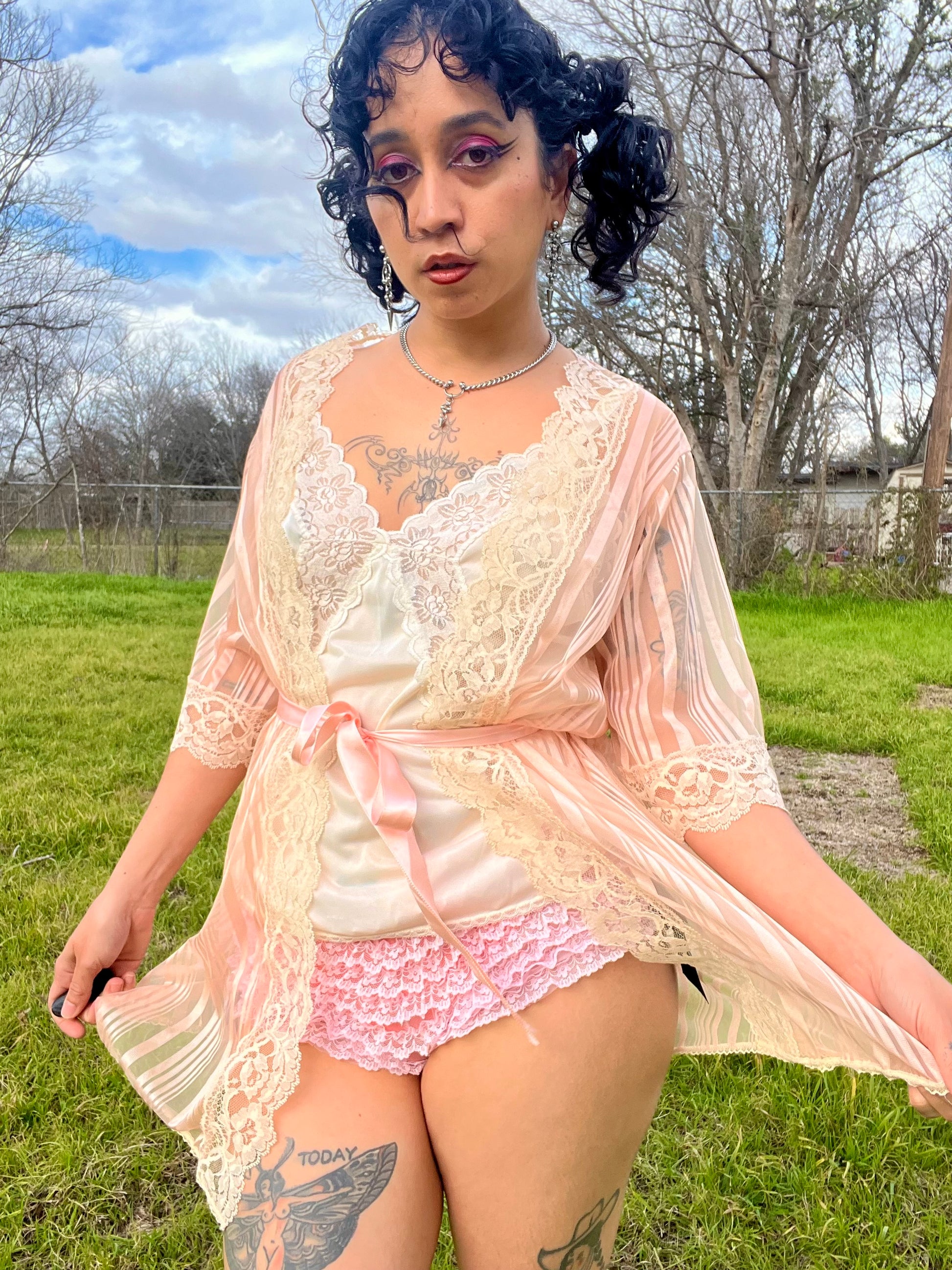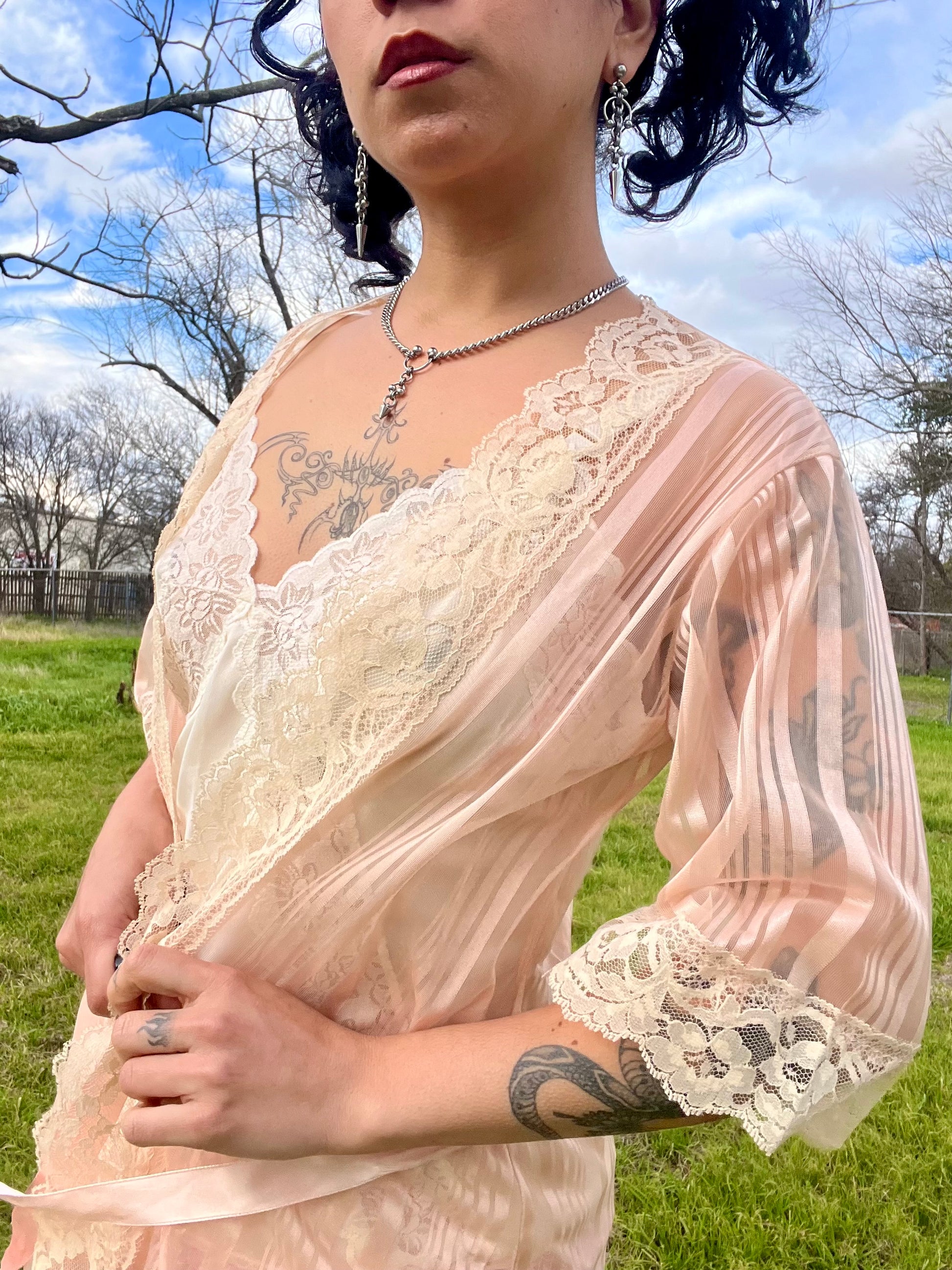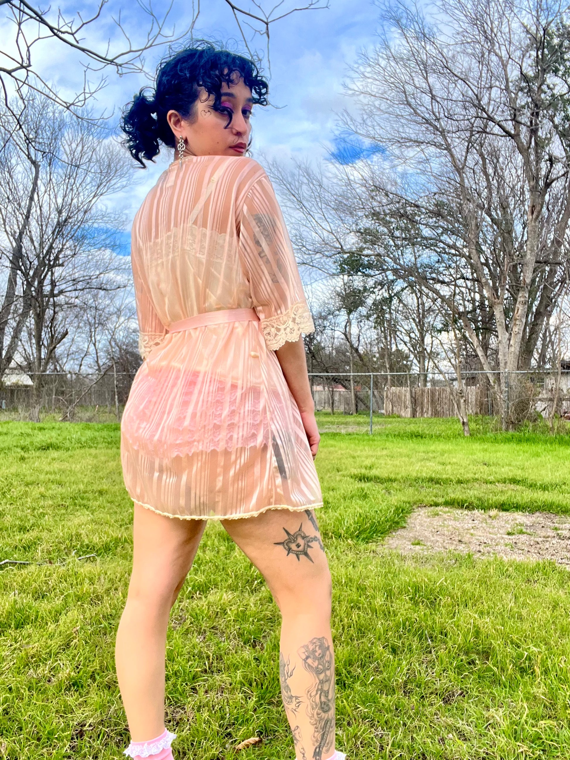 Vintage 70s satin pink & mesh striped robe with beautiful lace details. Comes with a matching pink ribbon. "Love's Delight" by Randi Foundations Inc. 100% Nylon. Tag size M. Best fits an XS-M. Seen on Justina.