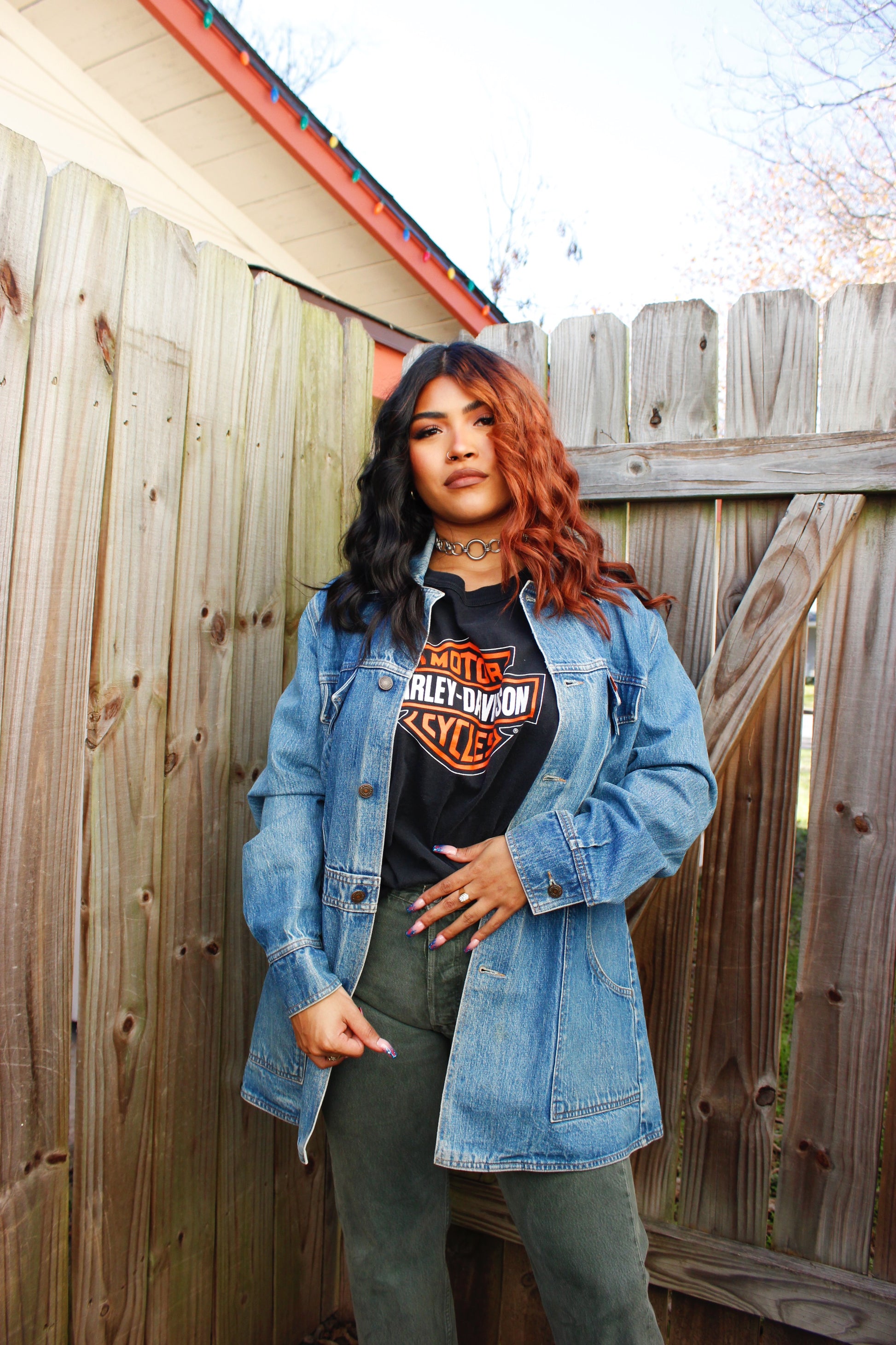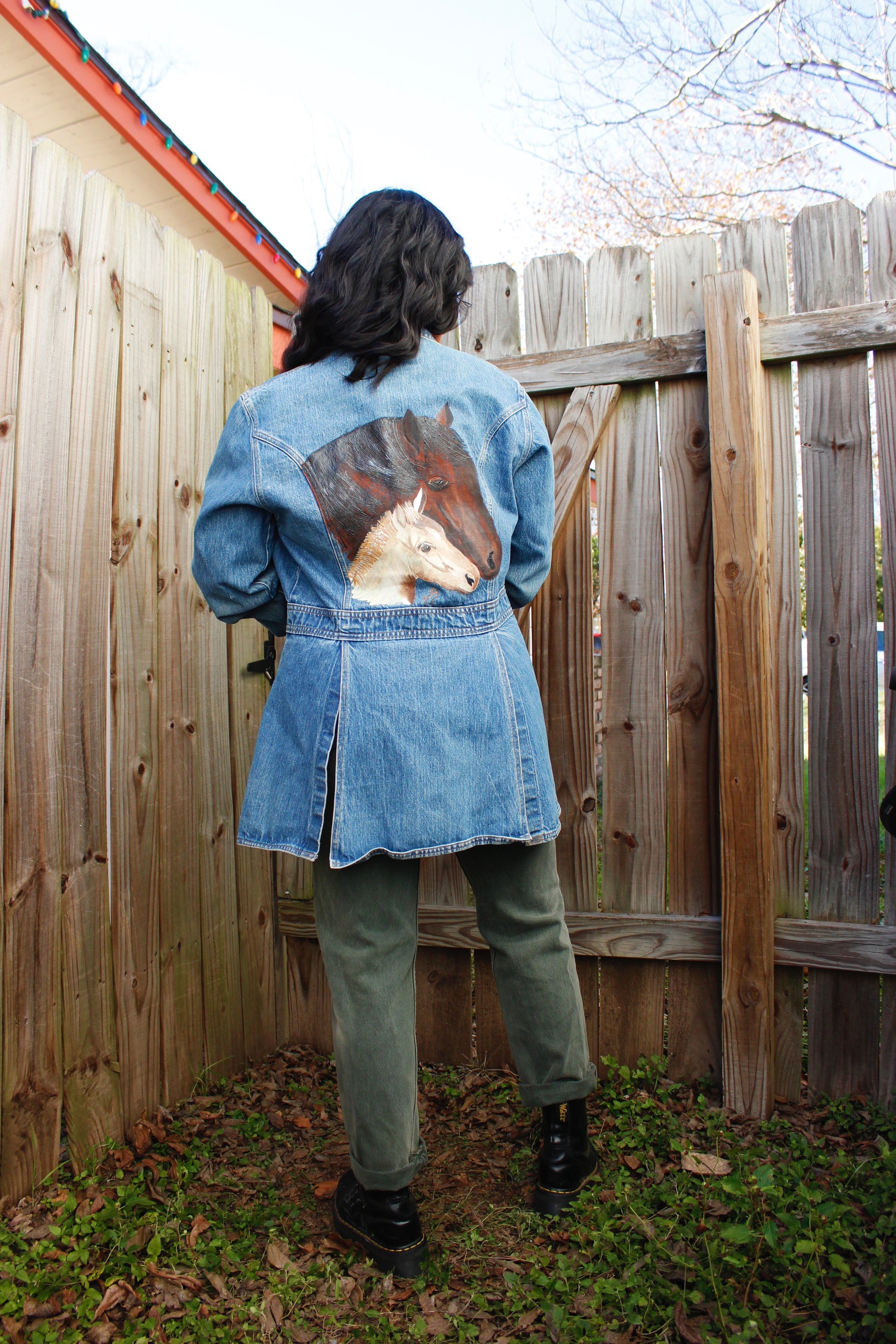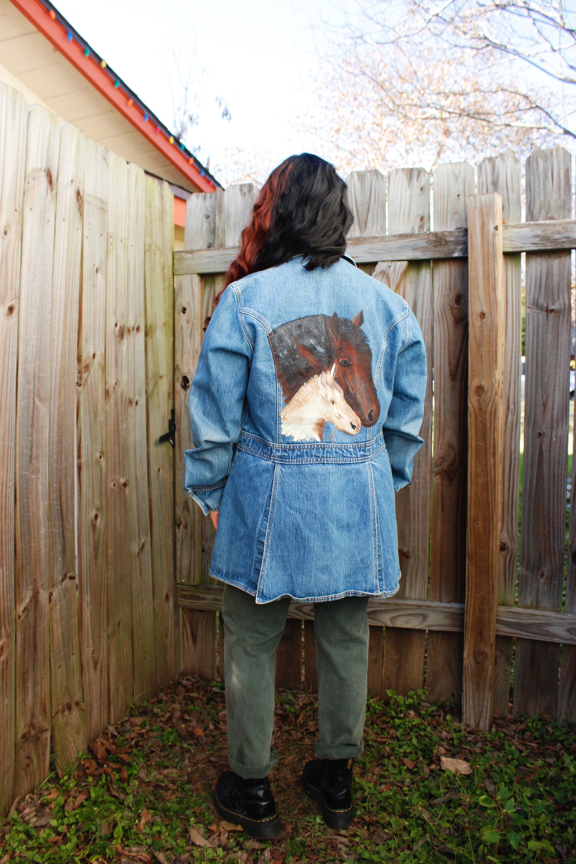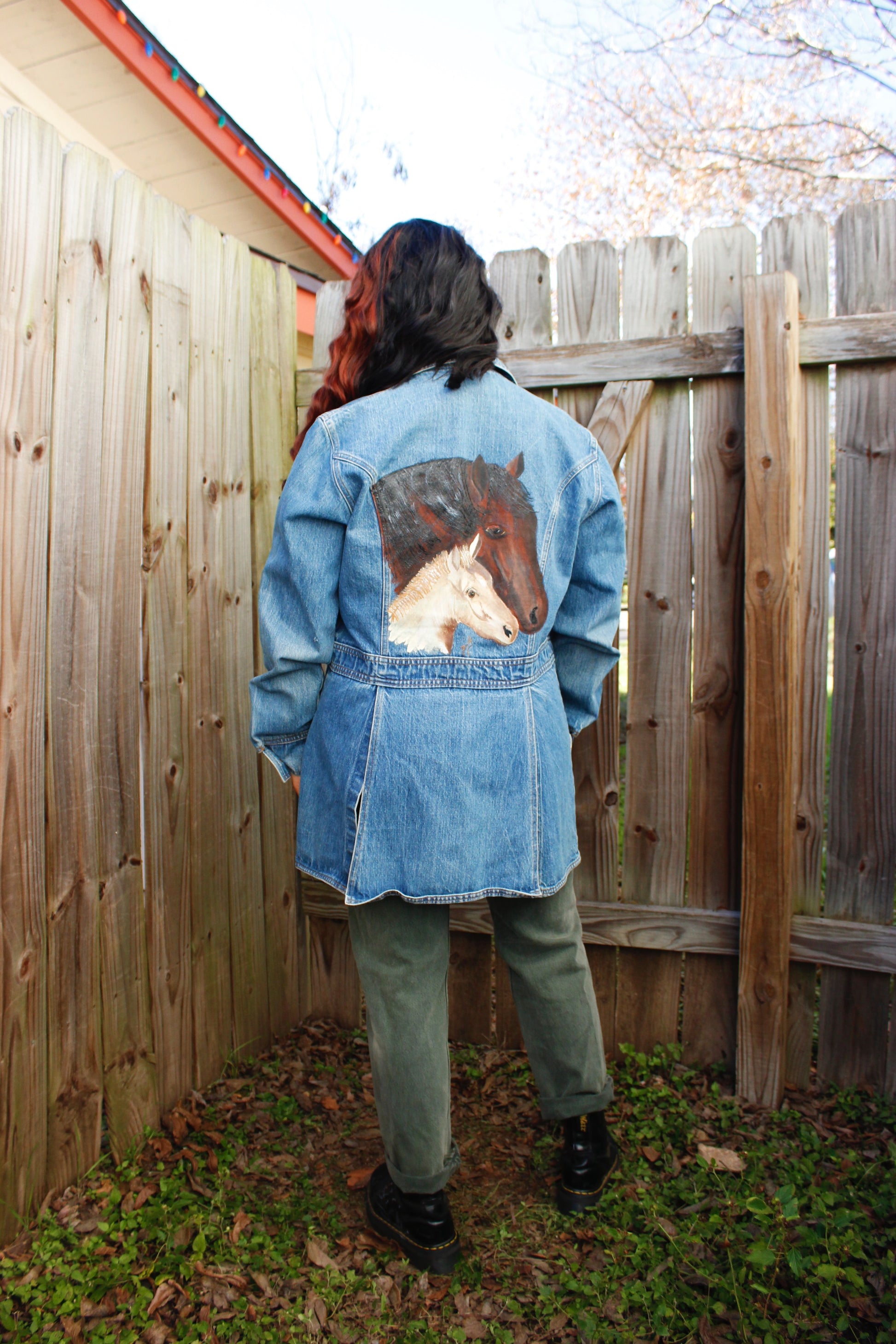 Vintage 70s orange tab Levi's longline denim chore coat with hand painted horses on the back. We love the western vibes paired with the classic chore style! Has two roomy side pocket (the chest pockets are faux). Tag size L. Best fits a M-L. Seen on Max.