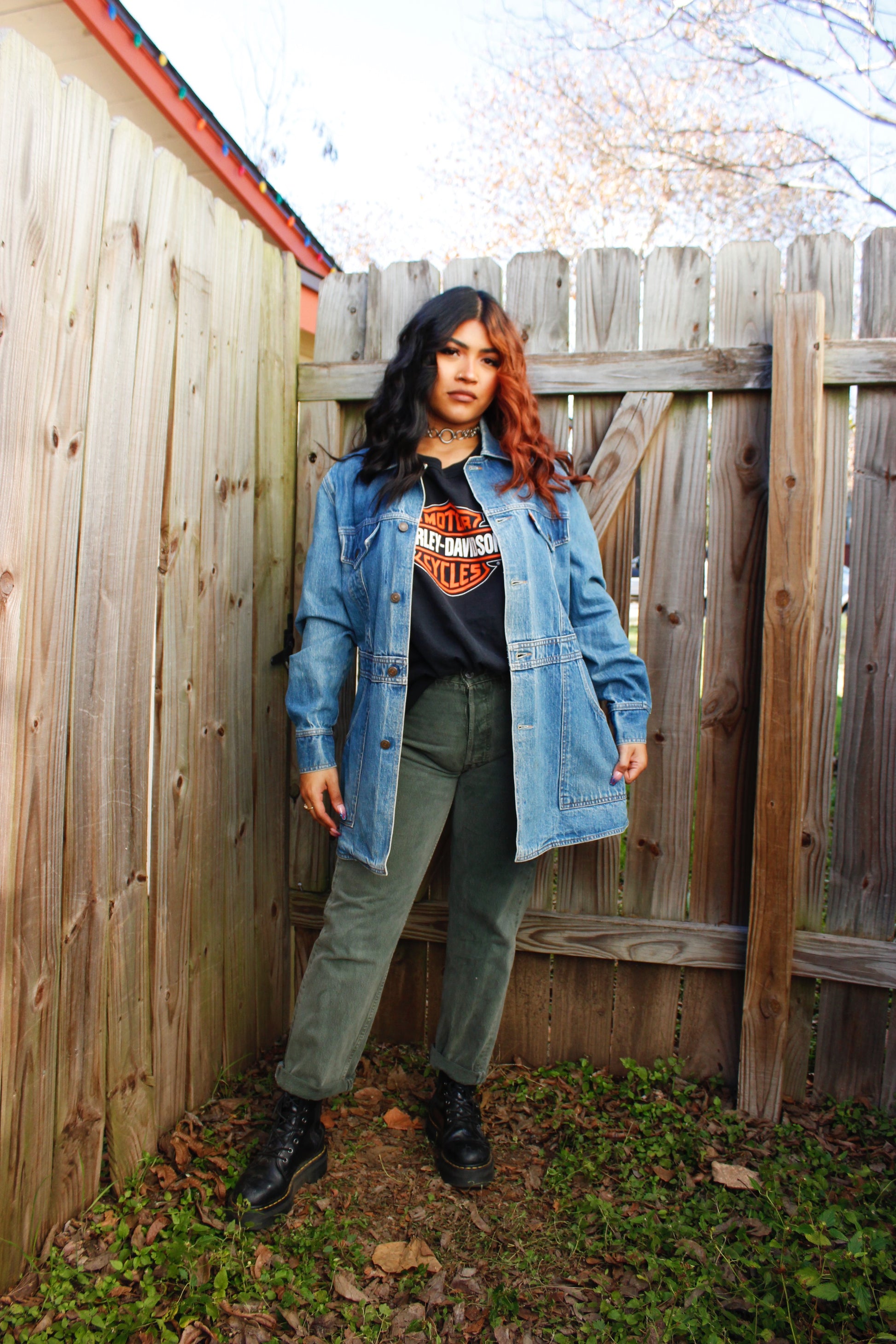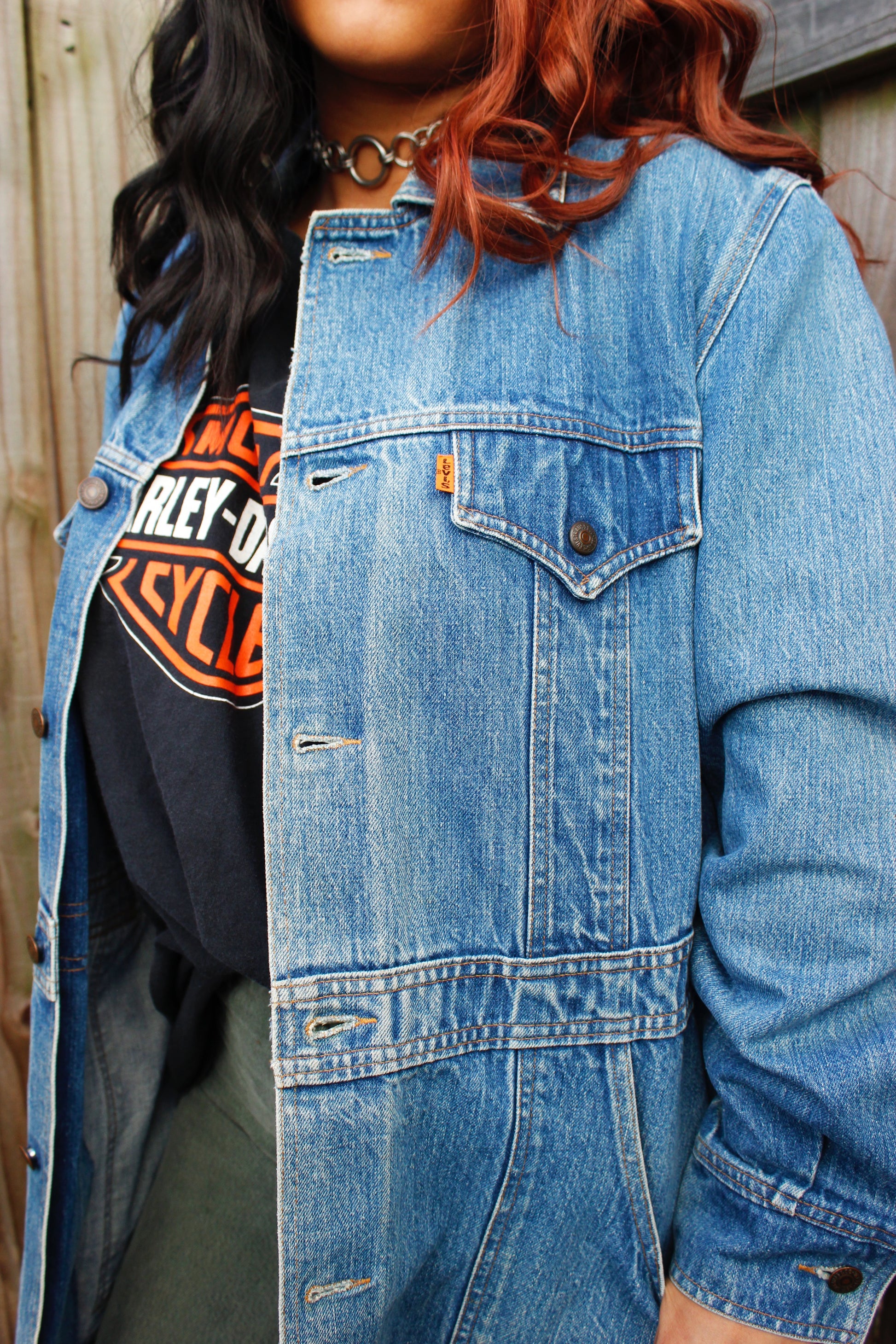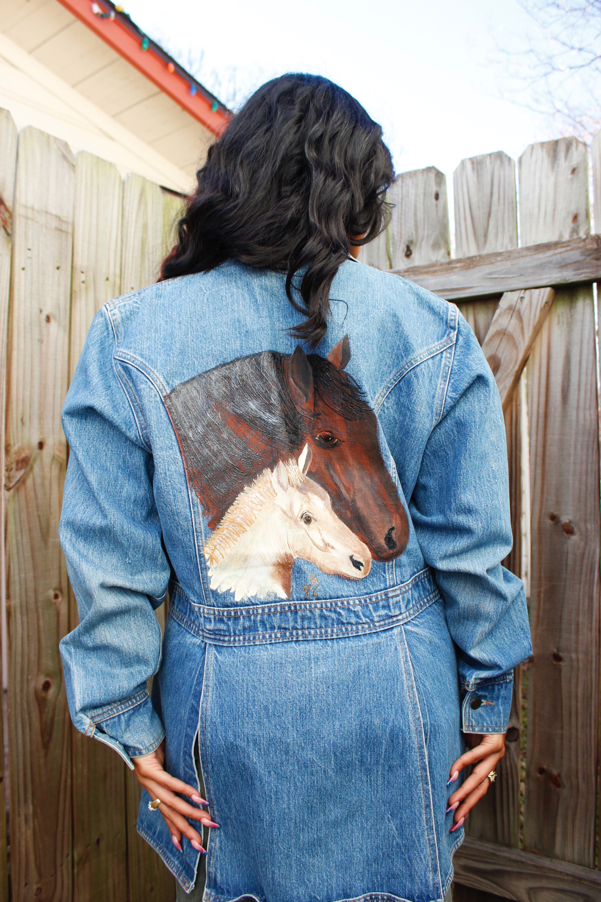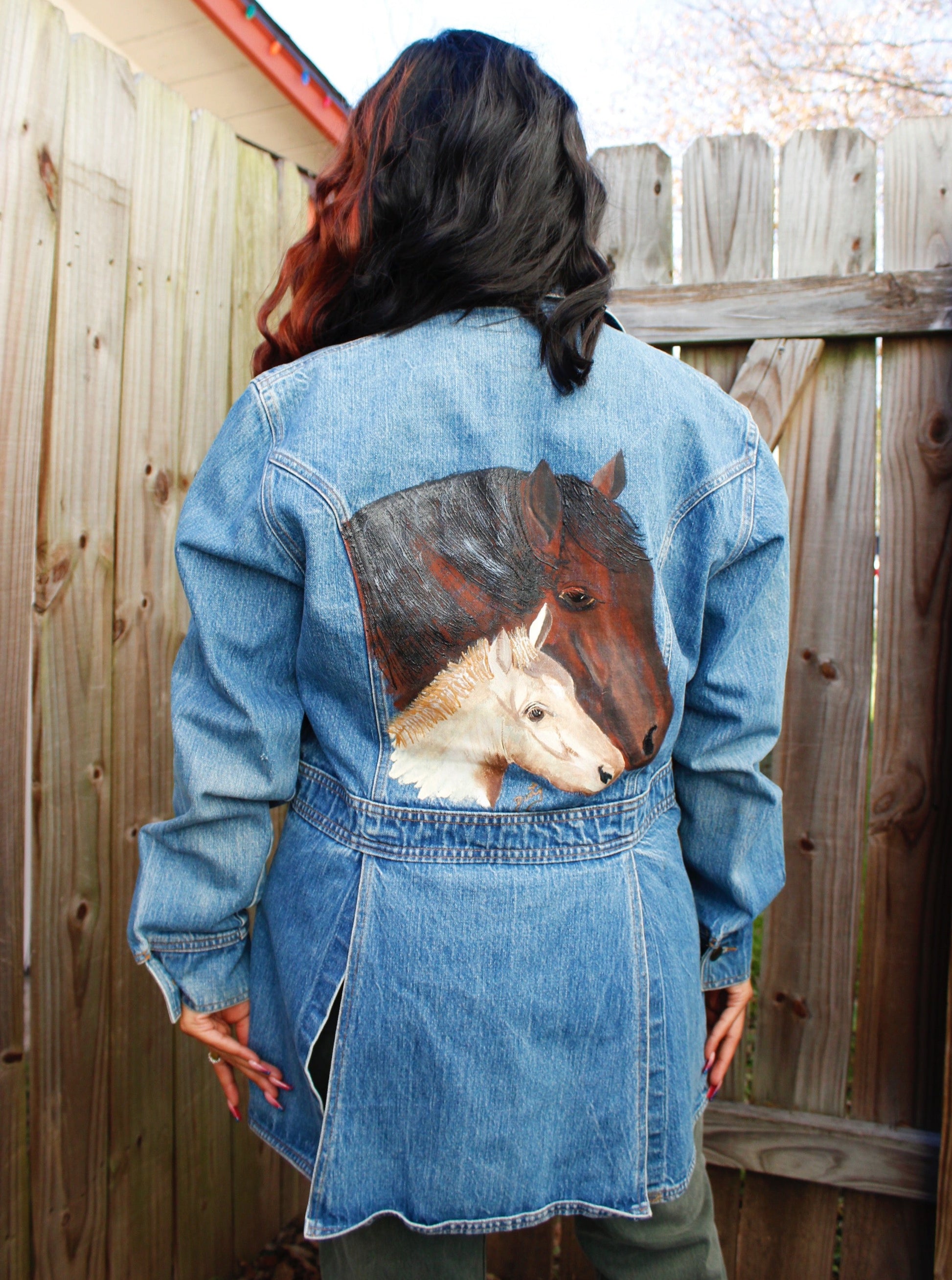 Vintage 70s orange tab Levi's longline denim chore coat with hand painted horses on the back. We love the western vibes paired with the classic chore style! Has two roomy side pocket (the chest pockets are faux). Tag size L. Best fits a M-L. Seen on Max.