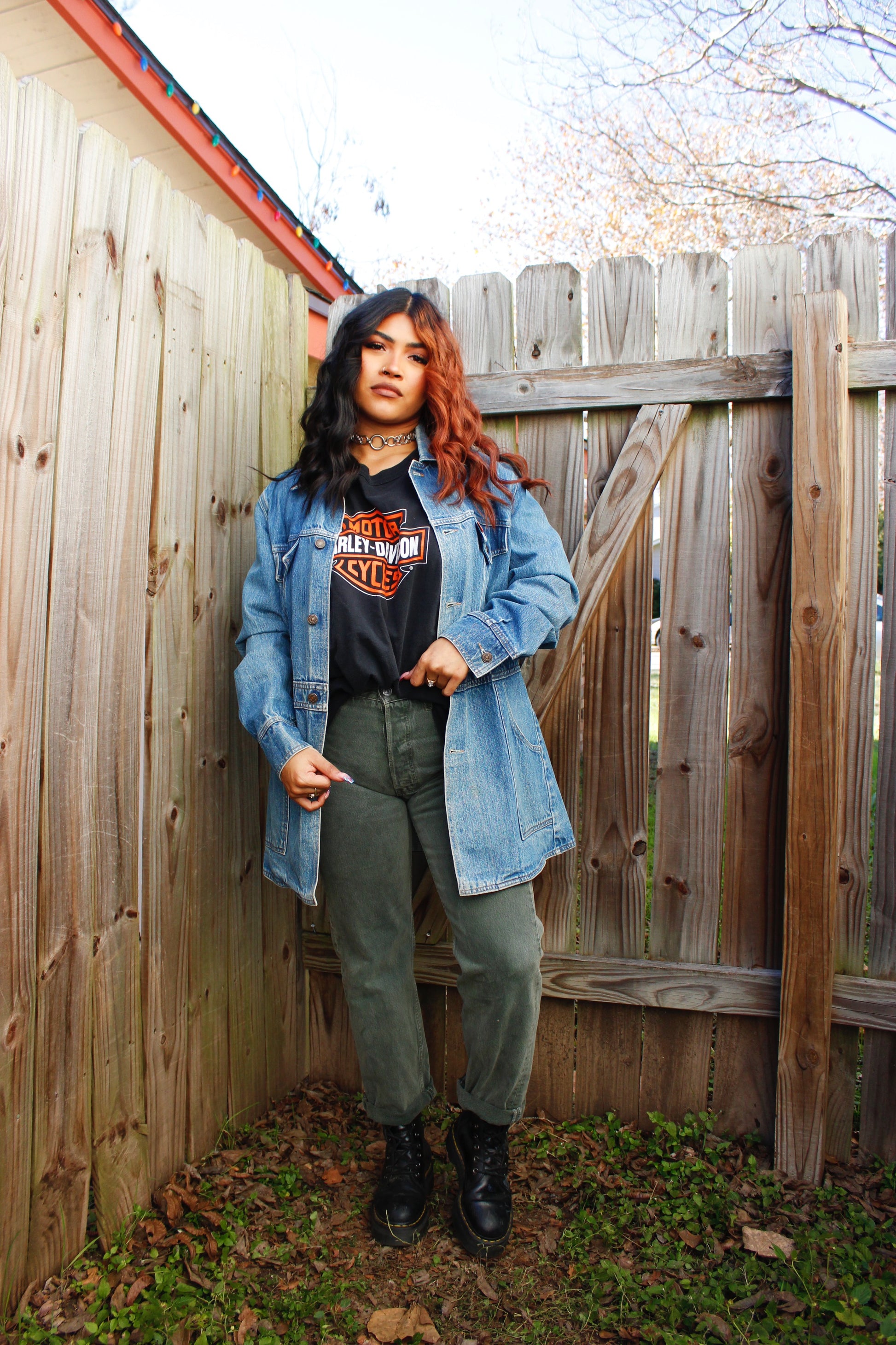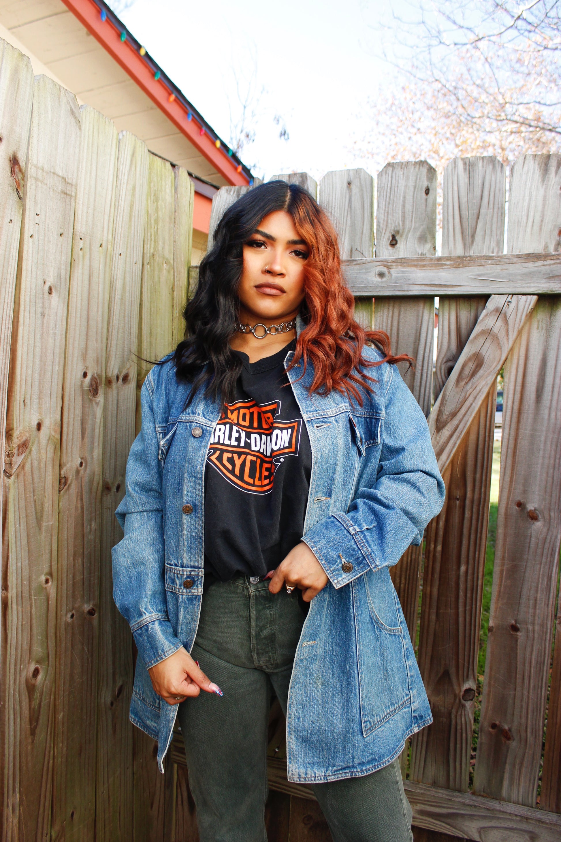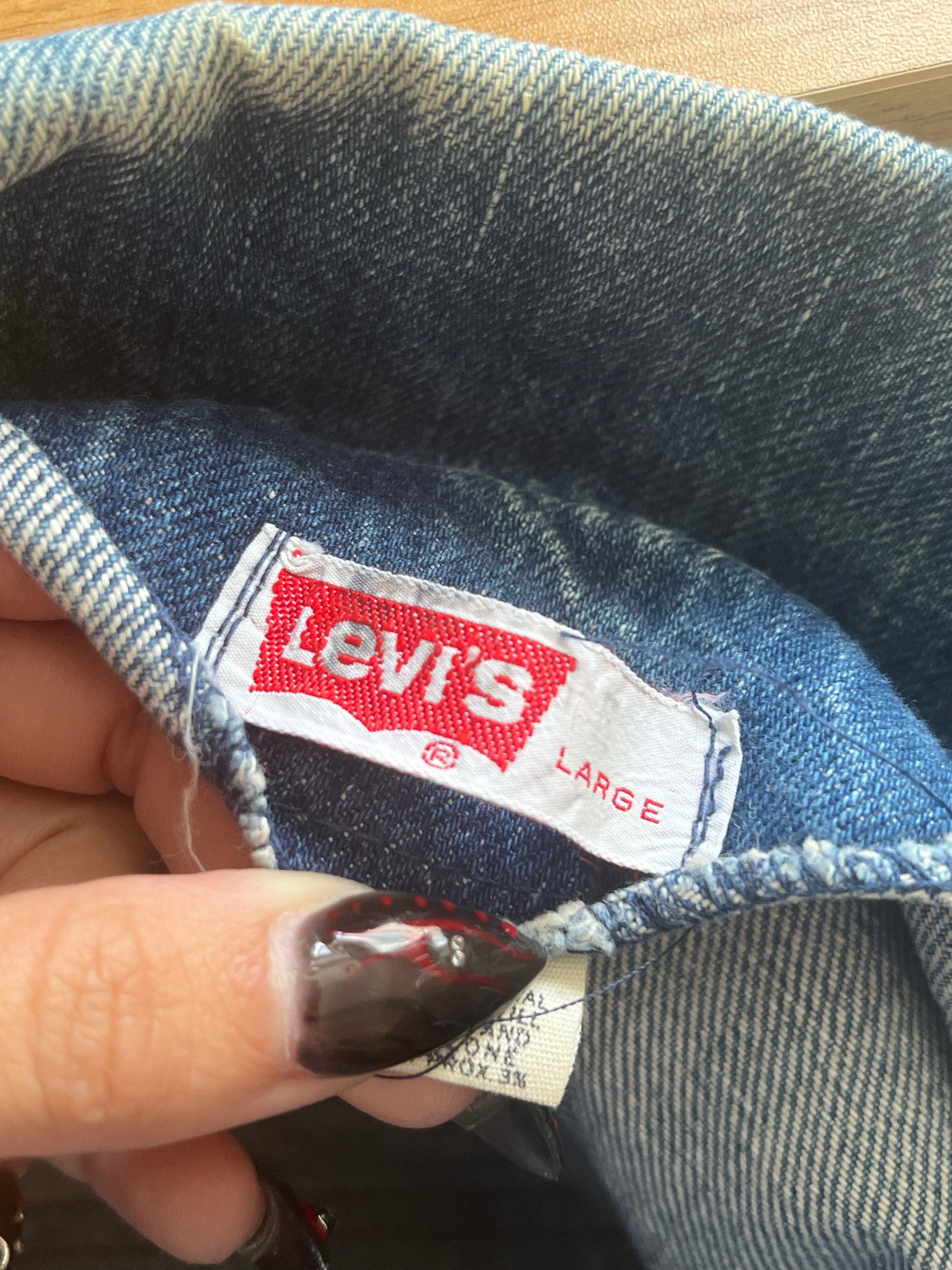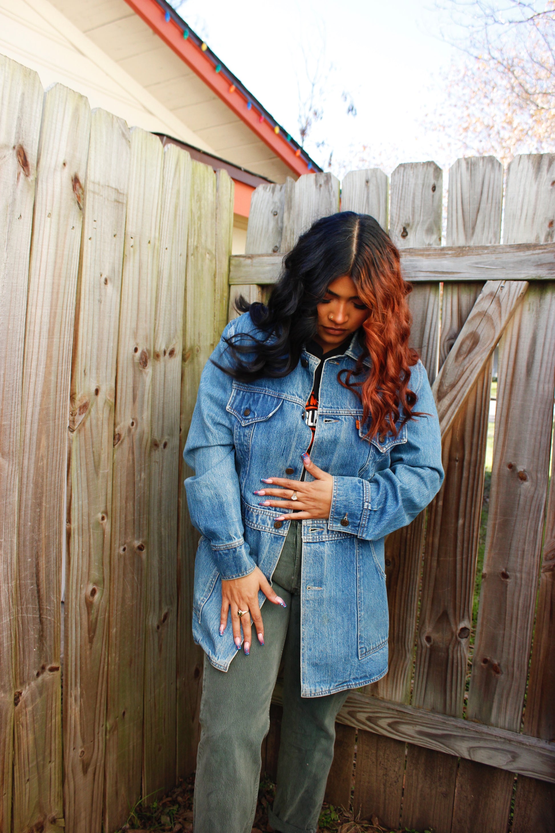 Vintage 70s orange tab Levi's longline denim chore coat with hand painted horses on the back. We love the western vibes paired with the classic chore style! Has two roomy side pocket (the chest pockets are faux). Tag size L. Best fits a M-L. Seen on Max.