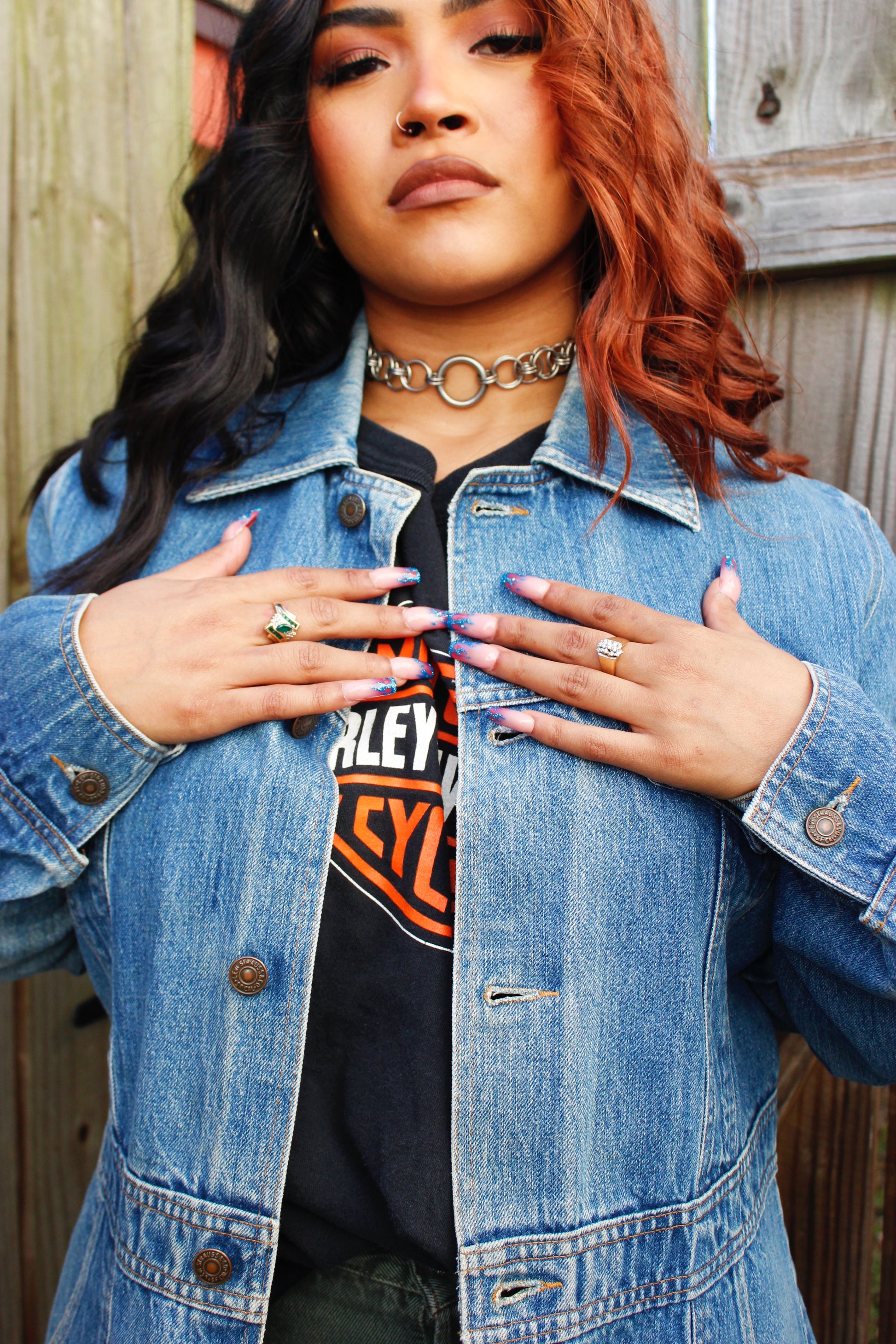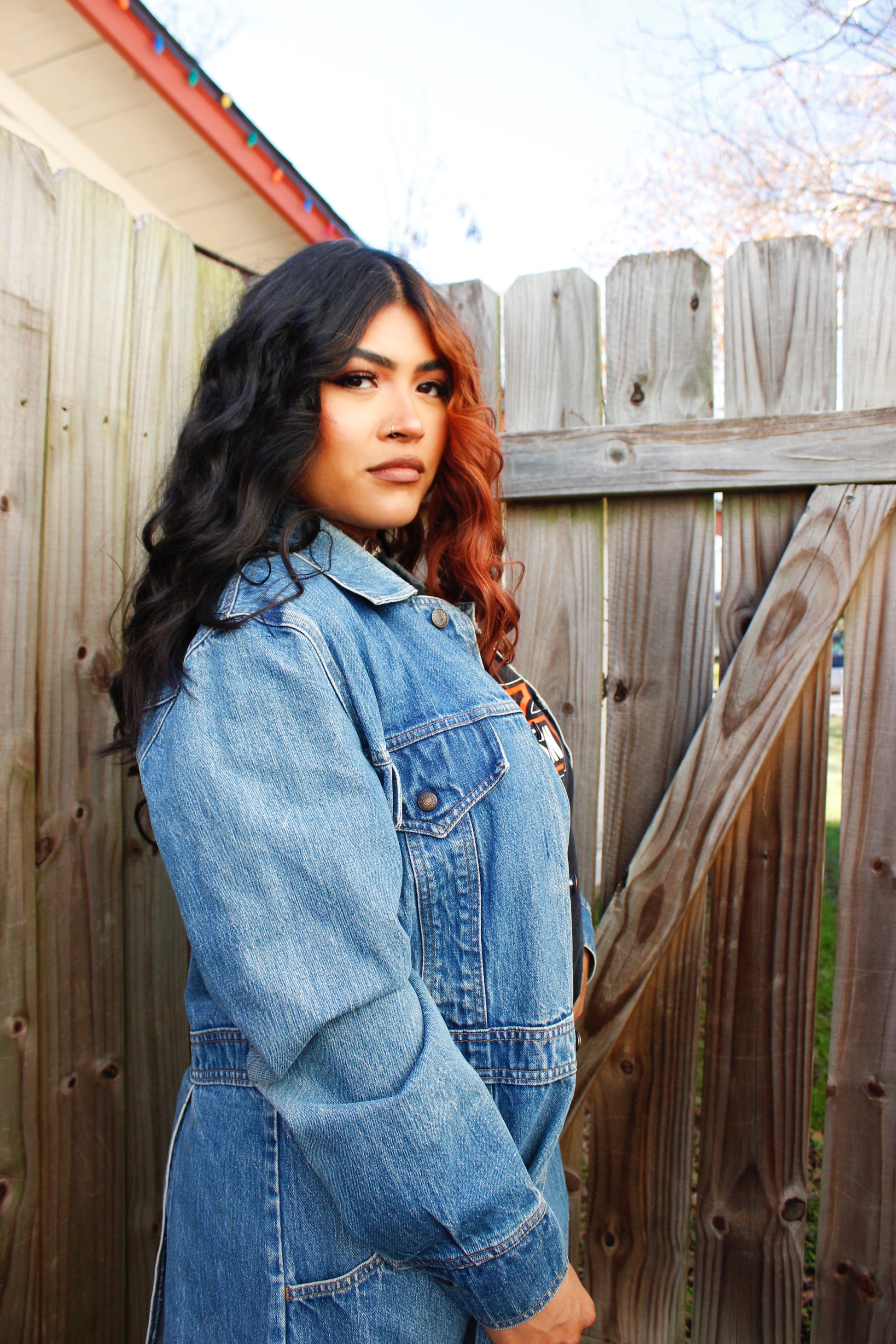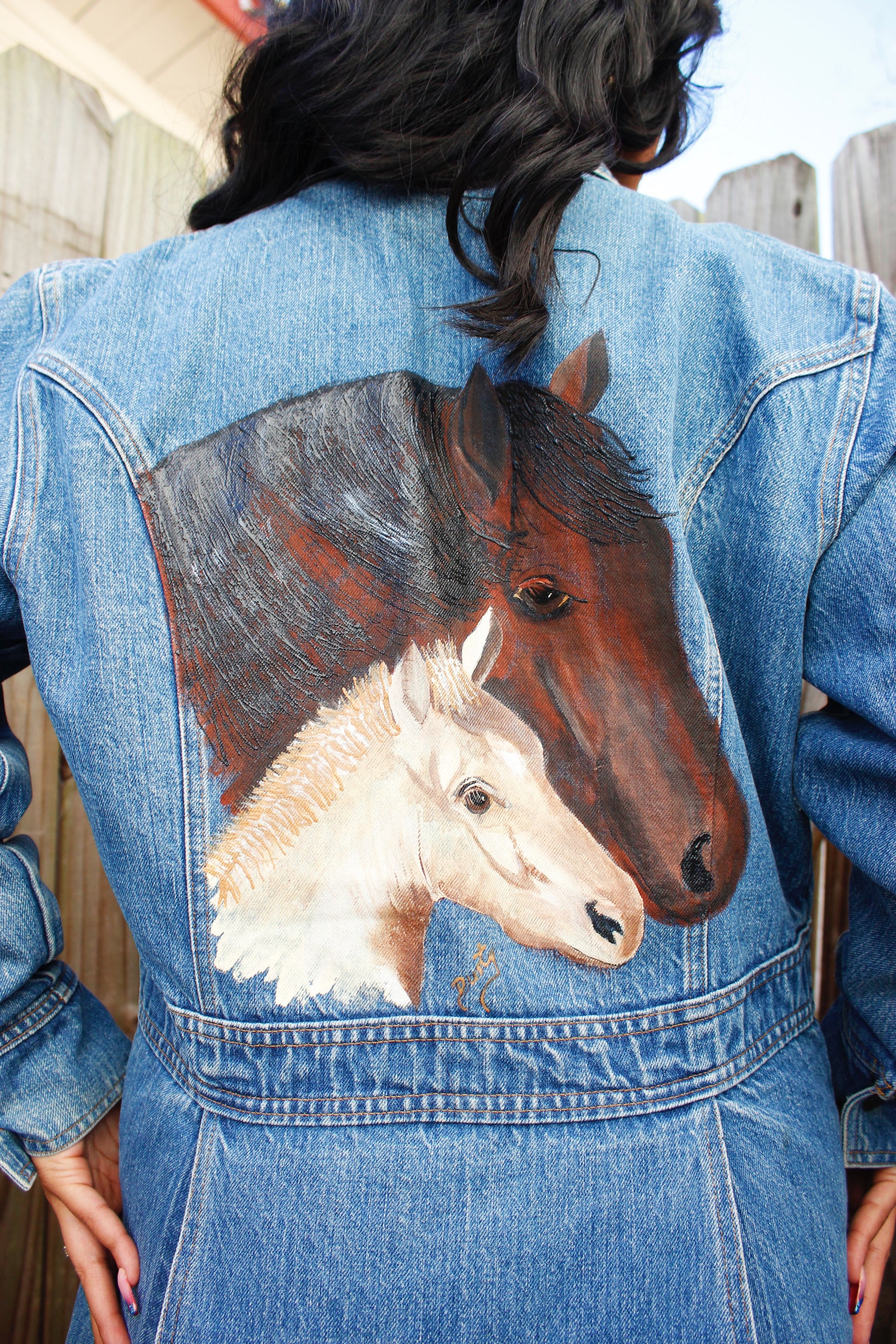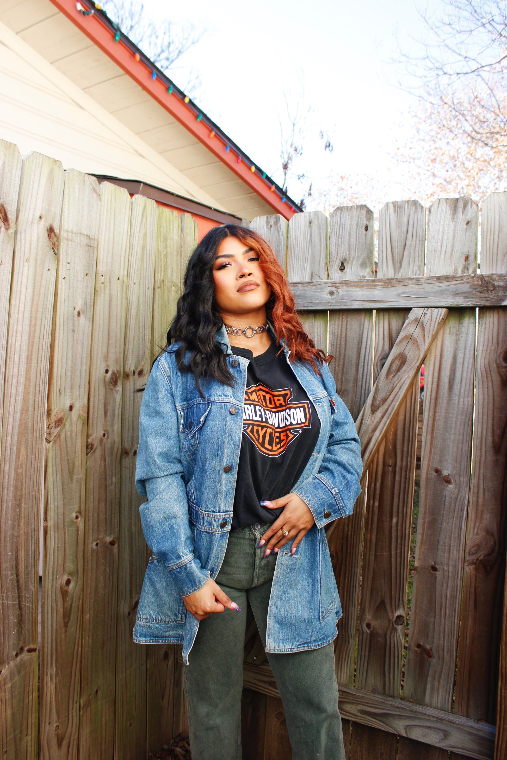 Vintage 70s orange tab Levi's longline denim chore coat with hand painted horses on the back. We love the western vibes paired with the classic chore style! Has two roomy side pocket (the chest pockets are faux). Tag size L. Best fits a M-L. Seen on Max.