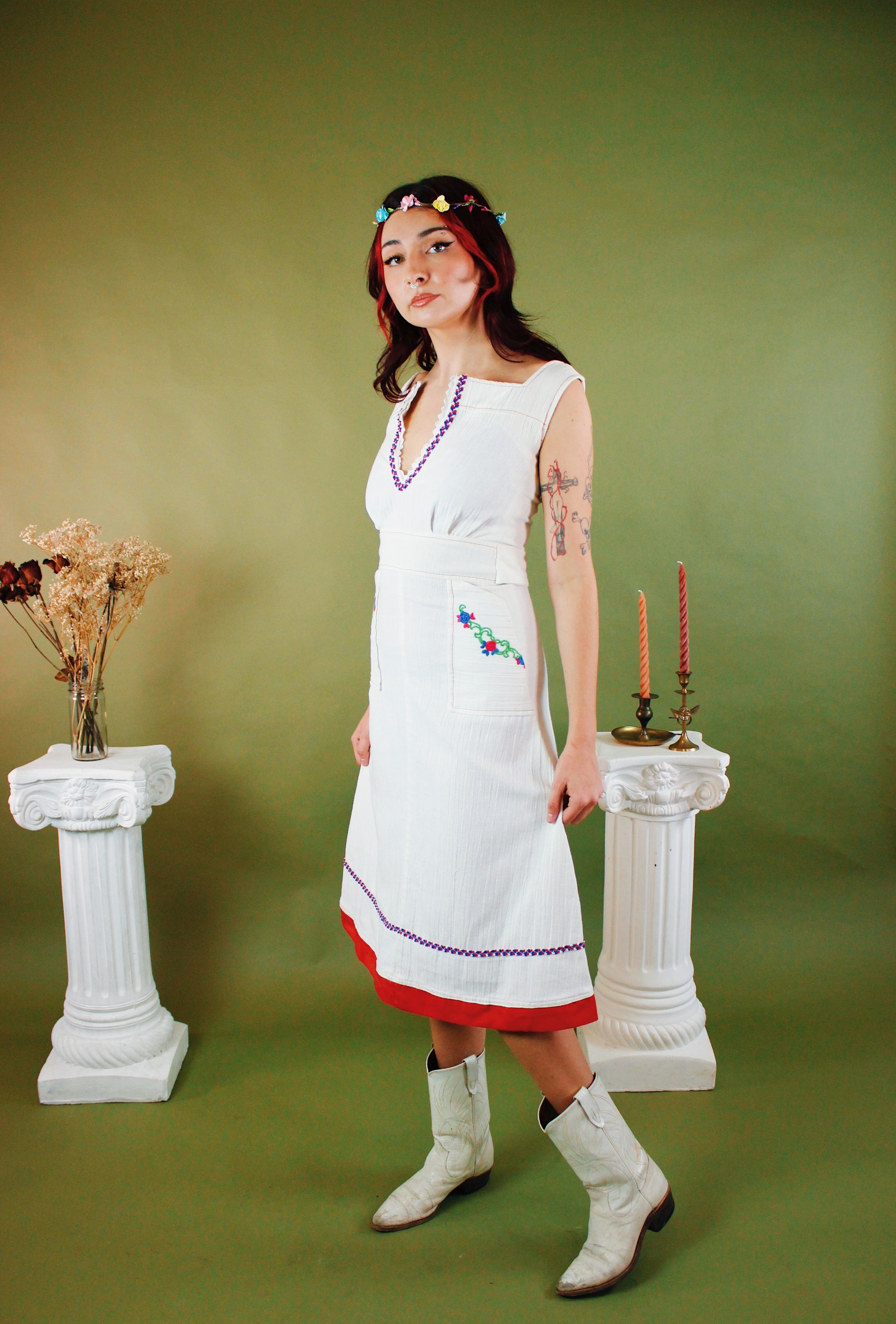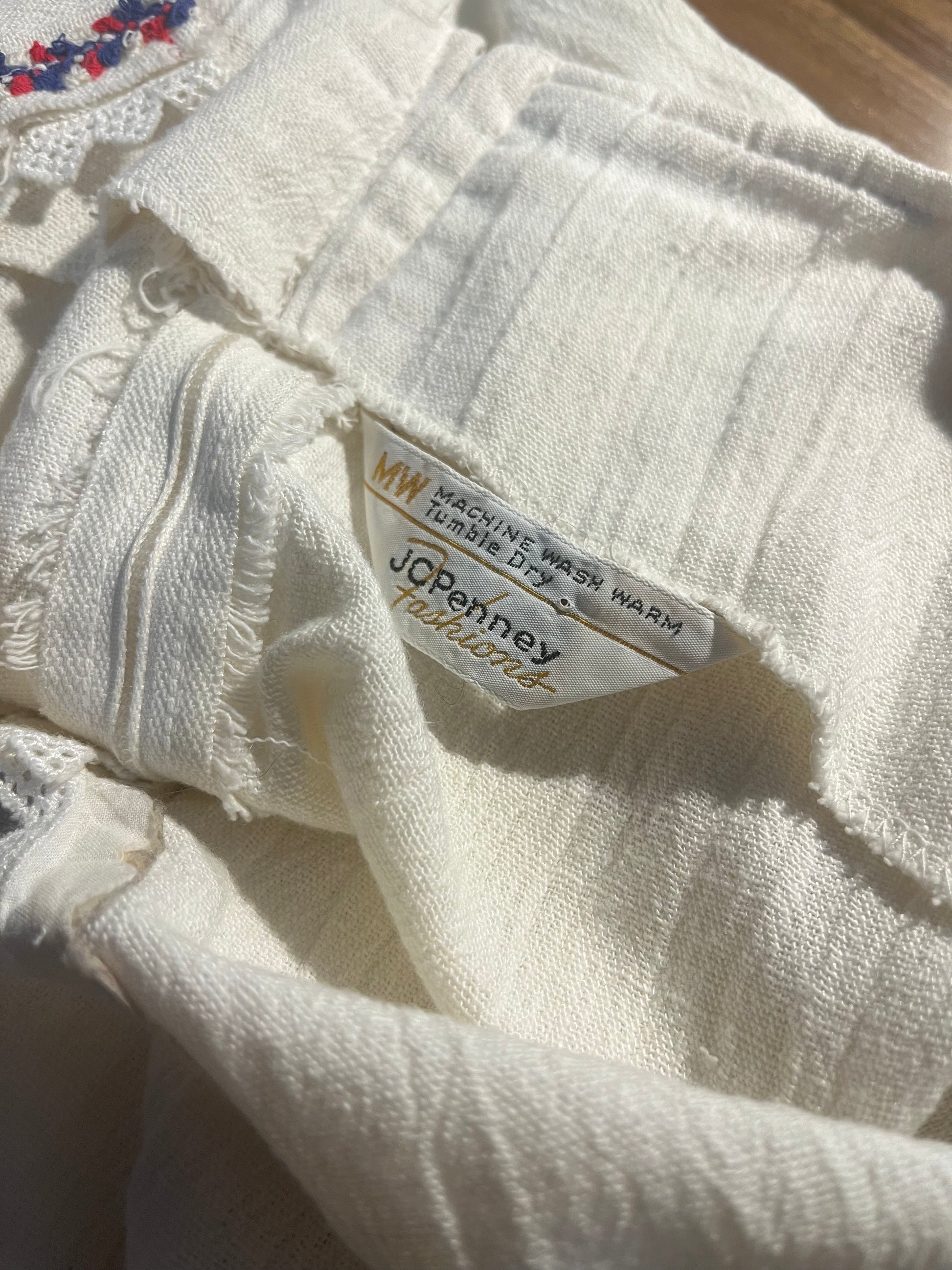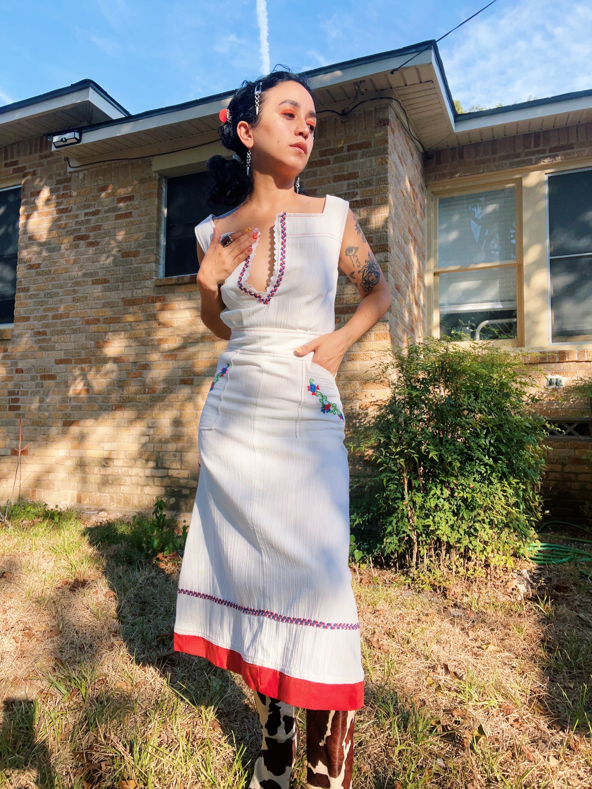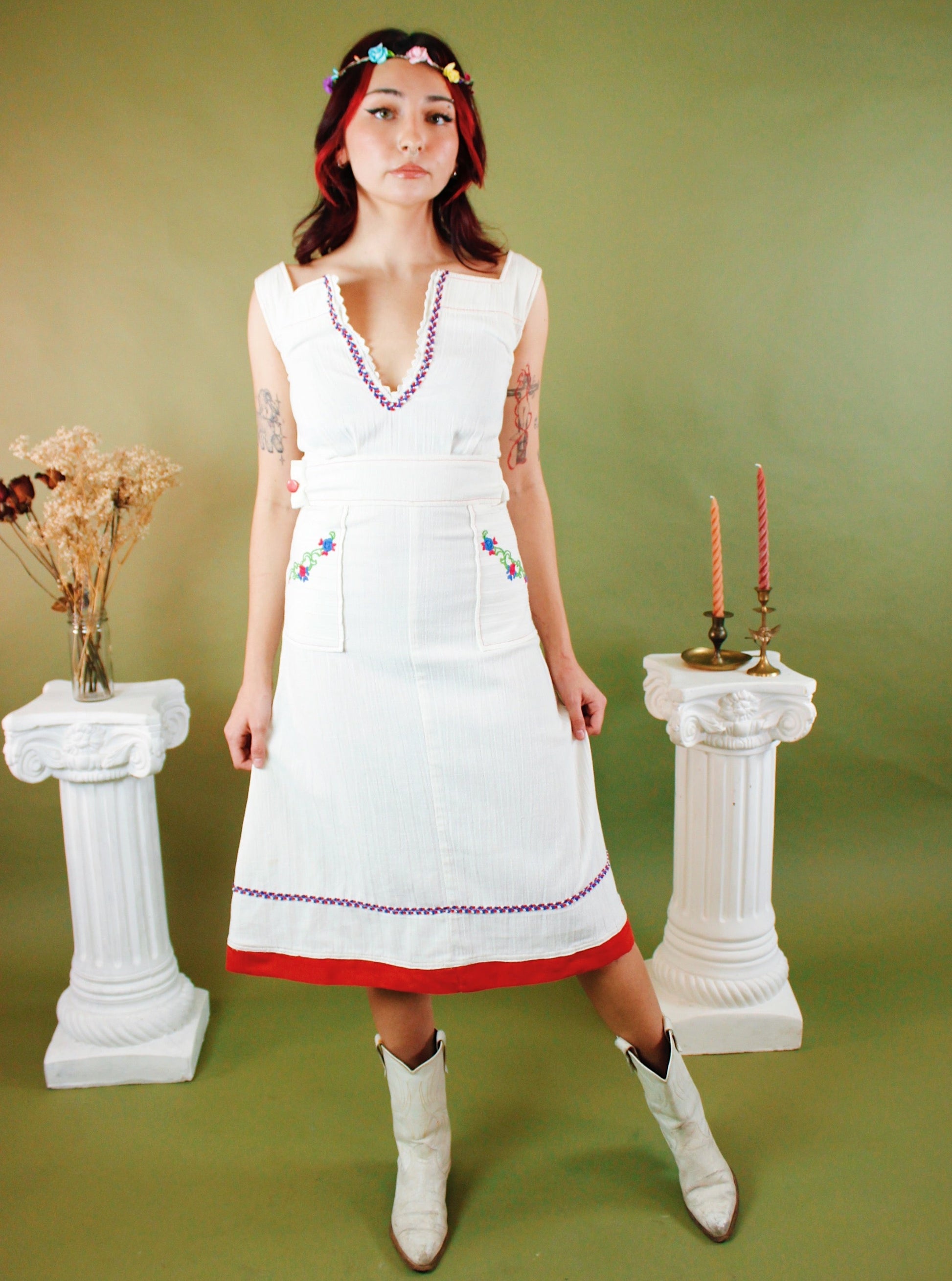 Vintage 70s embroidered folk dress. Beautiful texture and color palette with a bright red contrast stitching. Not quite sure how the chest is supposed to be worn as the edges seem to want to hang. Has a built in button-closure belt to cinch the waist. By Montgomery Ward/ JC Penney Fashions. Best fits an XXS-XS. Seen on Carmen (fit was too small on models waist, pinned the belt as it would not reach the button at the side waist) & Justina (fit was great, just had the floppy chest bits).