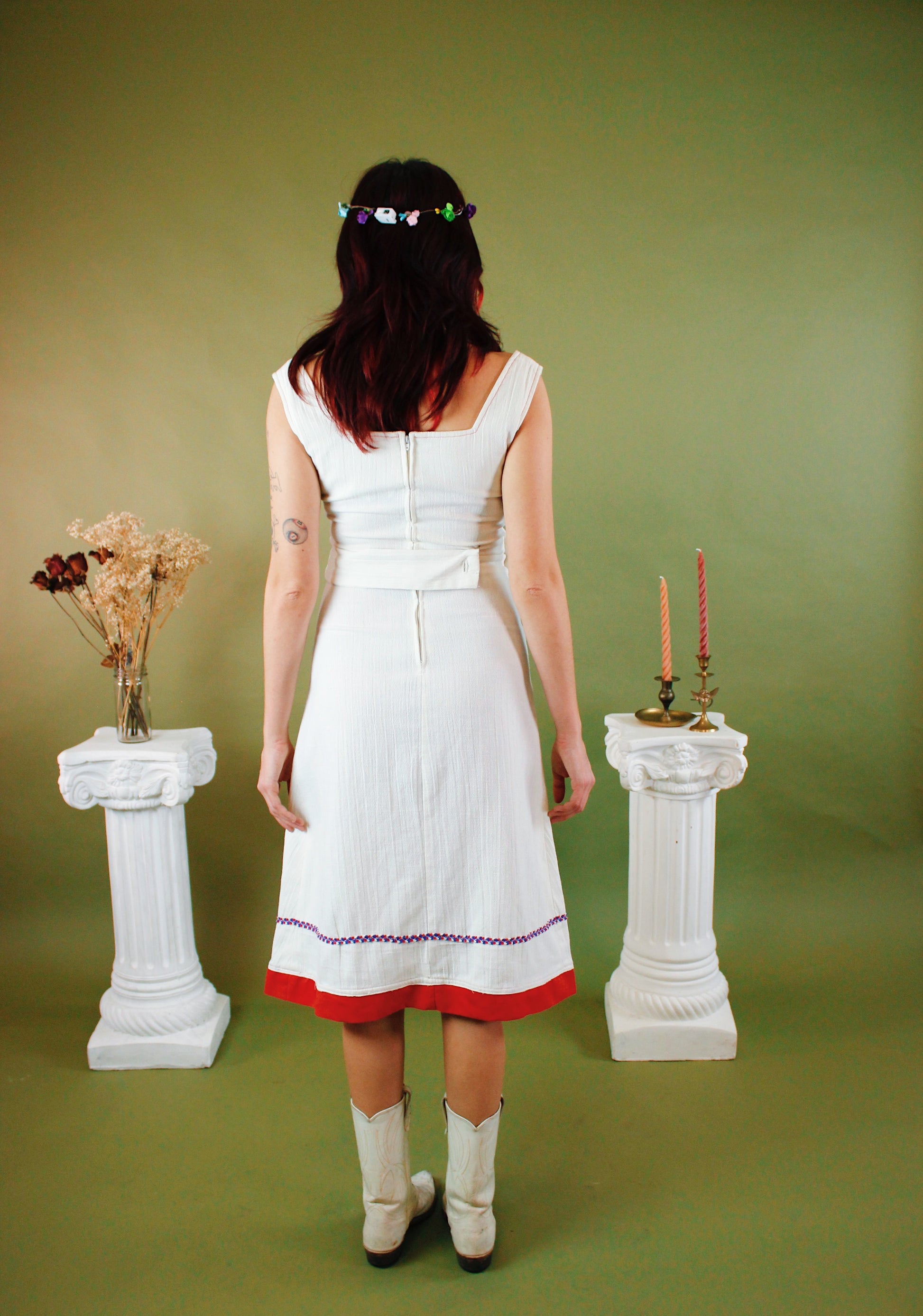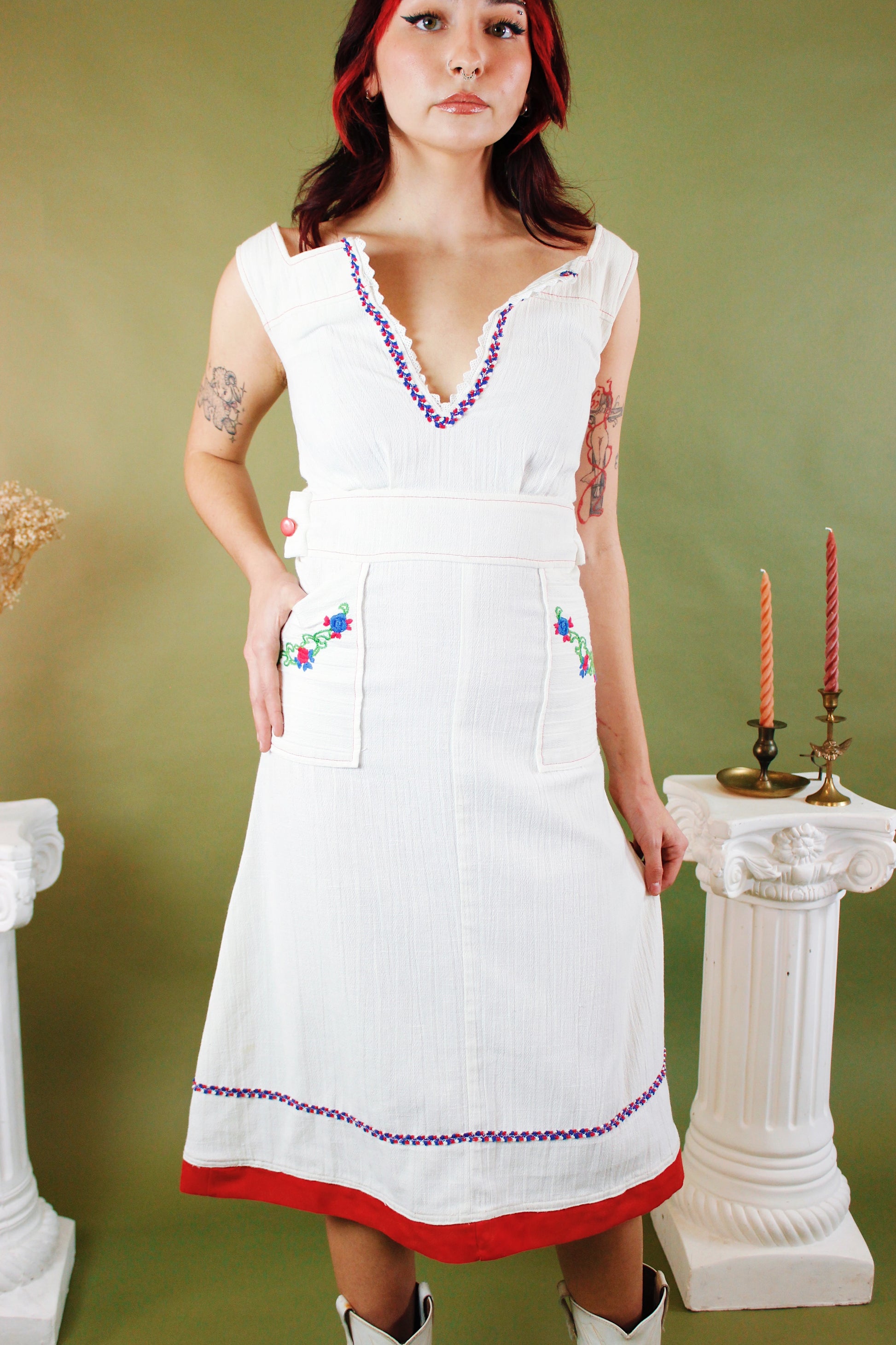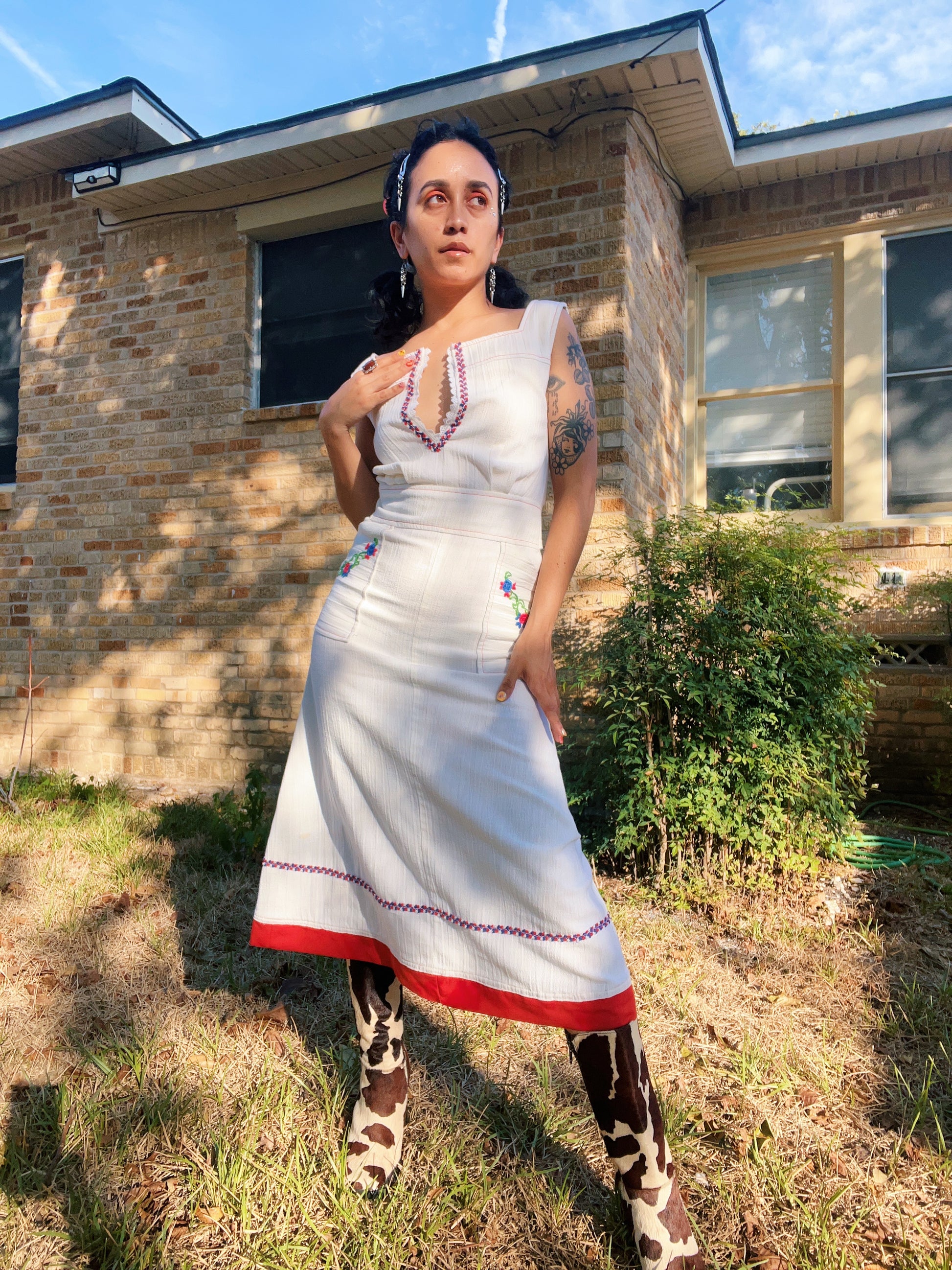 Vintage 70s embroidered folk dress. Beautiful texture and color palette with a bright red contrast stitching. Not quite sure how the chest is supposed to be worn as the edges seem to want to hang. Has a built in button-closure belt to cinch the waist. By Montgomery Ward/ JC Penney Fashions. Best fits an XXS-XS. Seen on Carmen (fit was too small on models waist, pinned the belt as it would not reach the button at the side waist) & Justina (fit was great, just had the floppy chest bits).