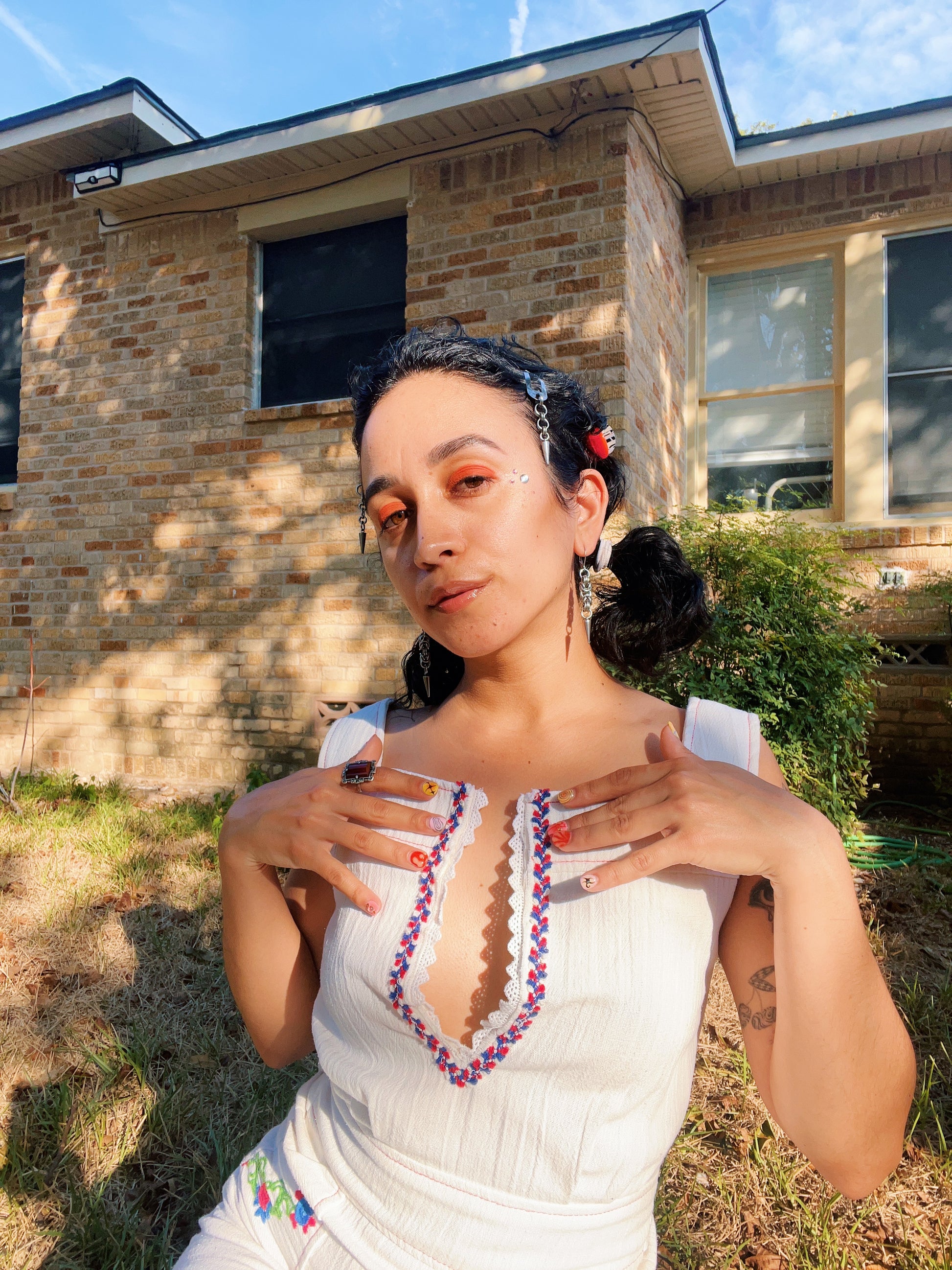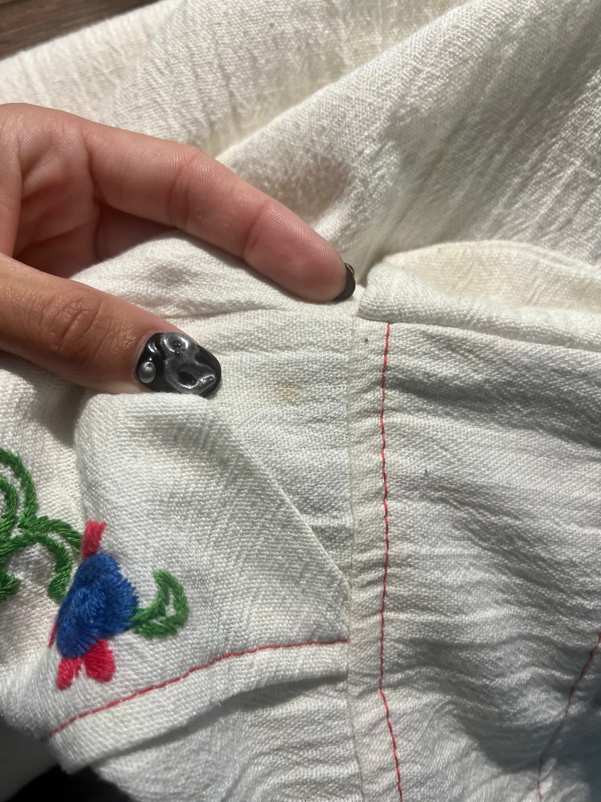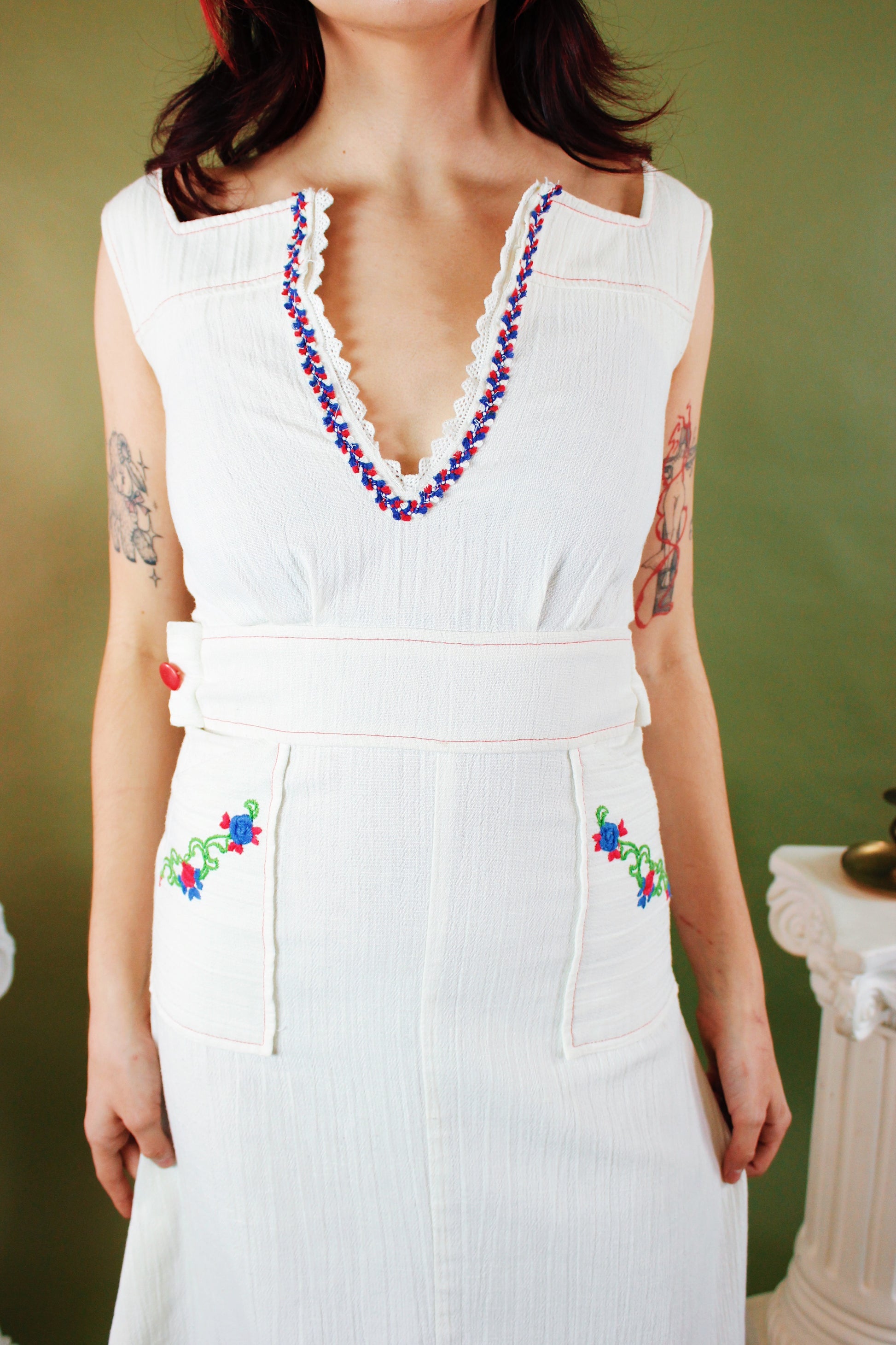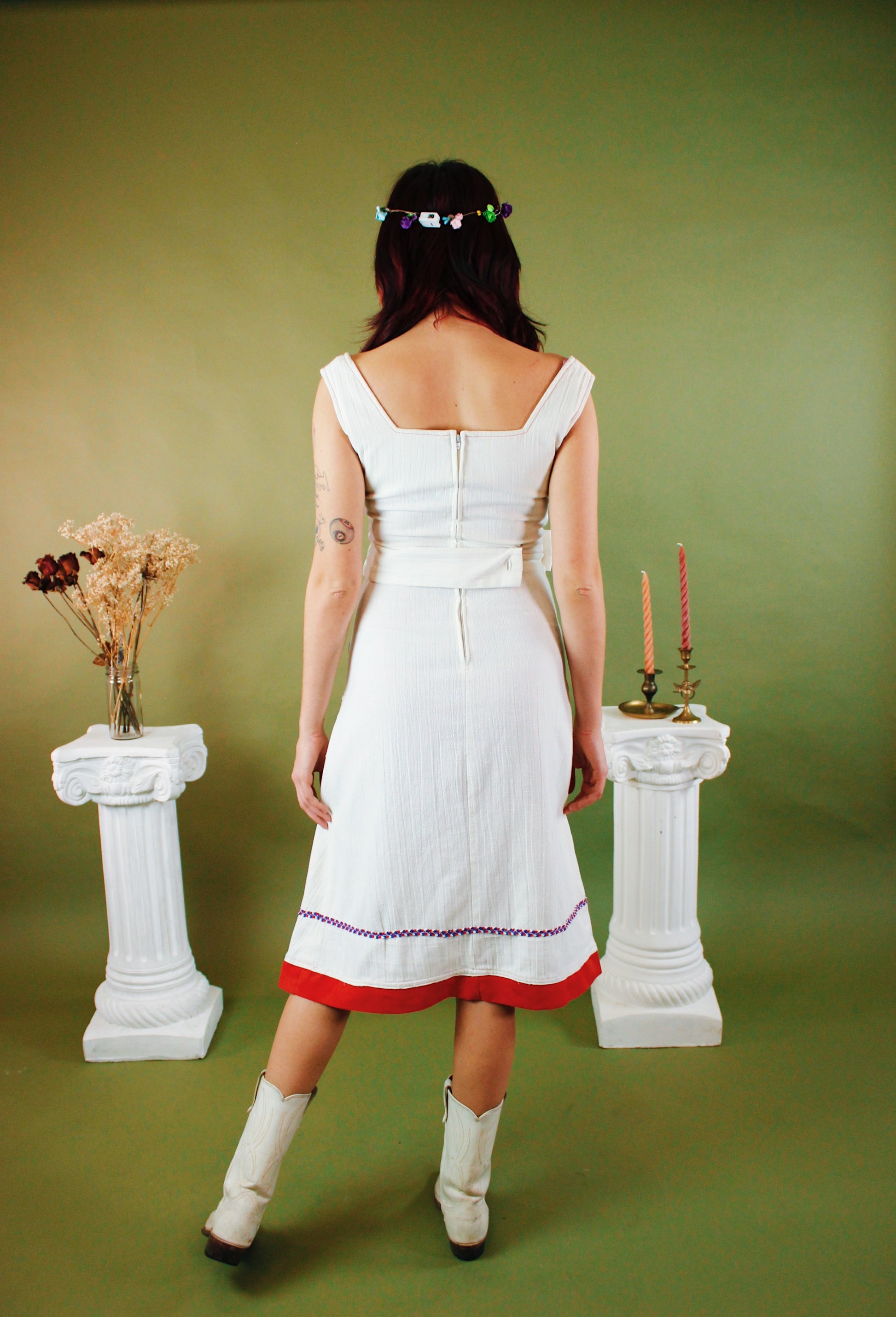 Vintage 70s embroidered folk dress. Beautiful texture and color palette with a bright red contrast stitching. Not quite sure how the chest is supposed to be worn as the edges seem to want to hang. Has a built in button-closure belt to cinch the waist. By Montgomery Ward/ JC Penney Fashions. Best fits an XXS-XS. Seen on Carmen (fit was too small on models waist, pinned the belt as it would not reach the button at the side waist) & Justina (fit was great, just had the floppy chest bits).