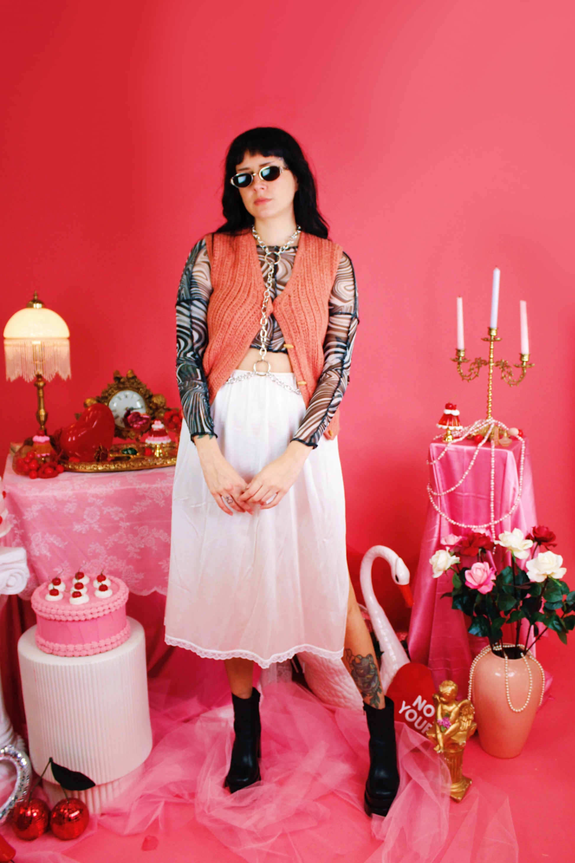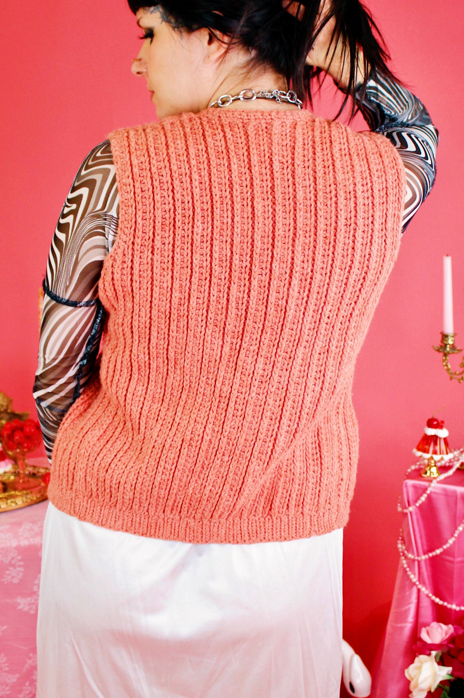 Vintage 70s peachy pink hand knit sweater vest with wooden toggle button details. Gorgeous texture and lots of love was put into this piece. Best fits an XS/S. Seen on Ci (styled with an open fit).