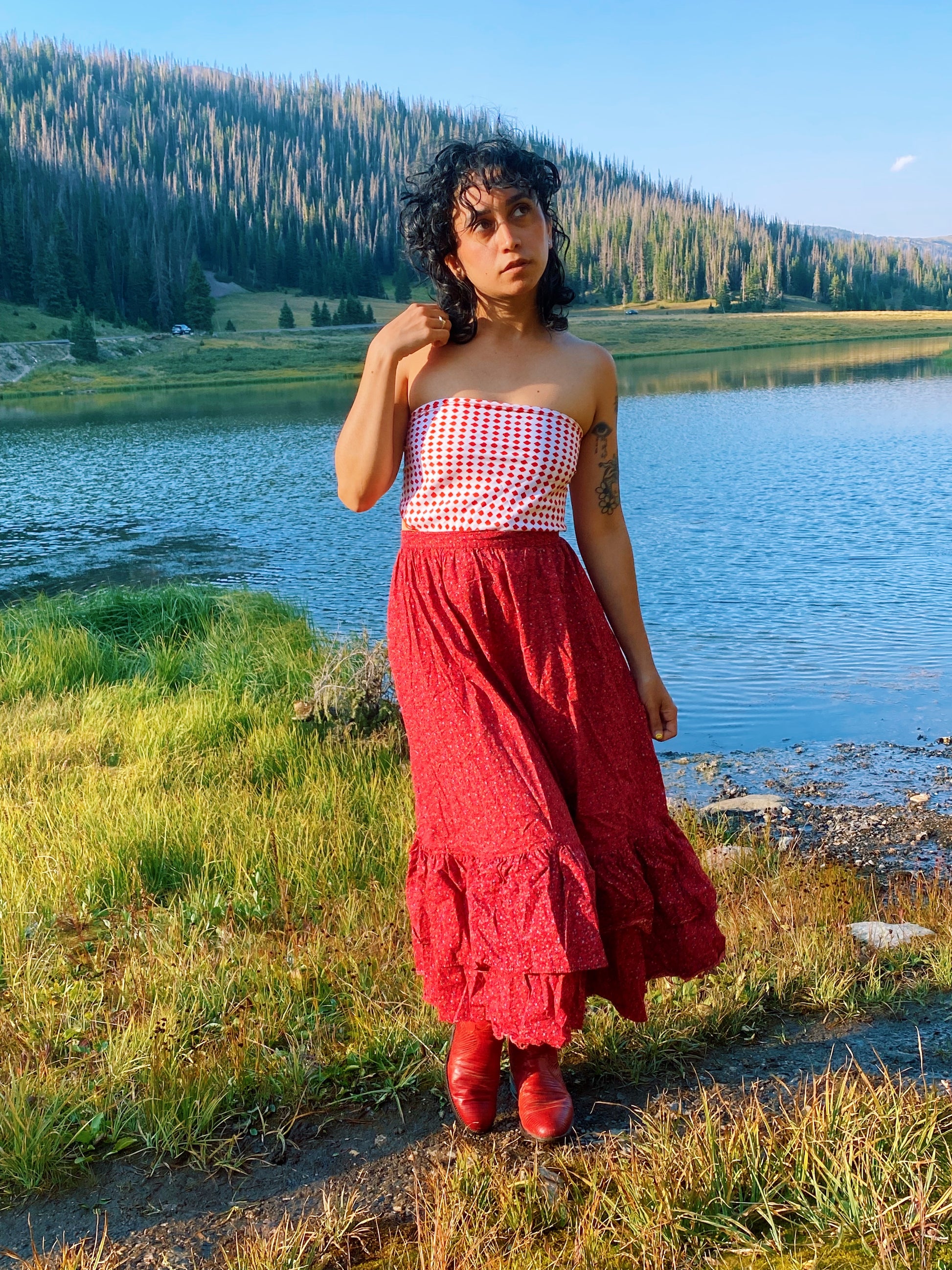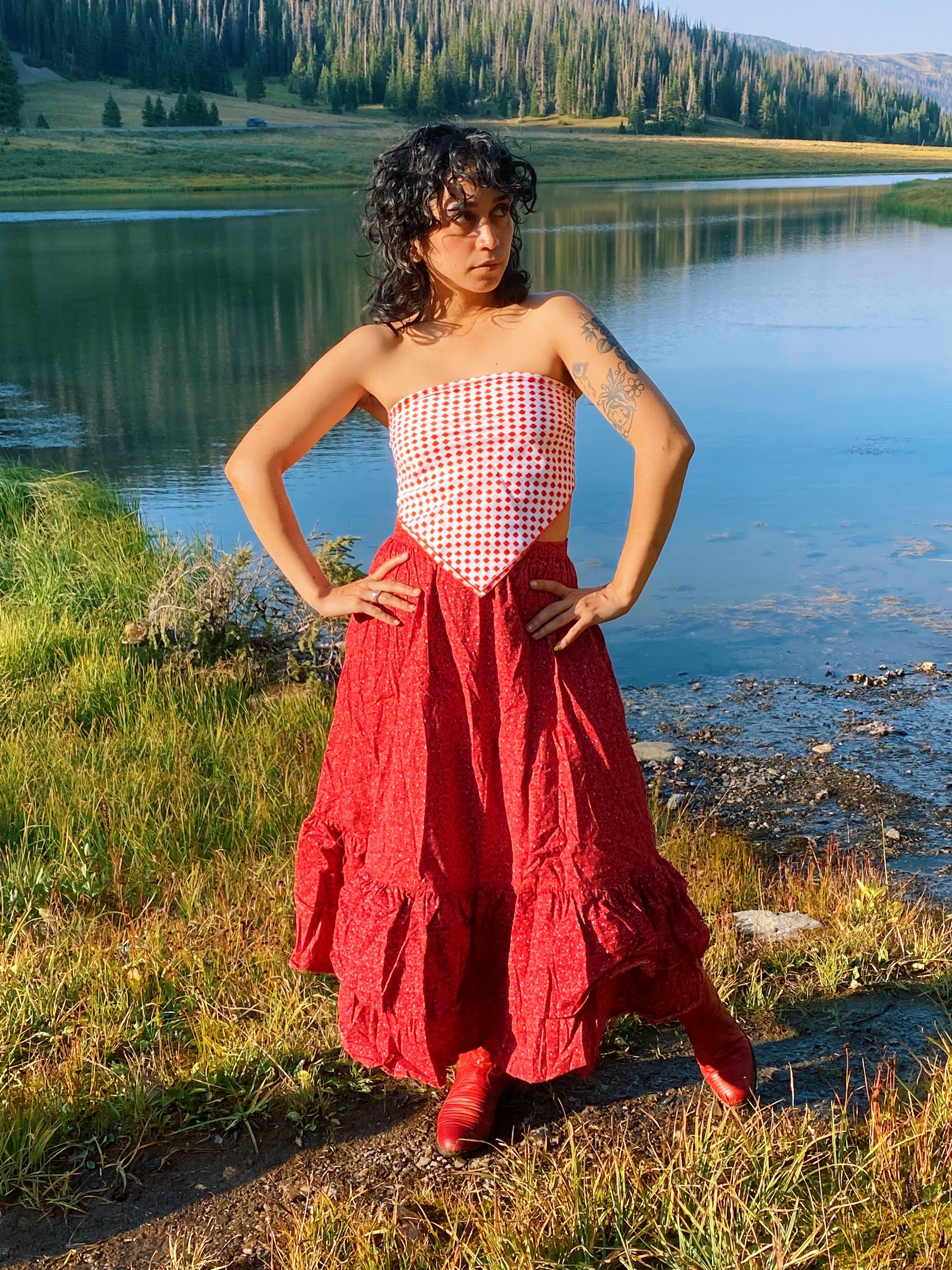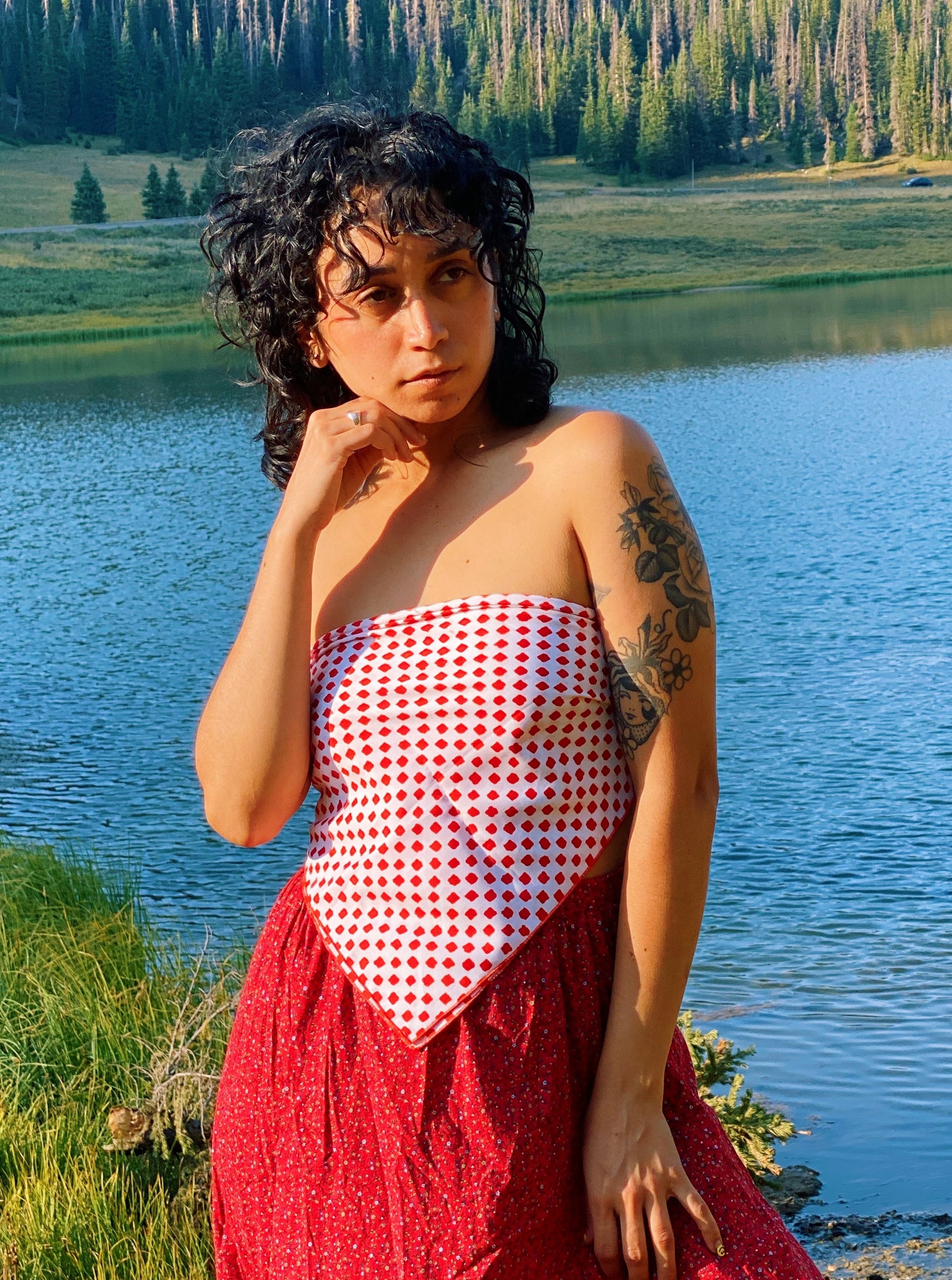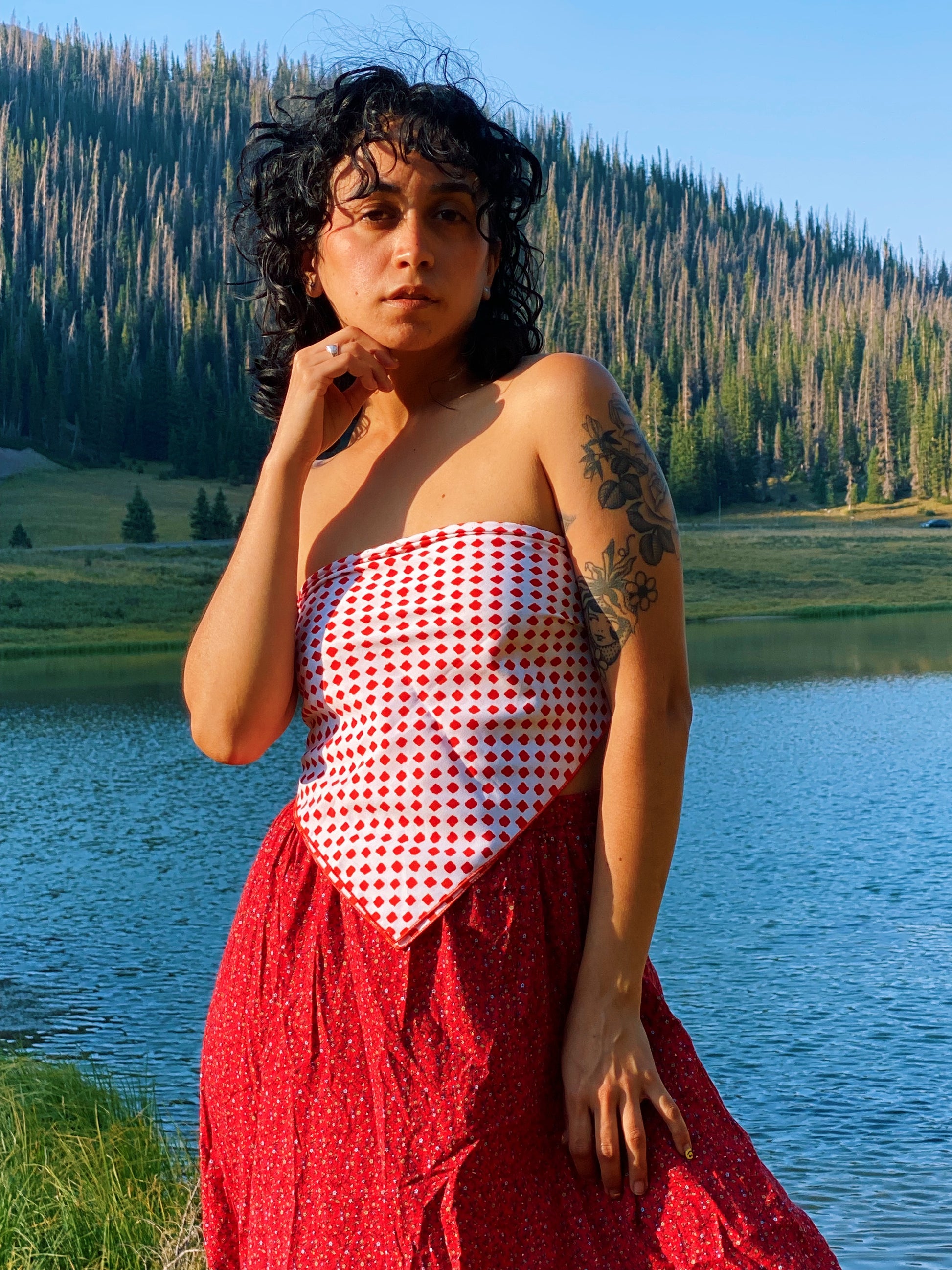Vintage 70s red and white scarf with watercolor style squares. Love the blend of organic shapes and op-art style patterning. By Cathy of California. Seen styled as a scarf top on Justina.