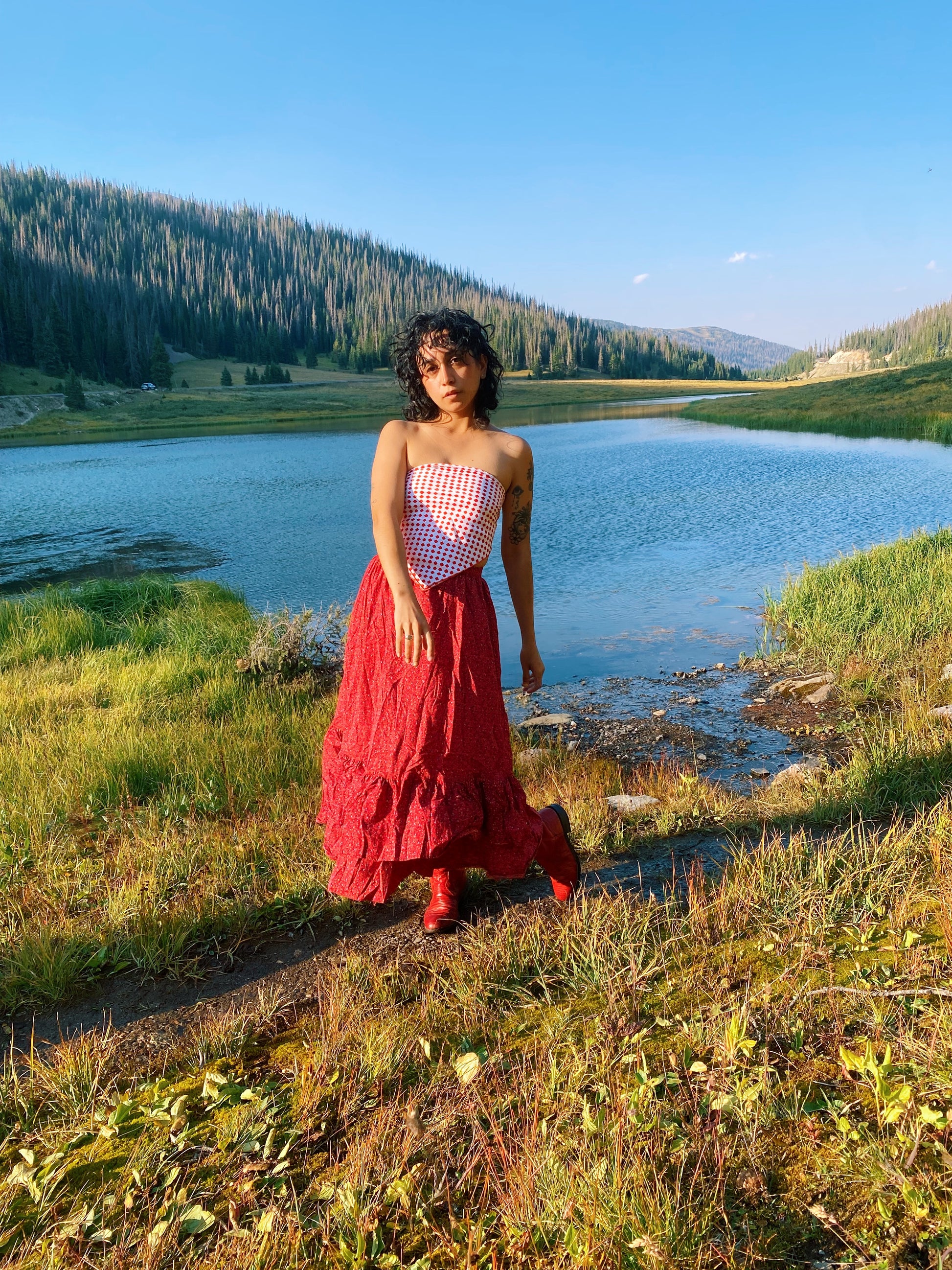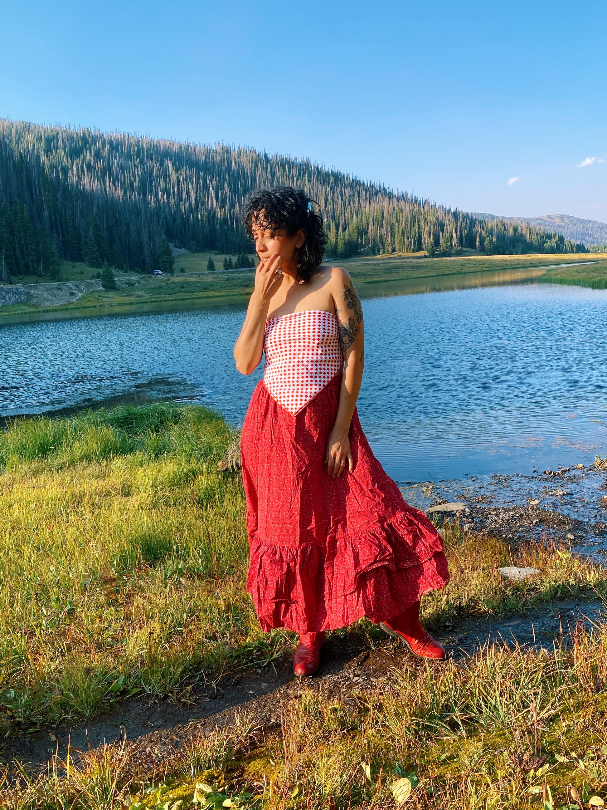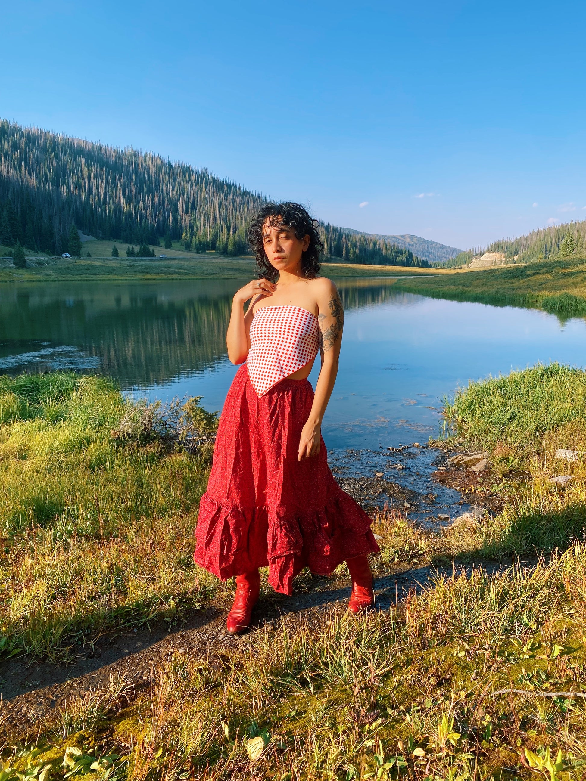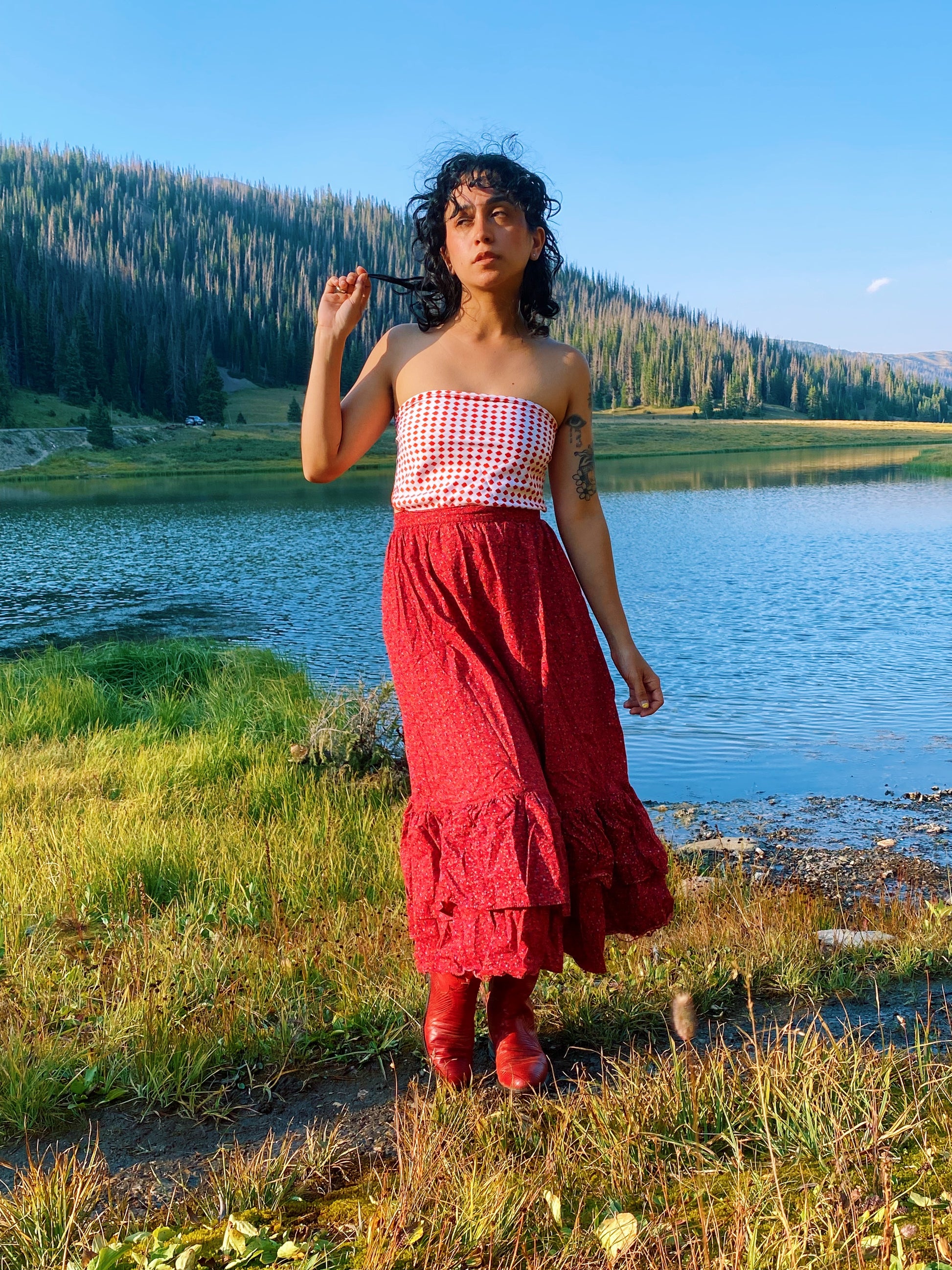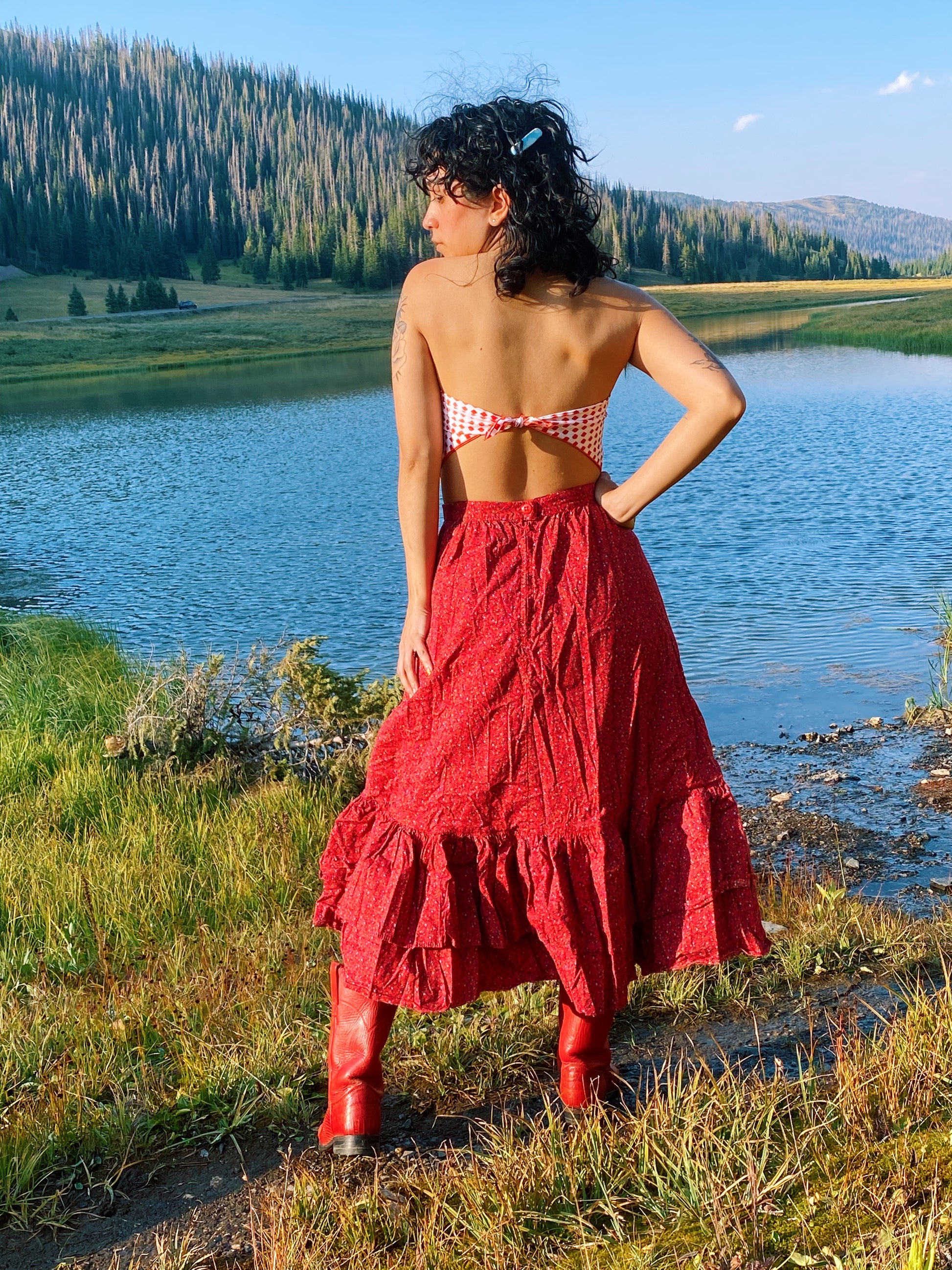 Vintage 70s red and white scarf with watercolor style squares. Love the blend of organic shapes and op-art style patterning. By Cathy of California. Seen styled as a scarf top on Justina.
