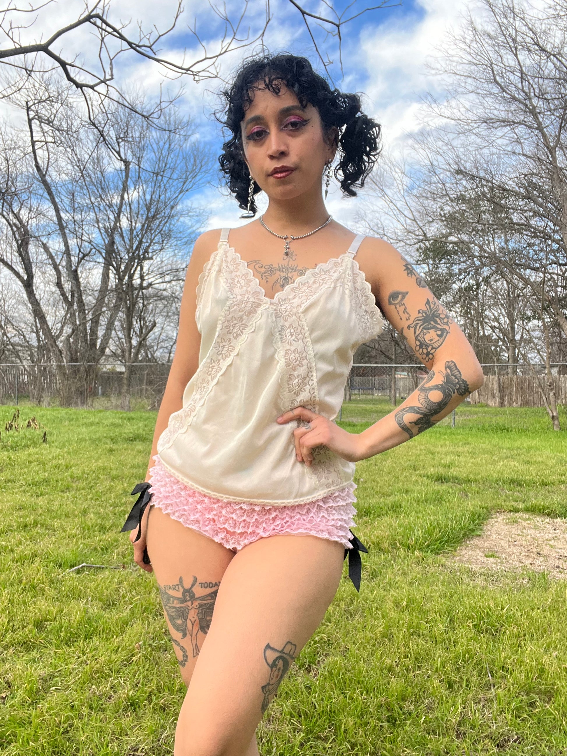 Vintage 70s ivory white slip tank with a beuatiful lace detail that crosses on the chest. Love the shape this creates on the body- so flattering! Straps are adjustable. Tag is washed out. Best fits a S-M. Seen on Justina.