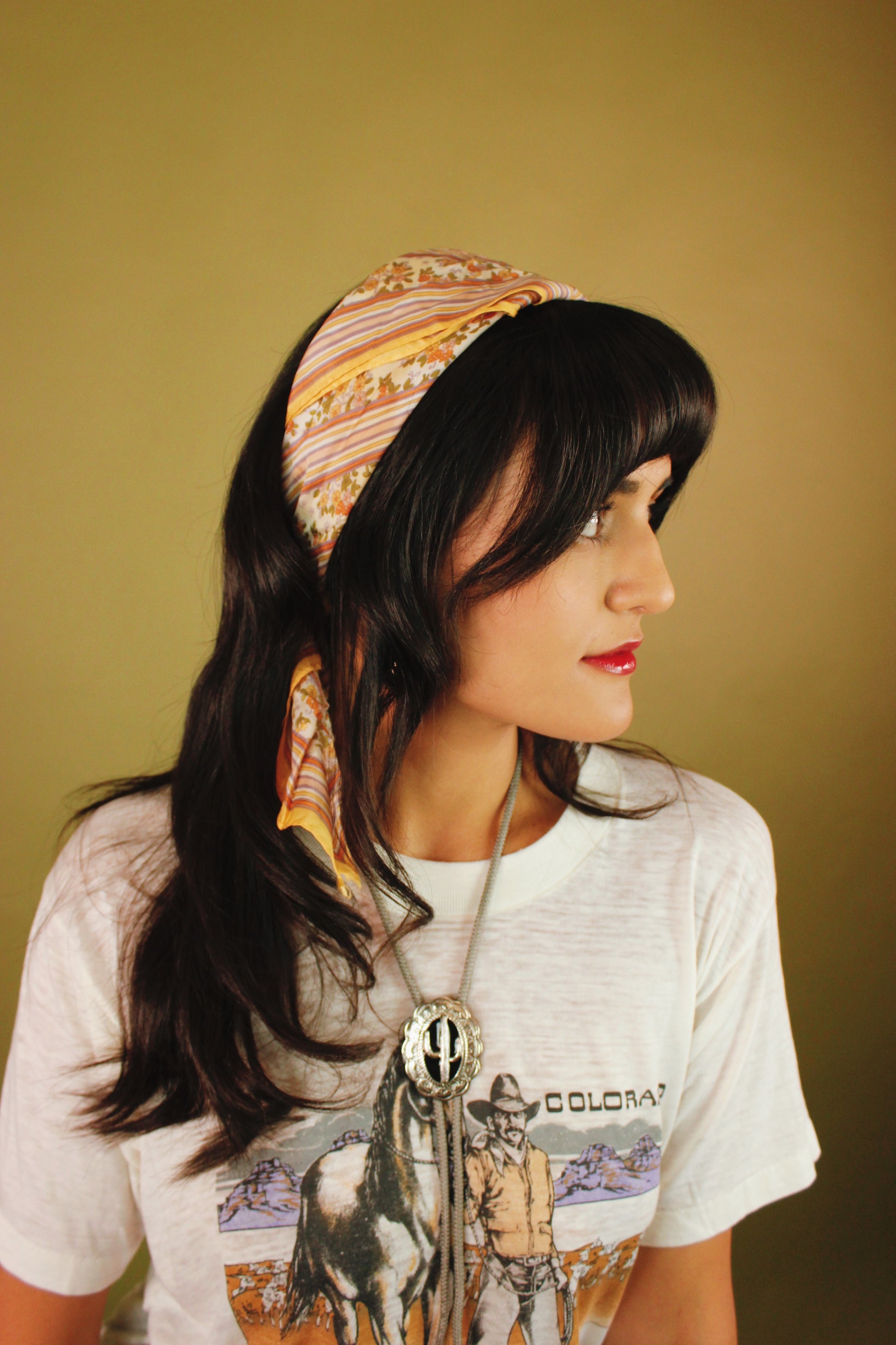 Vintage 70s golden yellow/ soft pink striped micro-floral scarf. Super cute color palette. Needs to be ironed.