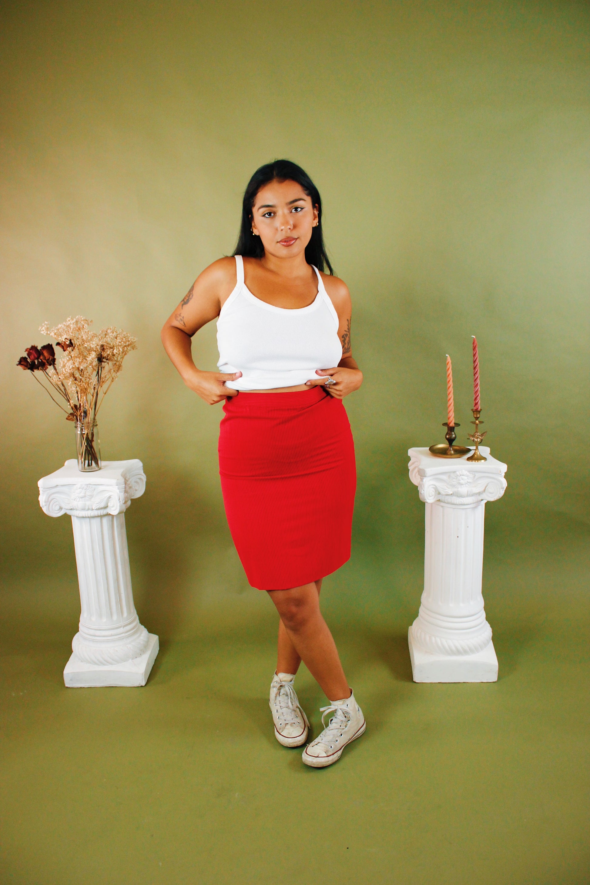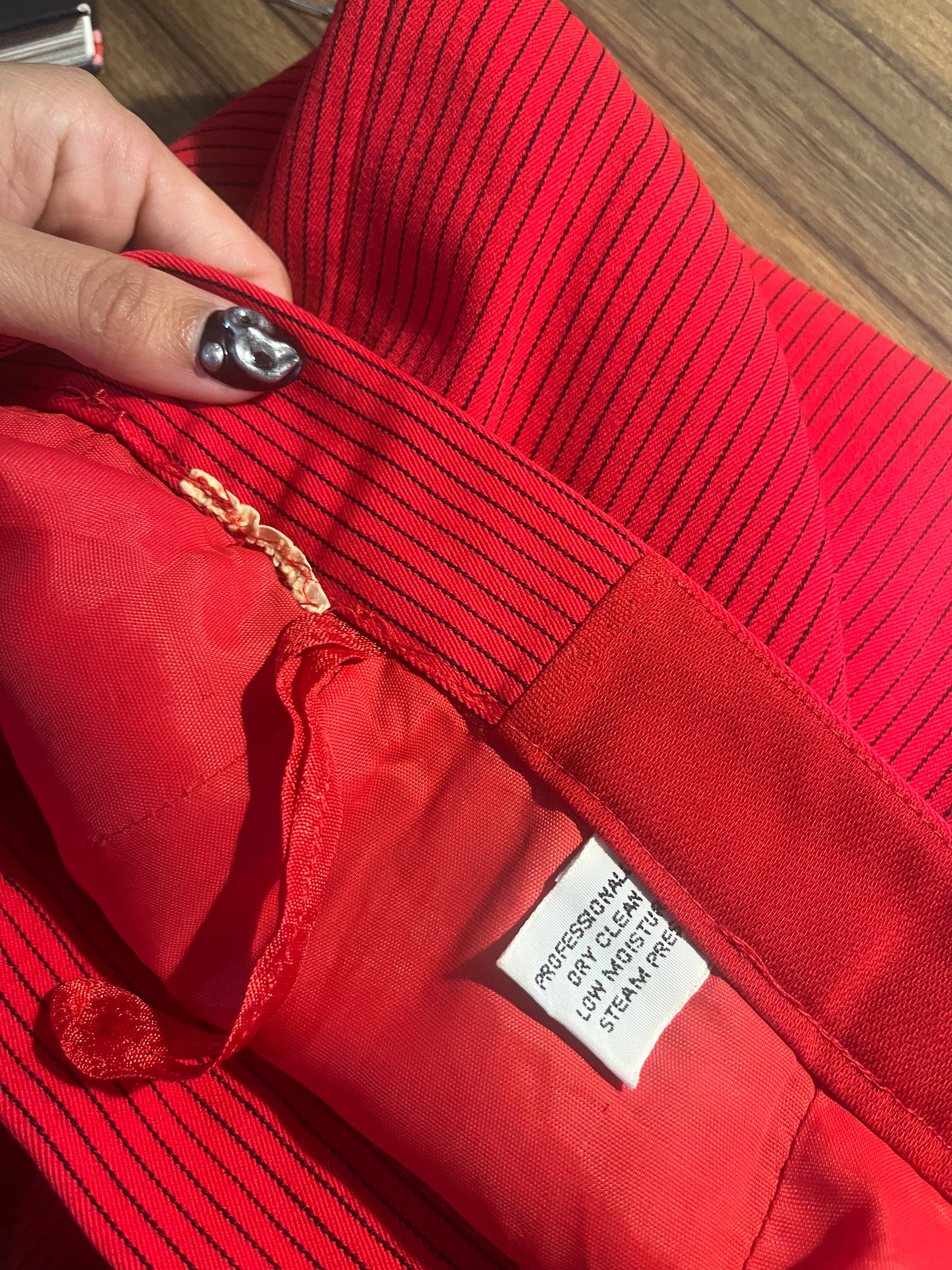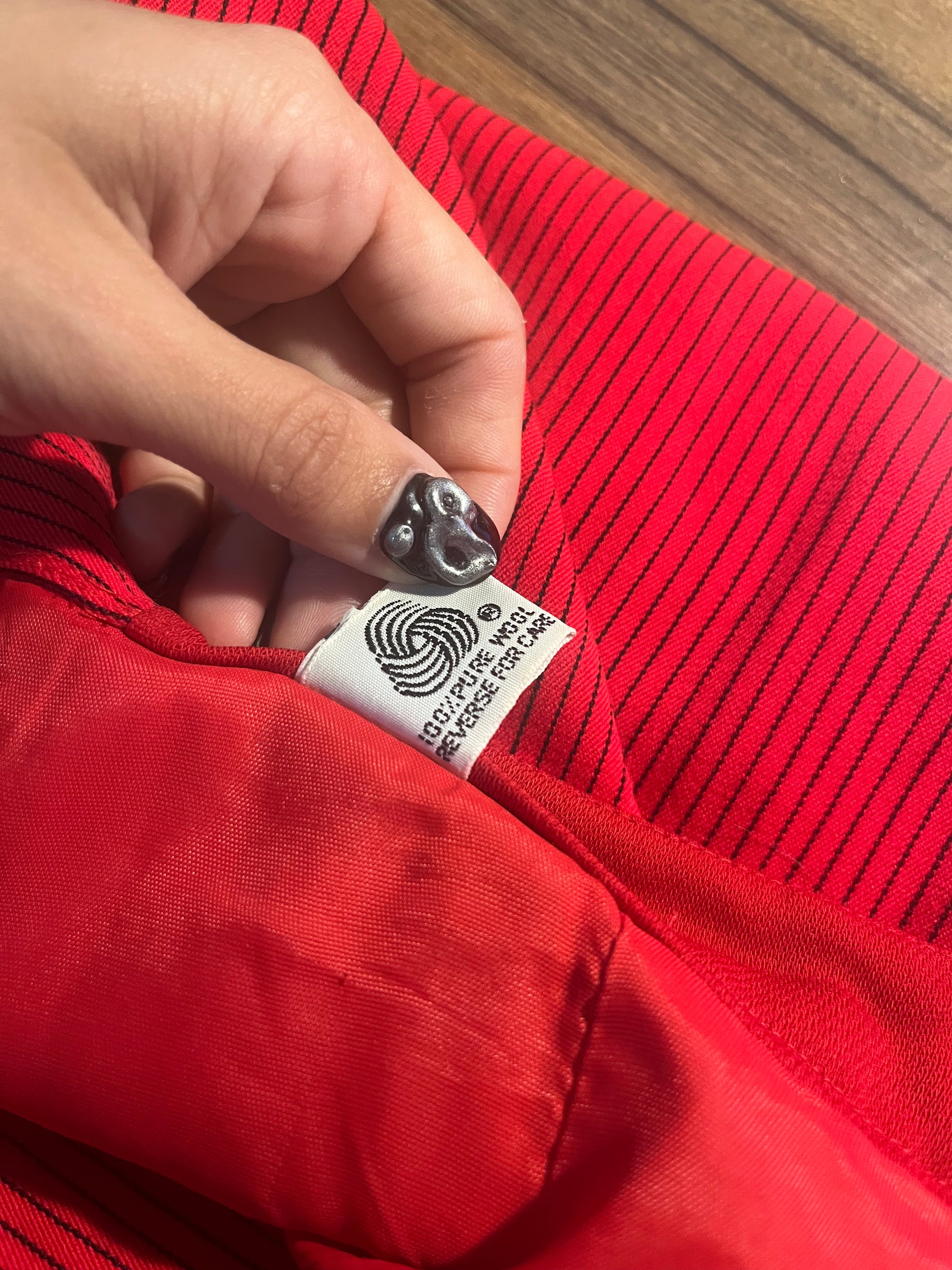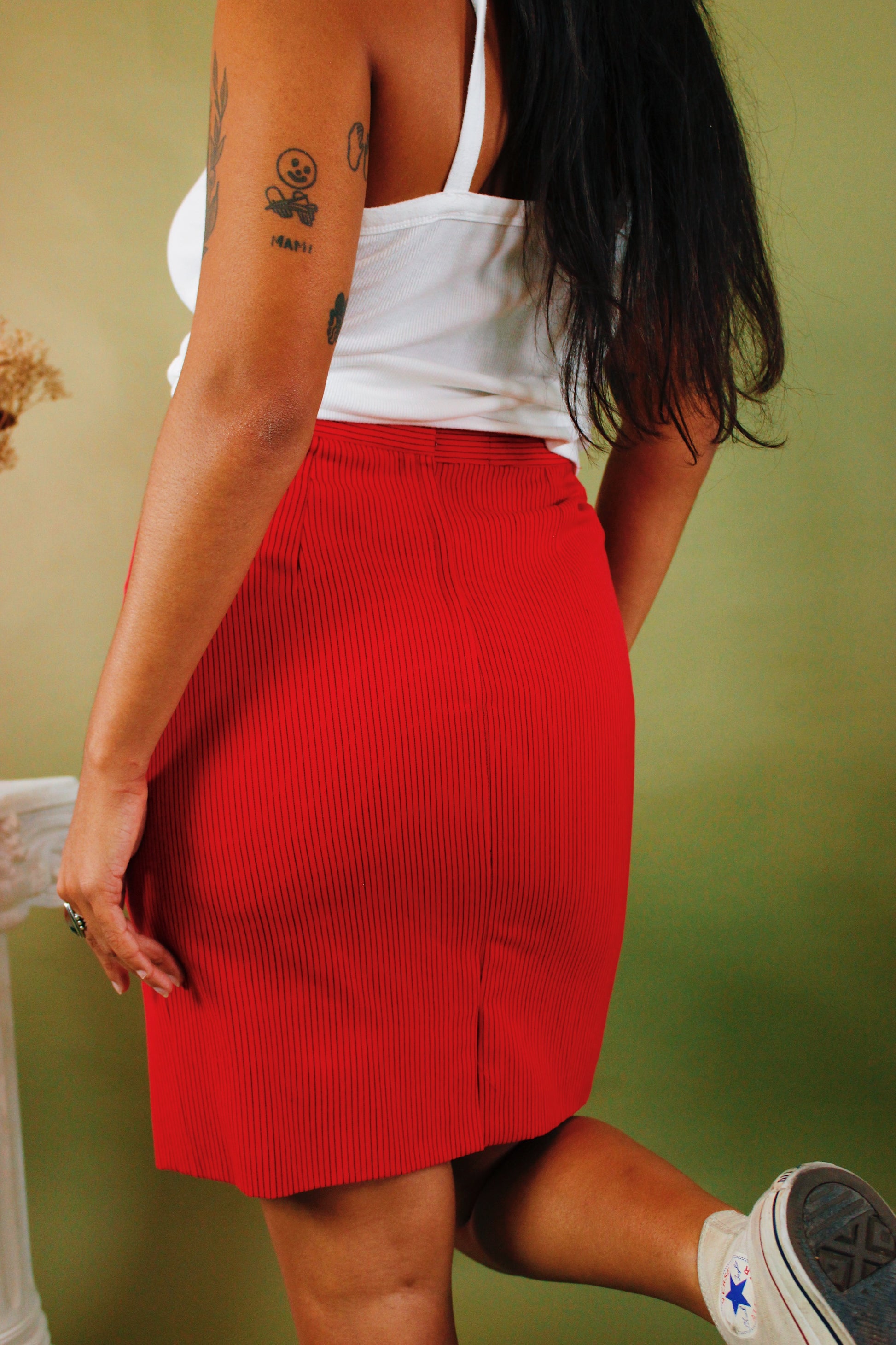 Vintage 80s red & black pinstripe midi skirt. Has a flattering, curve-hugging shape. Originally from our Halloween collection for an "Ace Ventura" look. Brand tag is cut. 100% Pure Wool. Made in USA. Best fits a M. Seen on Sam.