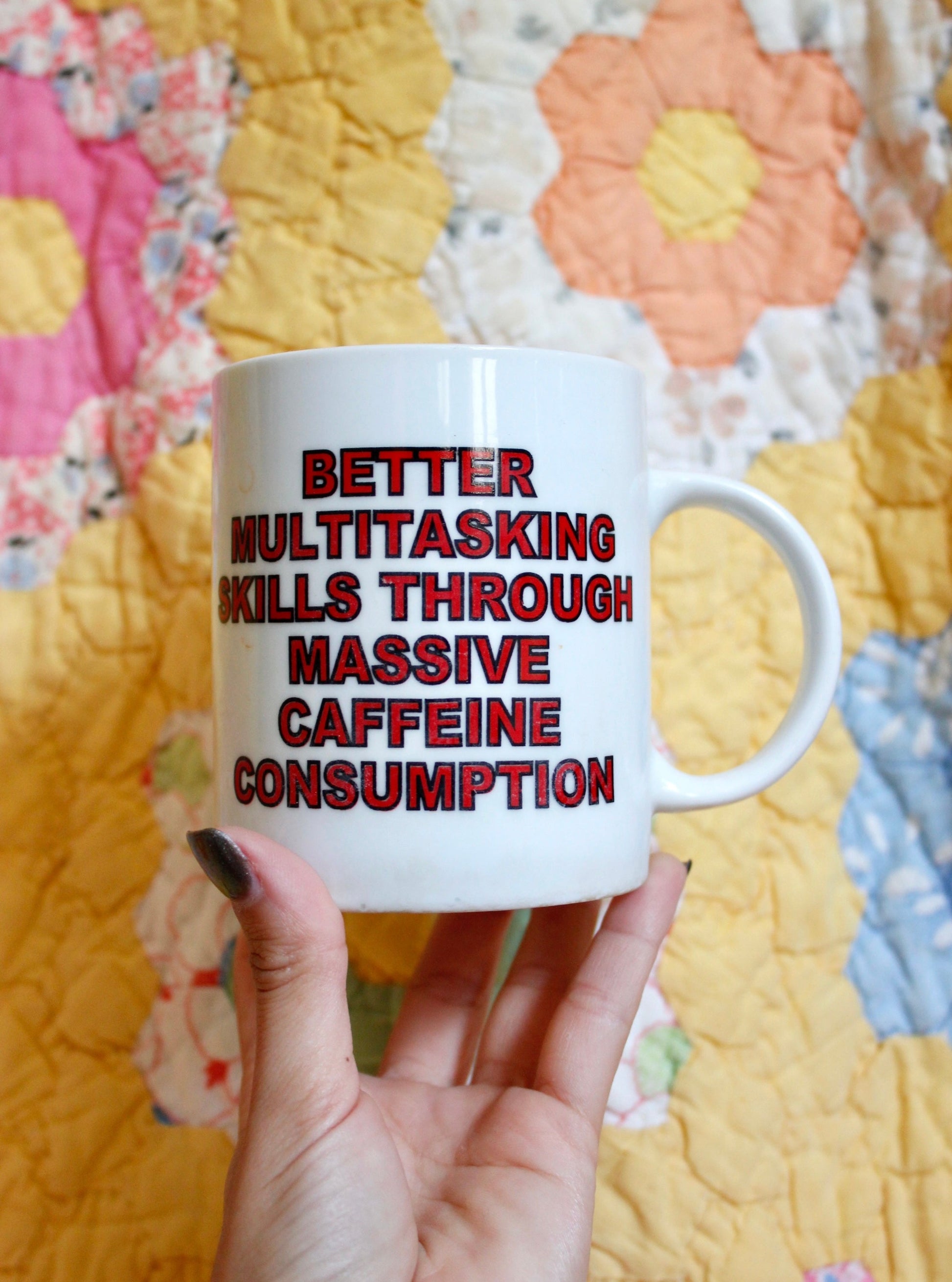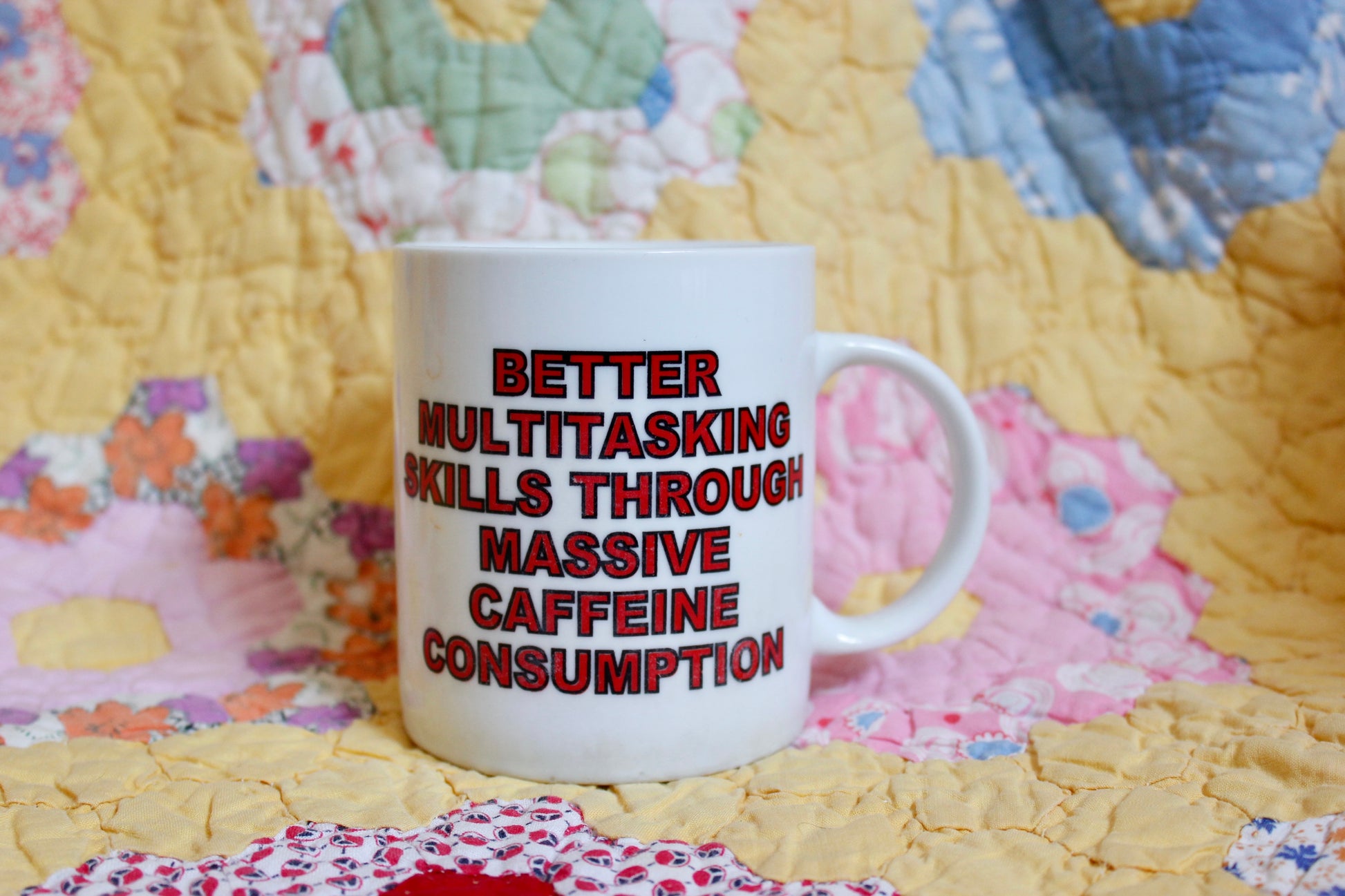 Vintage 80s block text novelty mug that reads "Better Multitasking Skills Through Massive Caffeine Consumption." Speaks for itself!