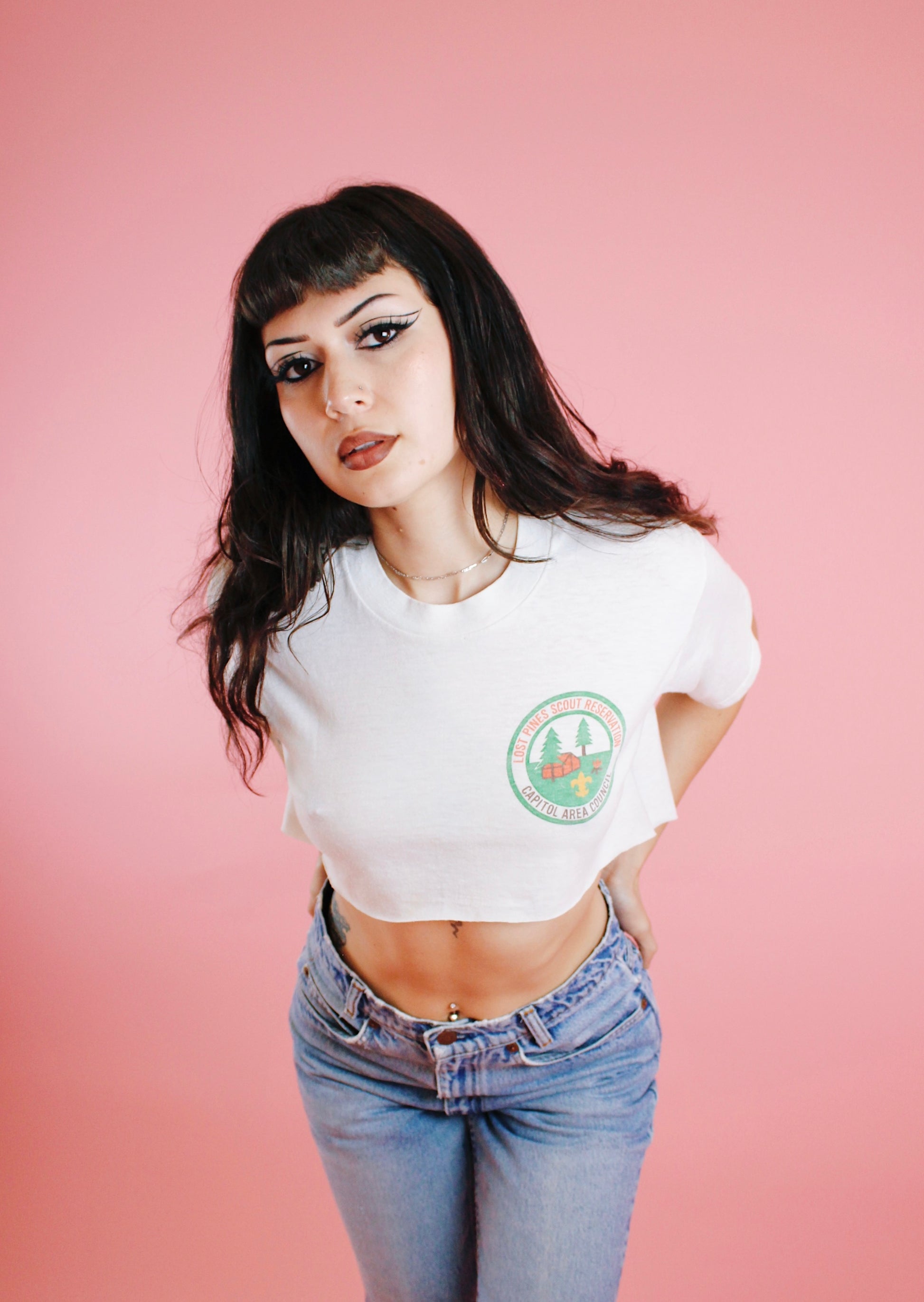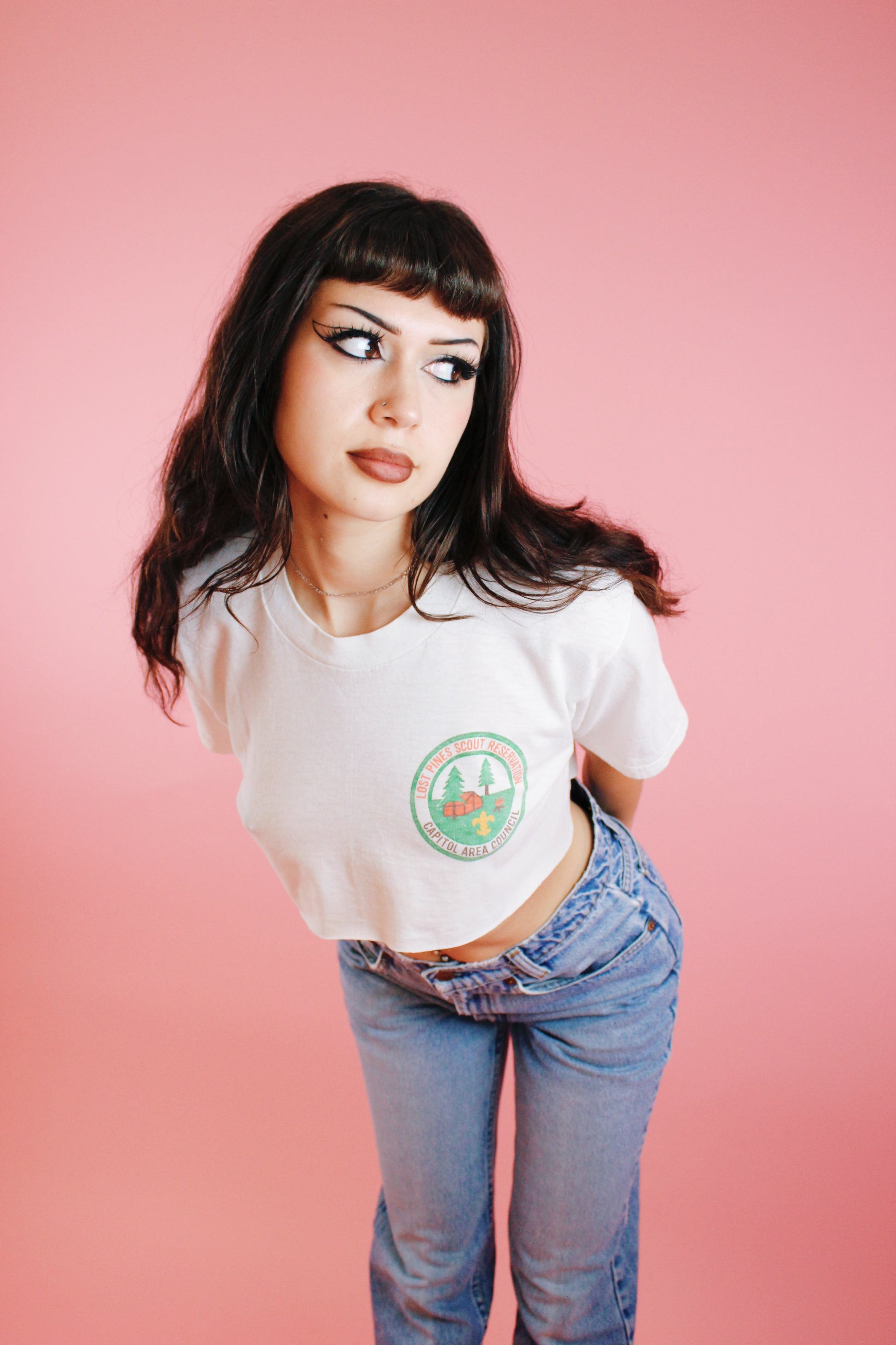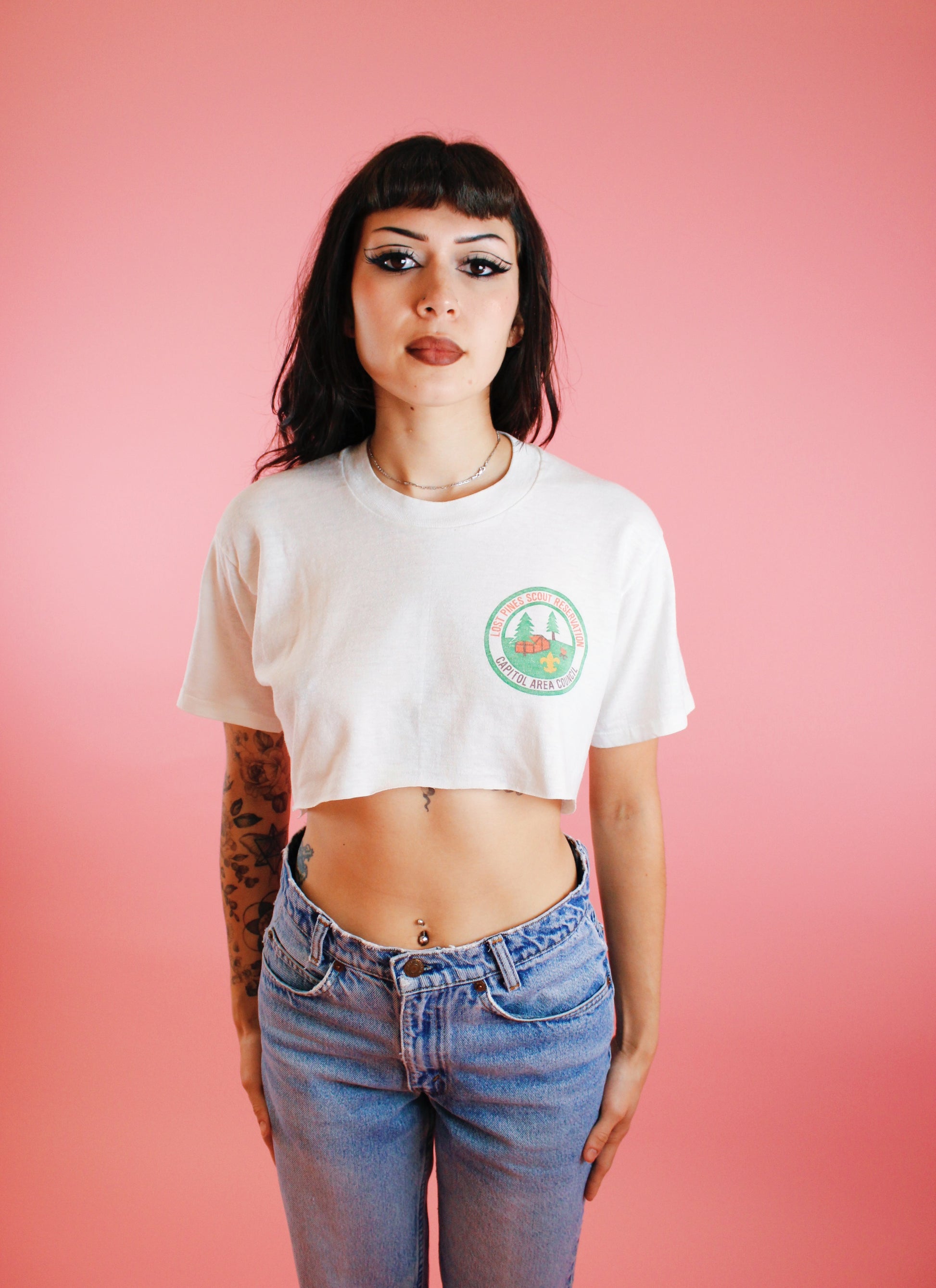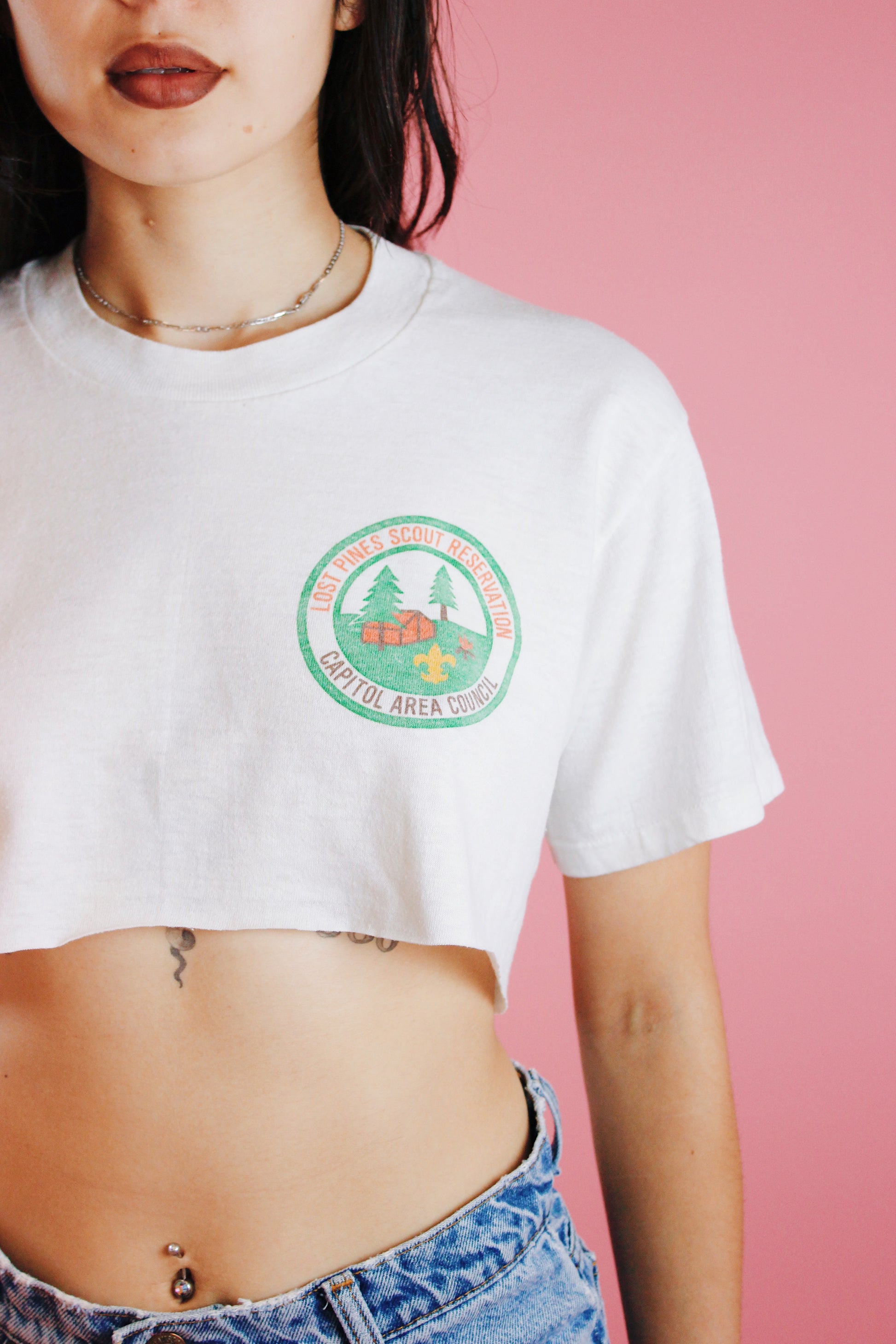 Vintage 80s ultra-cropped lost pines scout tee. Super soft, thin, and single stitched! Everything we love in a tee. Has a hella cute camp graphic on the crest. Tag size M, 50% Polyester 50% Cotton. Best fits a S-M. Seen on Angelica.