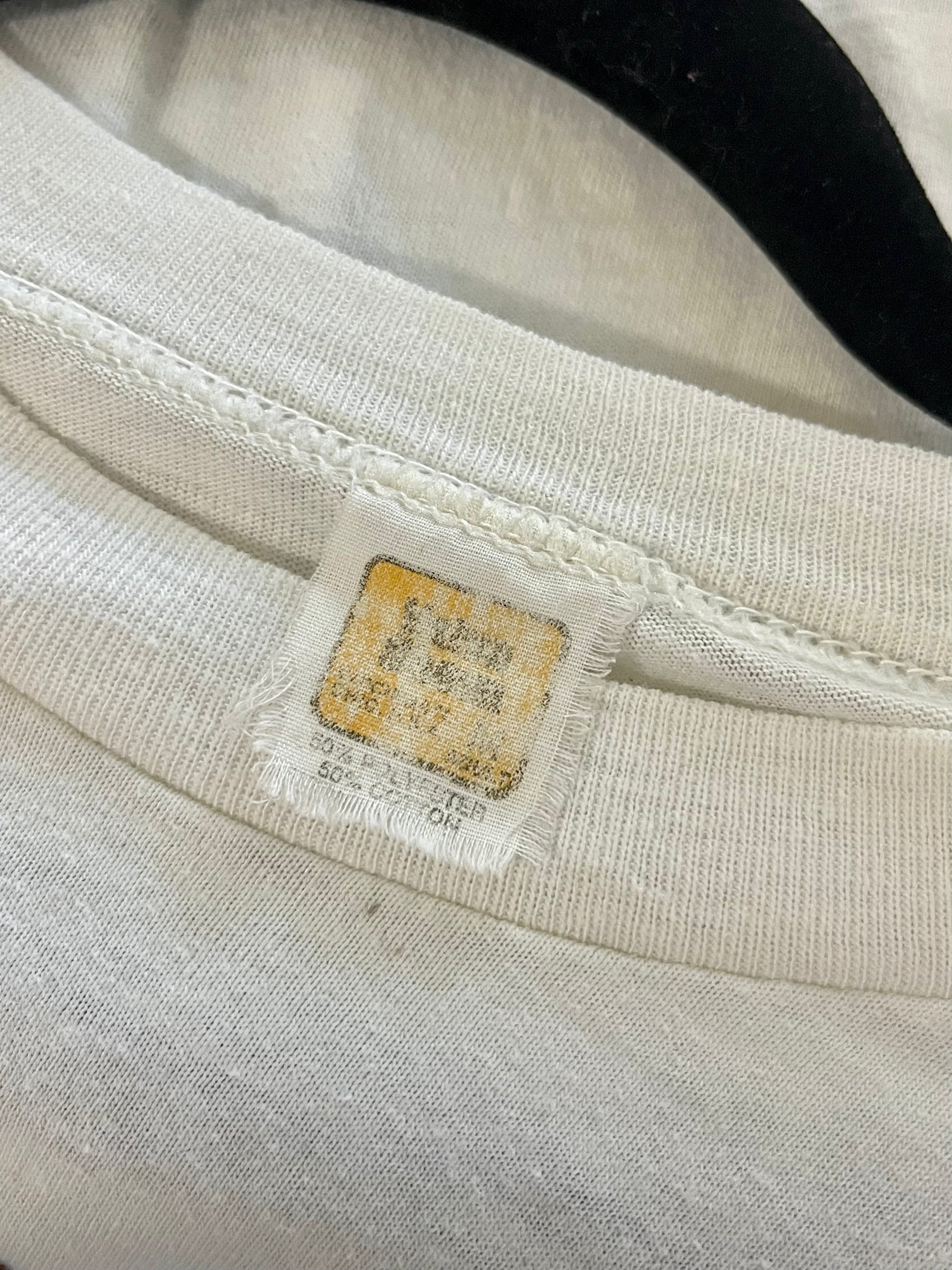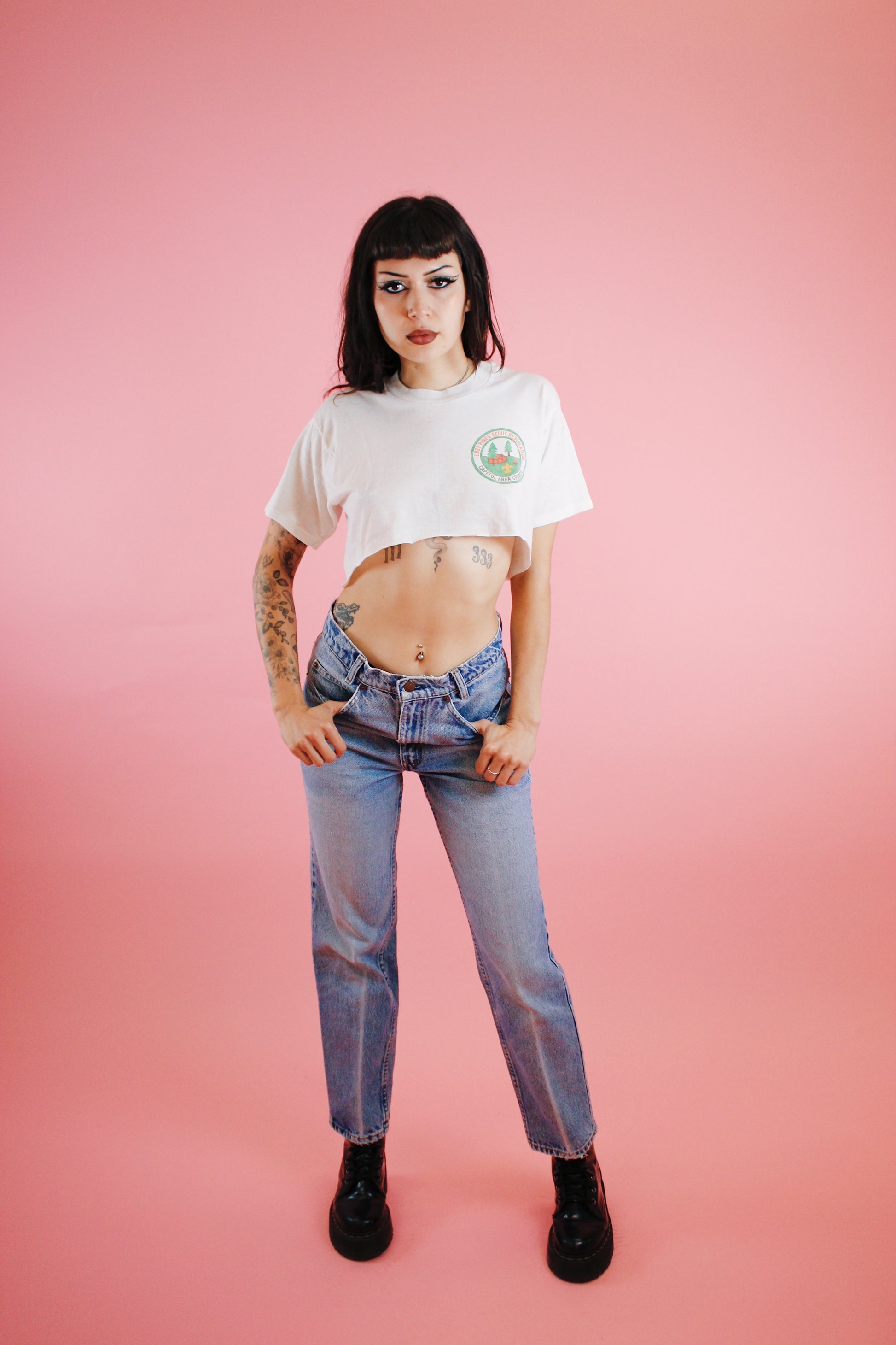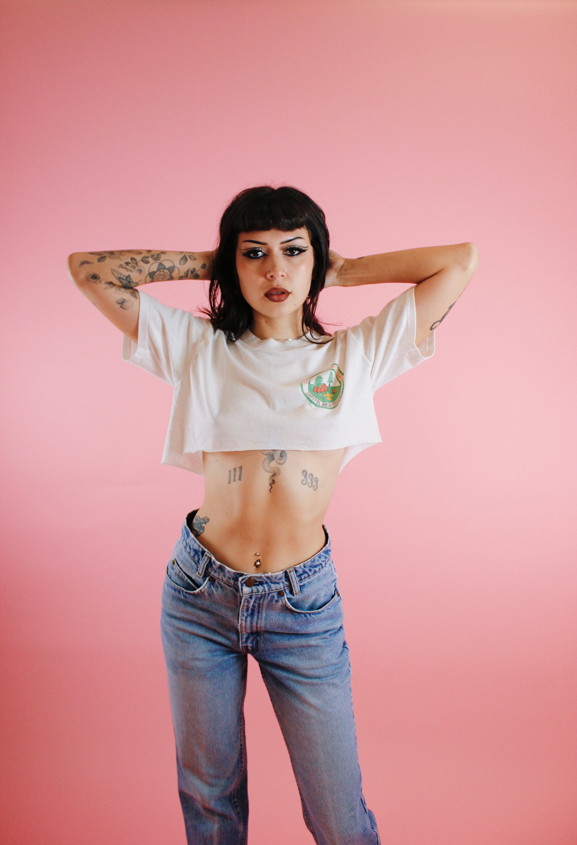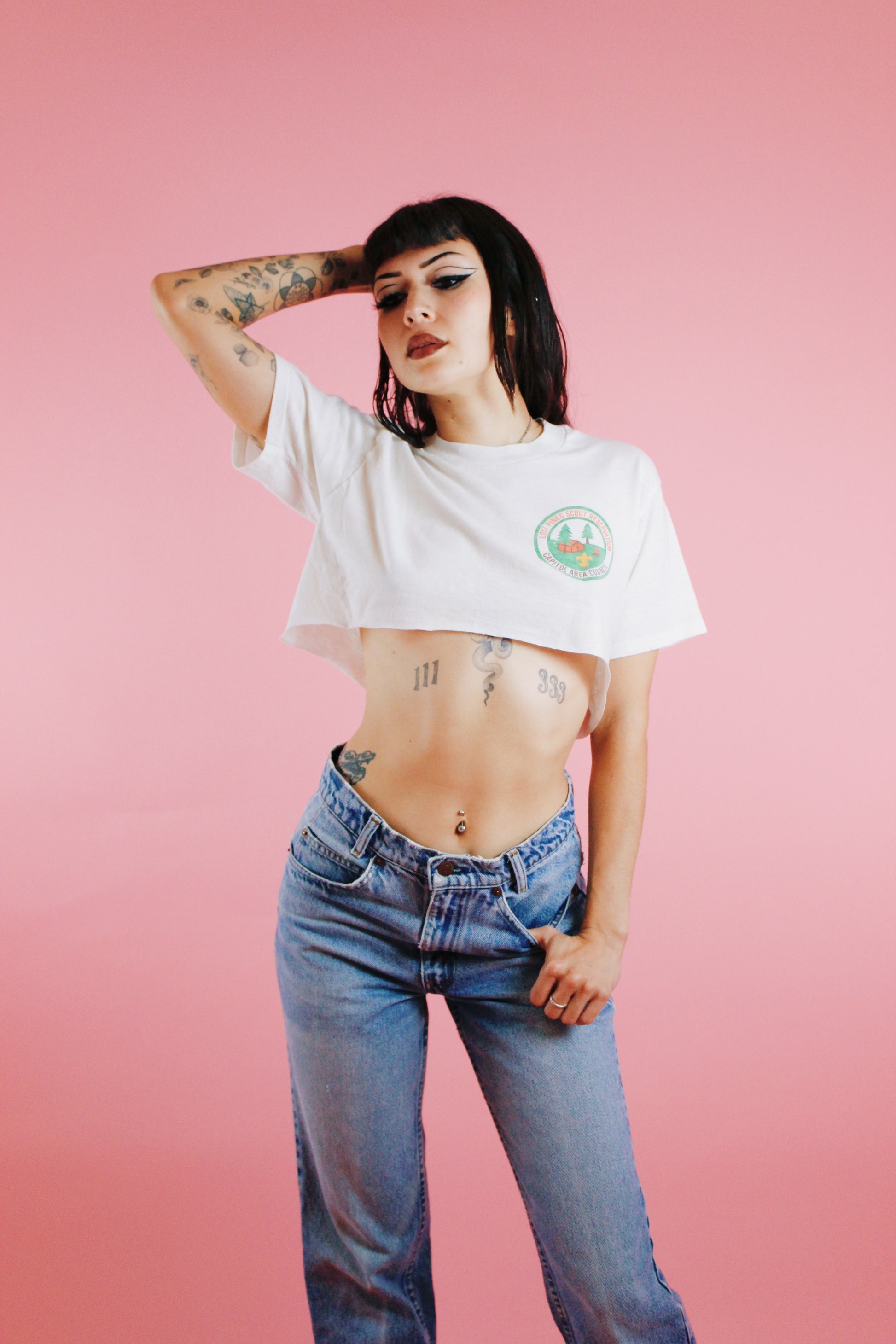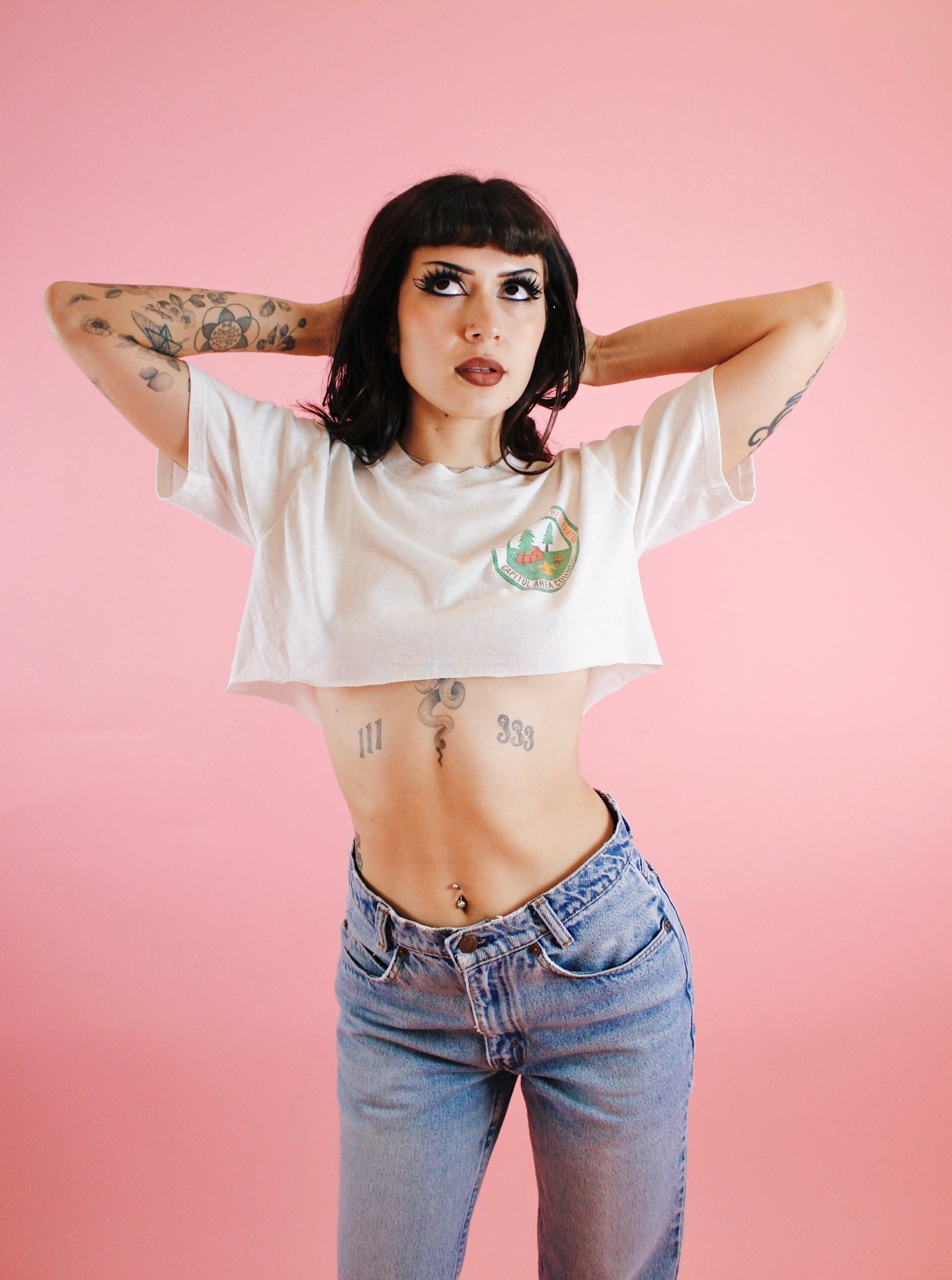 Vintage 80s ultra-cropped lost pines scout tee. Super soft, thin, and single stitched! Everything we love in a tee. Has a hella cute camp graphic on the crest. Tag size M, 50% Polyester 50% Cotton. Best fits a S-M. Seen on Angelica.