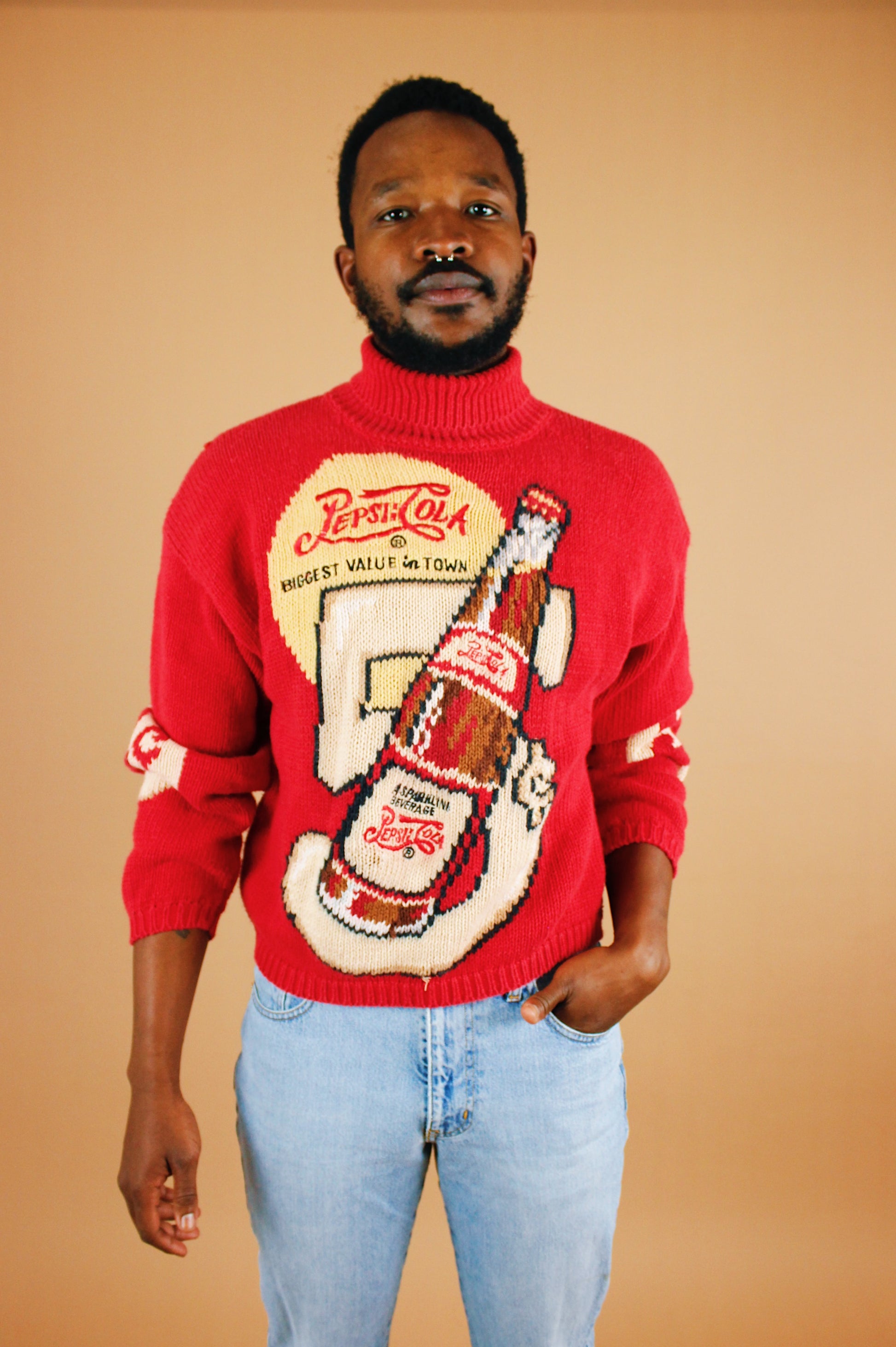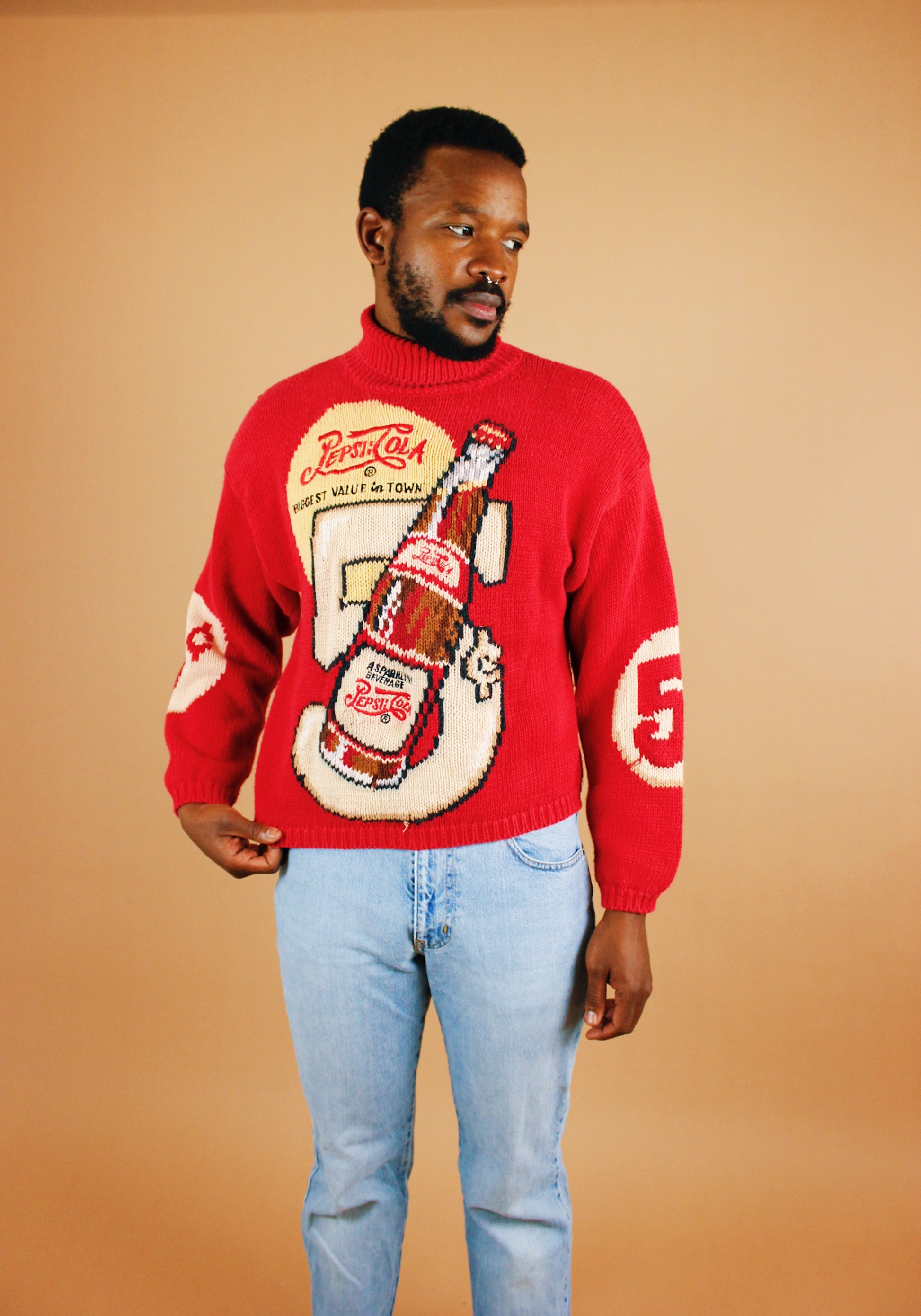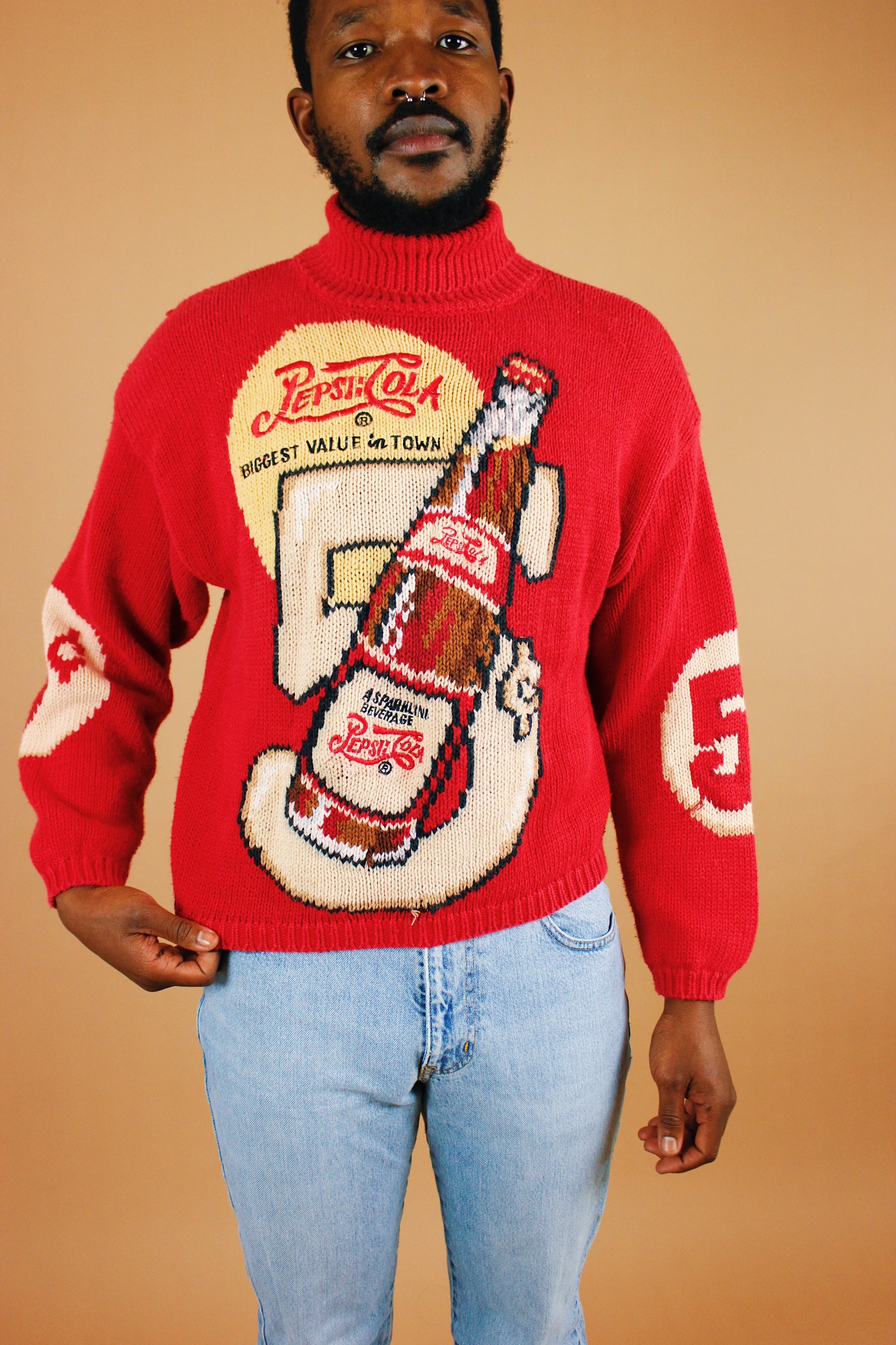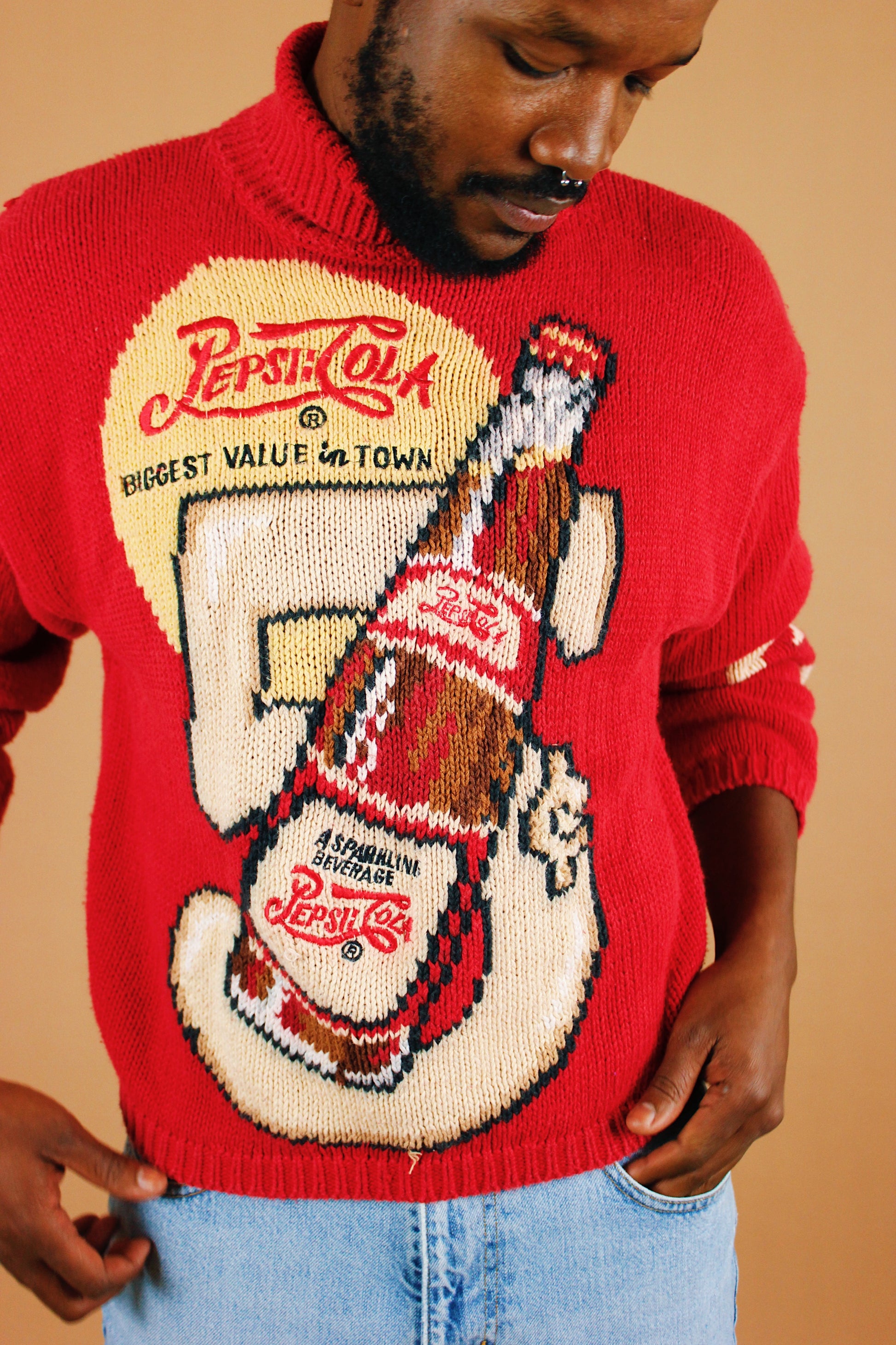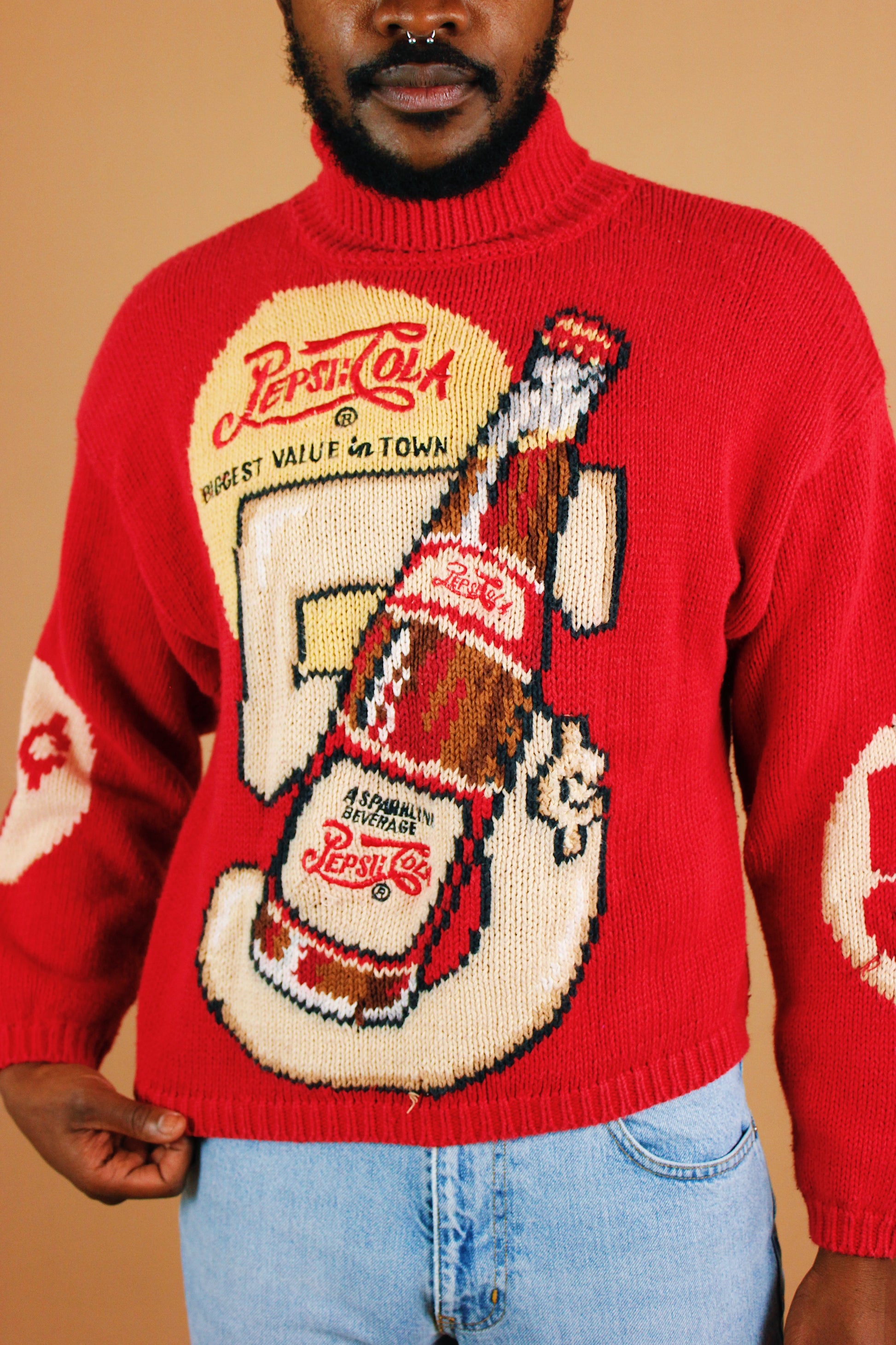 Vintage 80s chunky knit novelty Pepsi-Cola turtleneck sweater by Eagle Eye. These sweaters are beautifully detailed + highly collectible! We love a cozy kitsch moment. Tag size L. 55% Ramie 45% Cotton. Best fits a S-M. Seen on Drake.