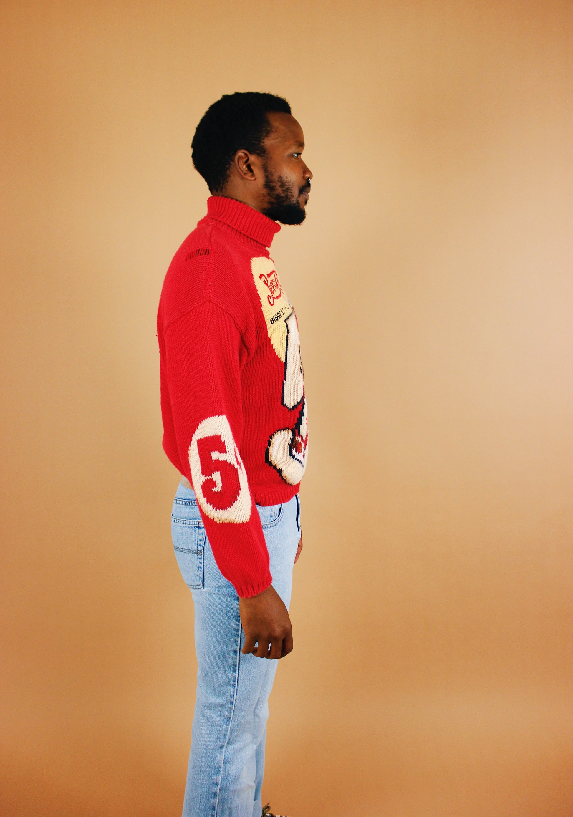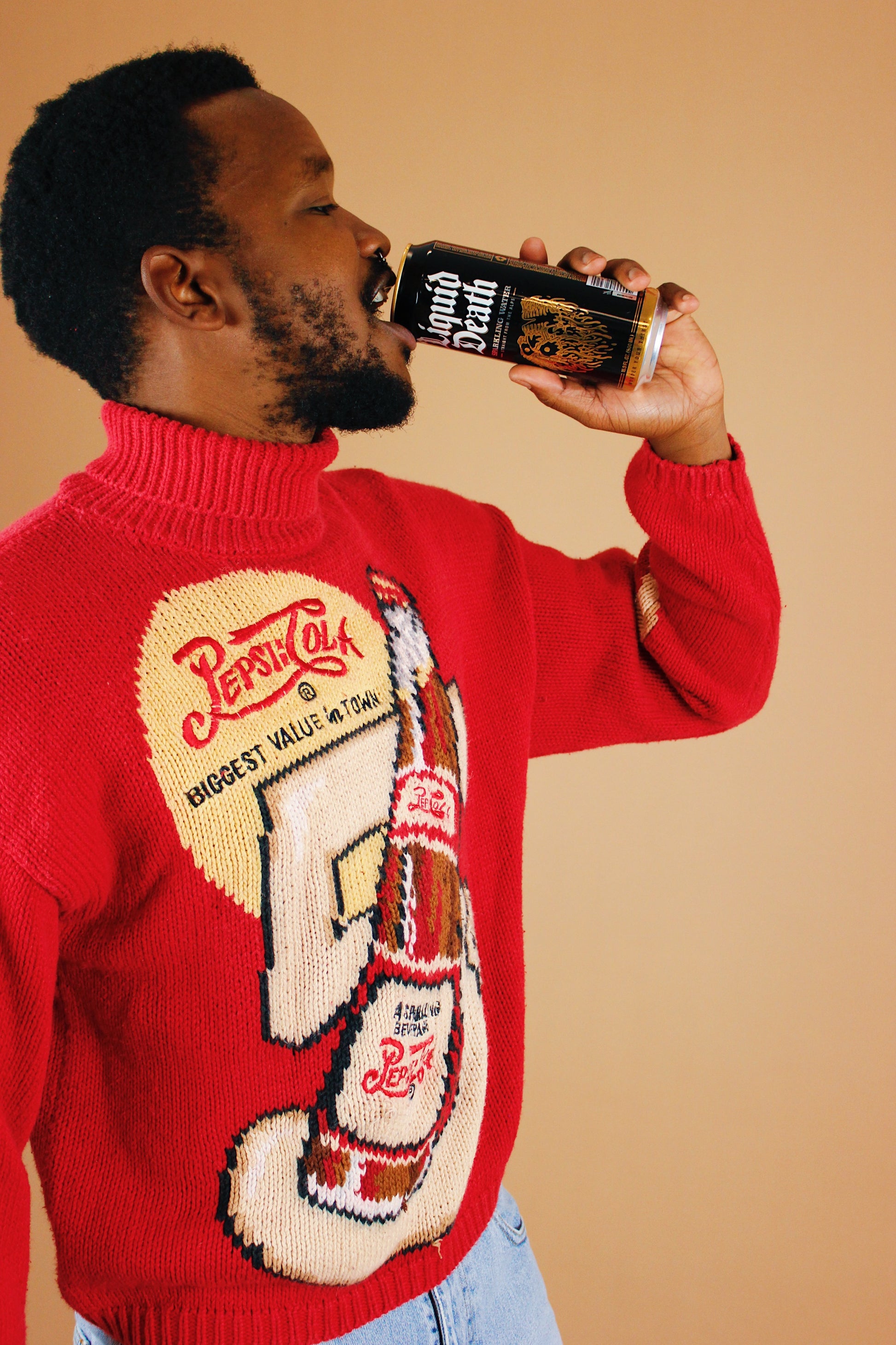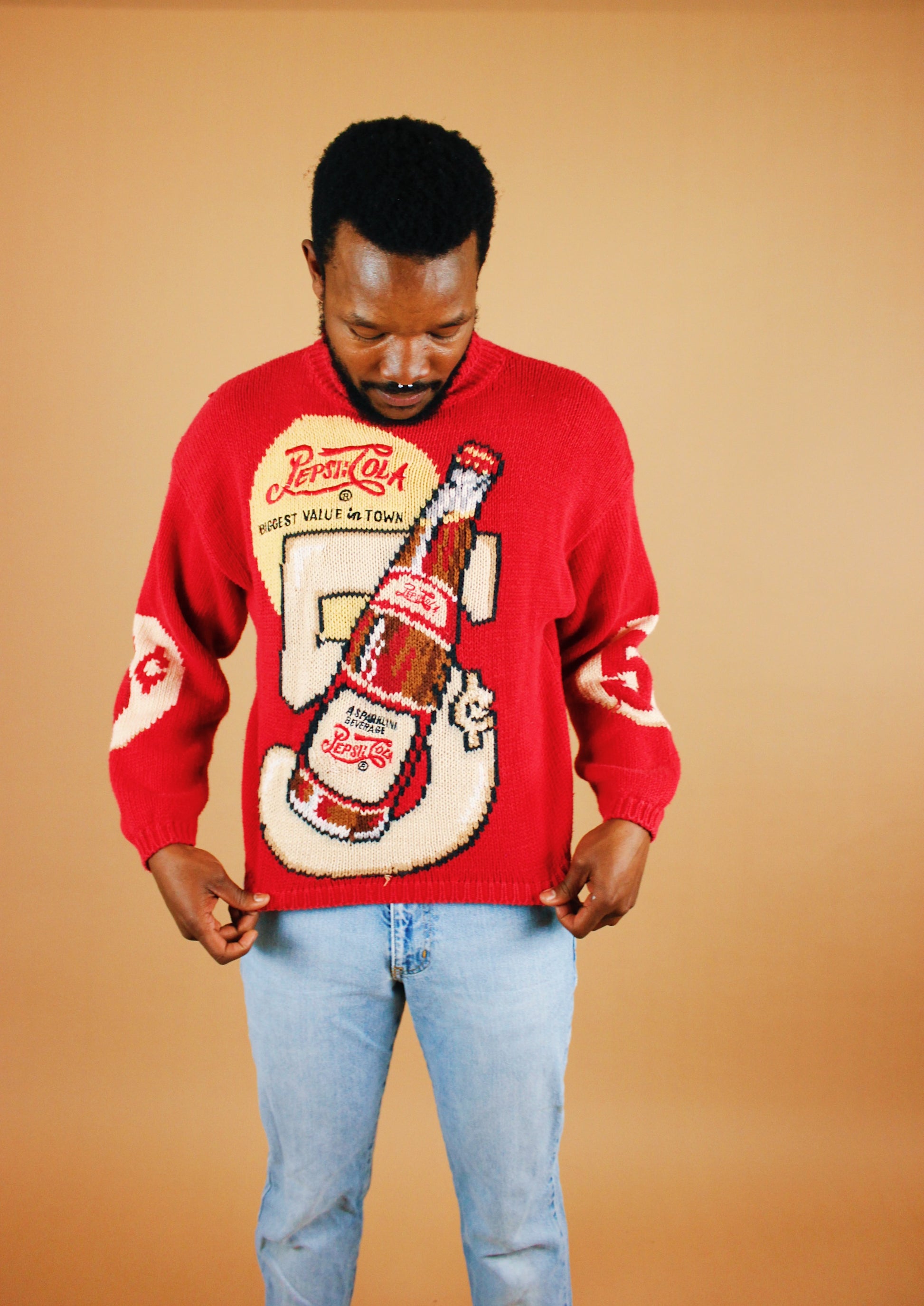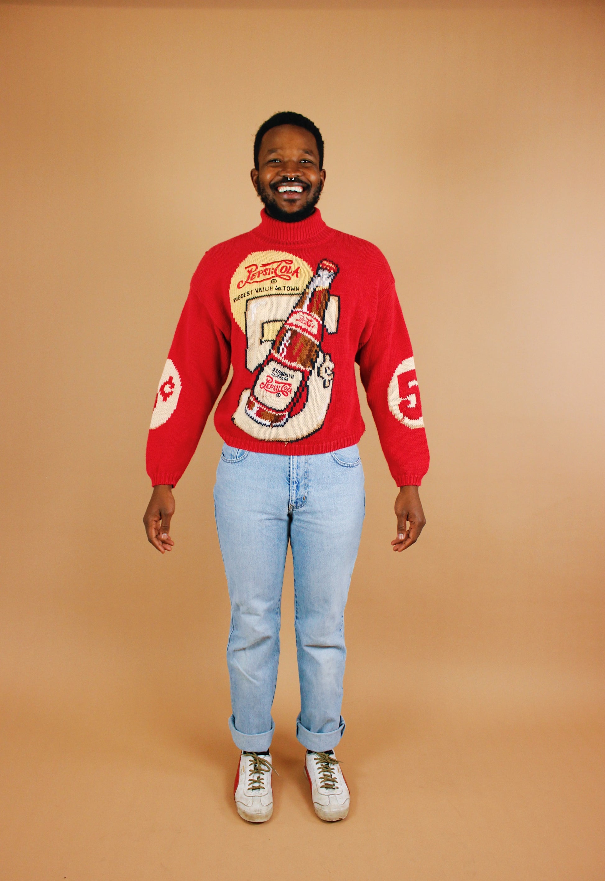 Vintage 80s chunky knit novelty Pepsi-Cola turtleneck sweater by Eagle Eye. These sweaters are beautifully detailed + highly collectible! We love a cozy kitsch moment. Tag size L. 55% Ramie 45% Cotton. Best fits a S-M. Seen on Drake.