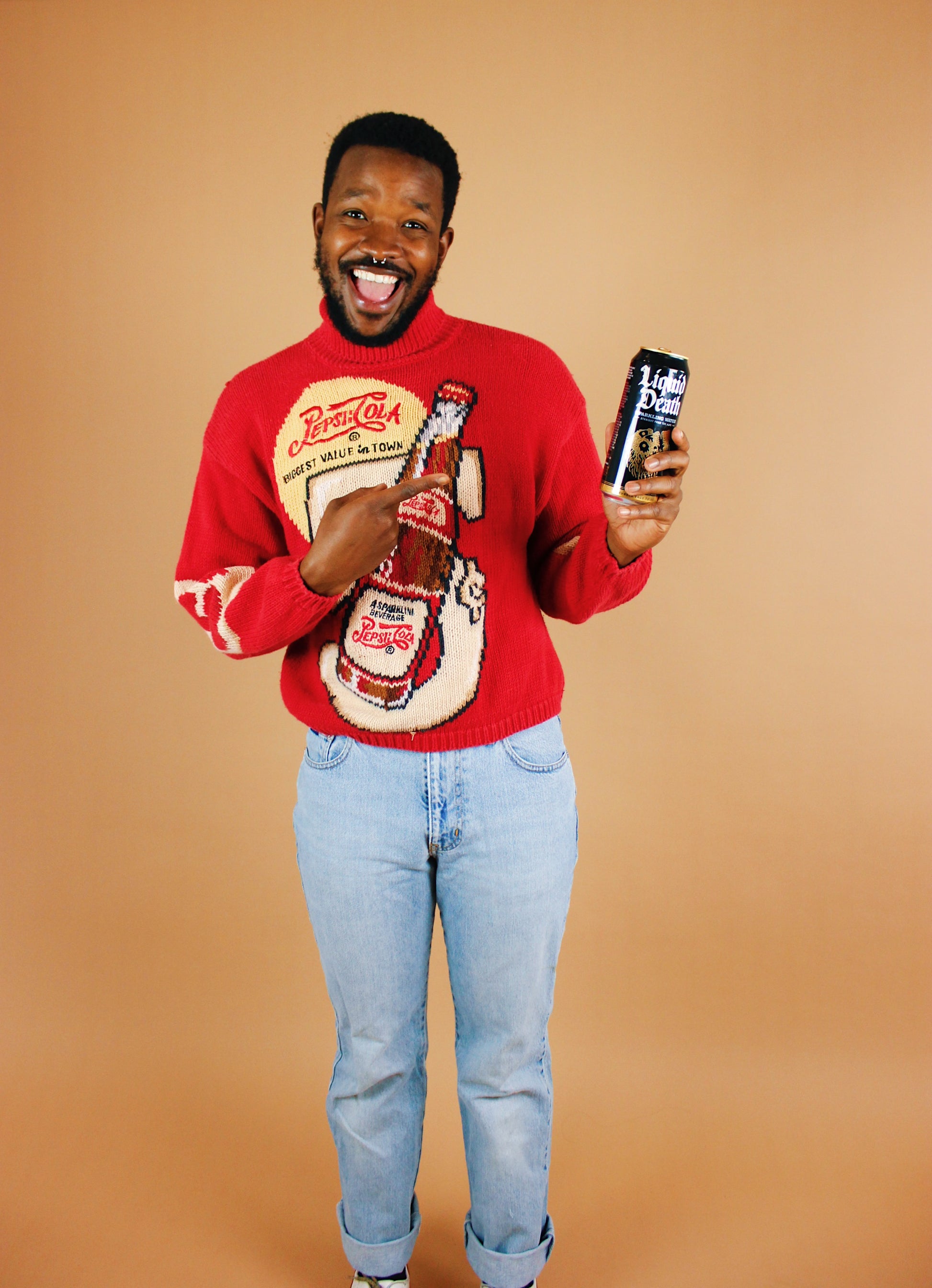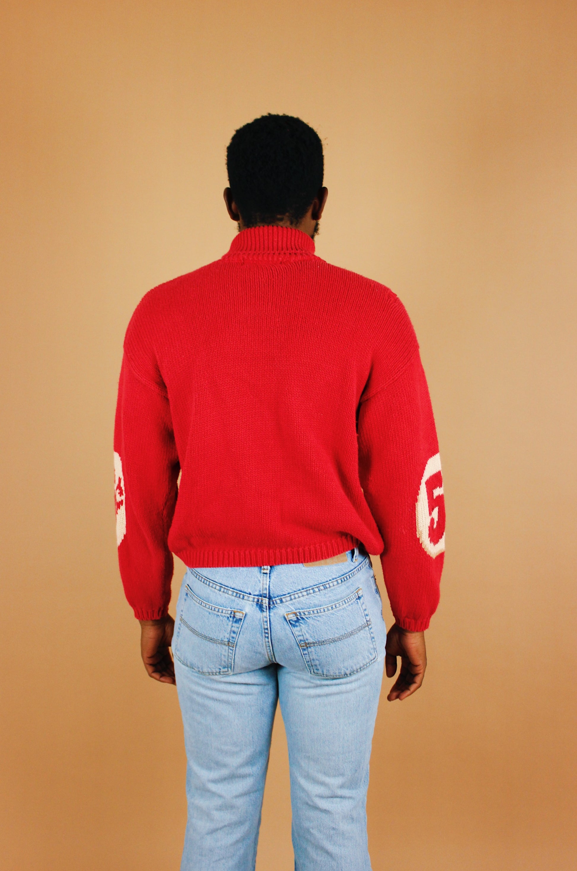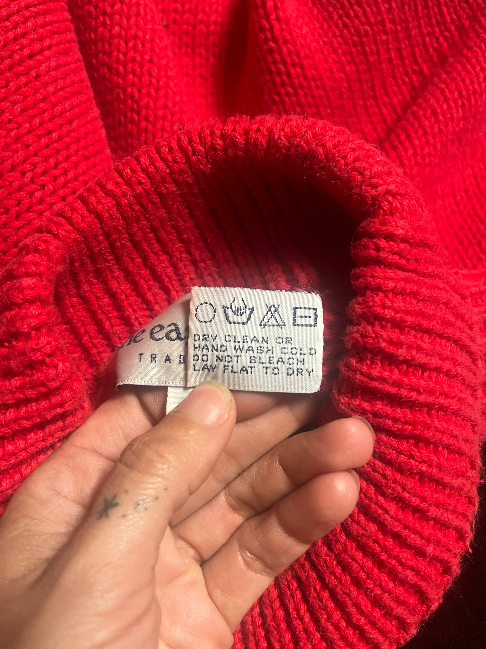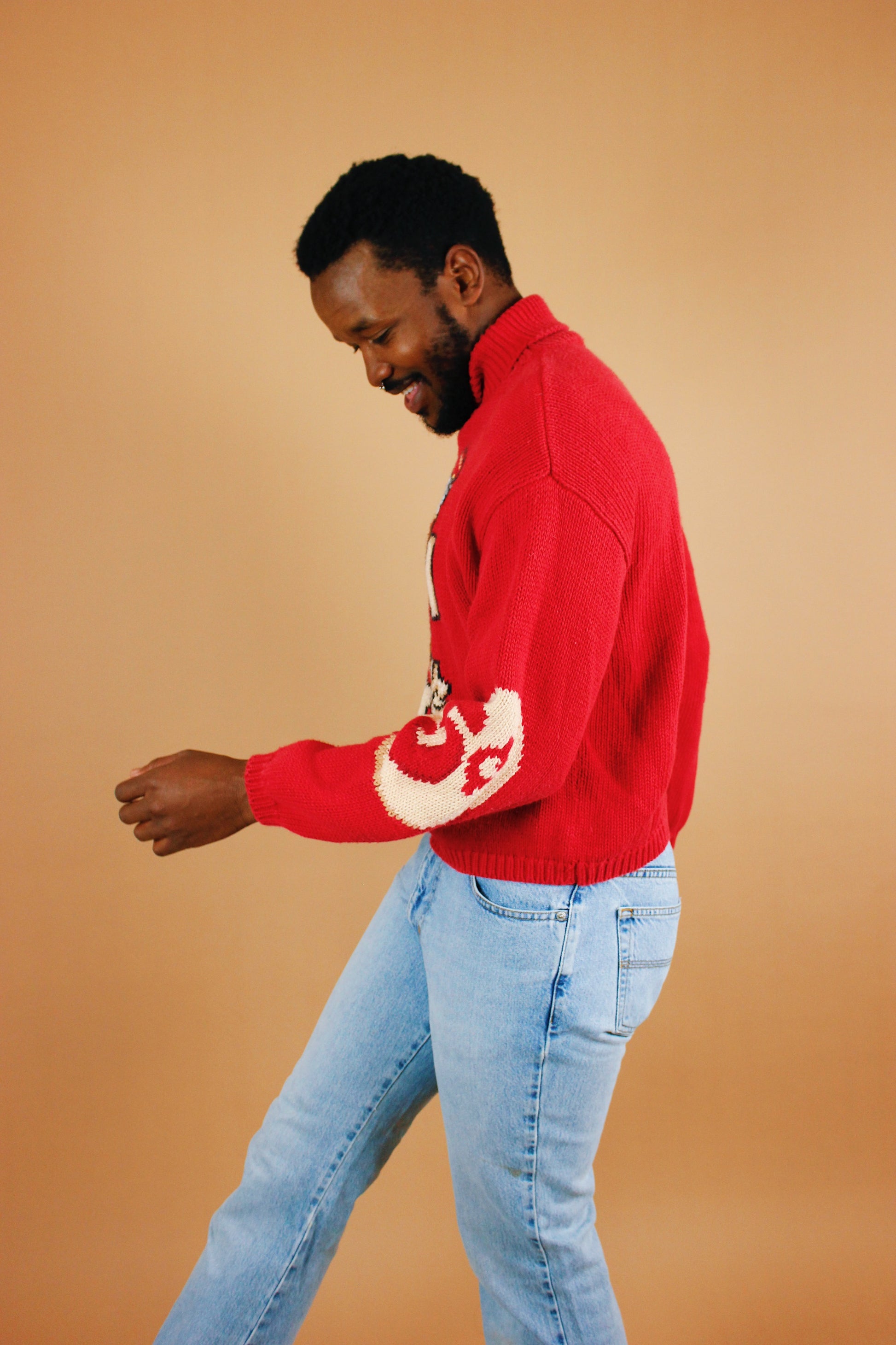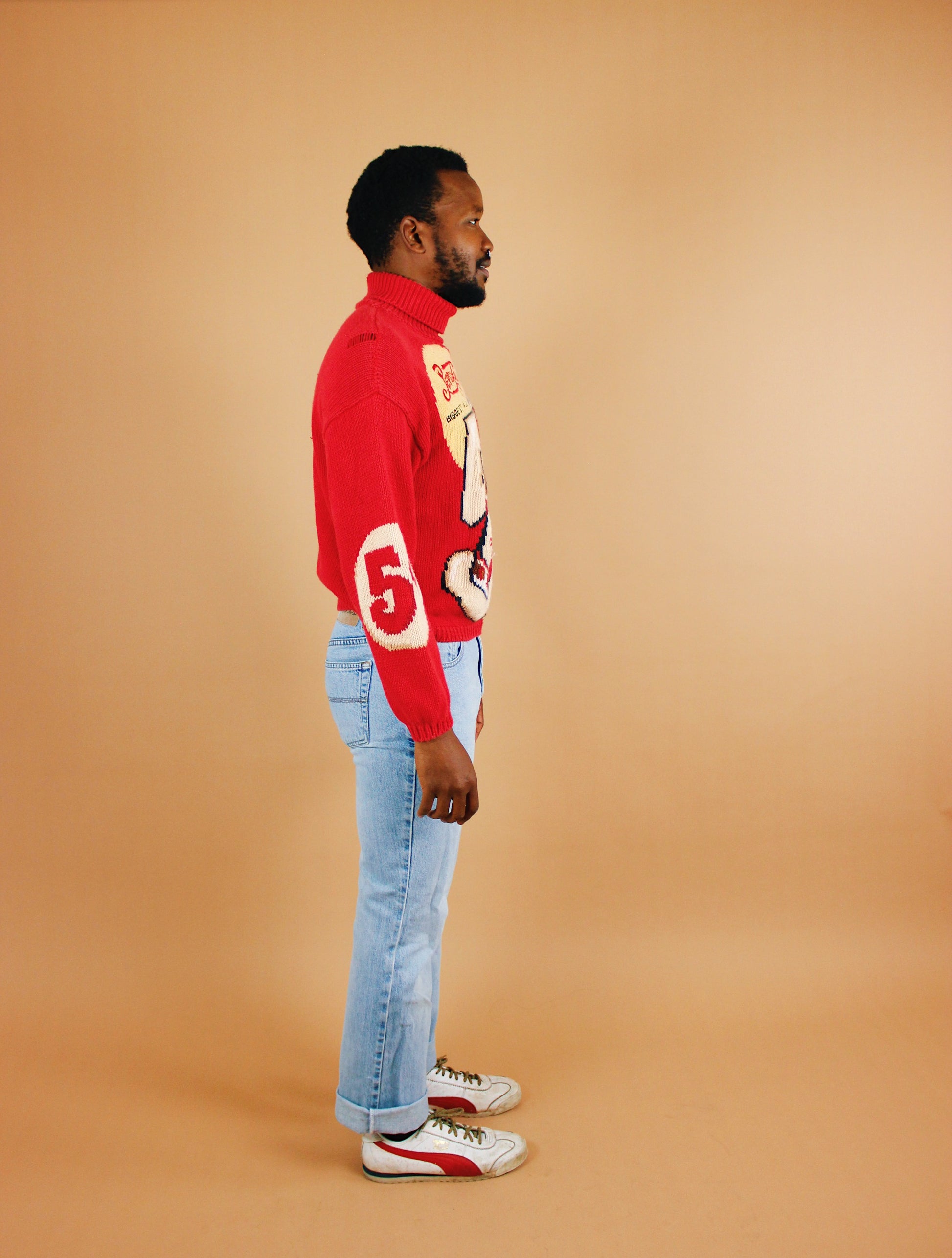 Vintage 80s chunky knit novelty Pepsi-Cola turtleneck sweater by Eagle Eye. These sweaters are beautifully detailed + highly collectible! We love a cozy kitsch moment. Tag size L. 55% Ramie 45% Cotton. Best fits a S-M. Seen on Drake.