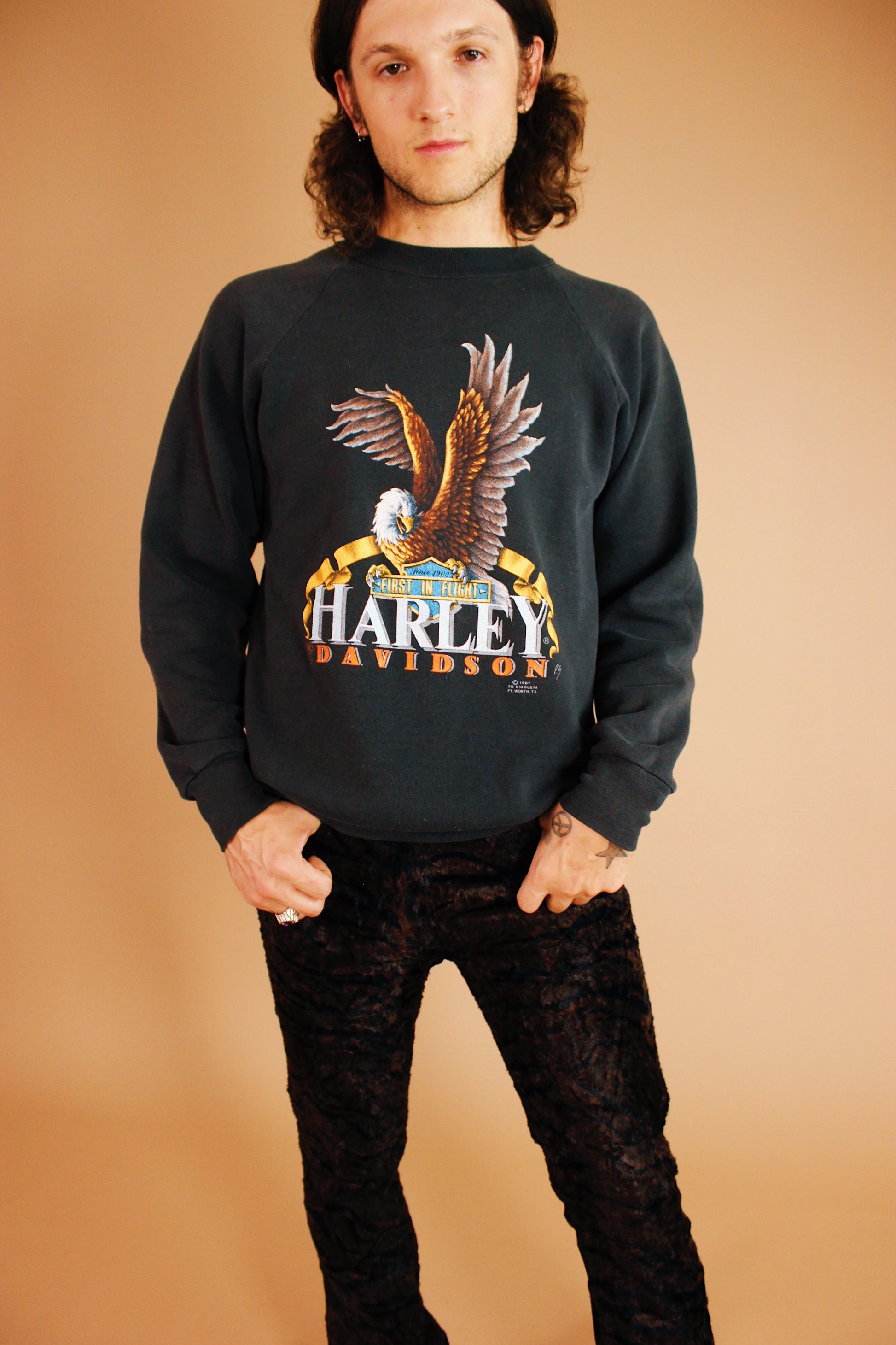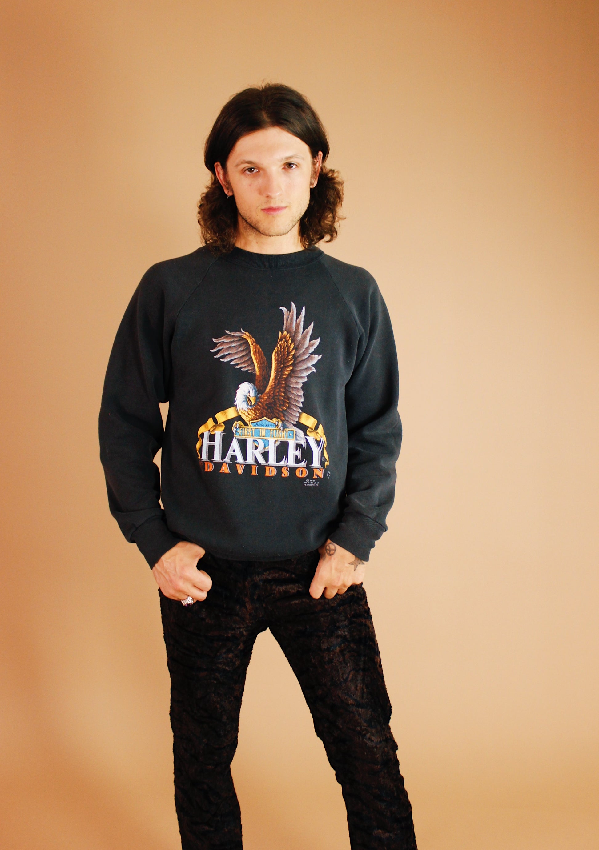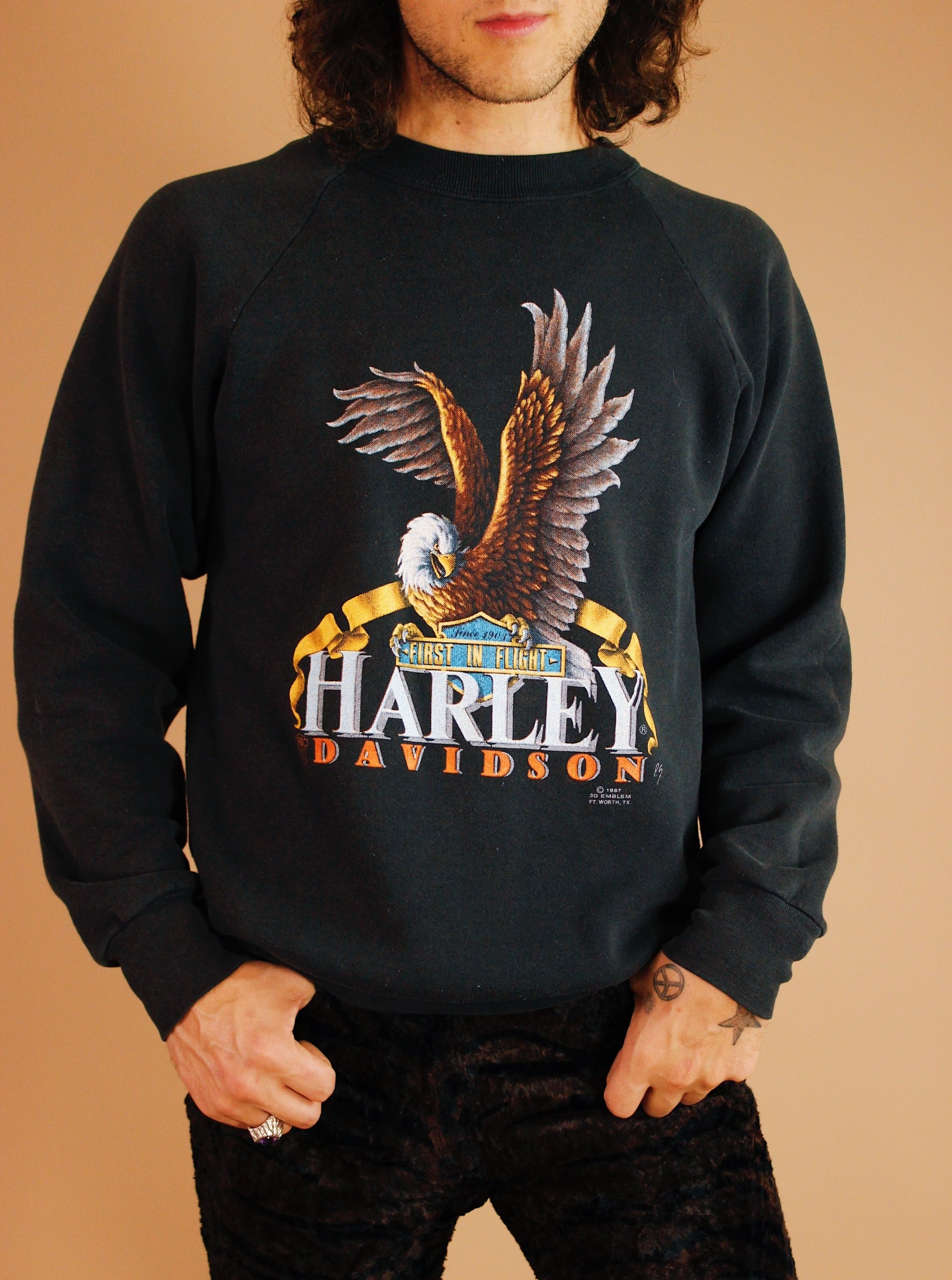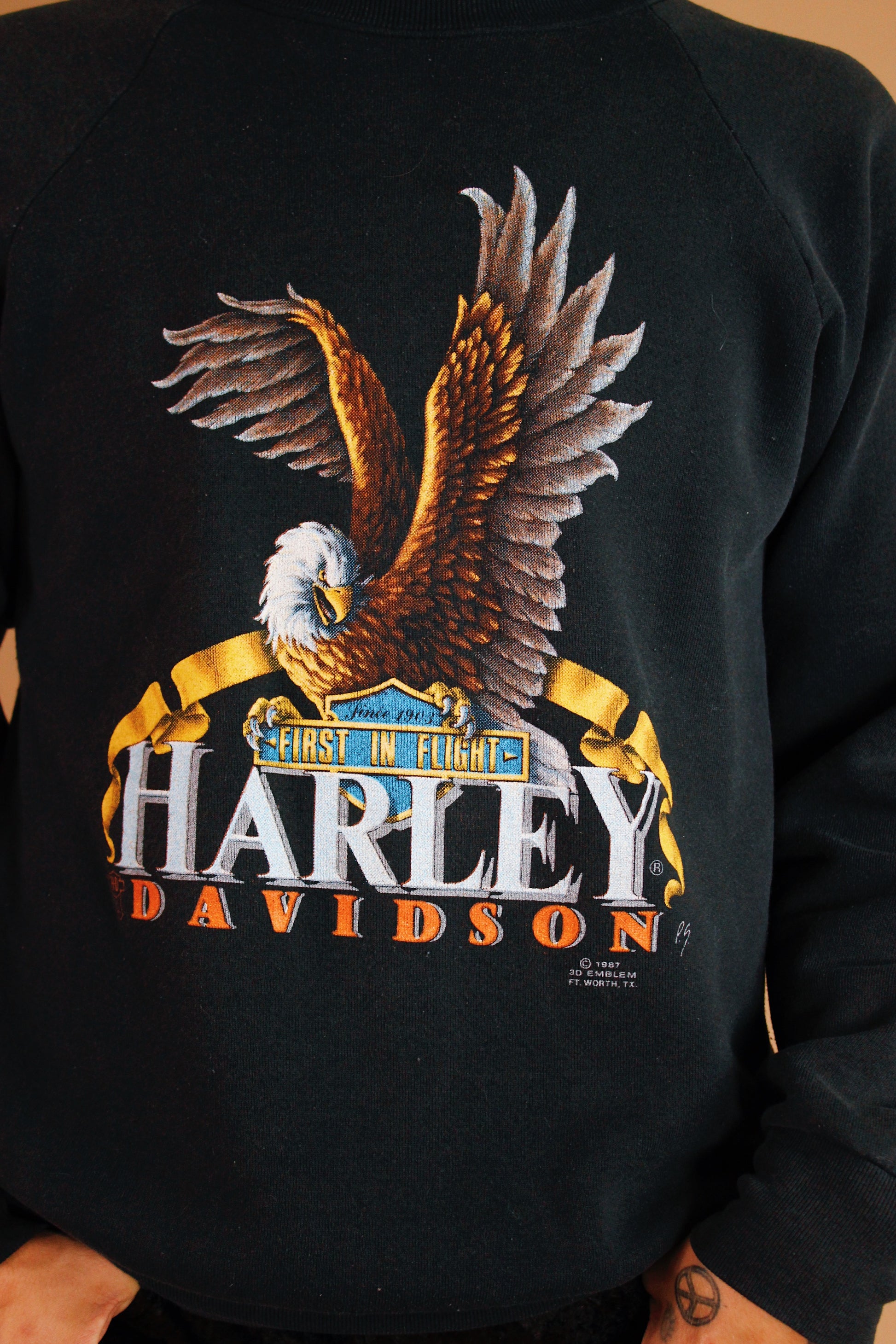 Vintage 80s coveted harley davidson 3D emblem sweatshirt. Double sided print featuring a bold eagle graphic on the front and a San Antonio harley graphic on the back. A comfy classic that you'll just keep reaching for! Dated 1987. Tag size L, fabric content is washed out. Made in USA. Best fits a M-L. Seen on Sky.