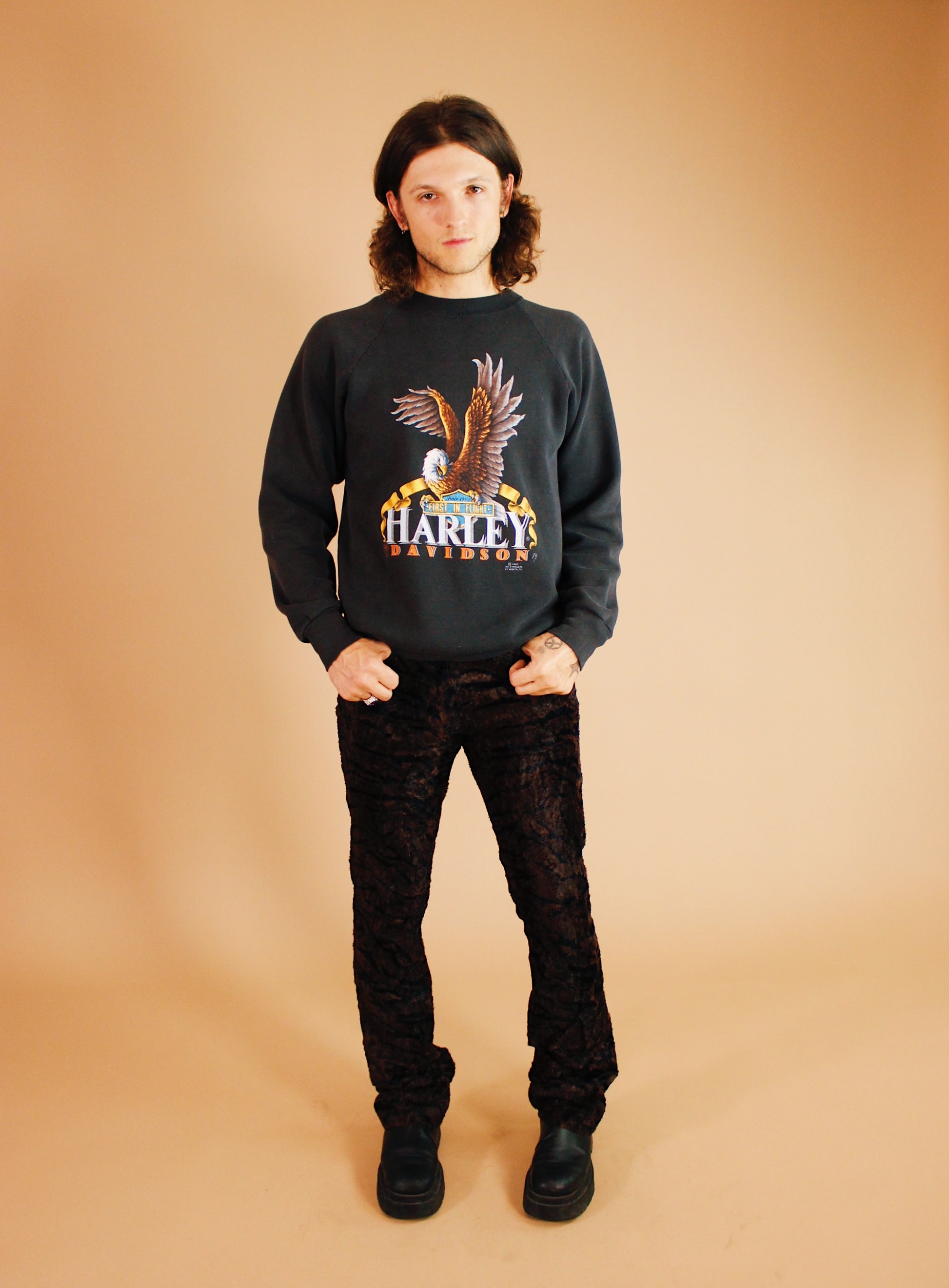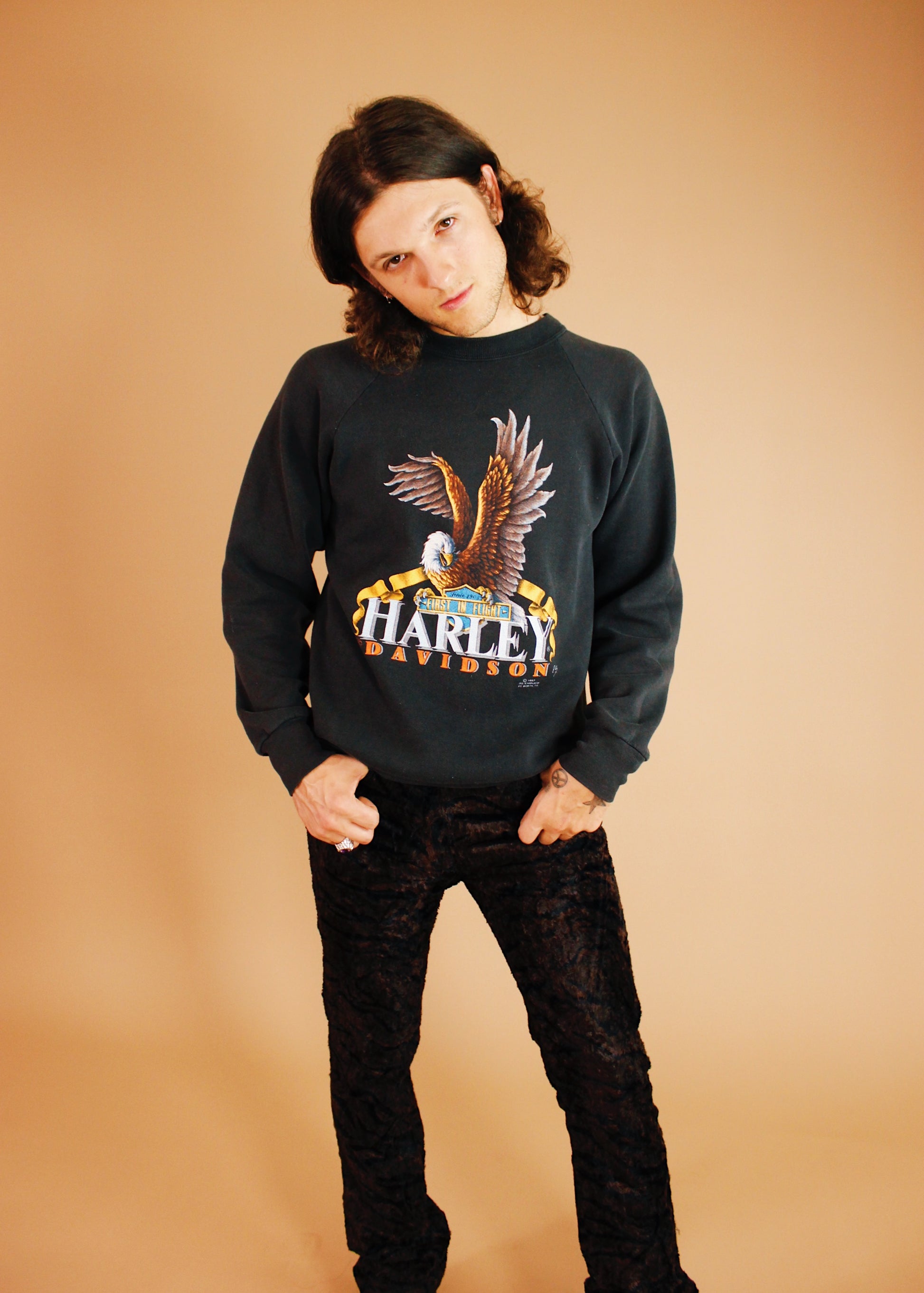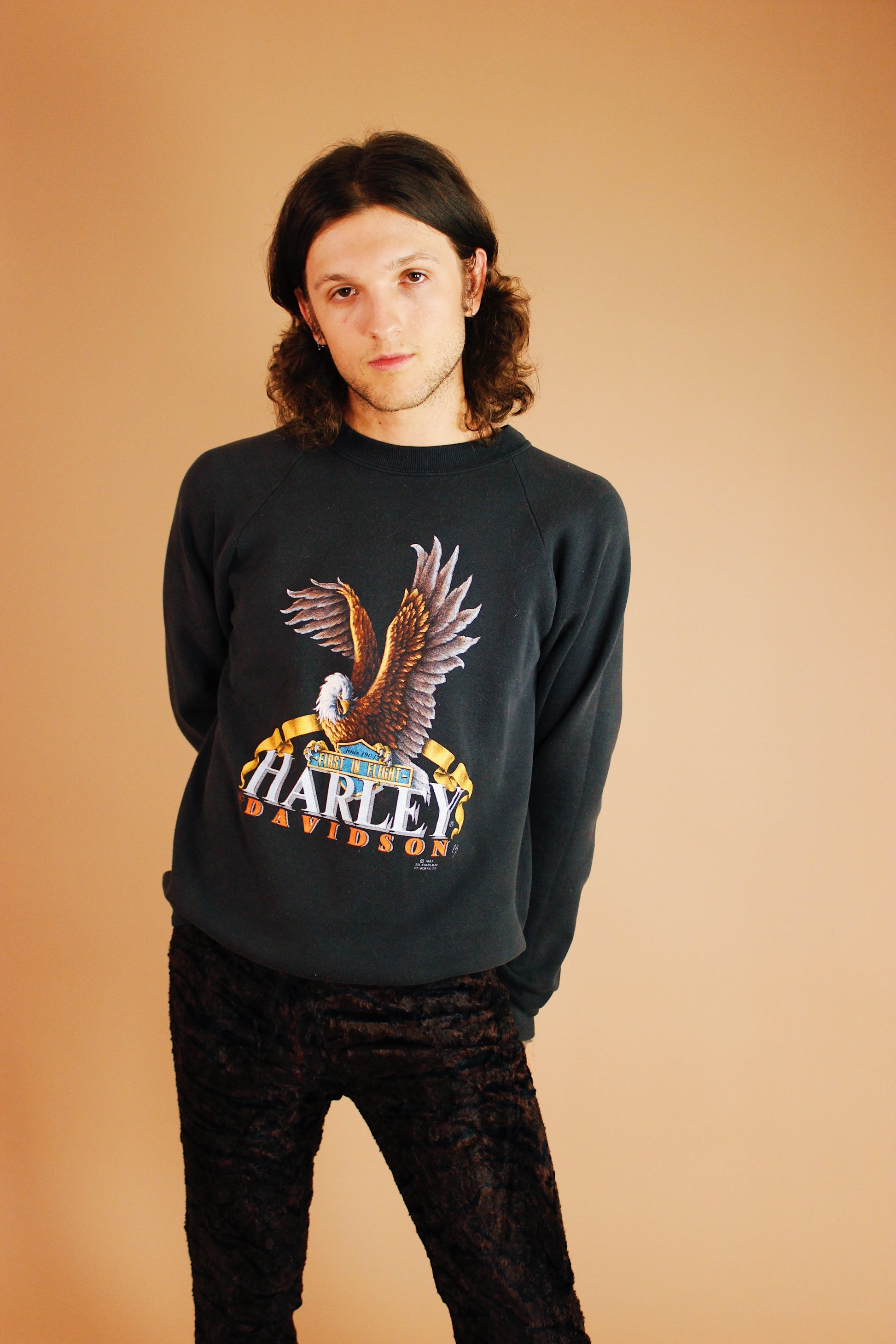 Vintage 80s coveted harley davidson 3D emblem sweatshirt. Double sided print featuring a bold eagle graphic on the front and a San Antonio harley graphic on the back. A comfy classic that you'll just keep reaching for! Dated 1987. Tag size L, fabric content is washed out. Made in USA. Best fits a M-L. Seen on Sky.