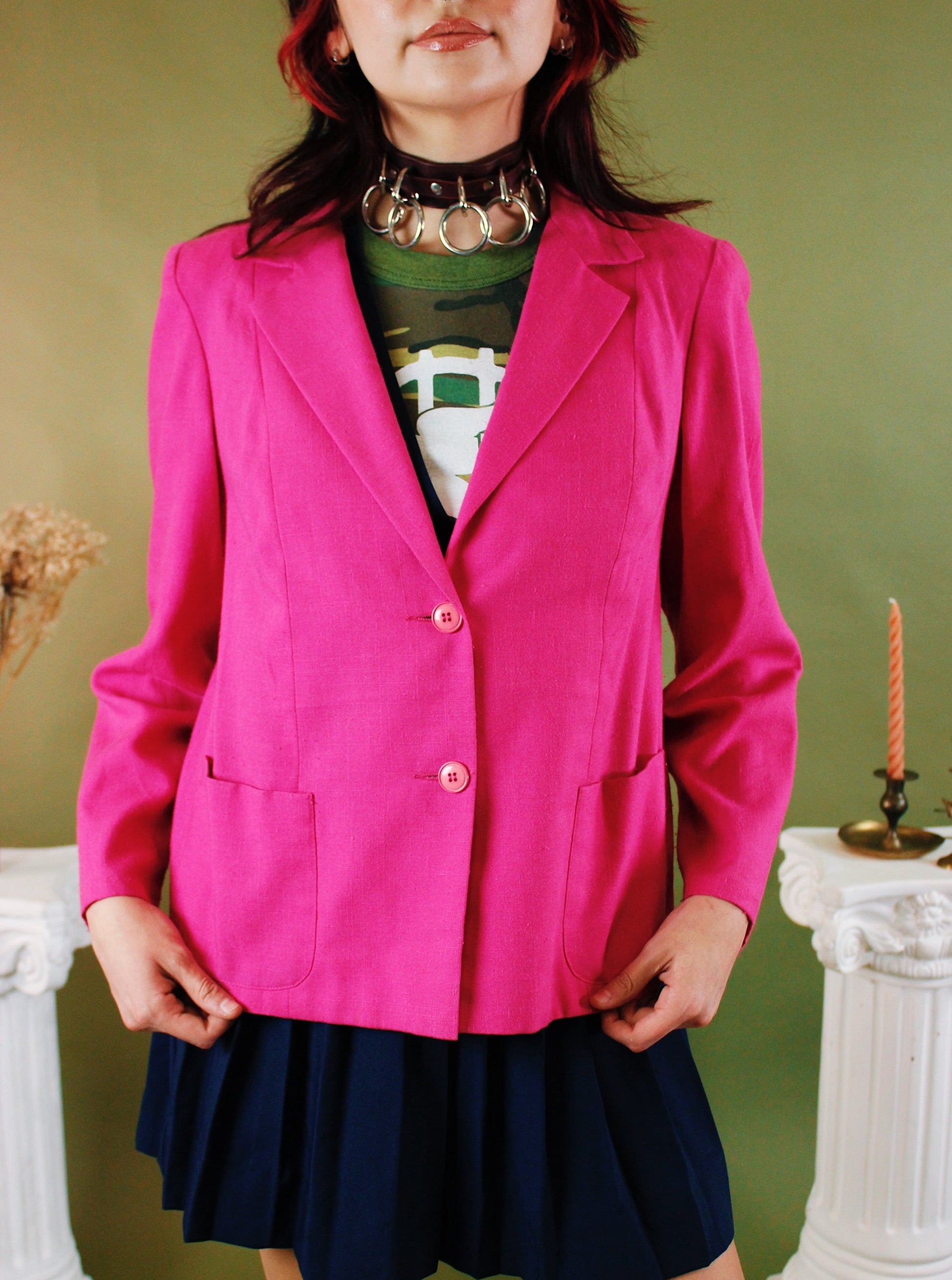 Vintage 80s hot pink cropped linen blazer. Super cute with two lil pockets and chunky pink buttons. By Amy Adams & union made. Size tag is cut. Best fits a S-M. Seen on Carmen & Sydni.