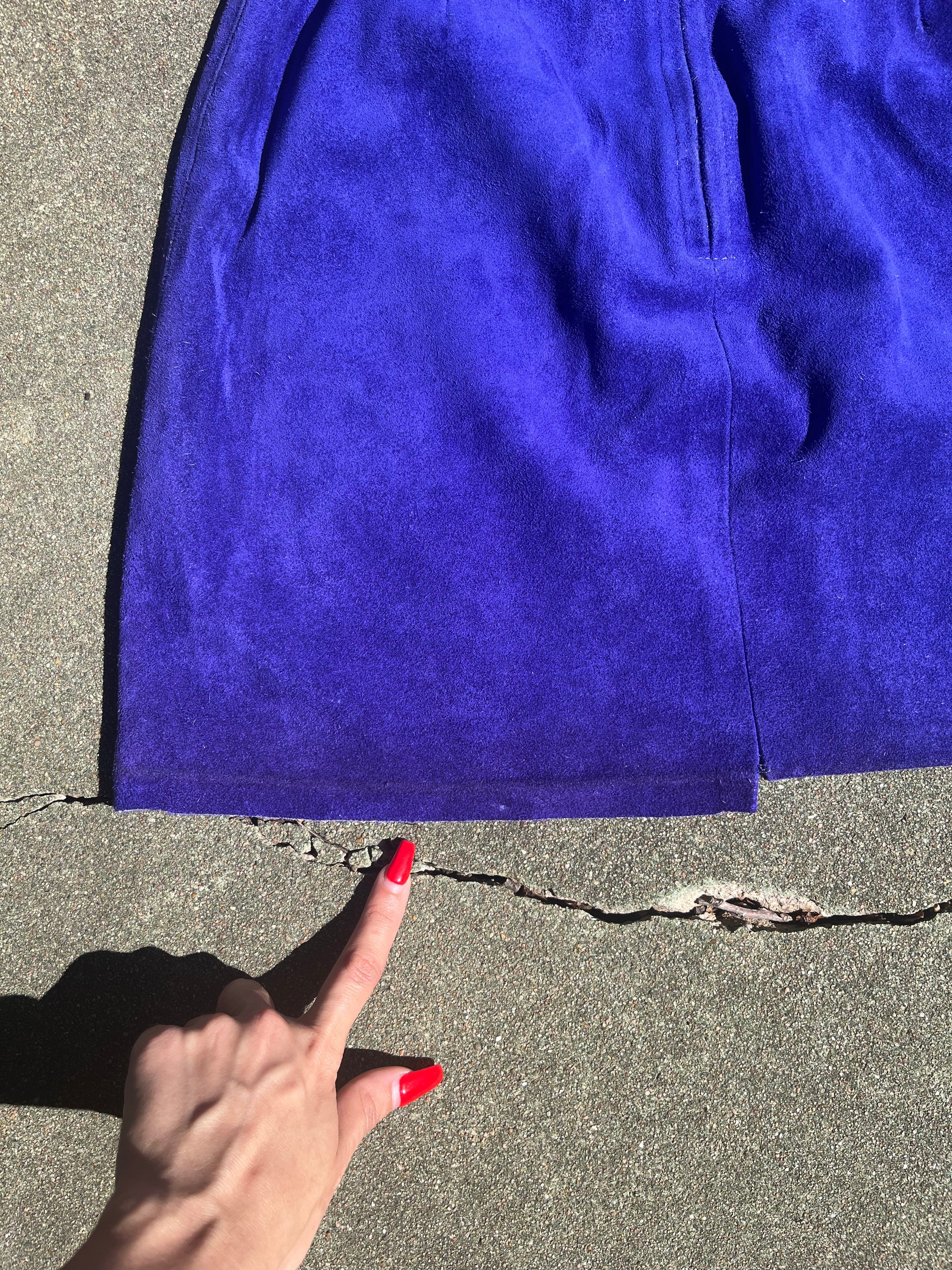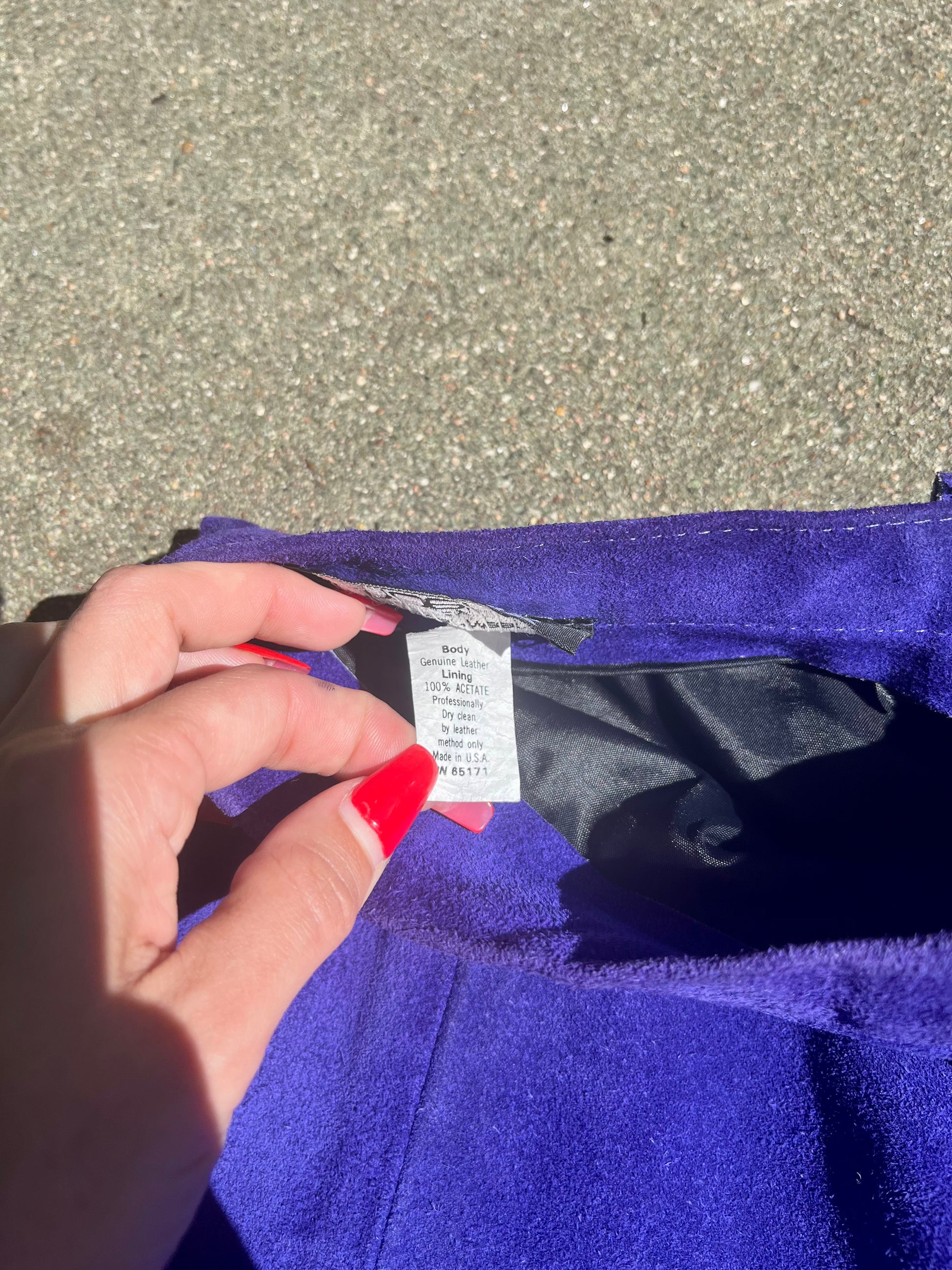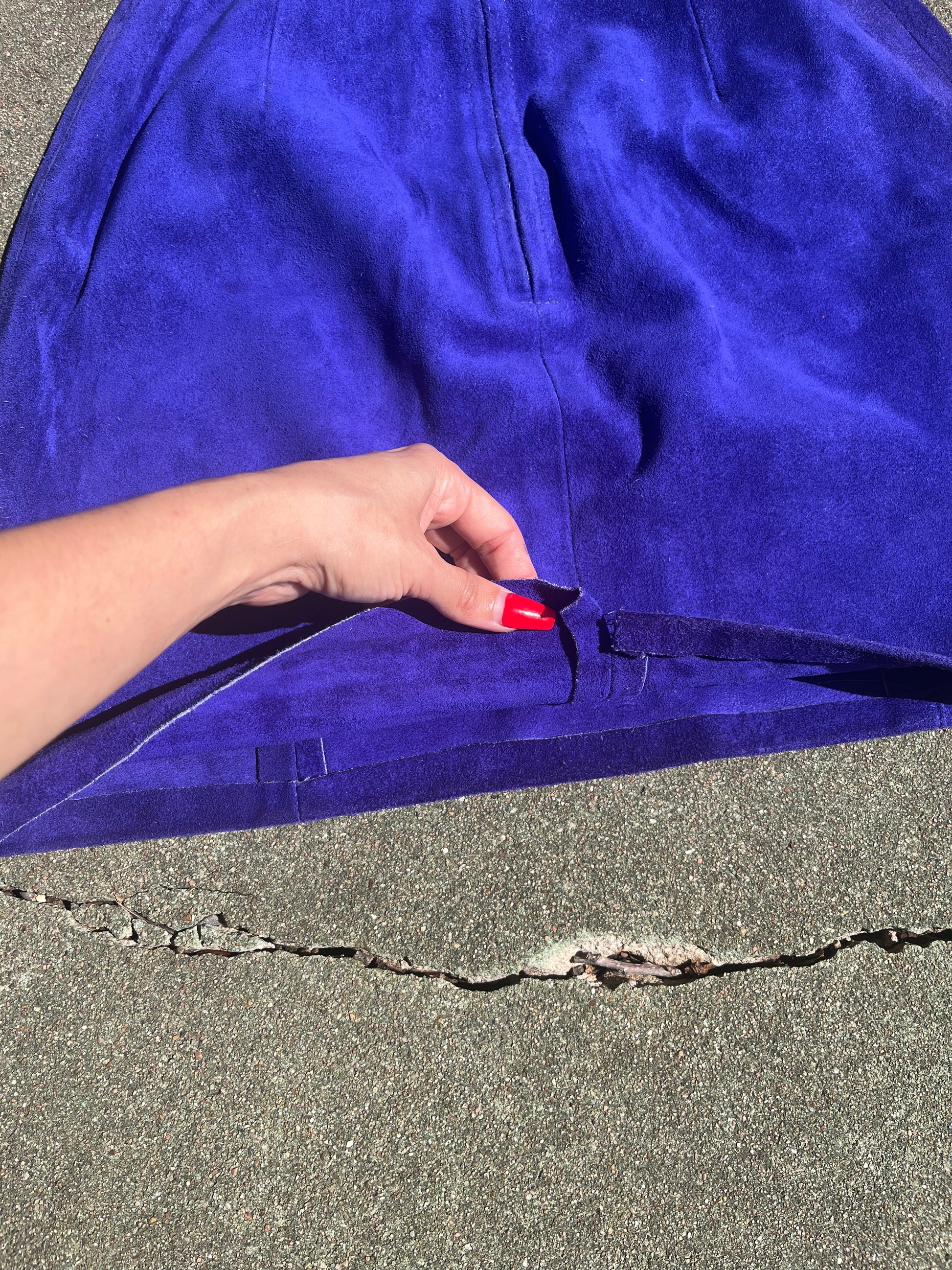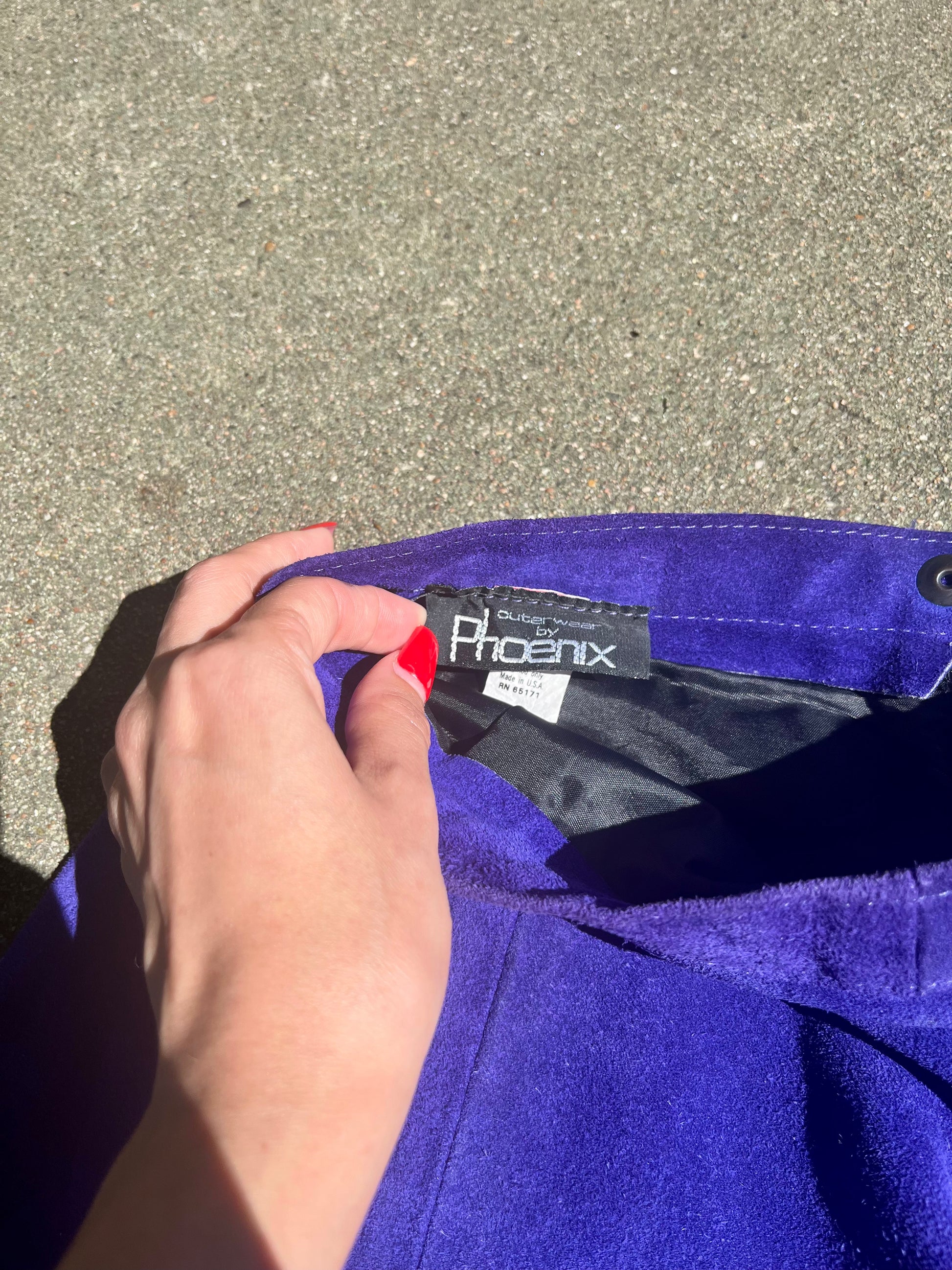 Vintage 80s ultraviolet indigo/ purple suede skirt. This color is absolute magic! Heavy, quality feel with a zipper and snap closure in the back. Fully lined. By Outerwear by Phoenix. No tag size, 100% genuine leather with polyester lining. Best fits an XS/S. Seen on Justina.