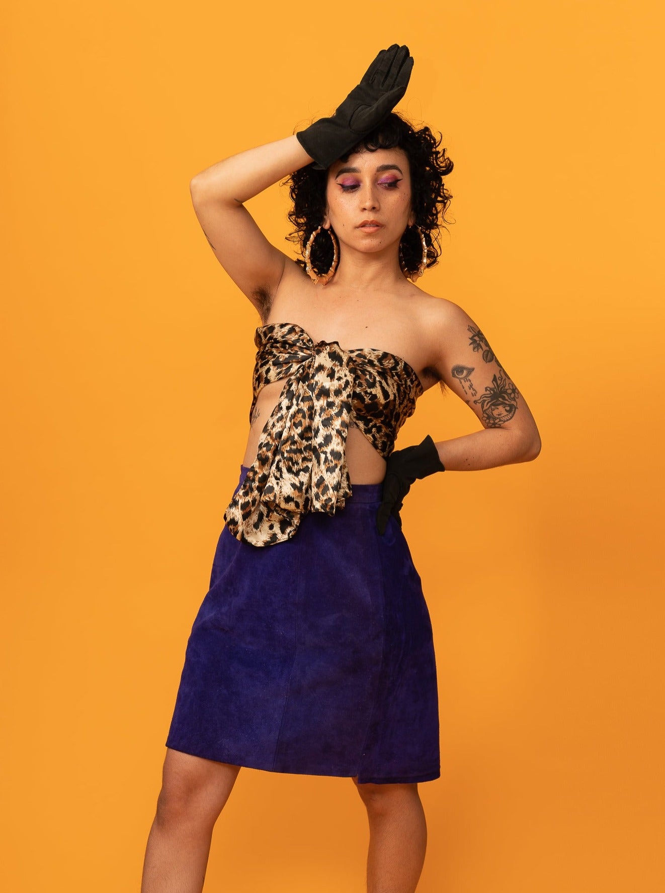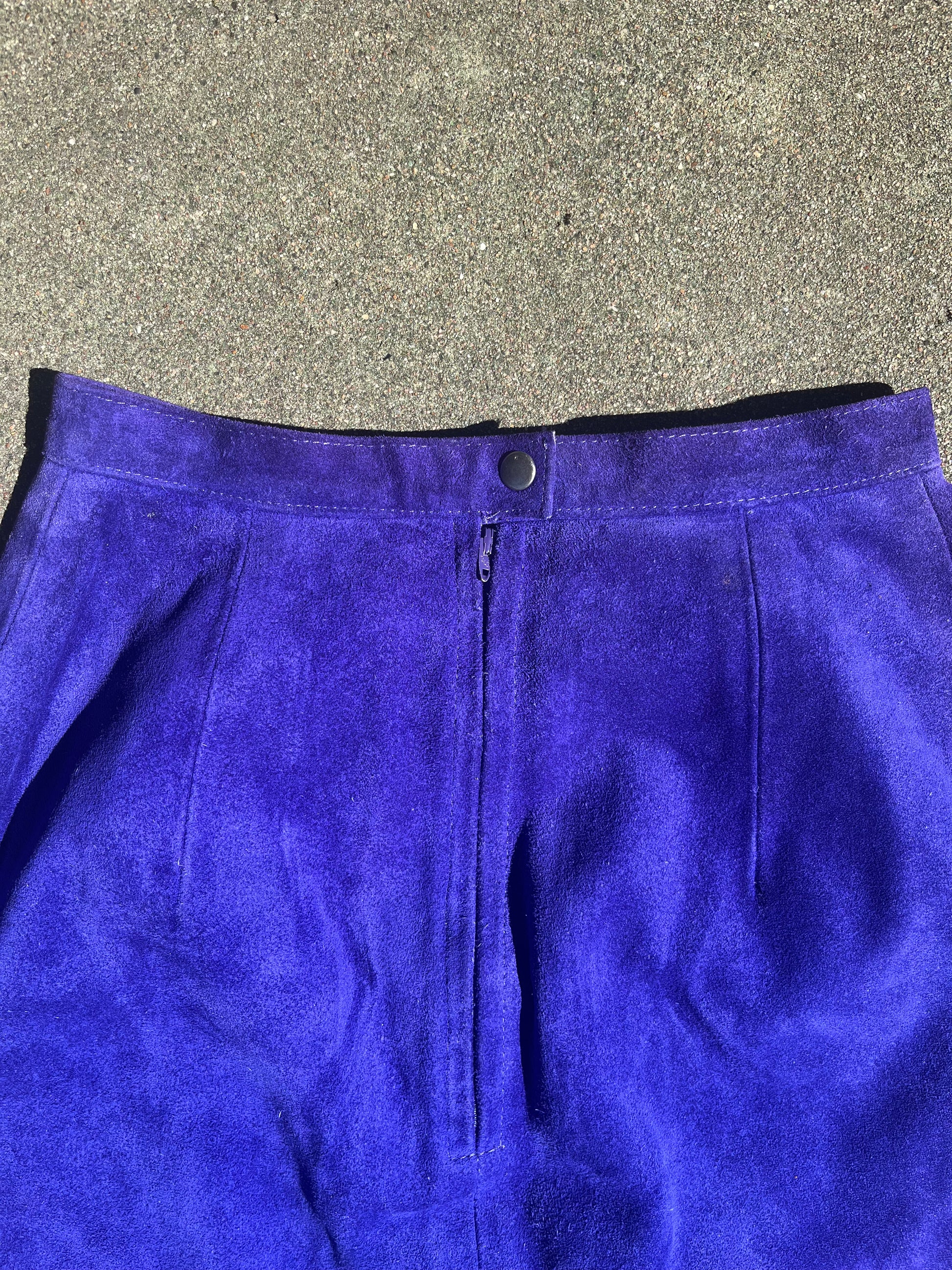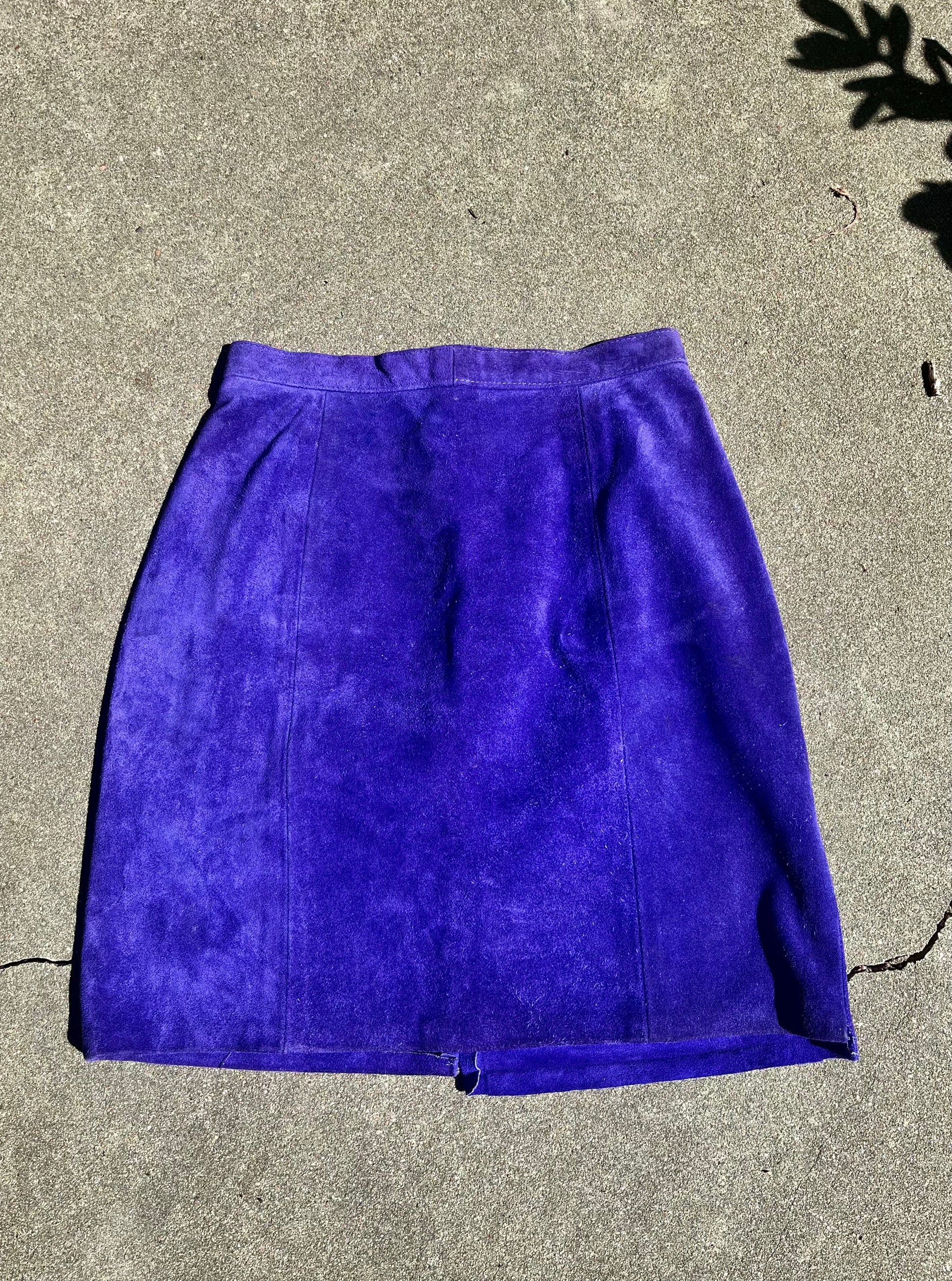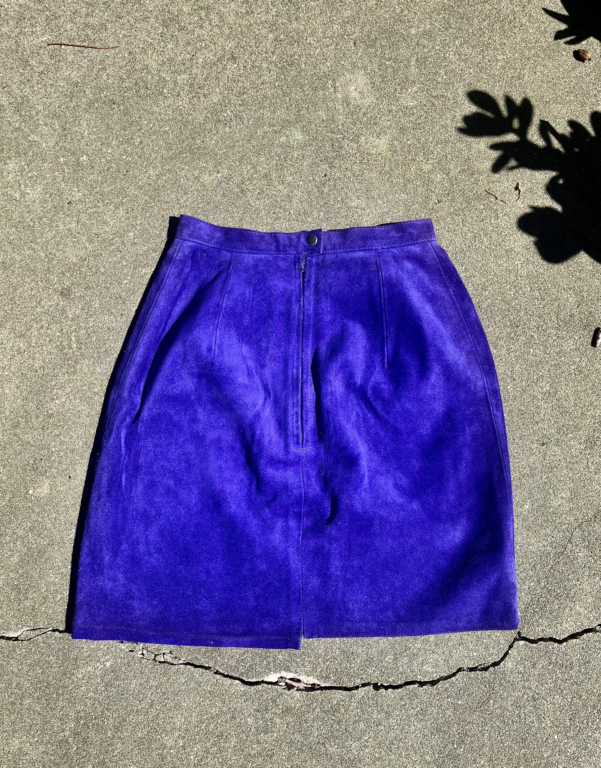 Vintage 80s ultraviolet indigo/ purple suede skirt. This color is absolute magic! Heavy, quality feel with a zipper and snap closure in the back. Fully lined. By Outerwear by Phoenix. No tag size, 100% genuine leather with polyester lining. Best fits an XS/S. Seen on Justina.