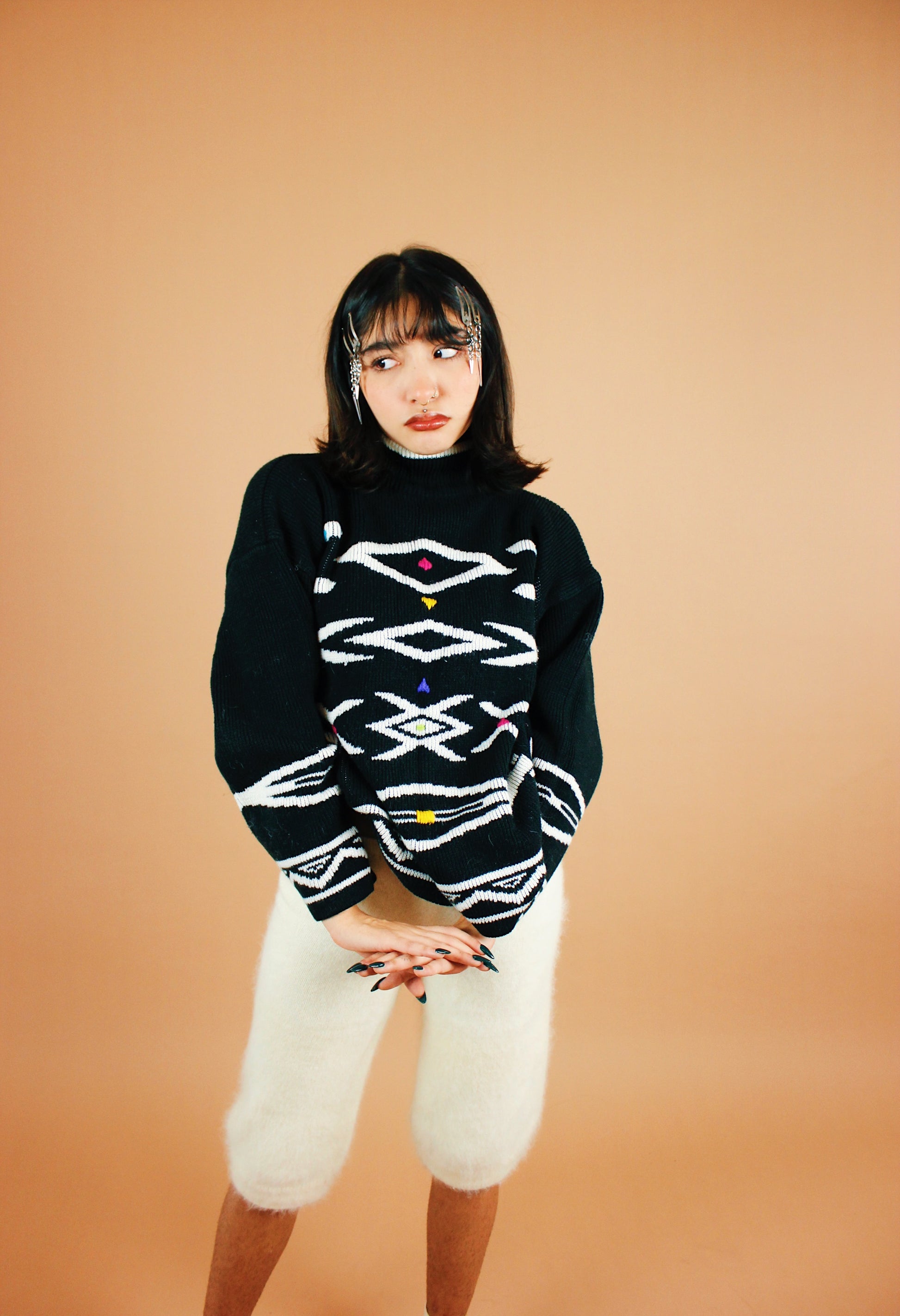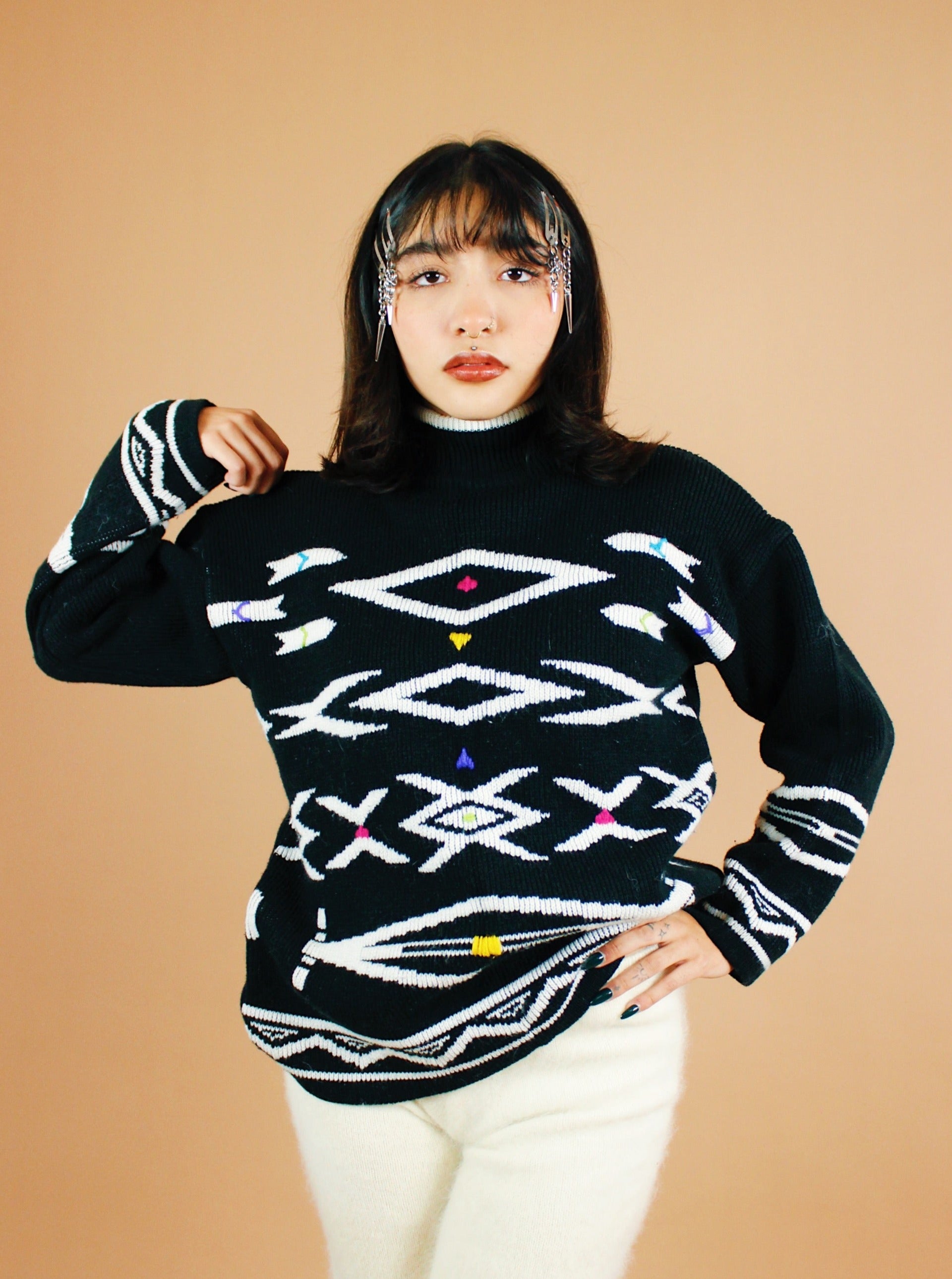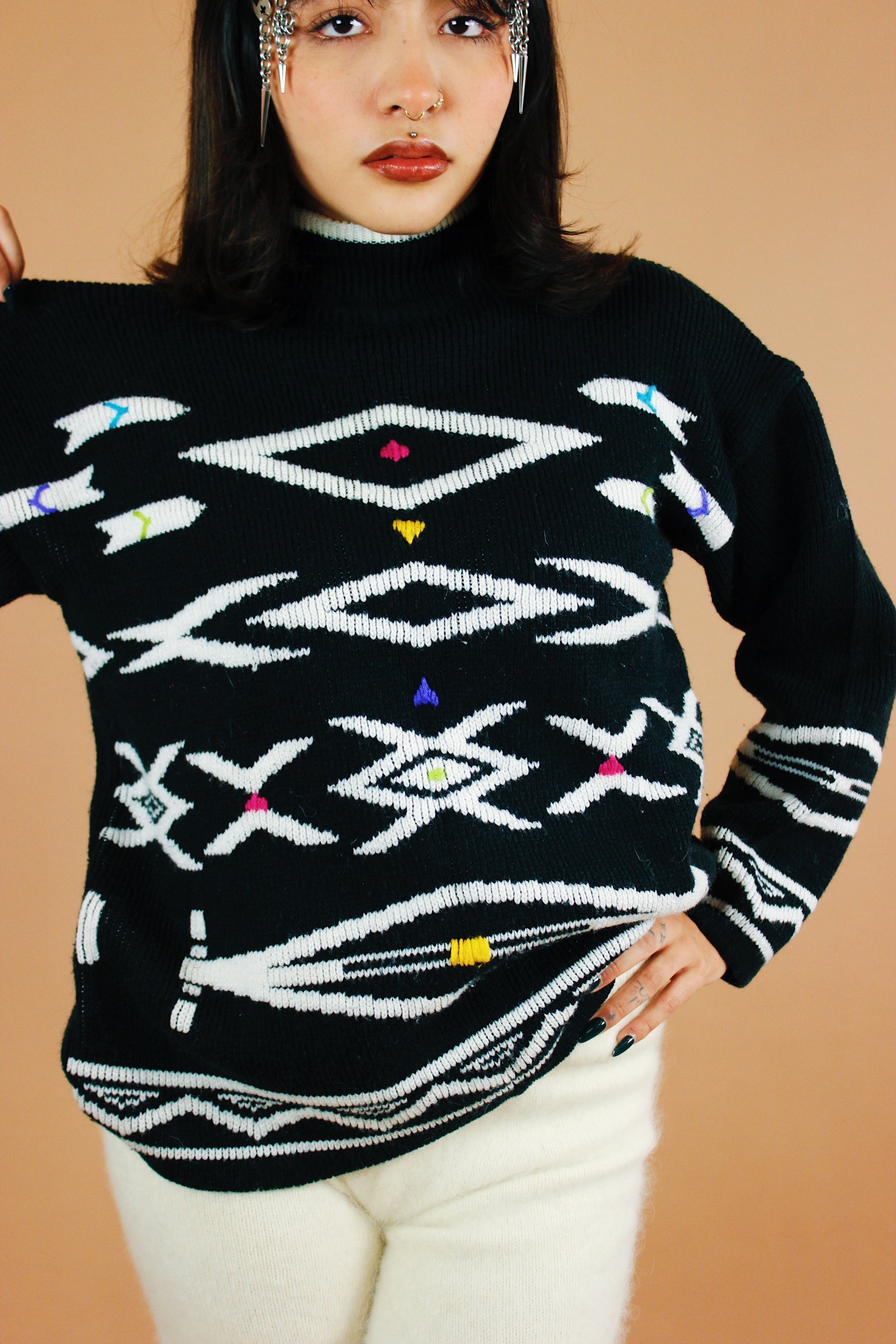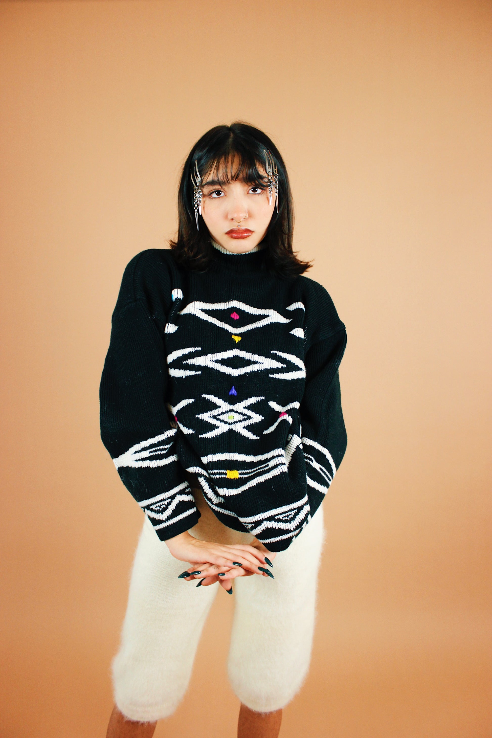 Vintage 80s knit sweater with geometric patterns and bright pops of color. Love this aesthetic and contrast trim turtleneck designs. By Emporio Gitano. Tag size S, 100% Acrylic. Made in Taiwan R.O.C. Best fits a S-M. Seen on Addy.