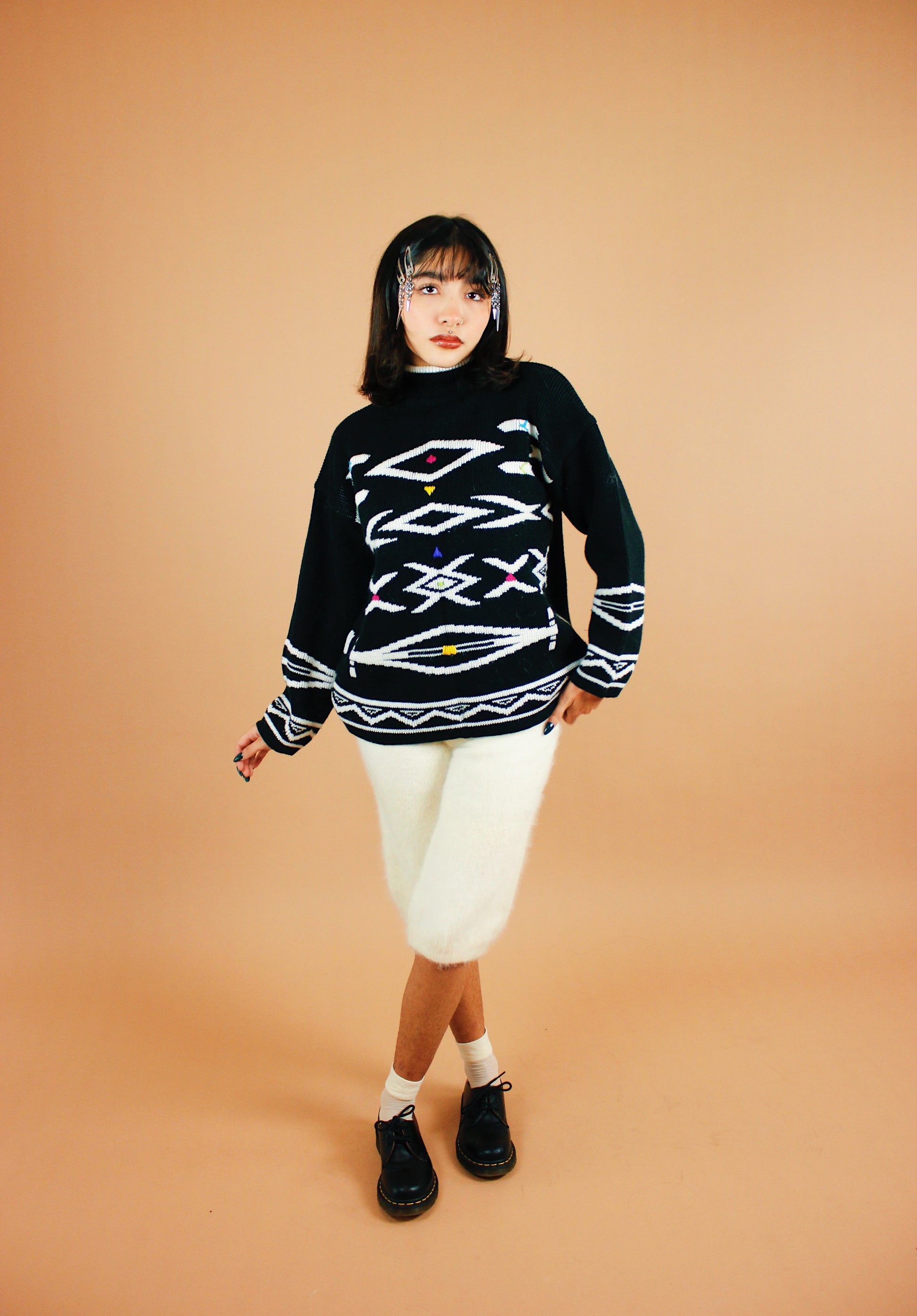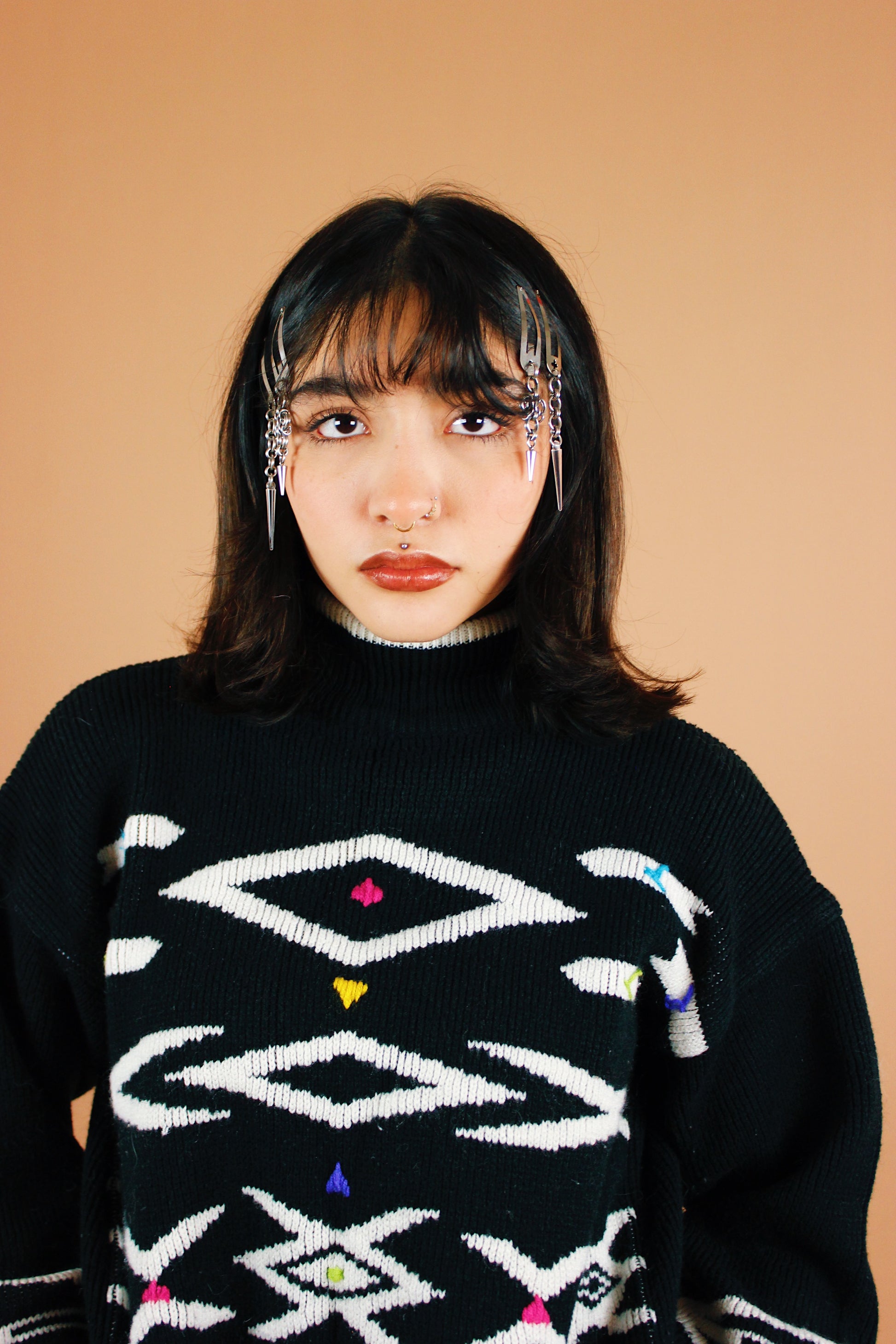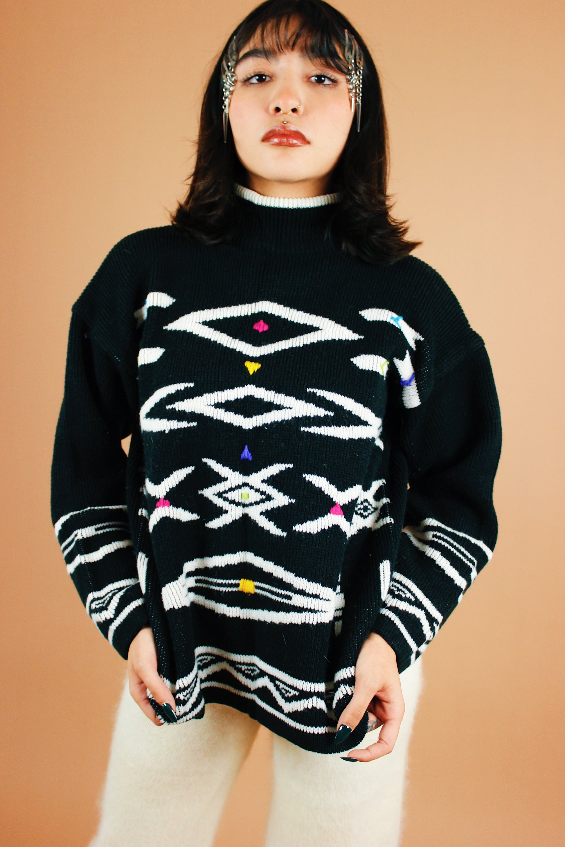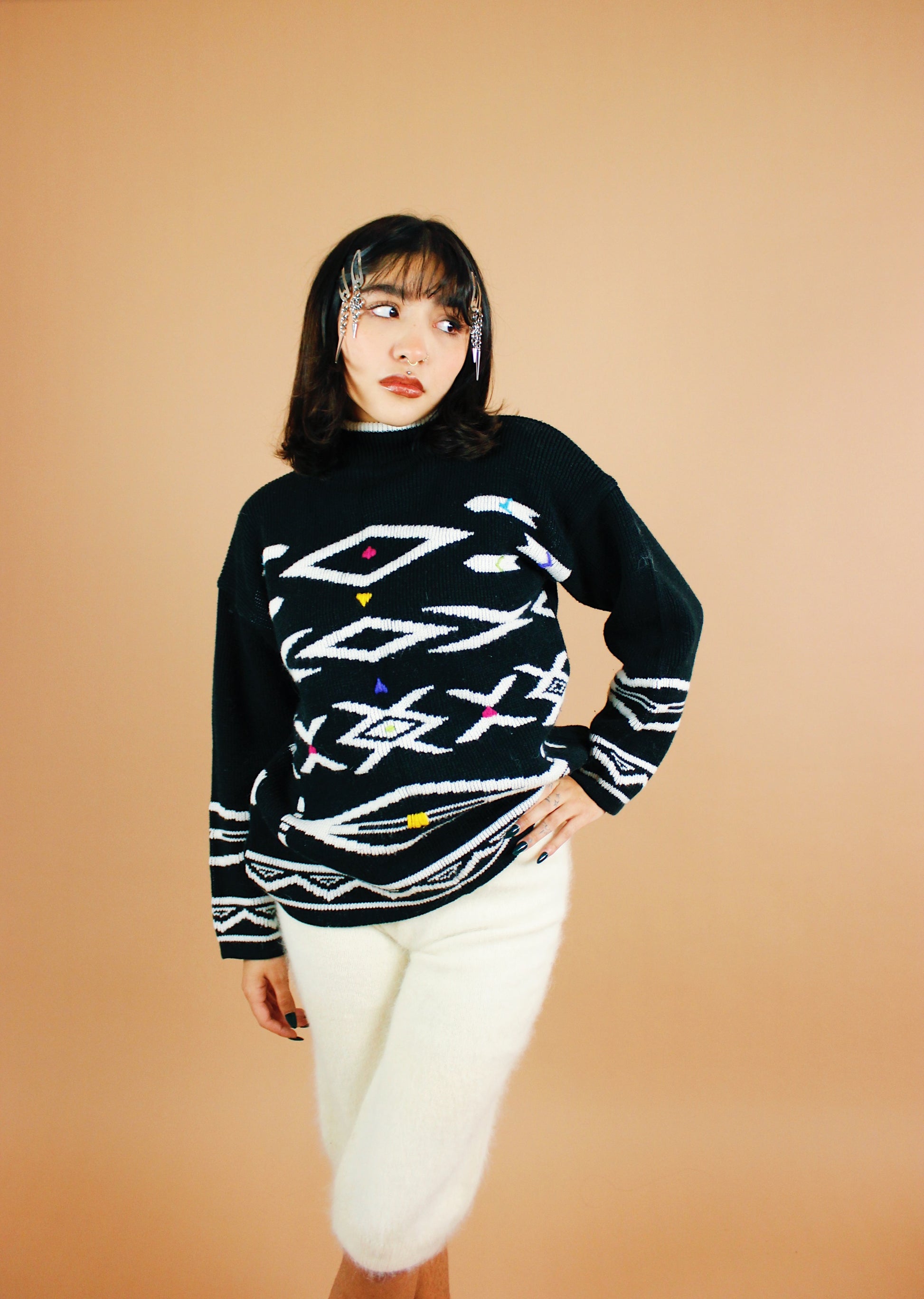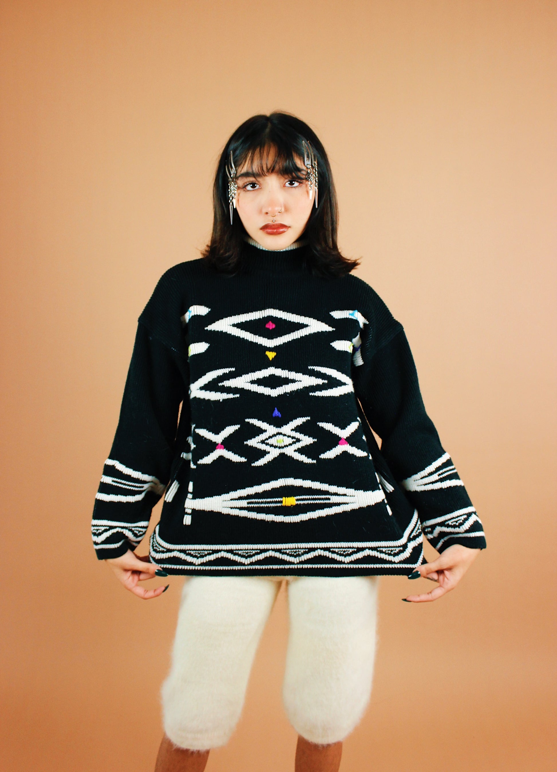 Vintage 80s knit sweater with geometric patterns and bright pops of color. Love this aesthetic and contrast trim turtleneck designs. By Emporio Gitano. Tag size S, 100% Acrylic. Made in Taiwan R.O.C. Best fits a S-M. Seen on Addy.