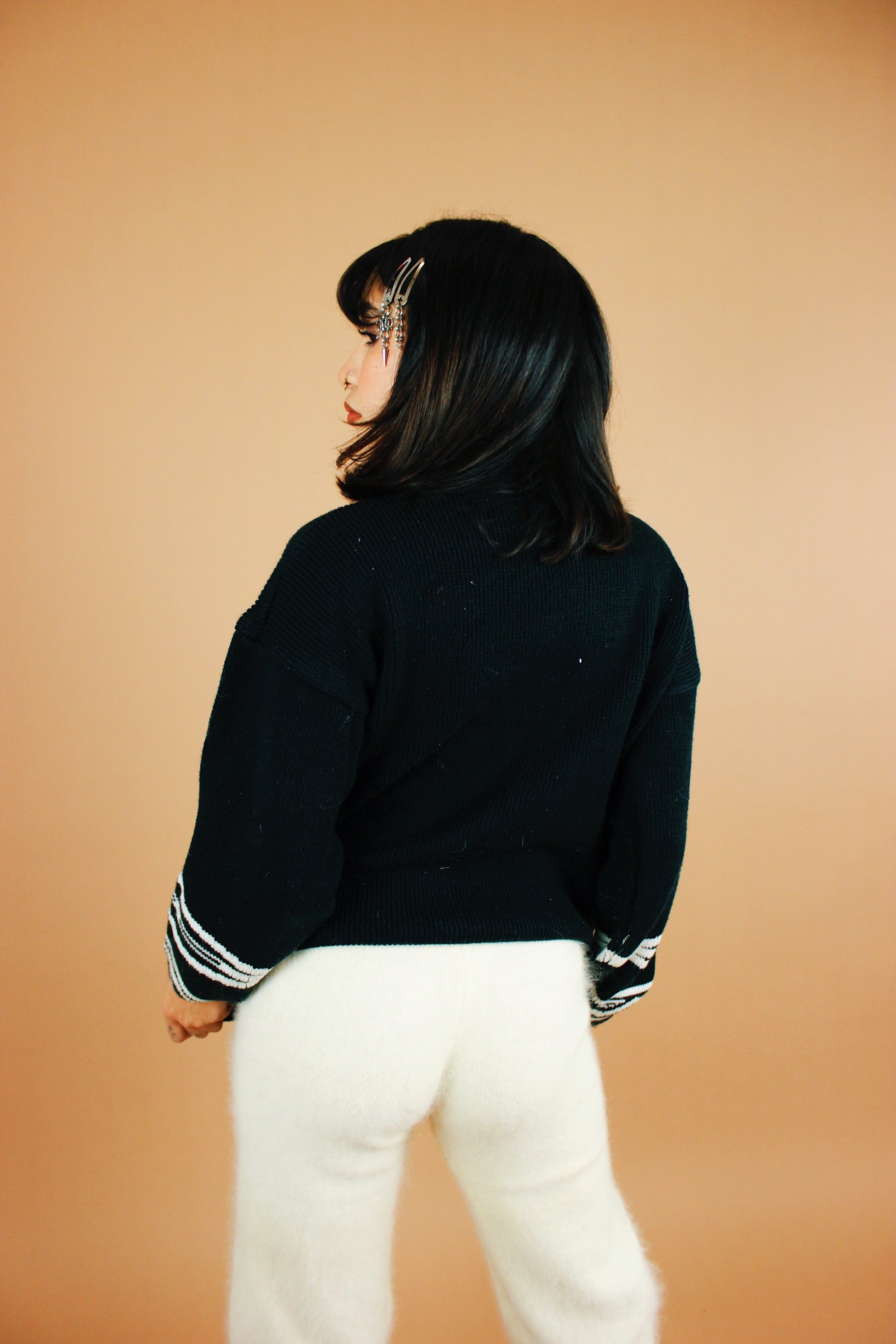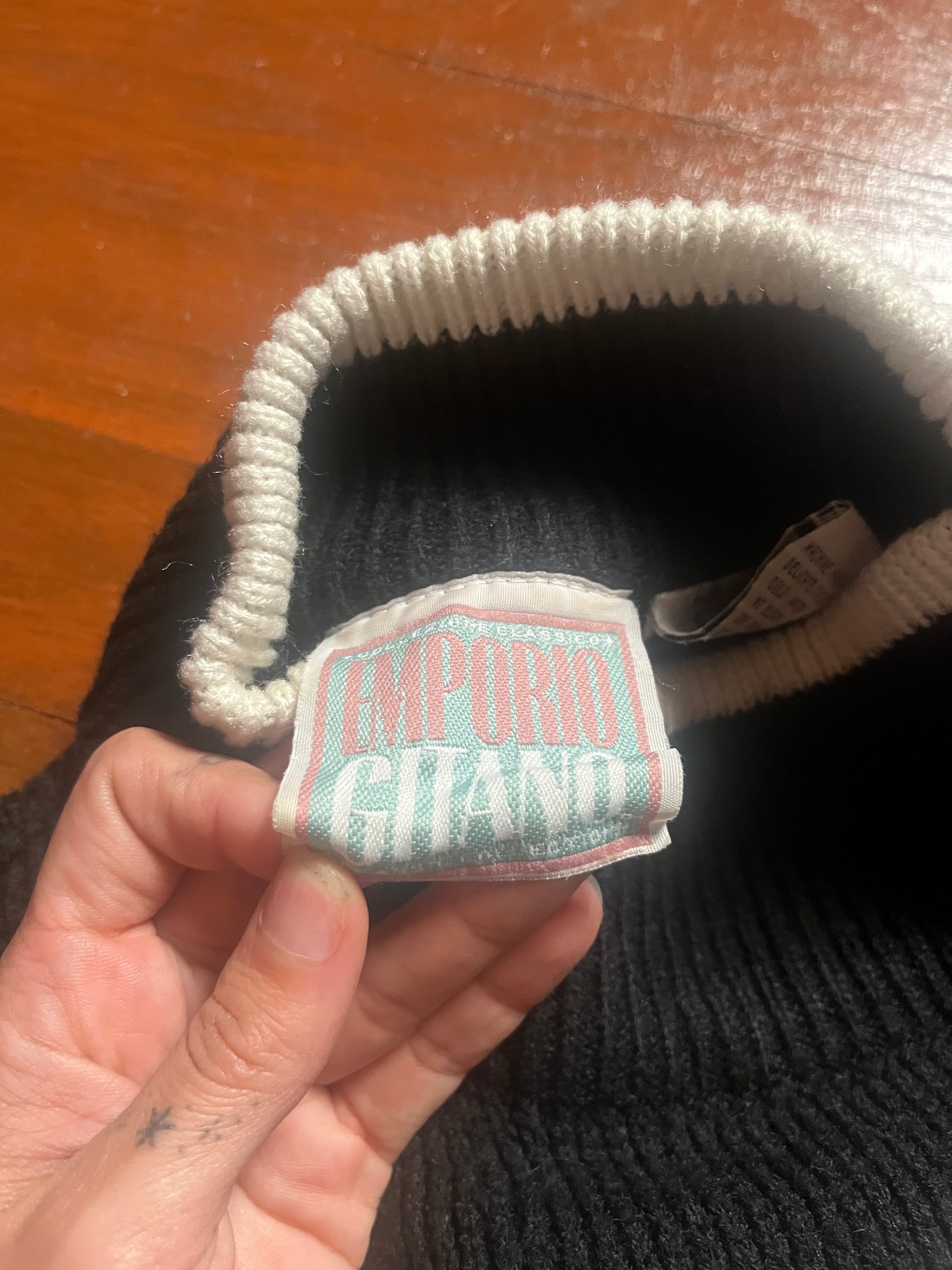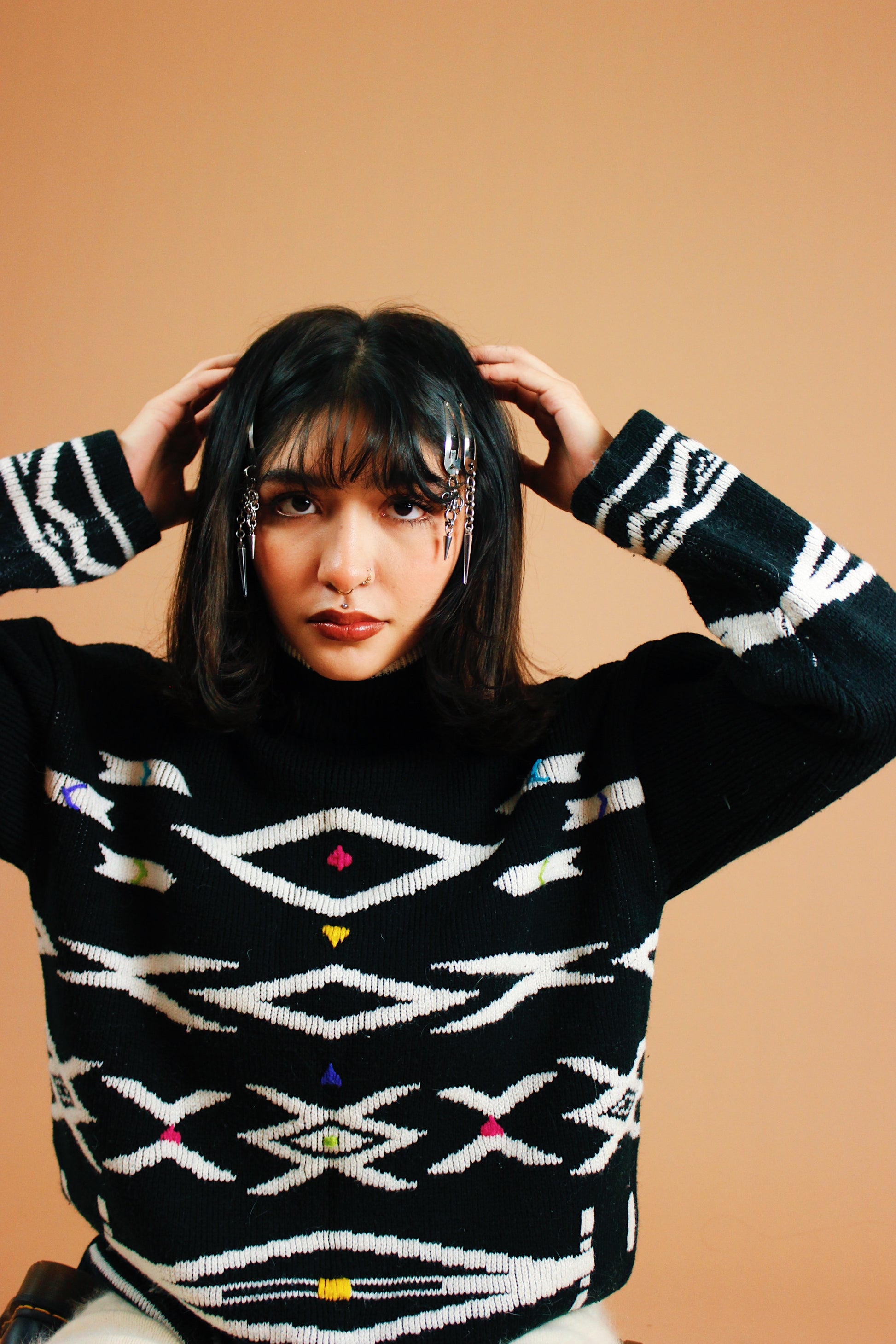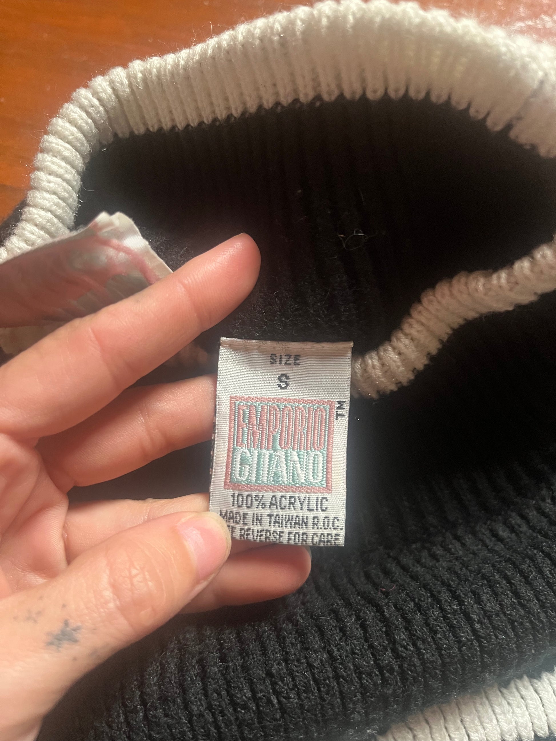 Vintage 80s knit sweater with geometric patterns and bright pops of color. Love this aesthetic and contrast trim turtleneck designs. By Emporio Gitano. Tag size S, 100% Acrylic. Made in Taiwan R.O.C. Best fits a S-M. Seen on Addy.