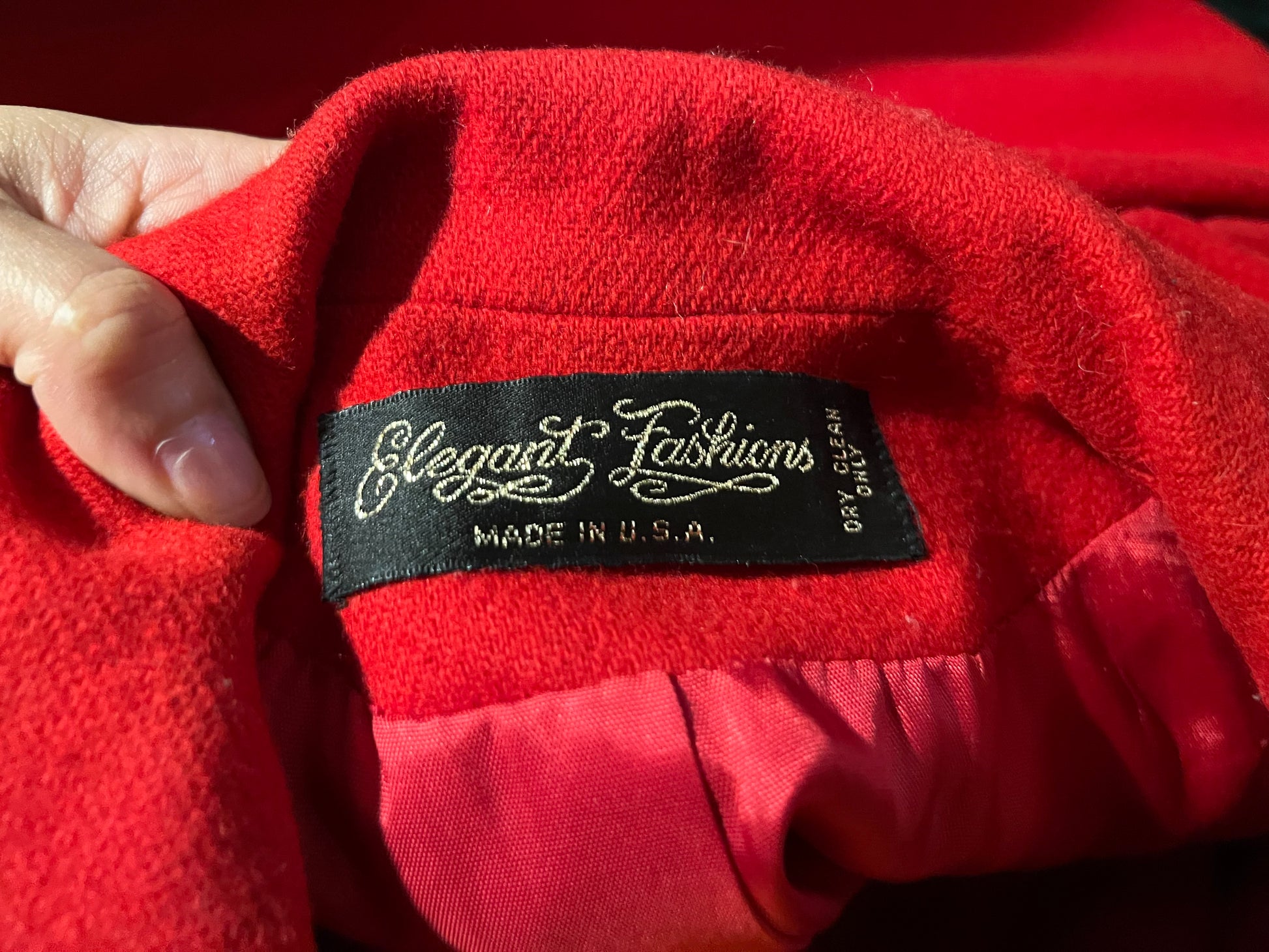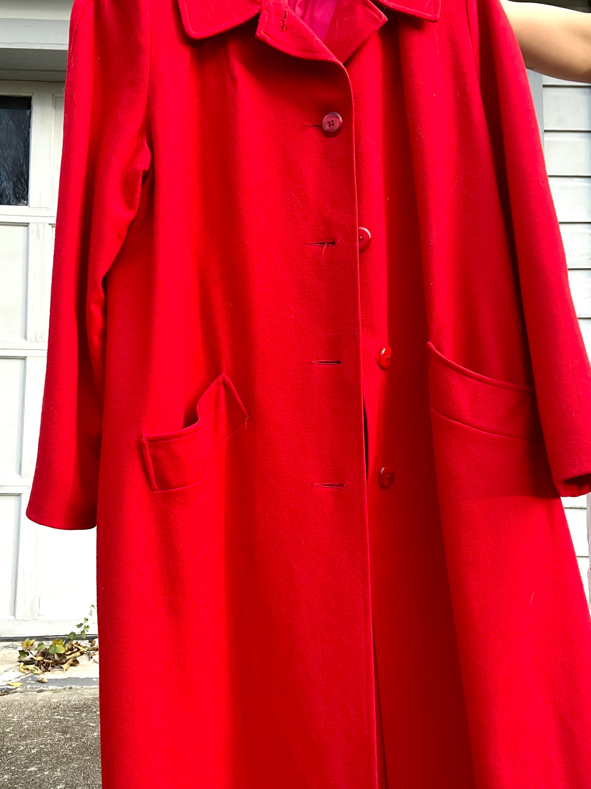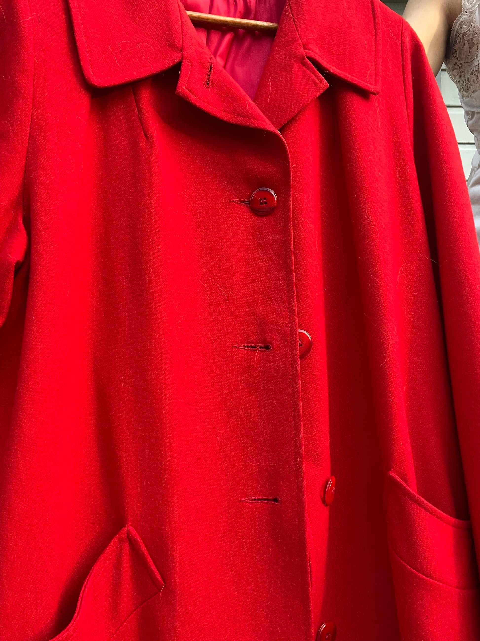 Vintage 80s cherry red wool trenchcoat. Has roomy outer pockets and red/ black chunky marbled buttons. Fully lined. Union made by Elegant Fashions. Best fits an XL.