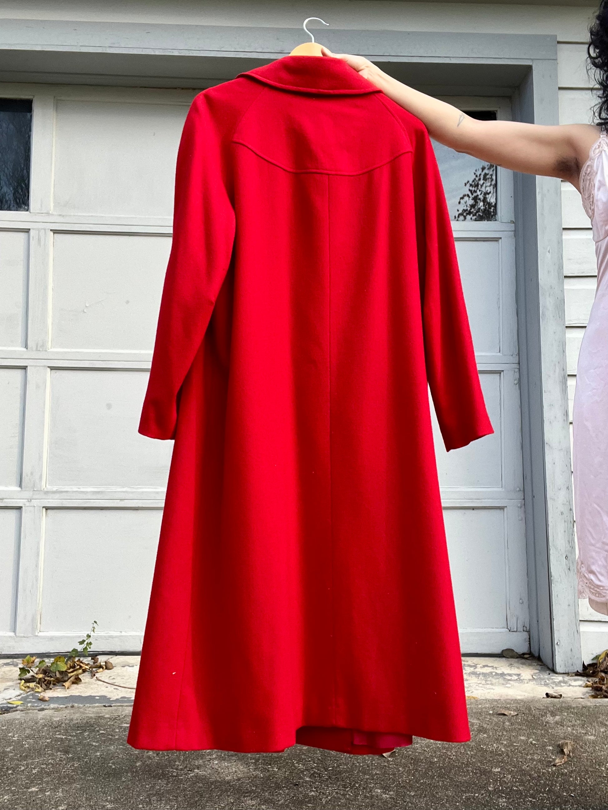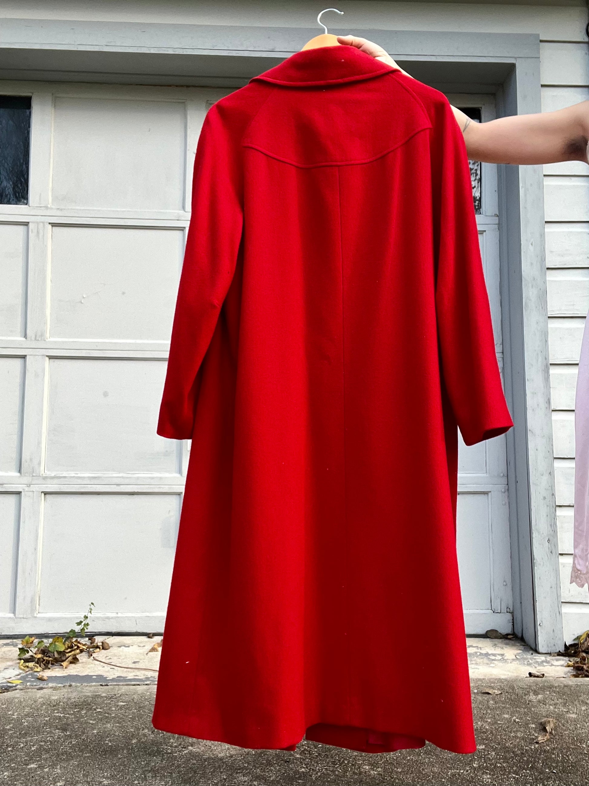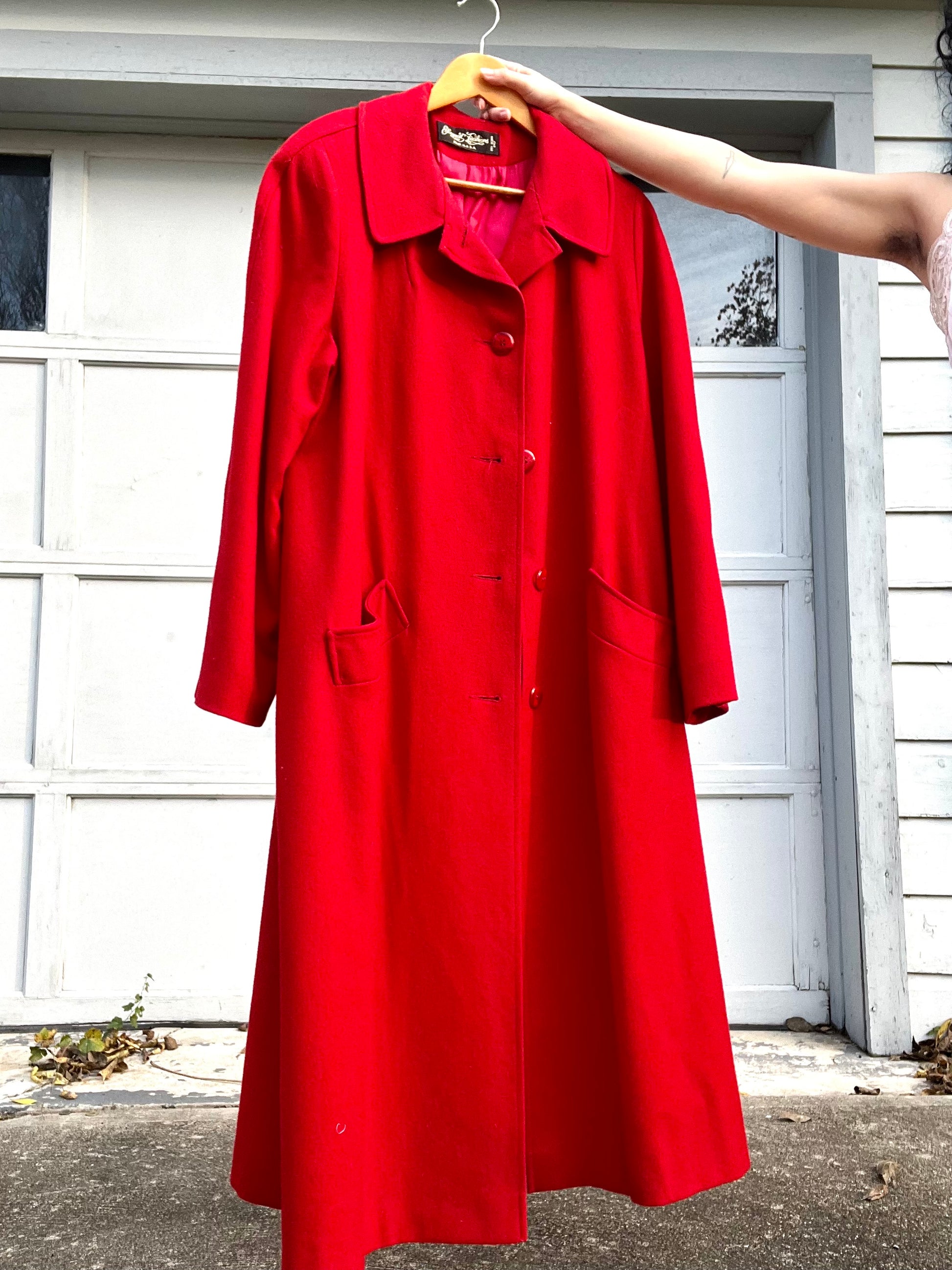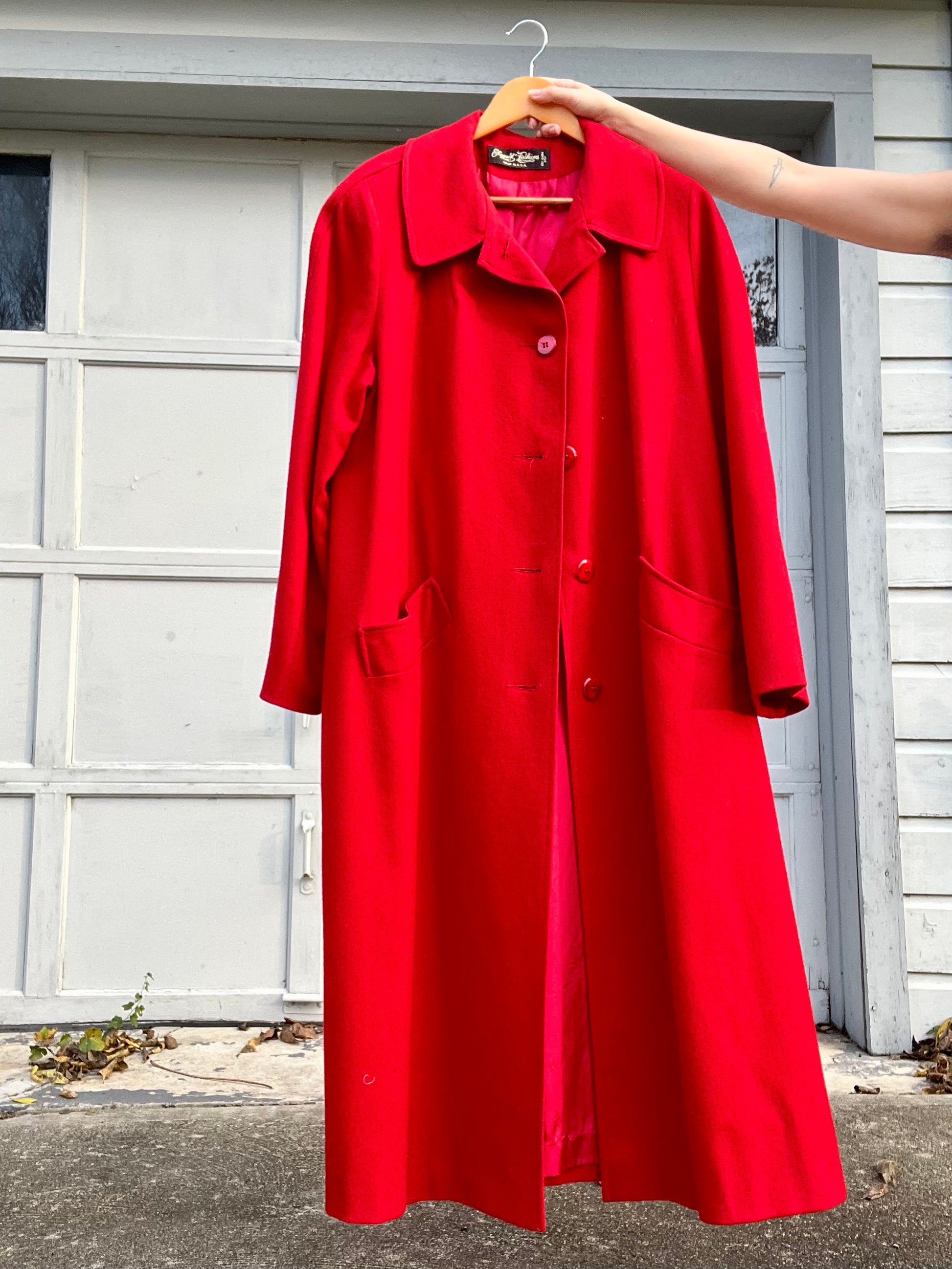 Vintage 80s cherry red wool trenchcoat. Has roomy outer pockets and red/ black chunky marbled buttons. Fully lined. Union made by Elegant Fashions. Best fits an XL.