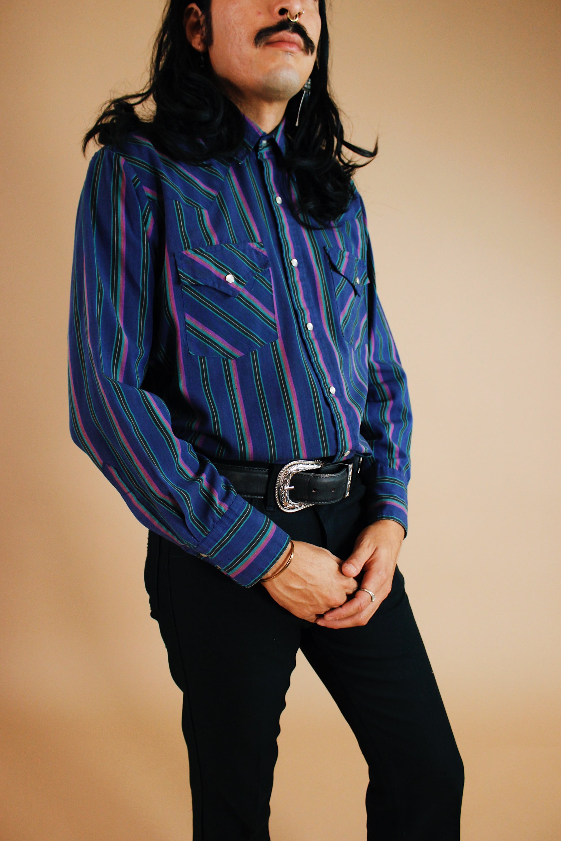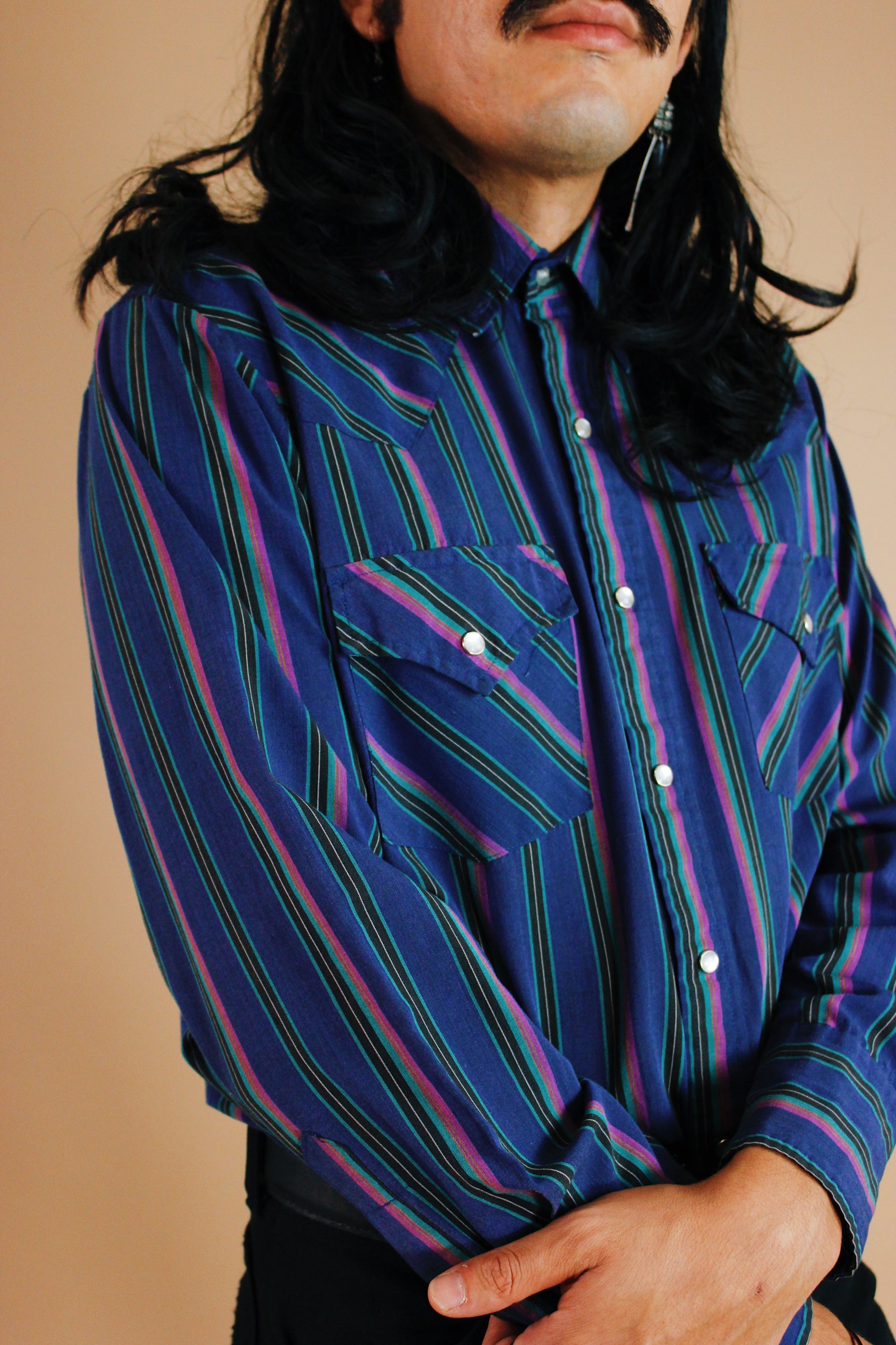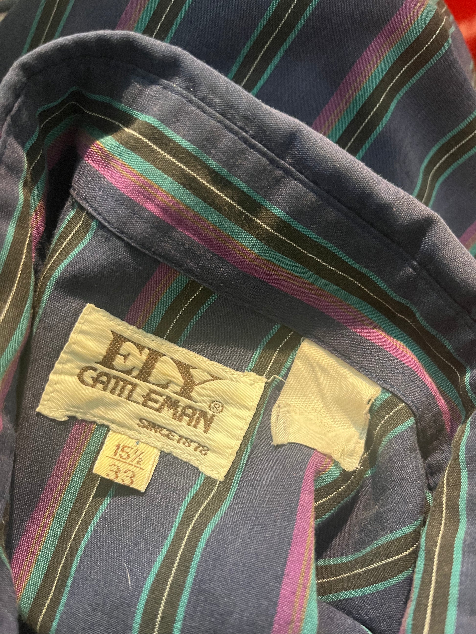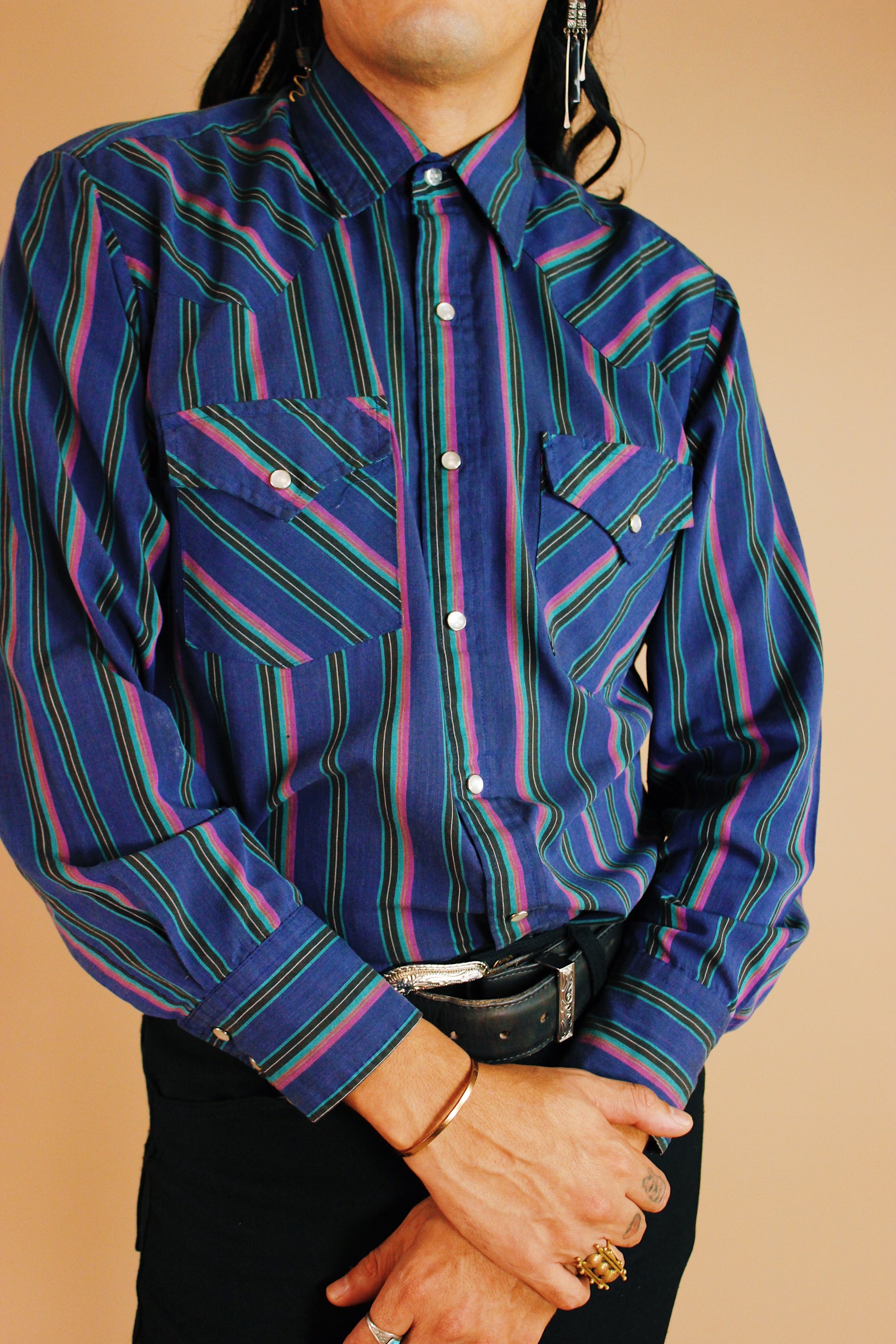 Vintage 70s indigo blue pearl snap with purple & teal stripes. Classic western staple piece. Has a nice light & breathable cotton feel. By Ely Cattleman. Tag size 33. Best fits a M/L. Seen on Michael.