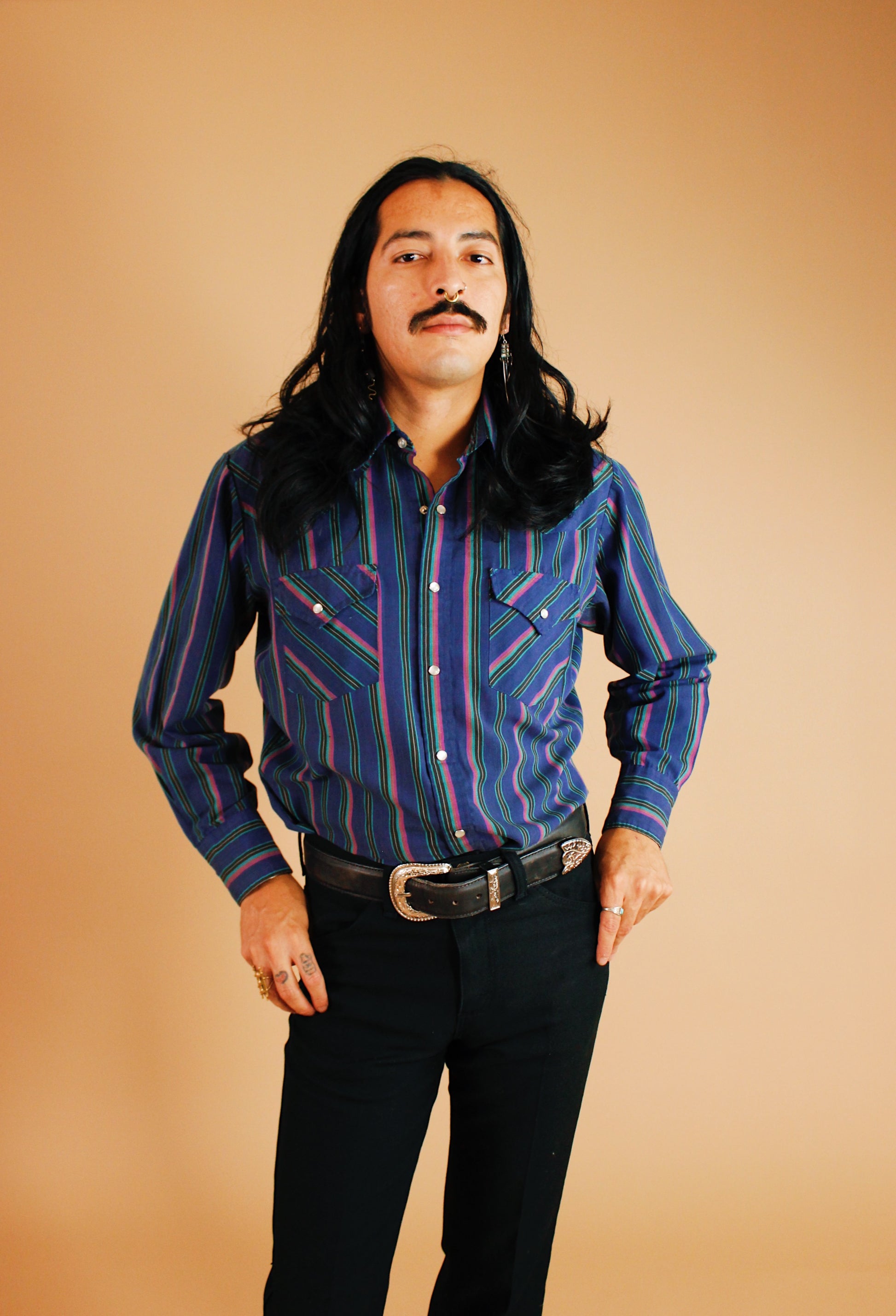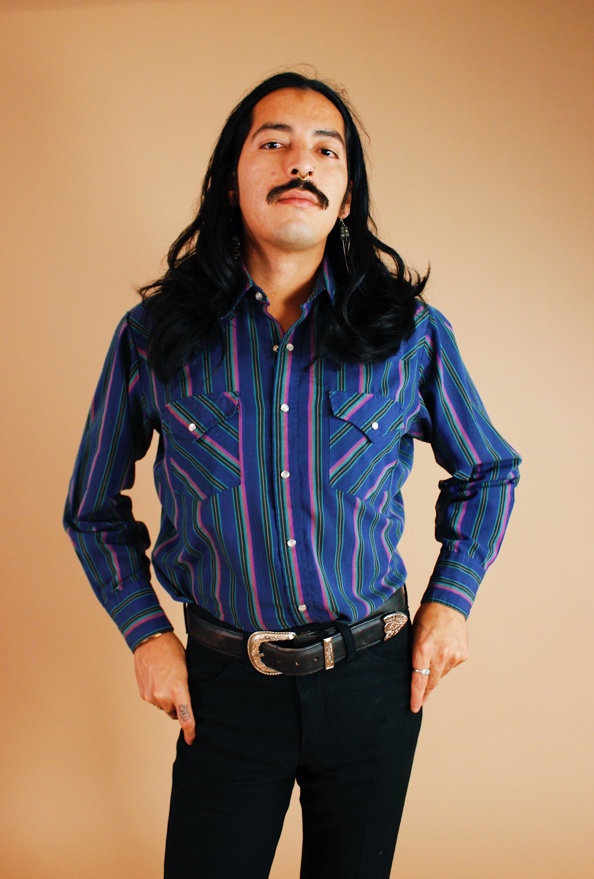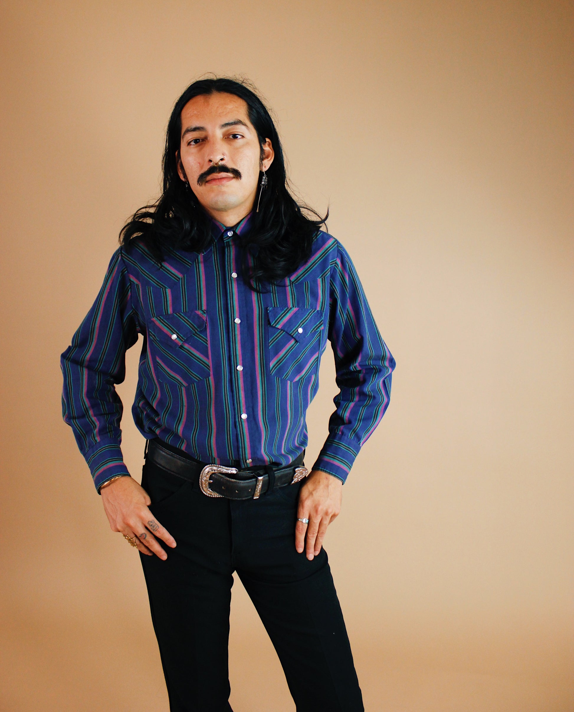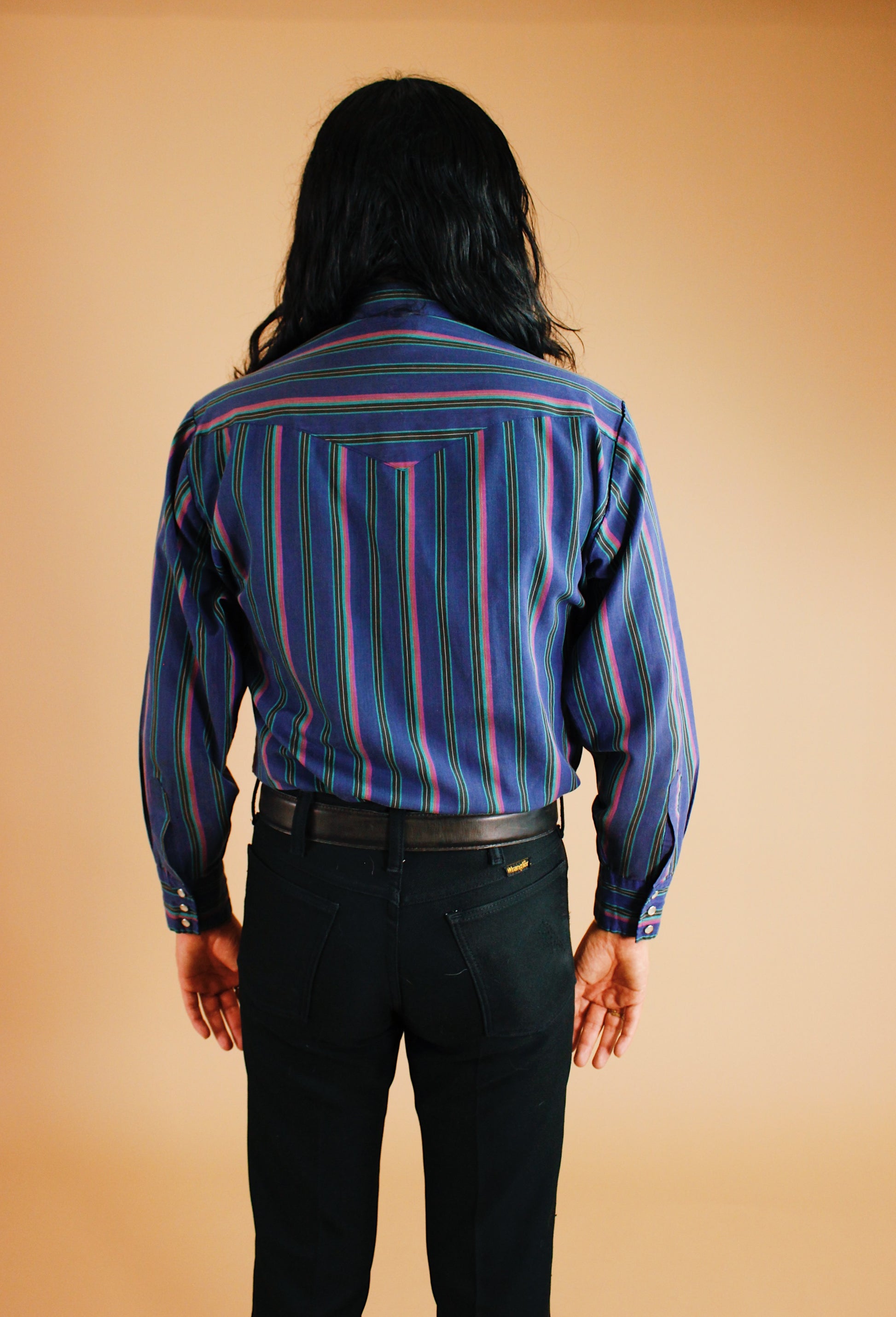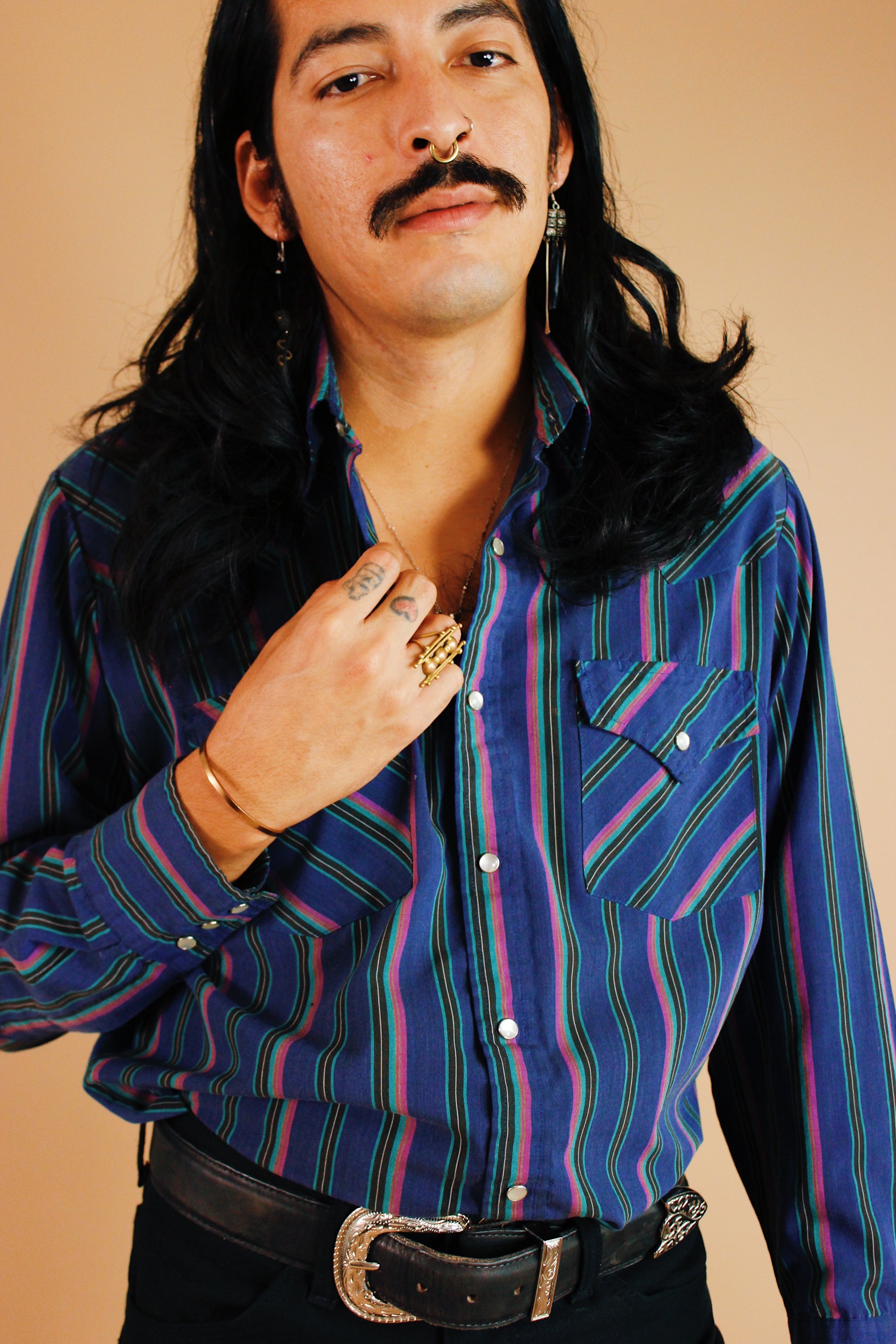 Vintage 70s indigo blue pearl snap with purple & teal stripes. Classic western staple piece. Has a nice light & breathable cotton feel. By Ely Cattleman. Tag size 33. Best fits a M/L. Seen on Michael.
