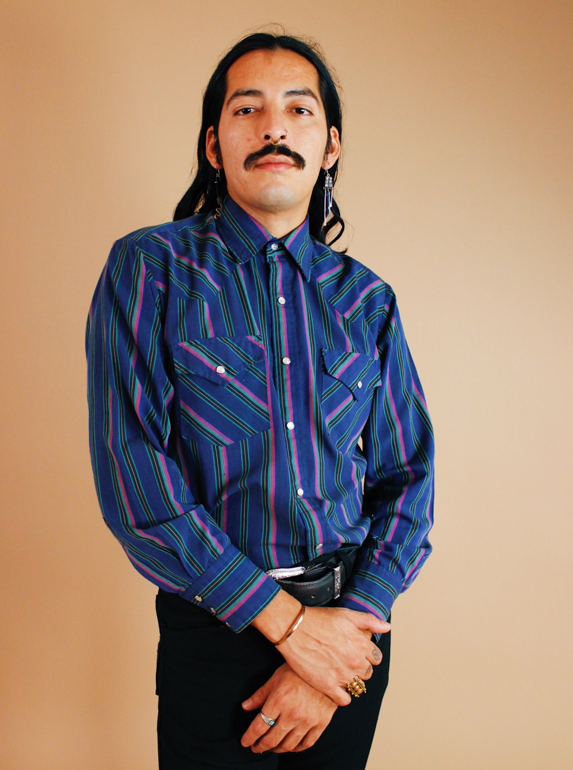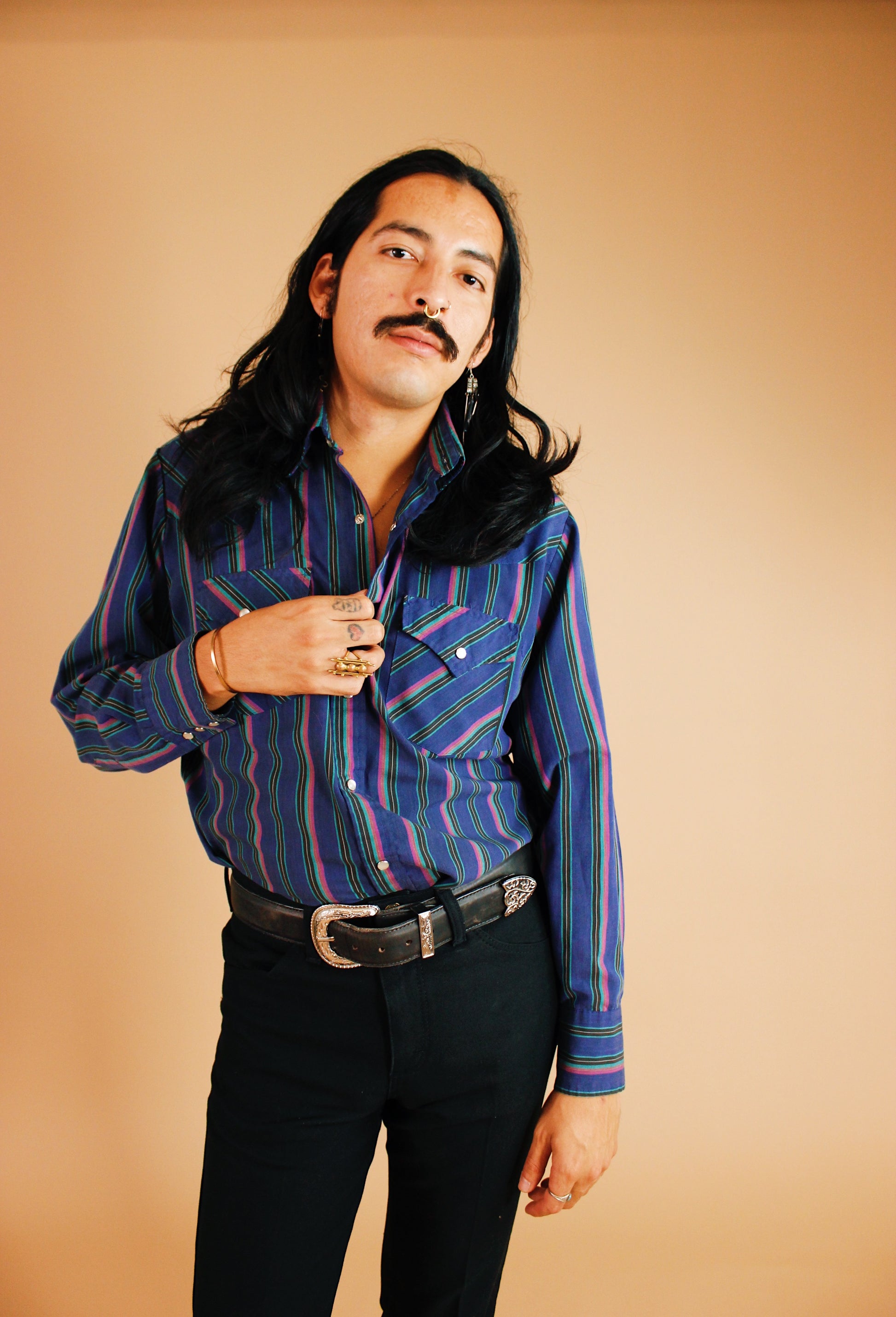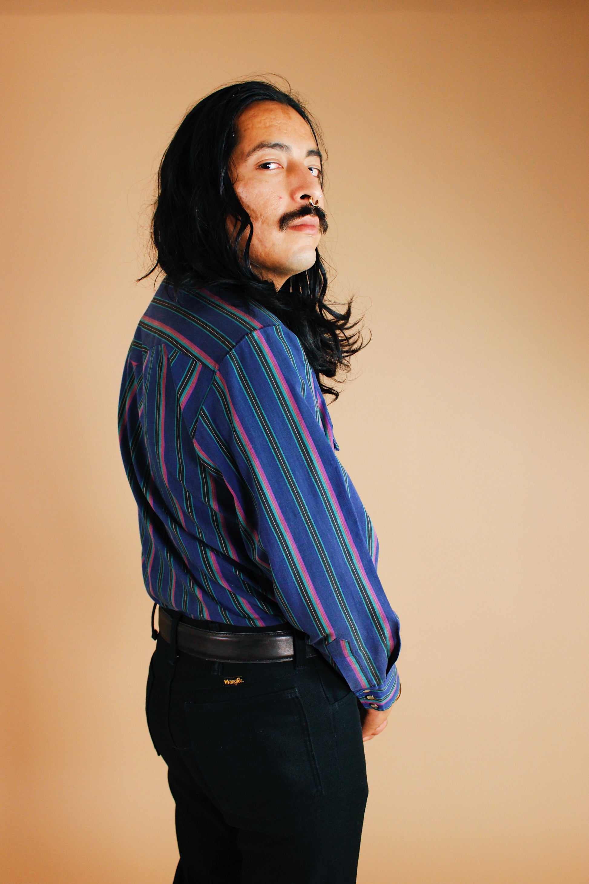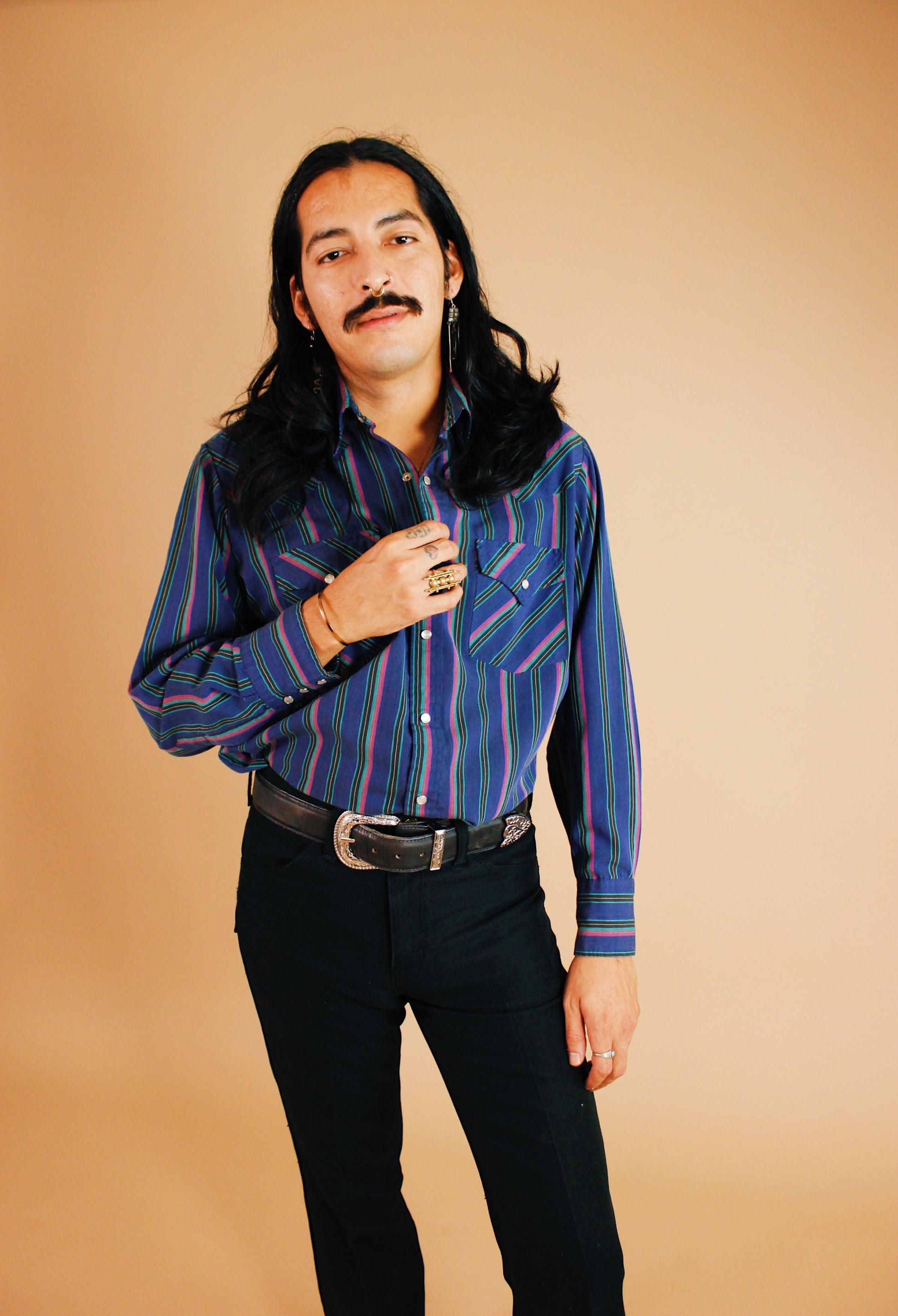 Vintage 70s indigo blue pearl snap with purple & teal stripes. Classic western staple piece. Has a nice light & breathable cotton feel. By Ely Cattleman. Tag size 33. Best fits a M/L. Seen on Michael.