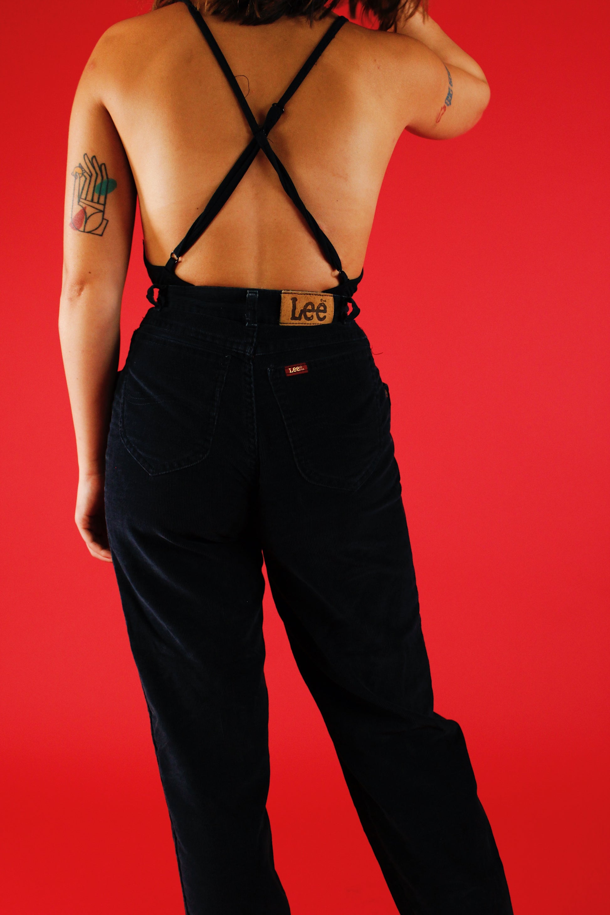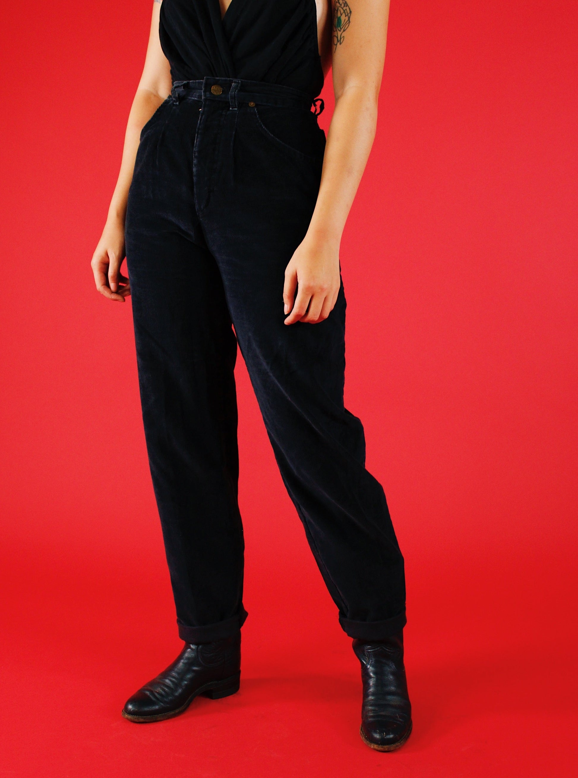 Vintage 80s black corduroy Lee Riders trousers. Perfect fall essential! Has roomy back pockets and a classic Lee back patch. Has no tags. Best fits an XXS. Seen on Kathleen.