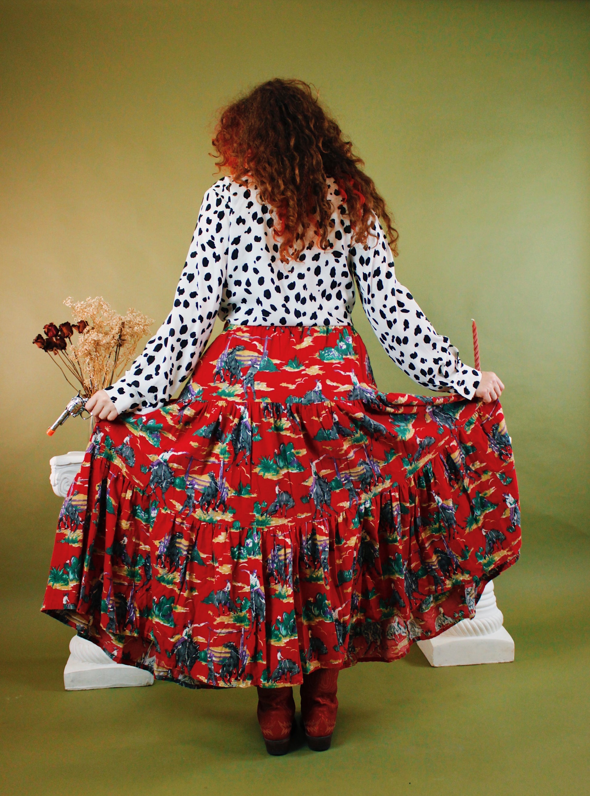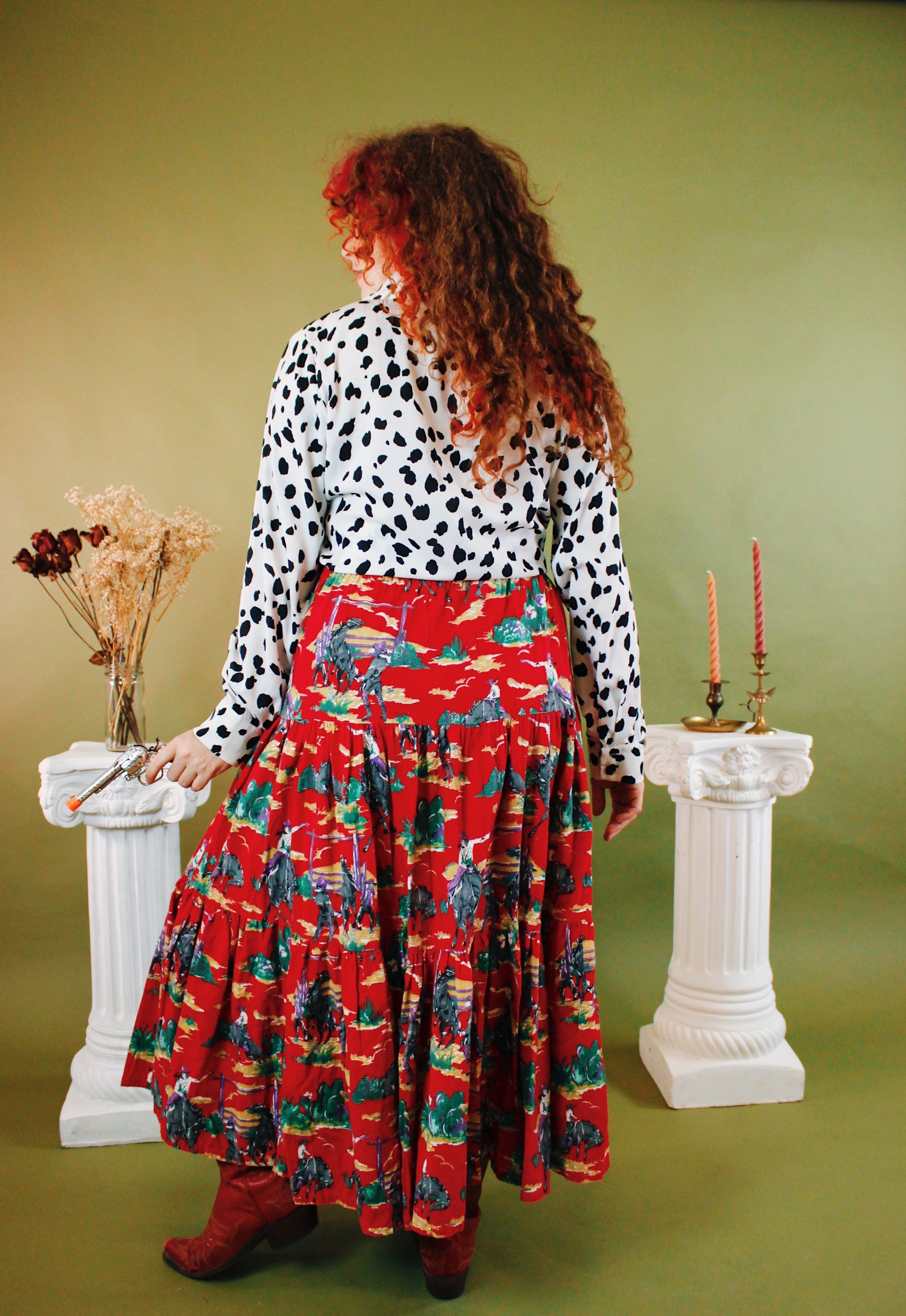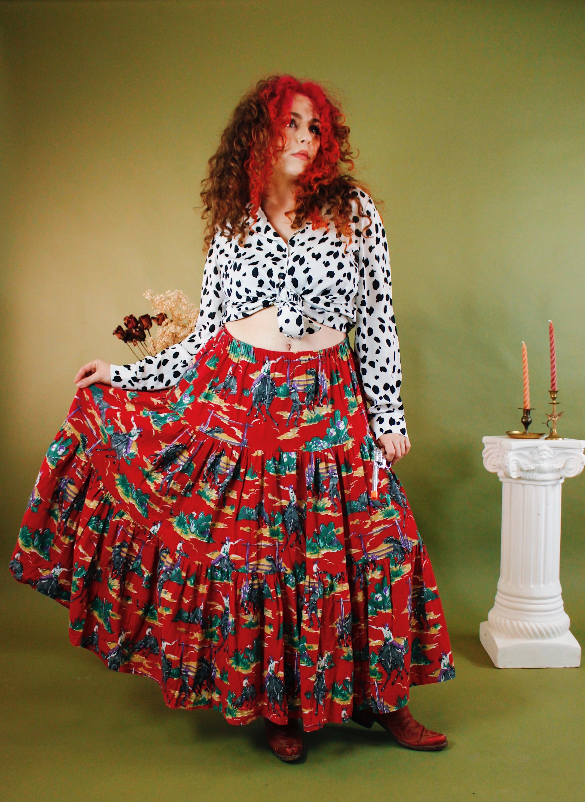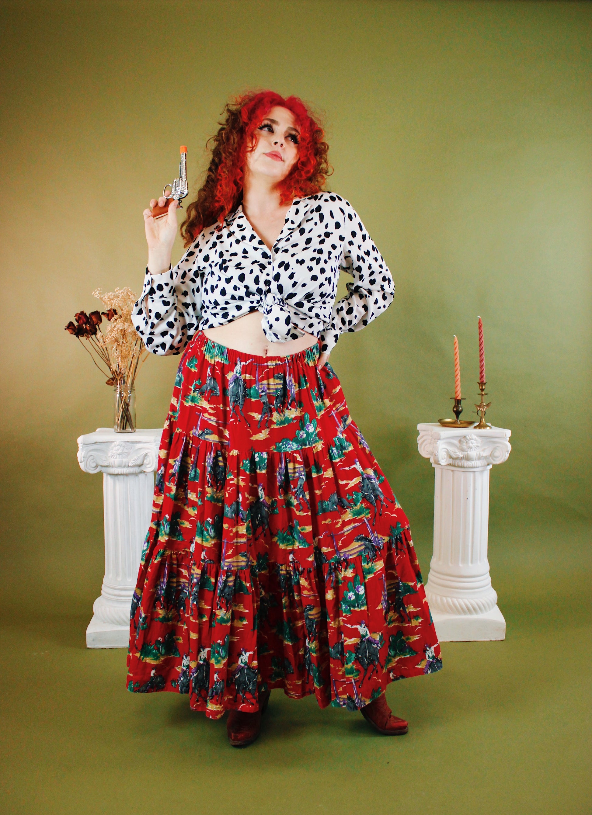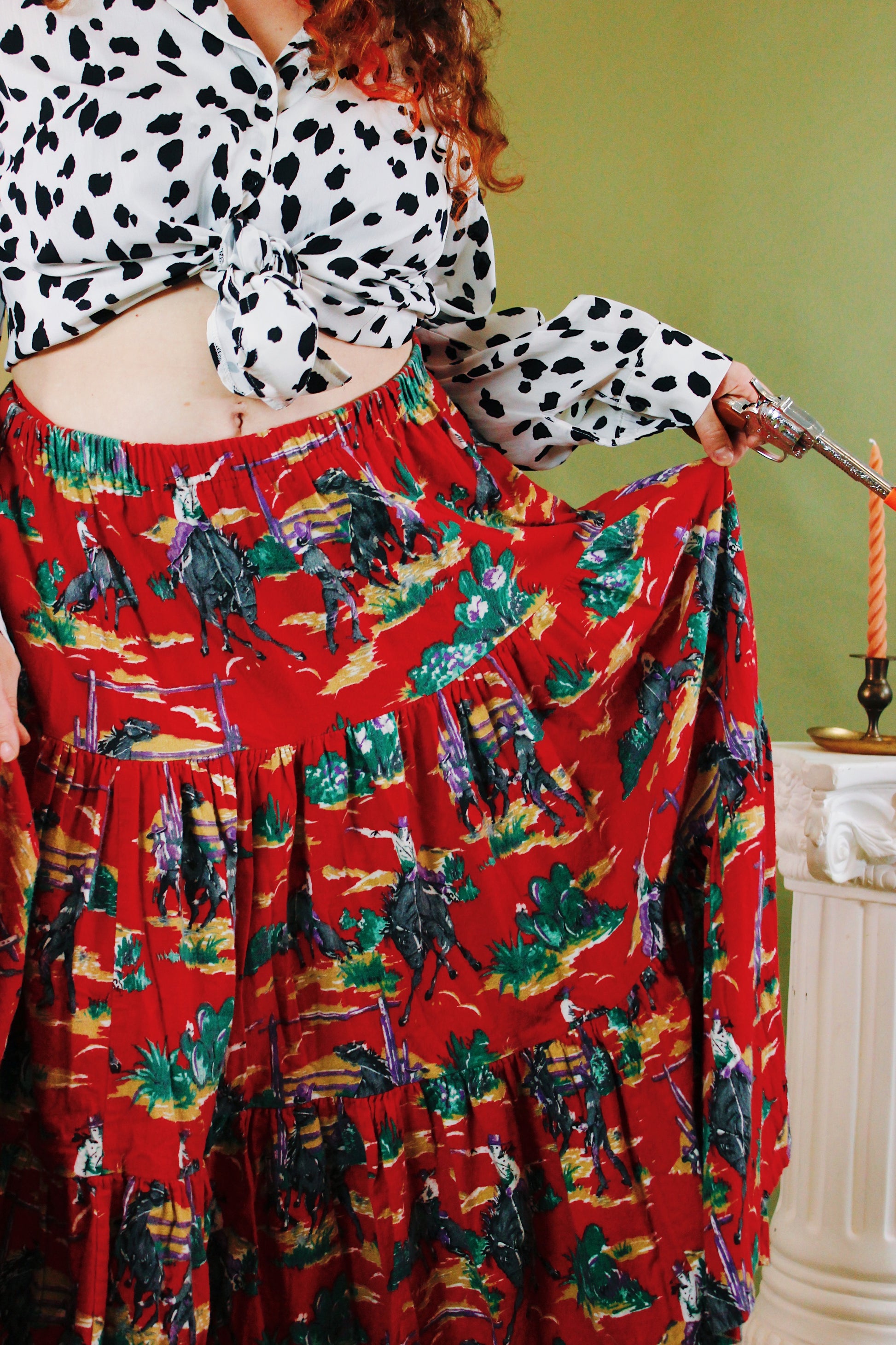 Vintage 90s tiered western skirt with the cutest bucking cowboy print. Super soft cotton feel. The perfect piece to dial up a lil western fun in your wardrobe! You can even get creative and style it with a chunky belt as a dress! By California Influence. Tag size One Size, 100% Cotton. Best fits a S-XL. Seen on Bailey.