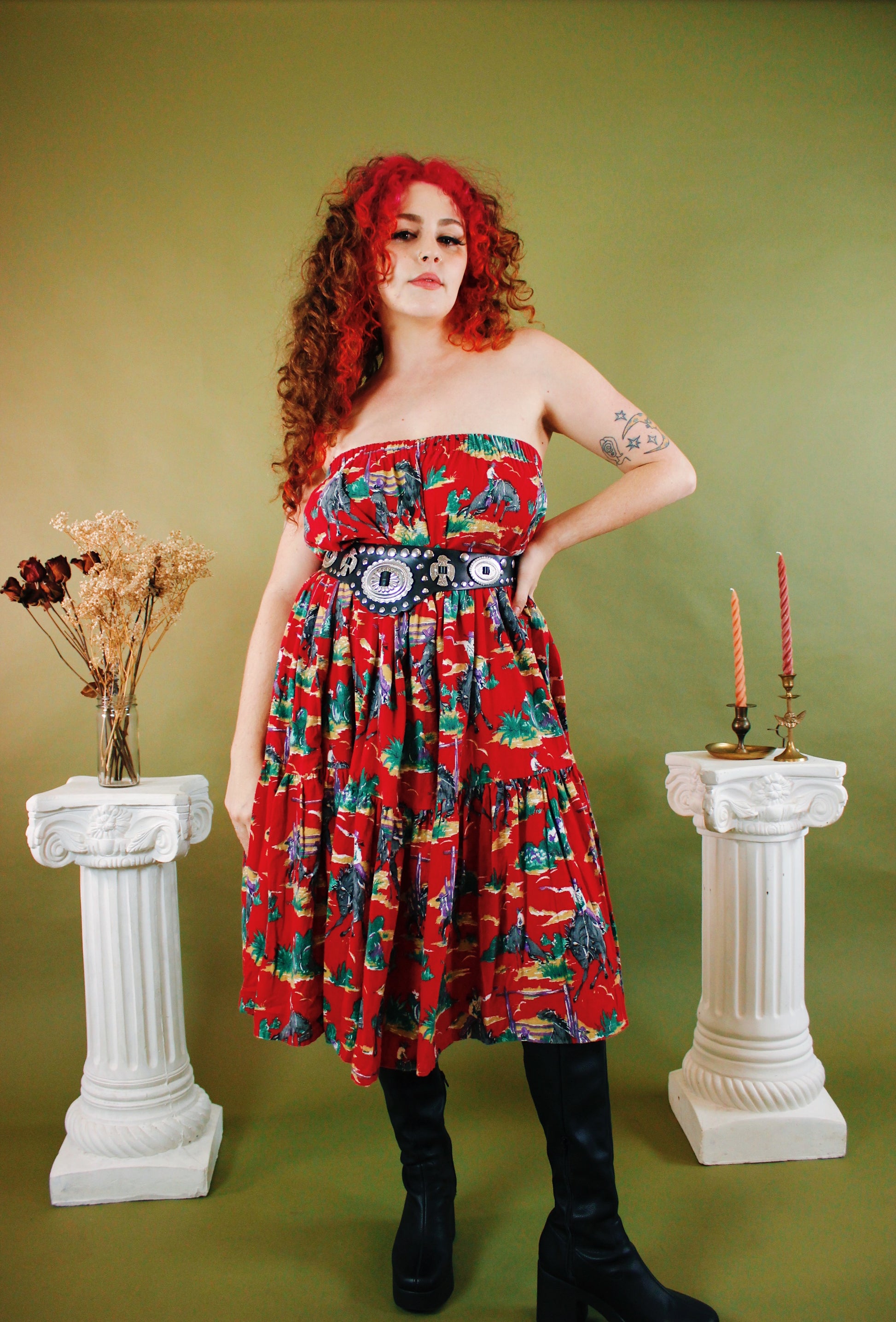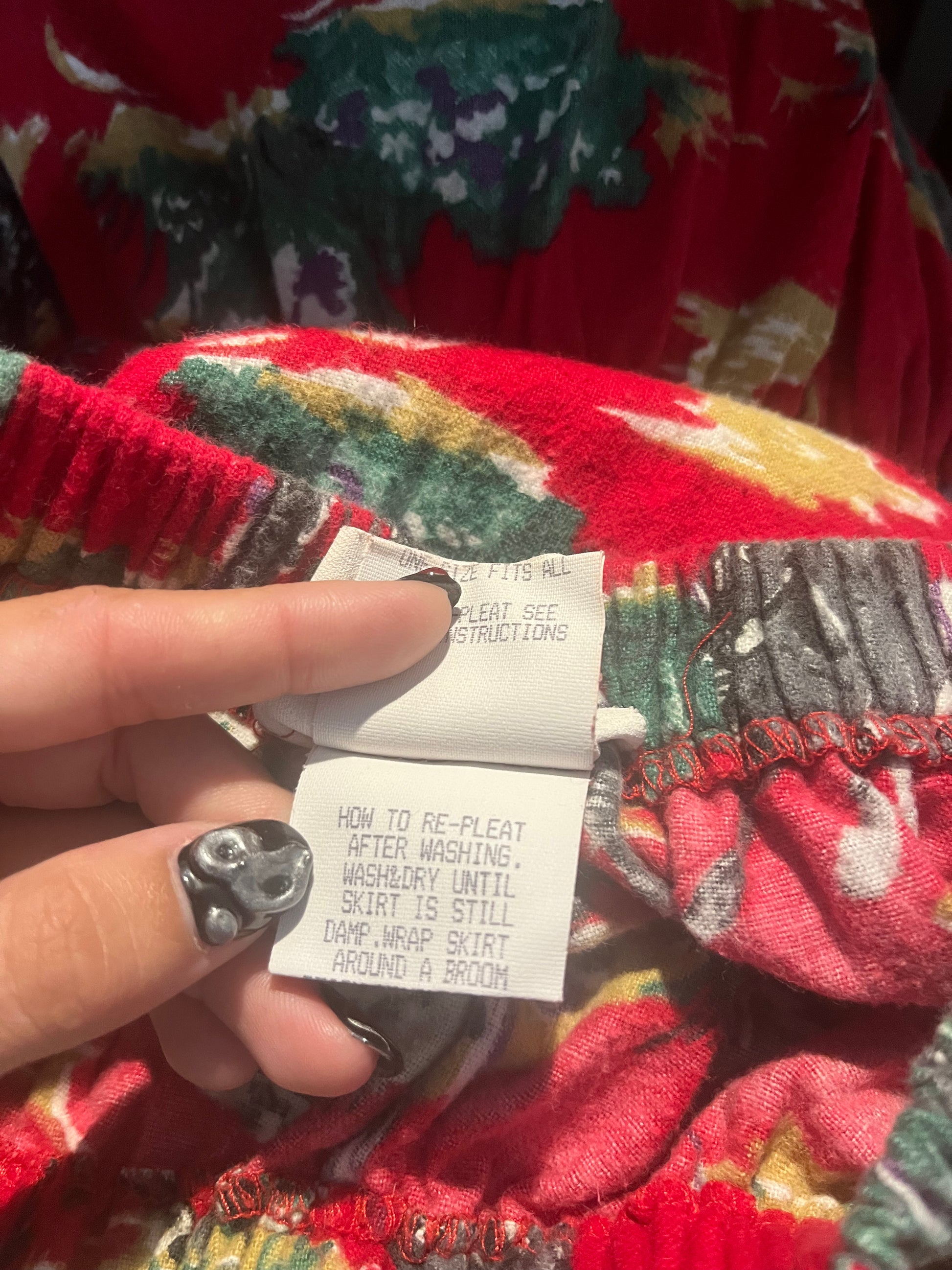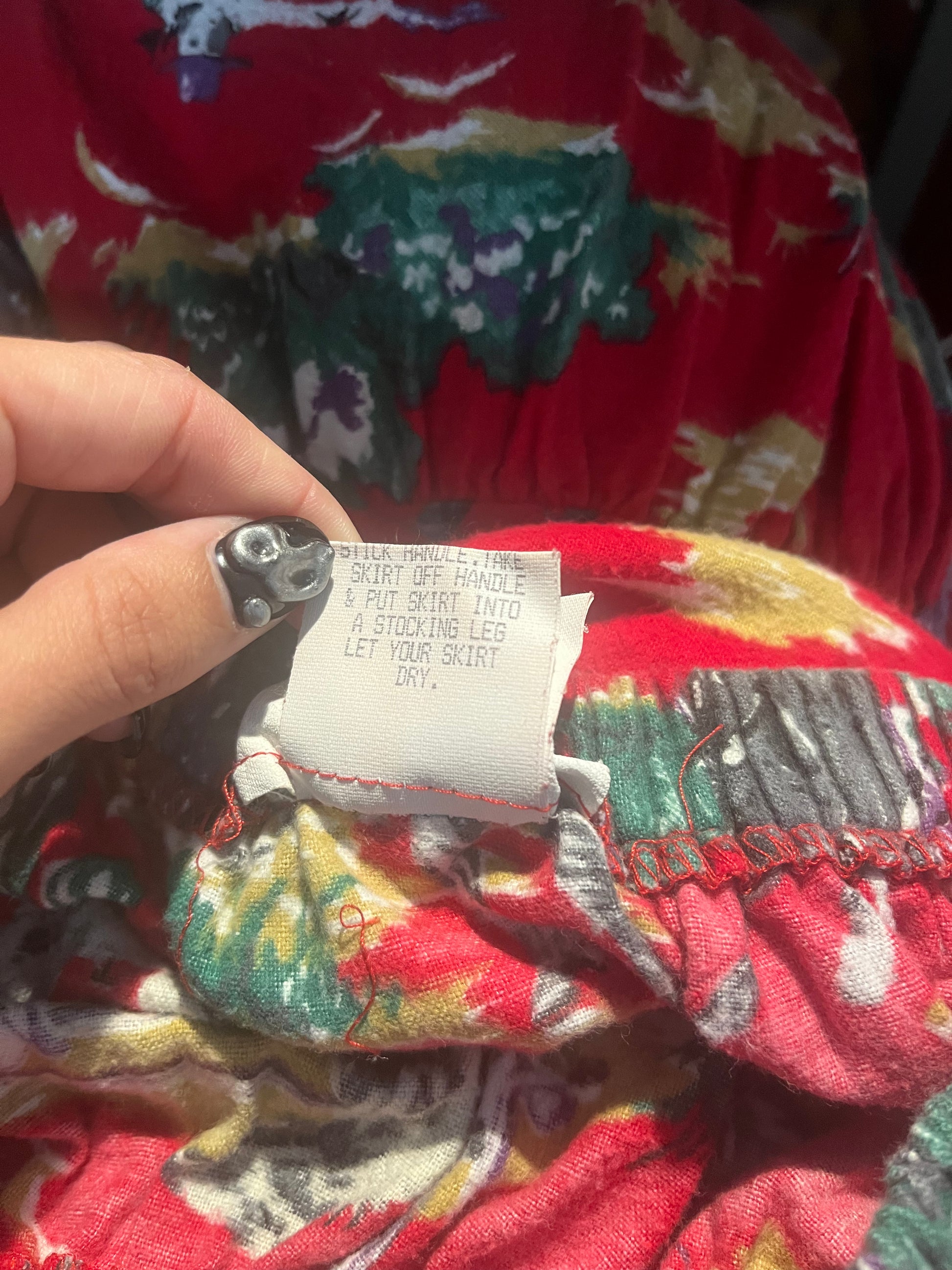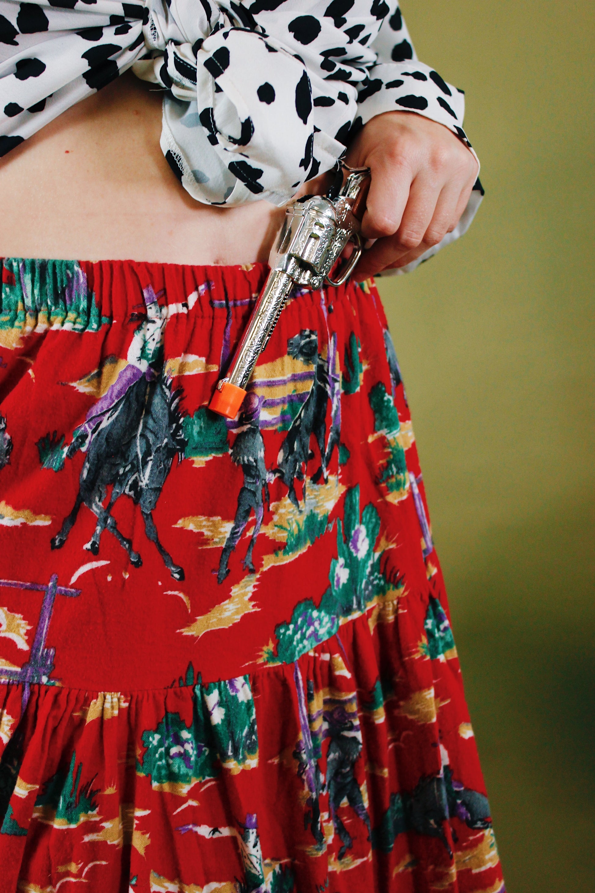 Vintage 90s tiered western skirt with the cutest bucking cowboy print. Super soft cotton feel. The perfect piece to dial up a lil western fun in your wardrobe! You can even get creative and style it with a chunky belt as a dress! By California Influence. Tag size One Size, 100% Cotton. Best fits a S-XL. Seen on Bailey.