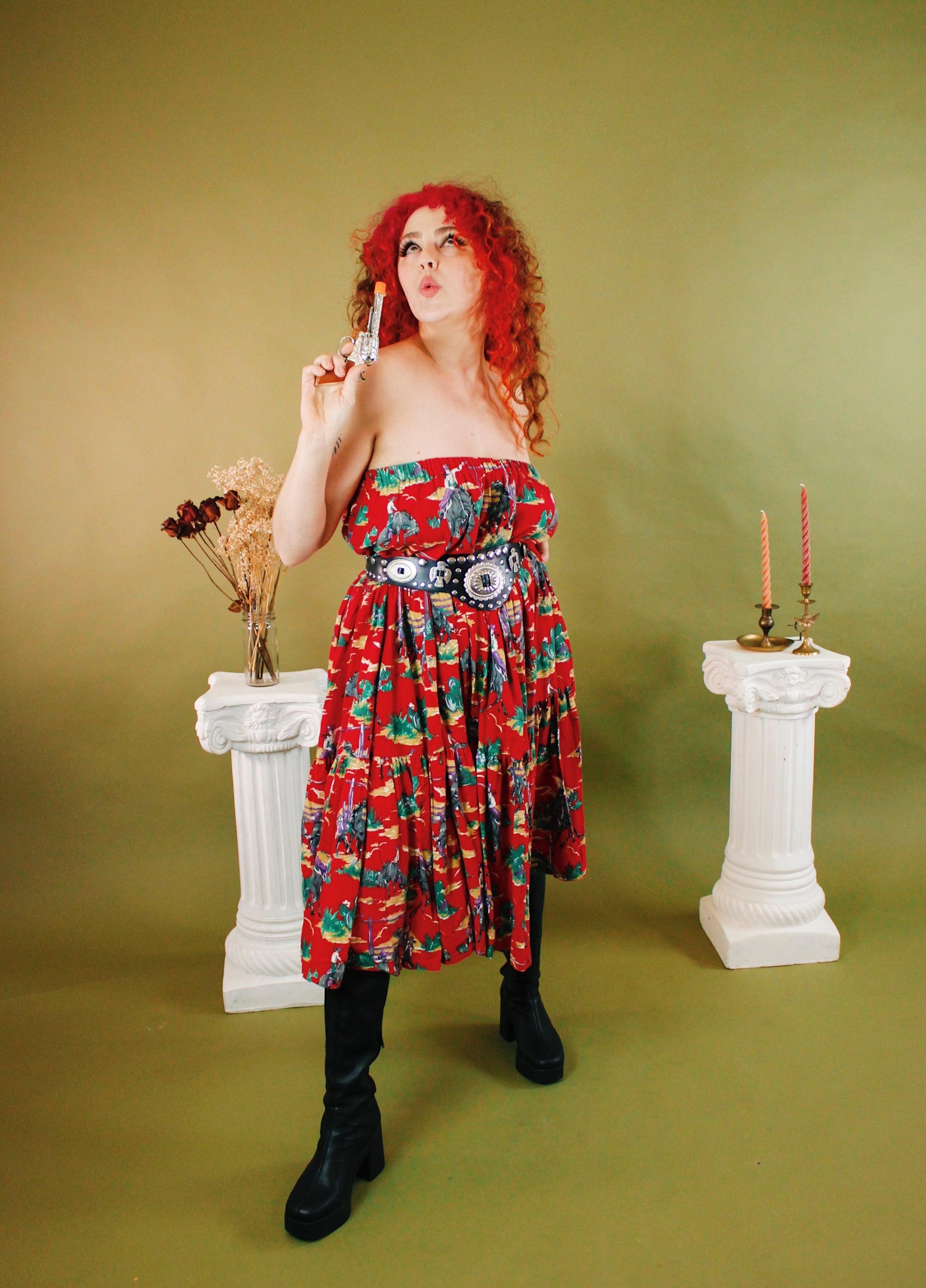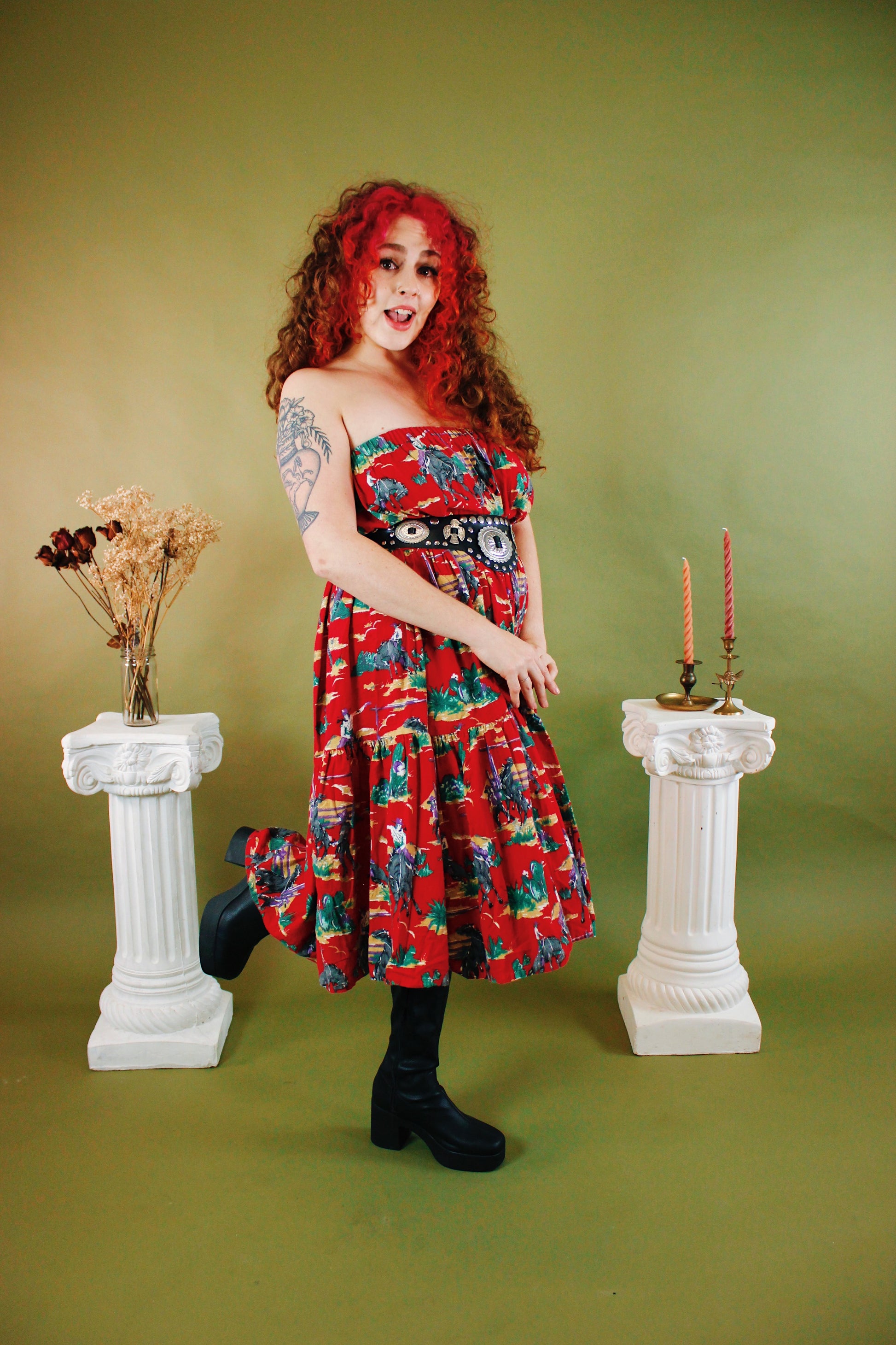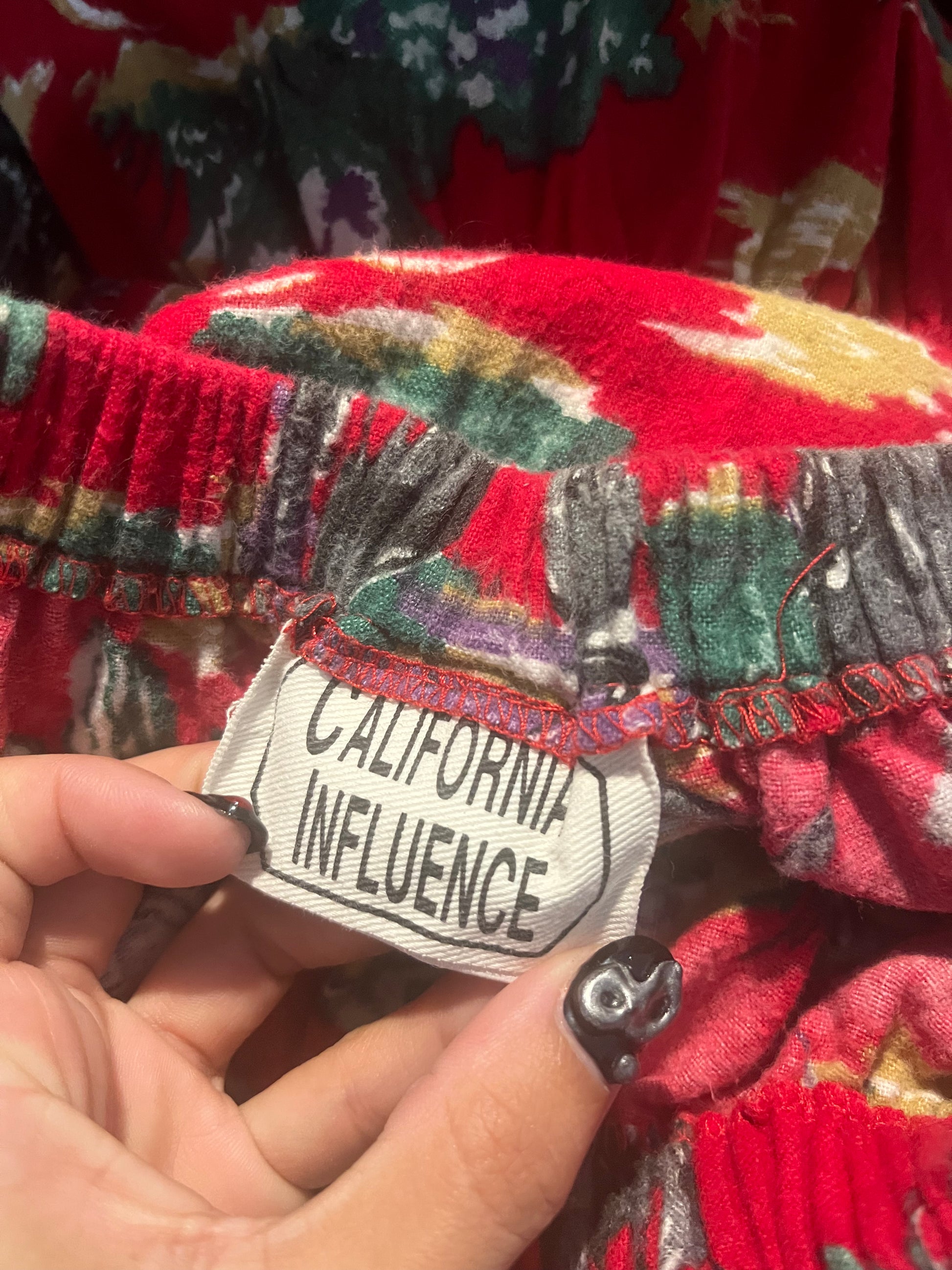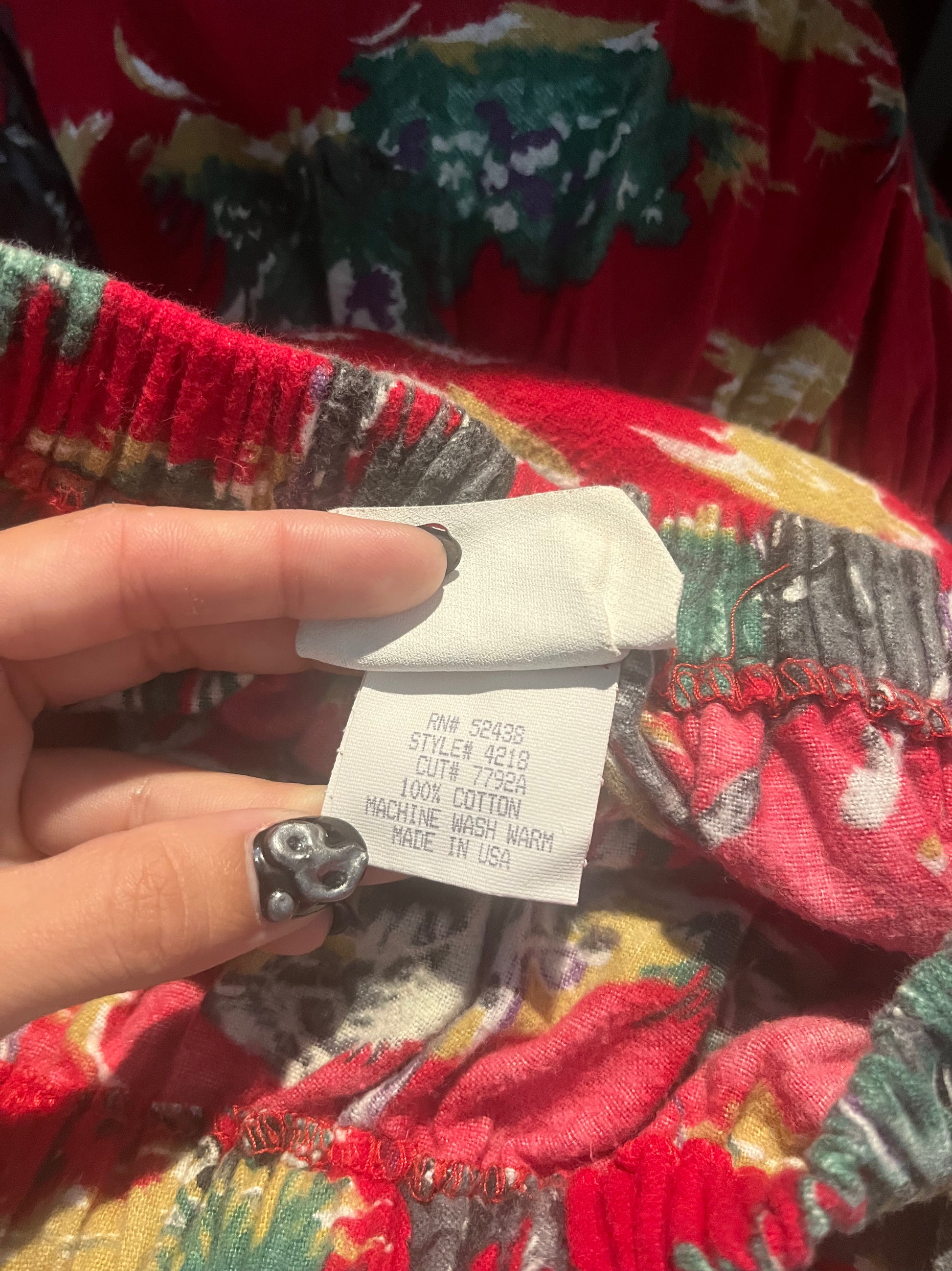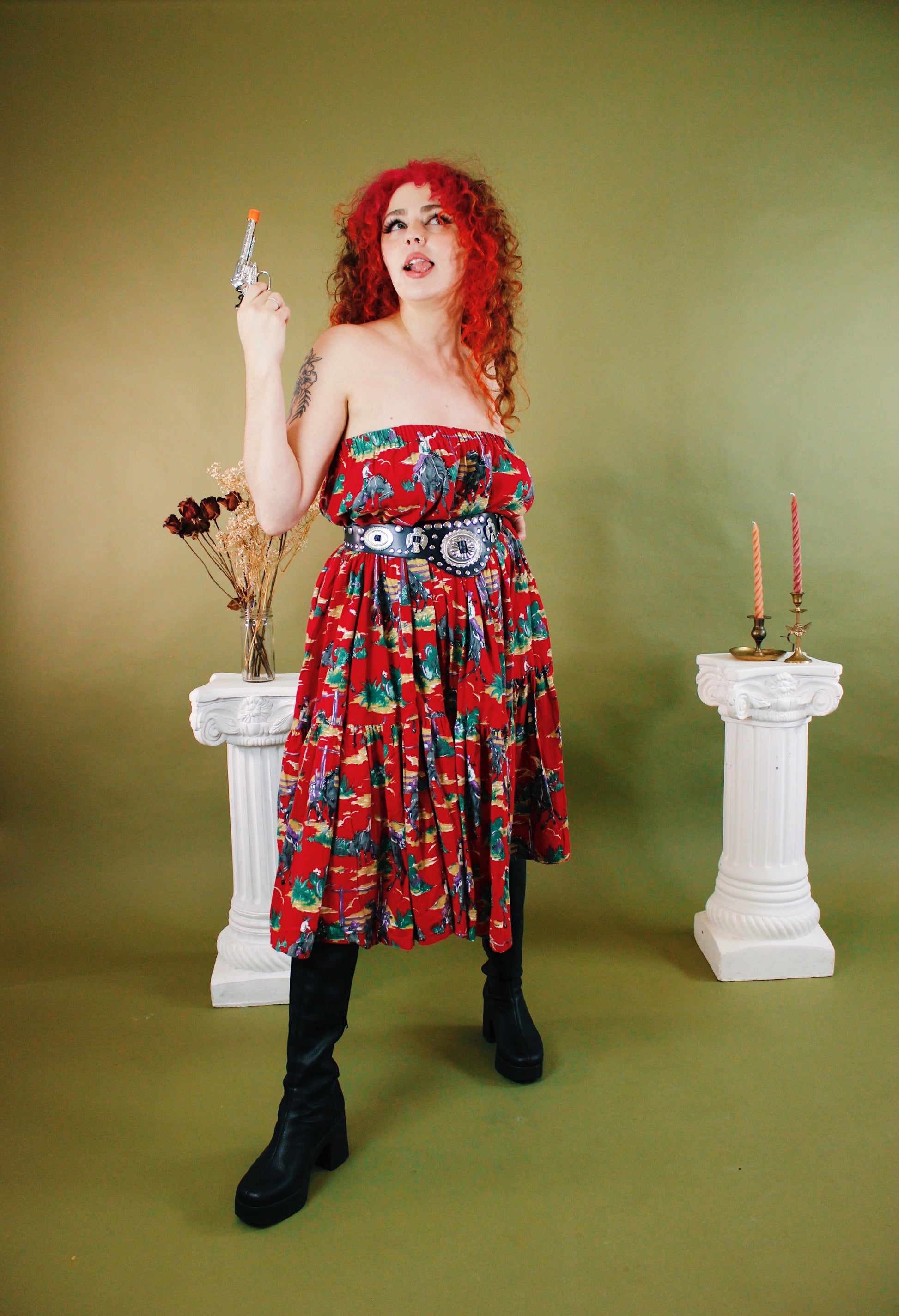 Vintage 90s tiered western skirt with the cutest bucking cowboy print. Super soft cotton feel. The perfect piece to dial up a lil western fun in your wardrobe! You can even get creative and style it with a chunky belt as a dress! By California Influence. Tag size One Size, 100% Cotton. Best fits a S-XL. Seen on Bailey.