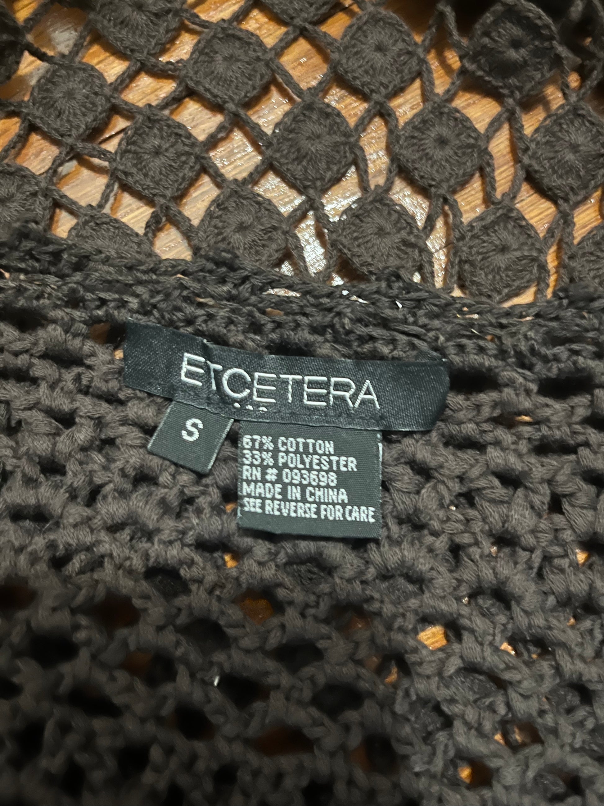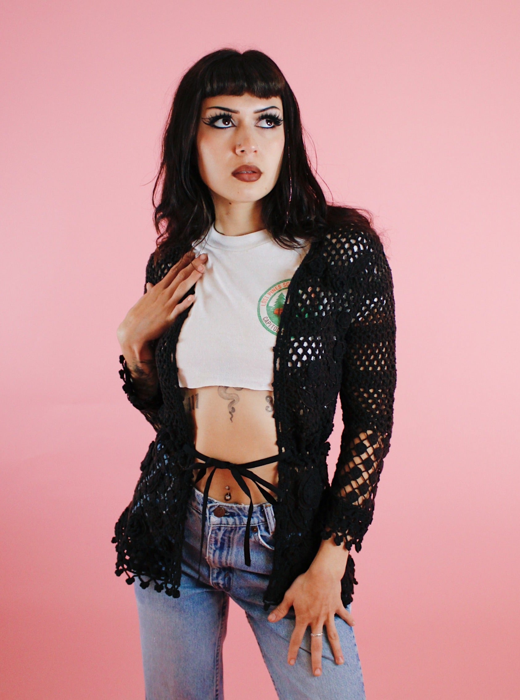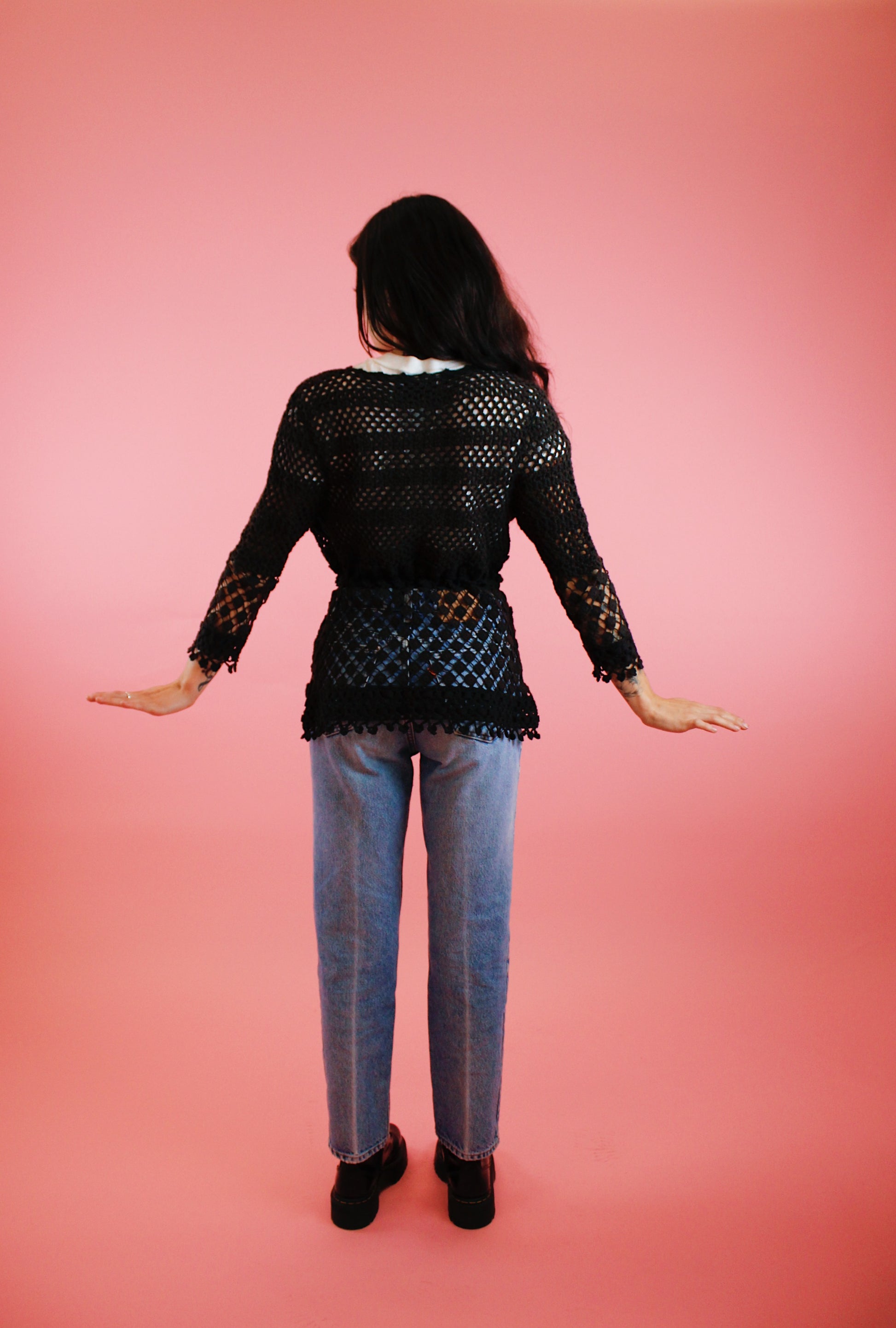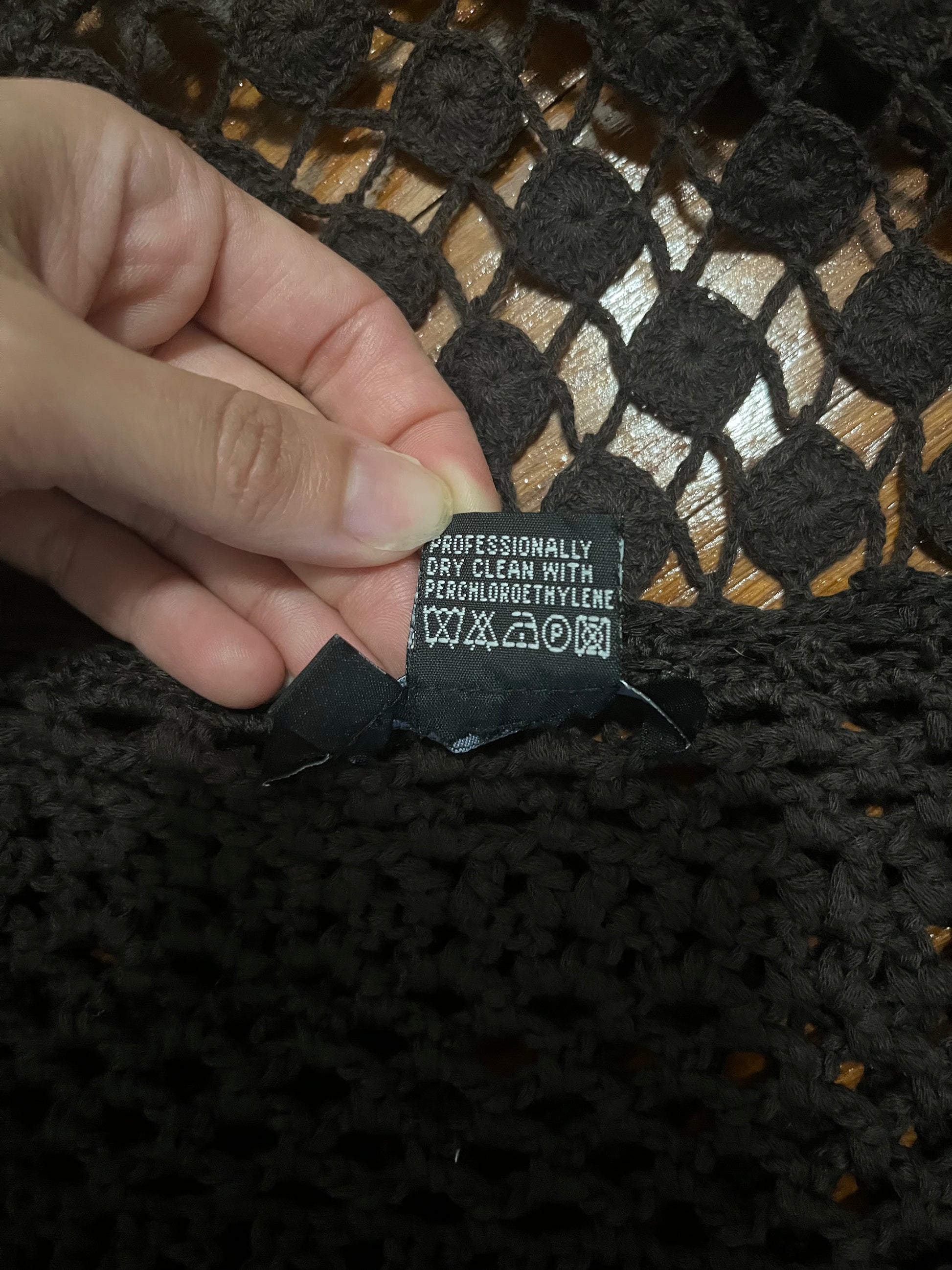 Vintage 90s deep brown crochet cardigan with a ribbon tie to cinch the waist. Love the shape of this piece and the various textures and patterns of the crochet. Has some cute floral appliques on the front and ribbon woven into the hem. By Etcetera. Tag size S, 67% Cotton 33% Polyester. Best fits a S. Seen on Angelica.