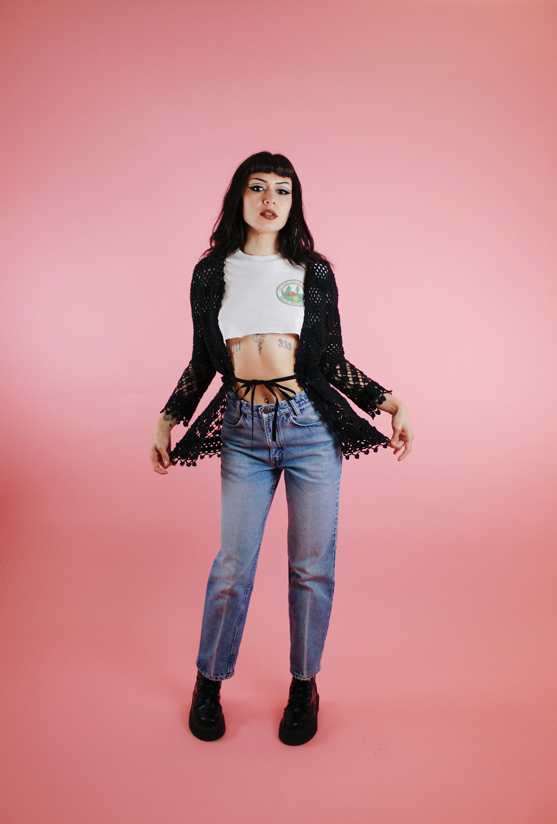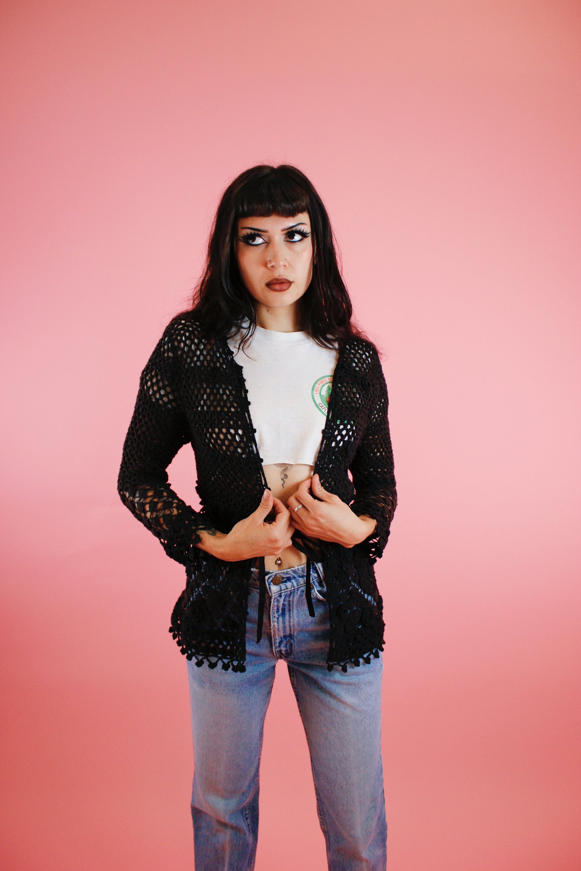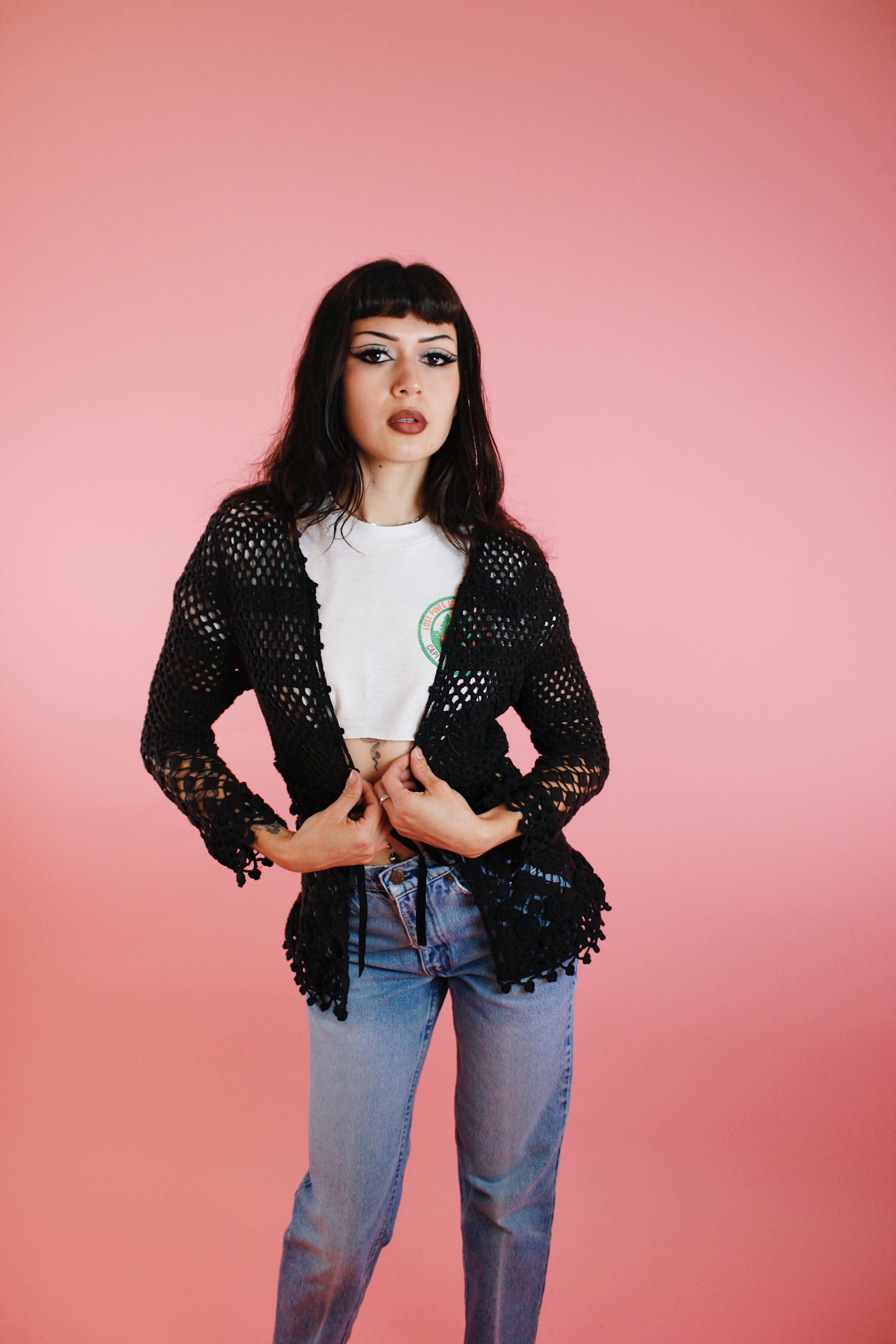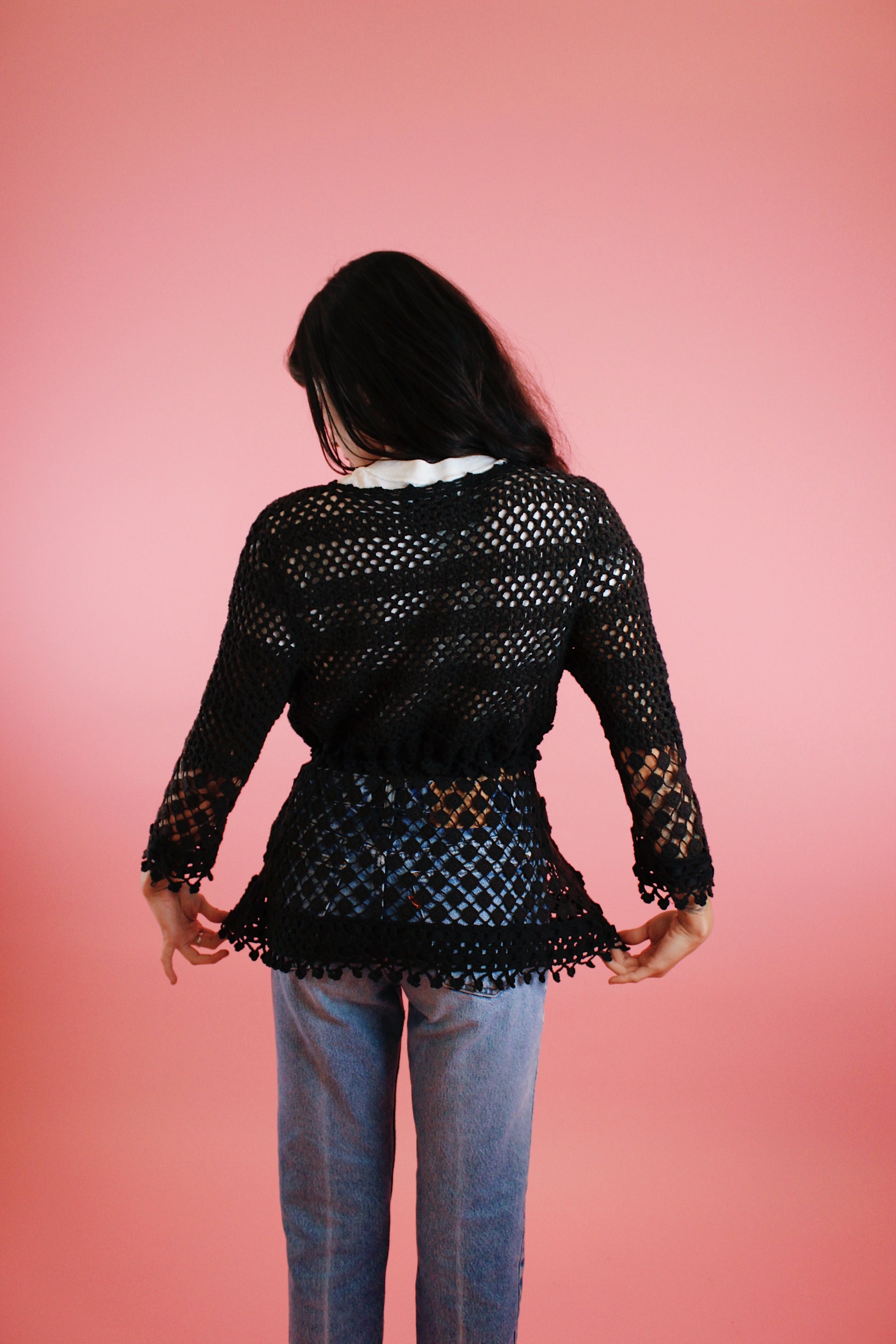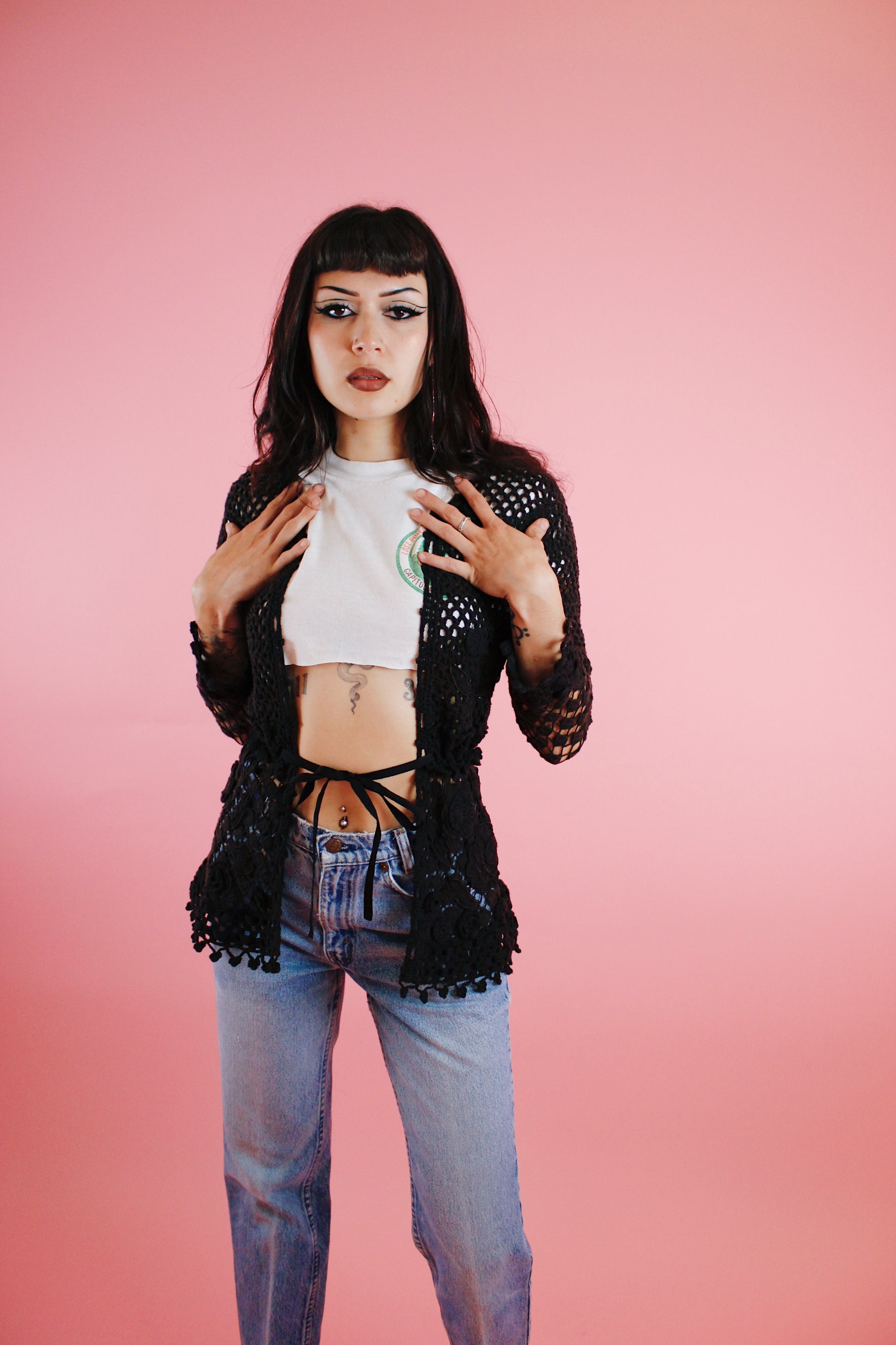 Vintage 90s deep brown crochet cardigan with a ribbon tie to cinch the waist. Love the shape of this piece and the various textures and patterns of the crochet. Has some cute floral appliques on the front and ribbon woven into the hem. By Etcetera. Tag size S, 67% Cotton 33% Polyester. Best fits a S. Seen on Angelica.