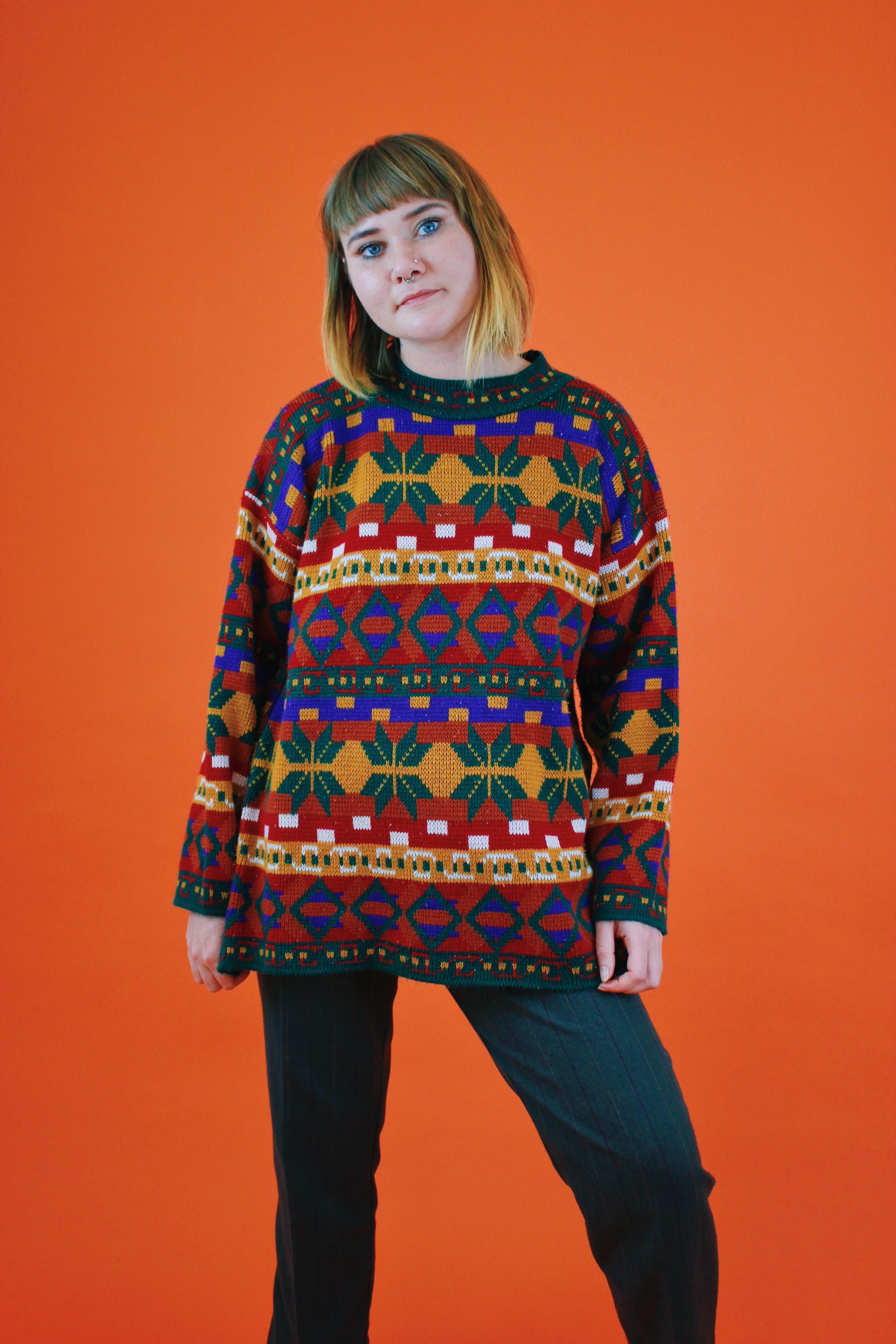 Vintage 90s colorful fall sweater. Mustard, rust, royal purple, forest green, and red meld in the most magical way. Mock neck with a cute trim design. By Carolina Colours. Tag size M, 100% Acrylic. Made in Korea. Best fits a M. Seen on Keagan.