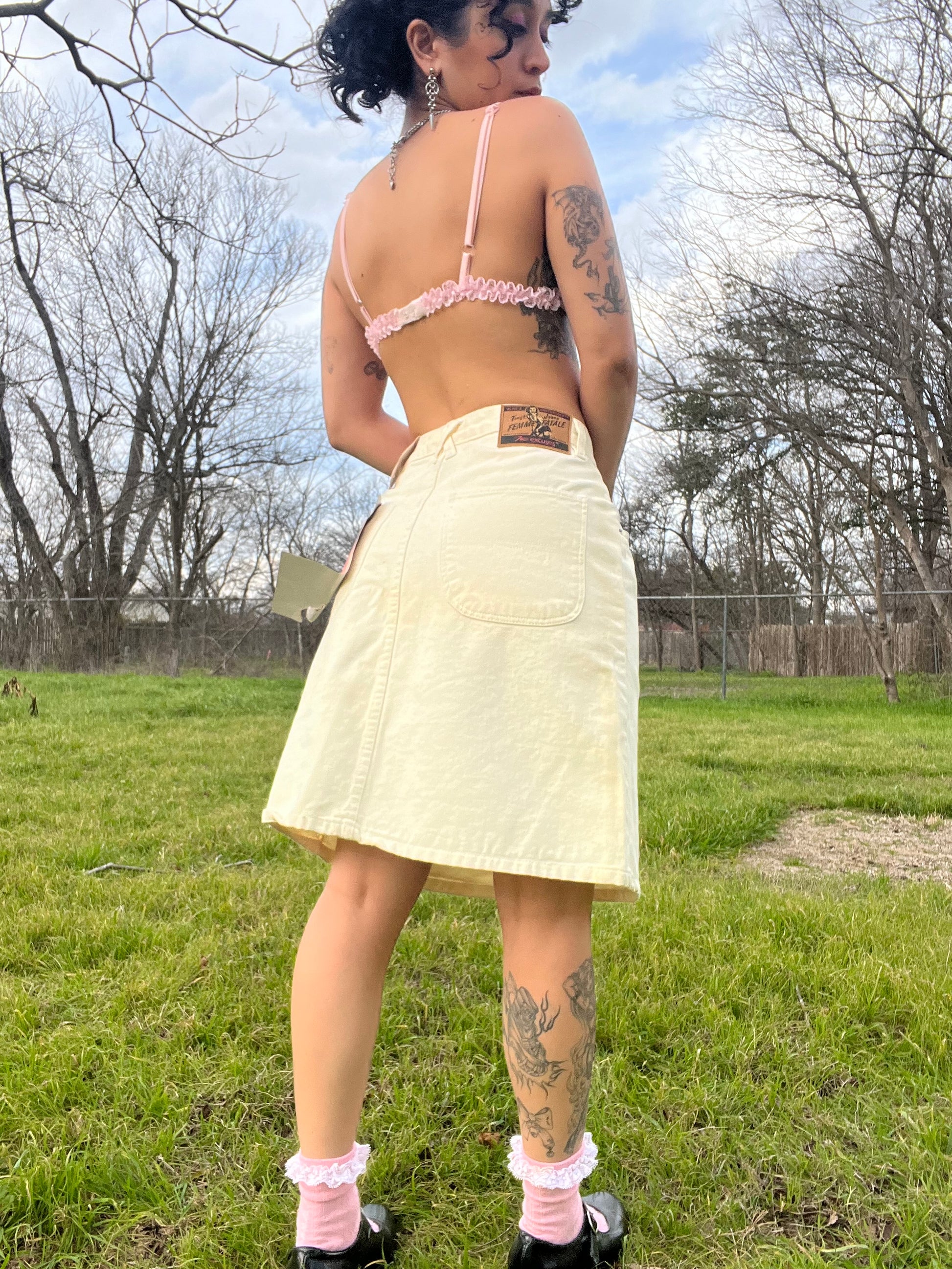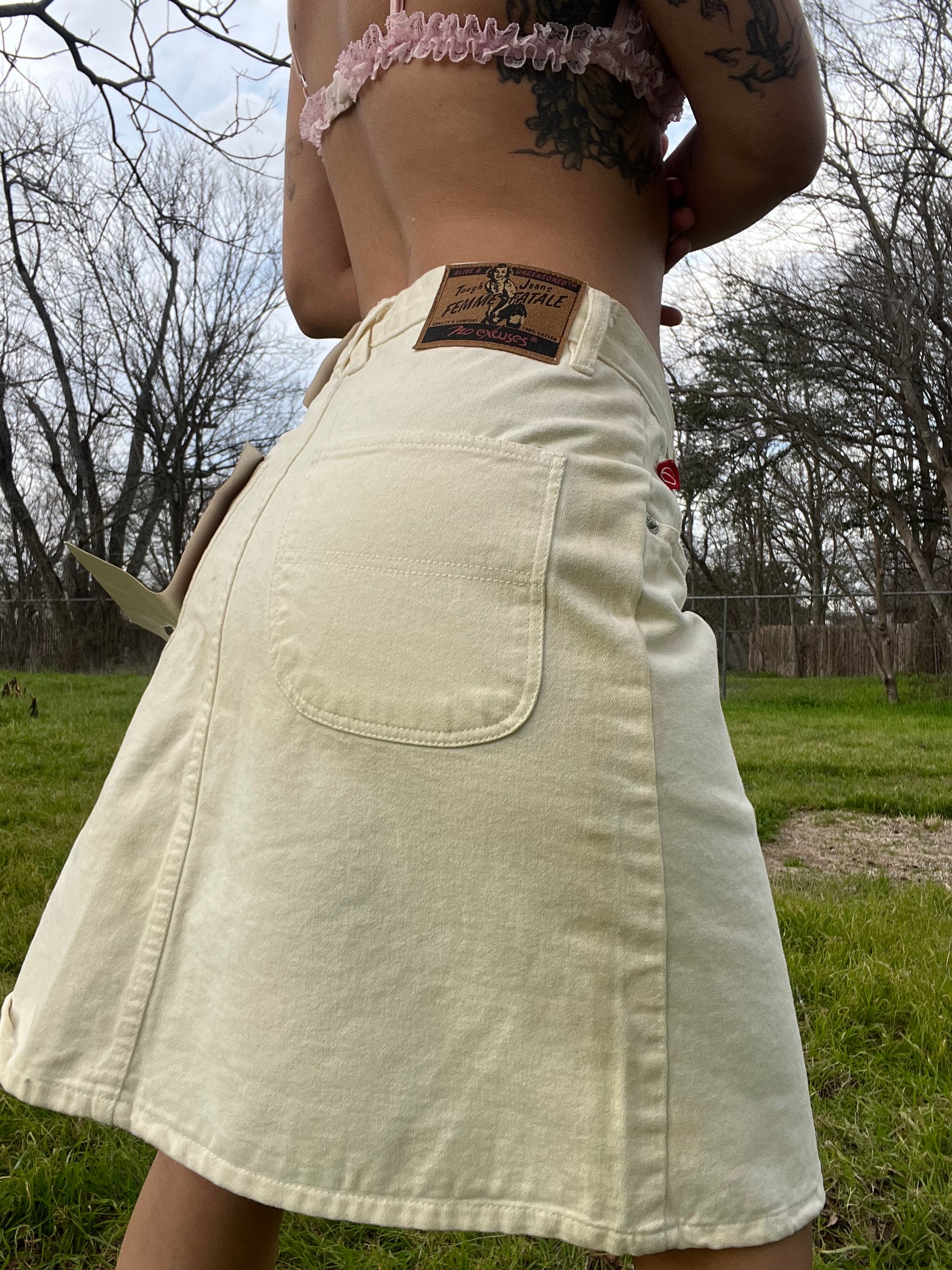 Vintage 90s white soft denim midi skirt with metal buttons and the cutest tag/ branding details. By No Excuses/ Femme Fatale. Dated 1995. Tag size 7/8, 100% Cotton. Best fits a S. Seen on Justina.