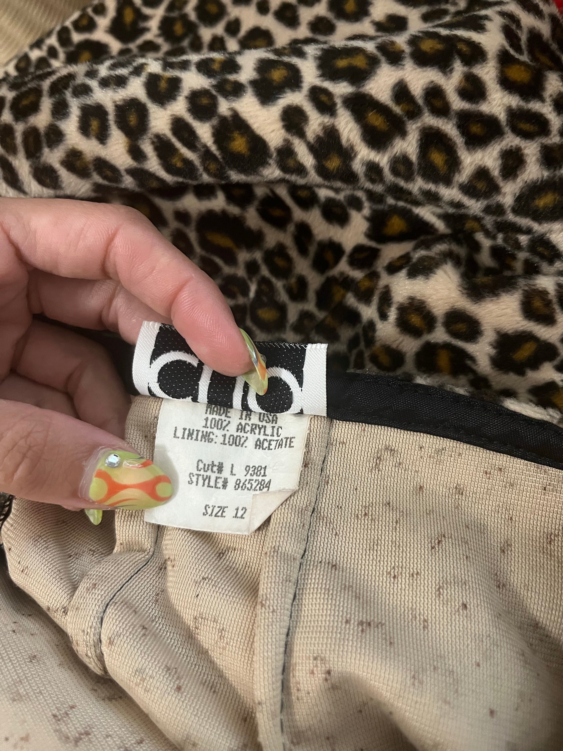 Vintage 90s fuzzy cheetah mini skirt. Closet staple that pairs well with everything! Has a zipper and button closure in the back. By Clio. Tag size 12, 100% Acrylic. Made in USA. Best fits a M-L. Seen on Max (fit was loose on the waist, seen worn mid-rise).