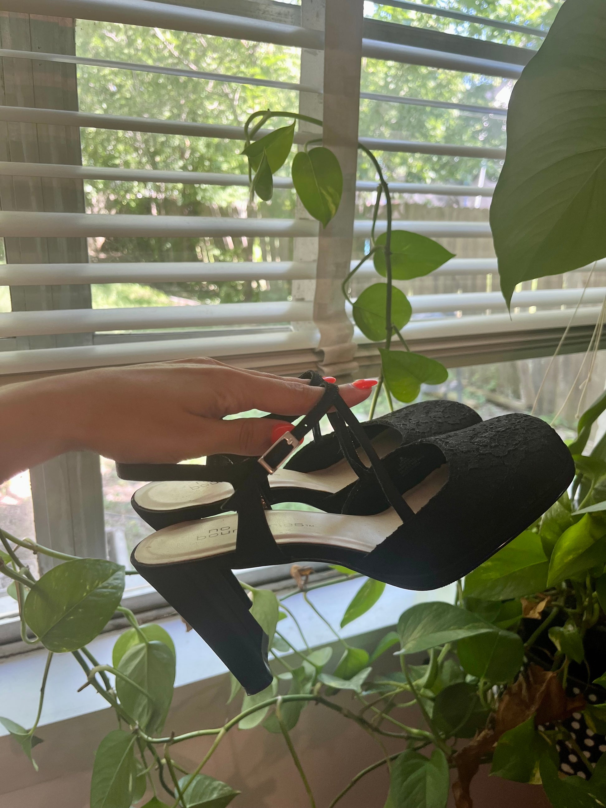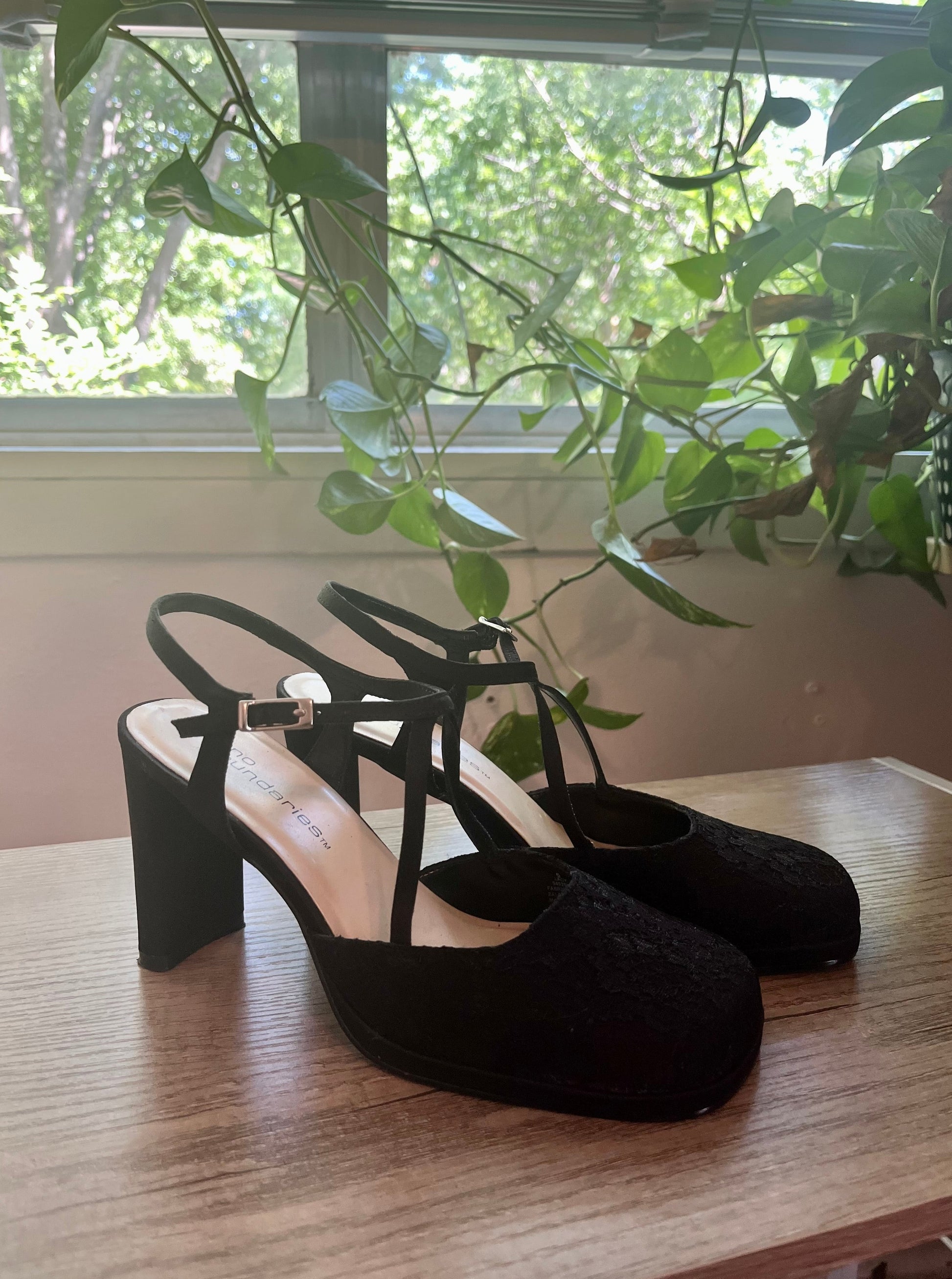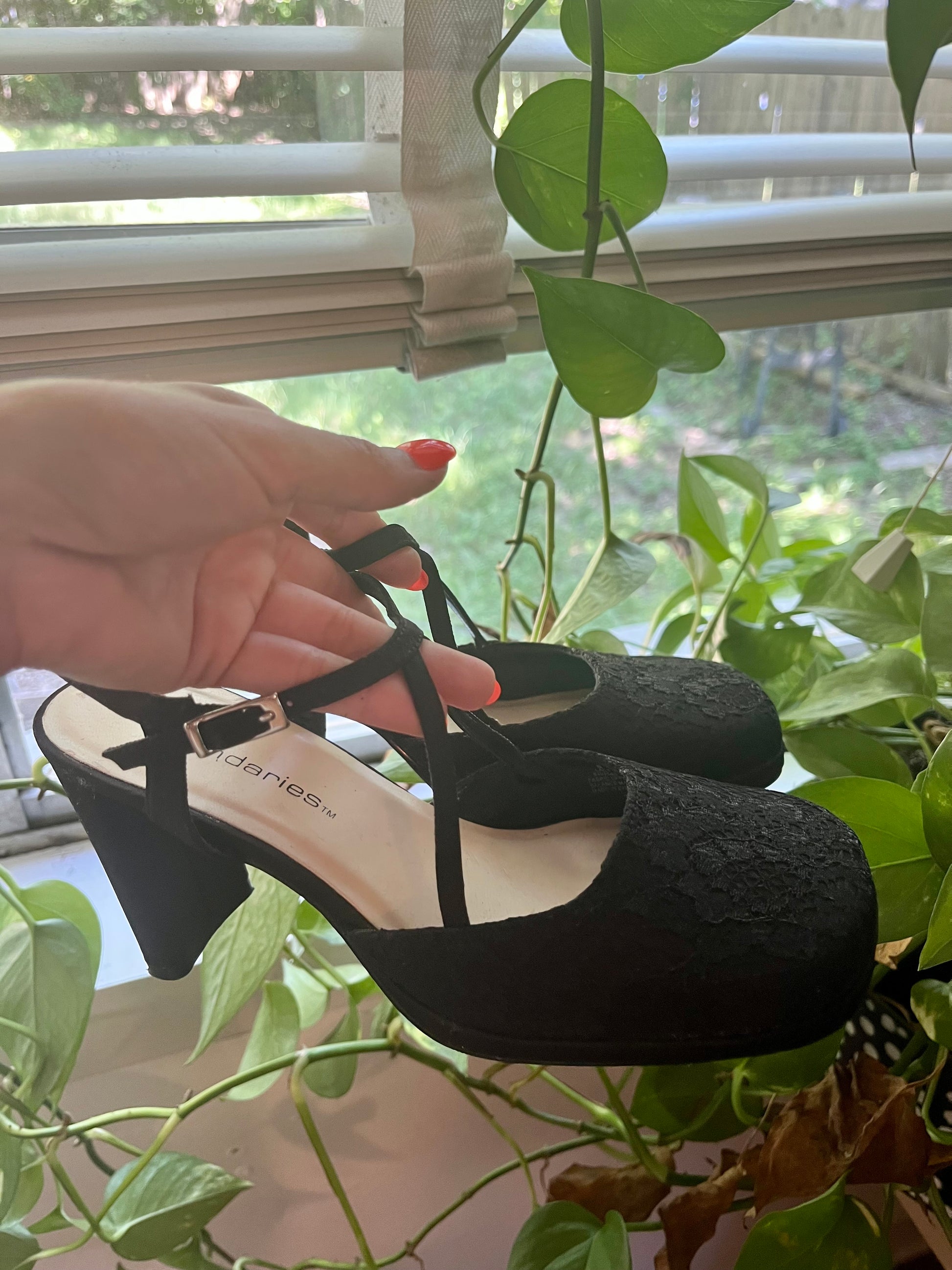 Vintage 90s strappy mary jane sandals with a lace toe. Super cute goth/ Wednesday Addams vibes. By No Boundaries.