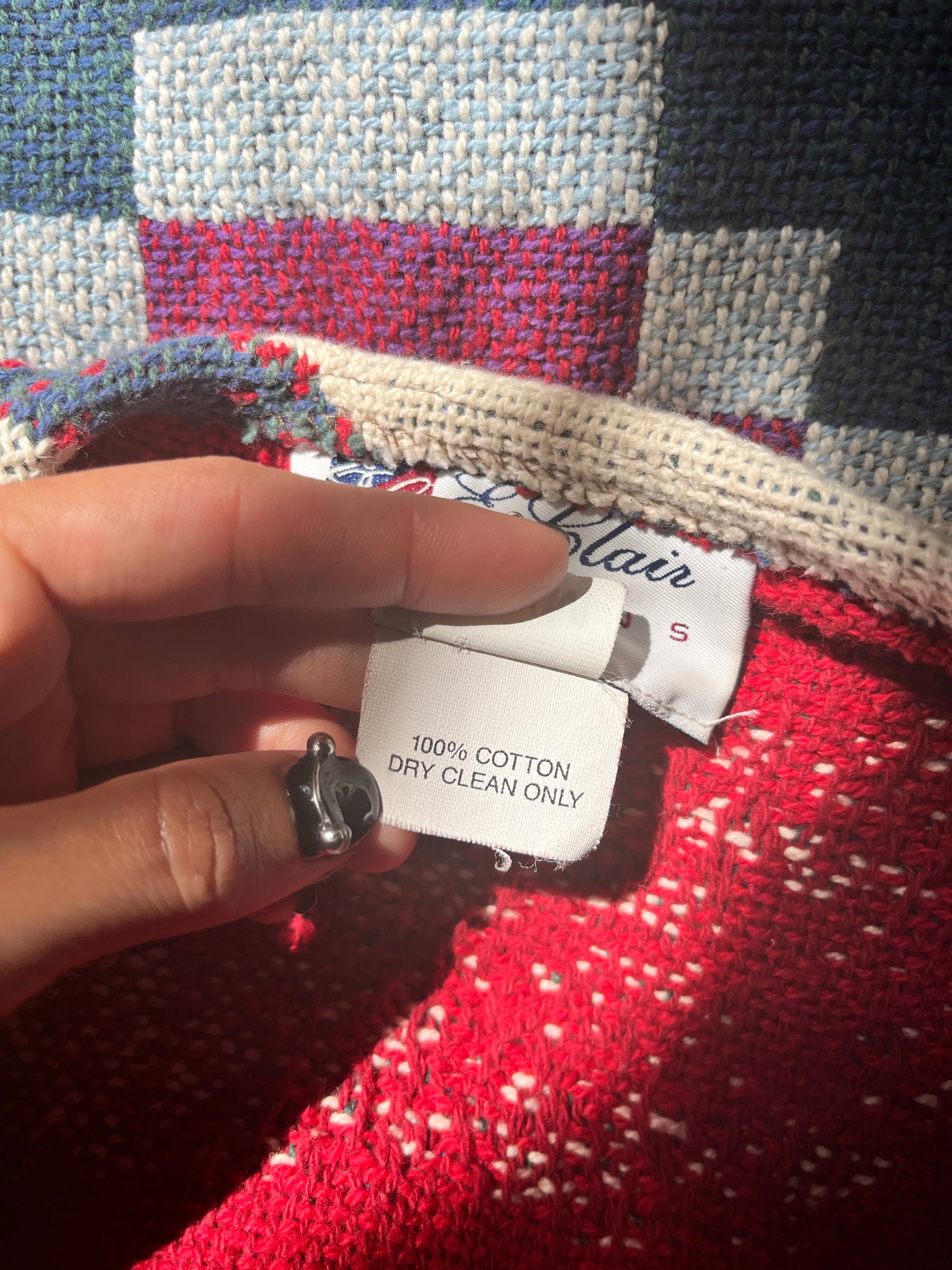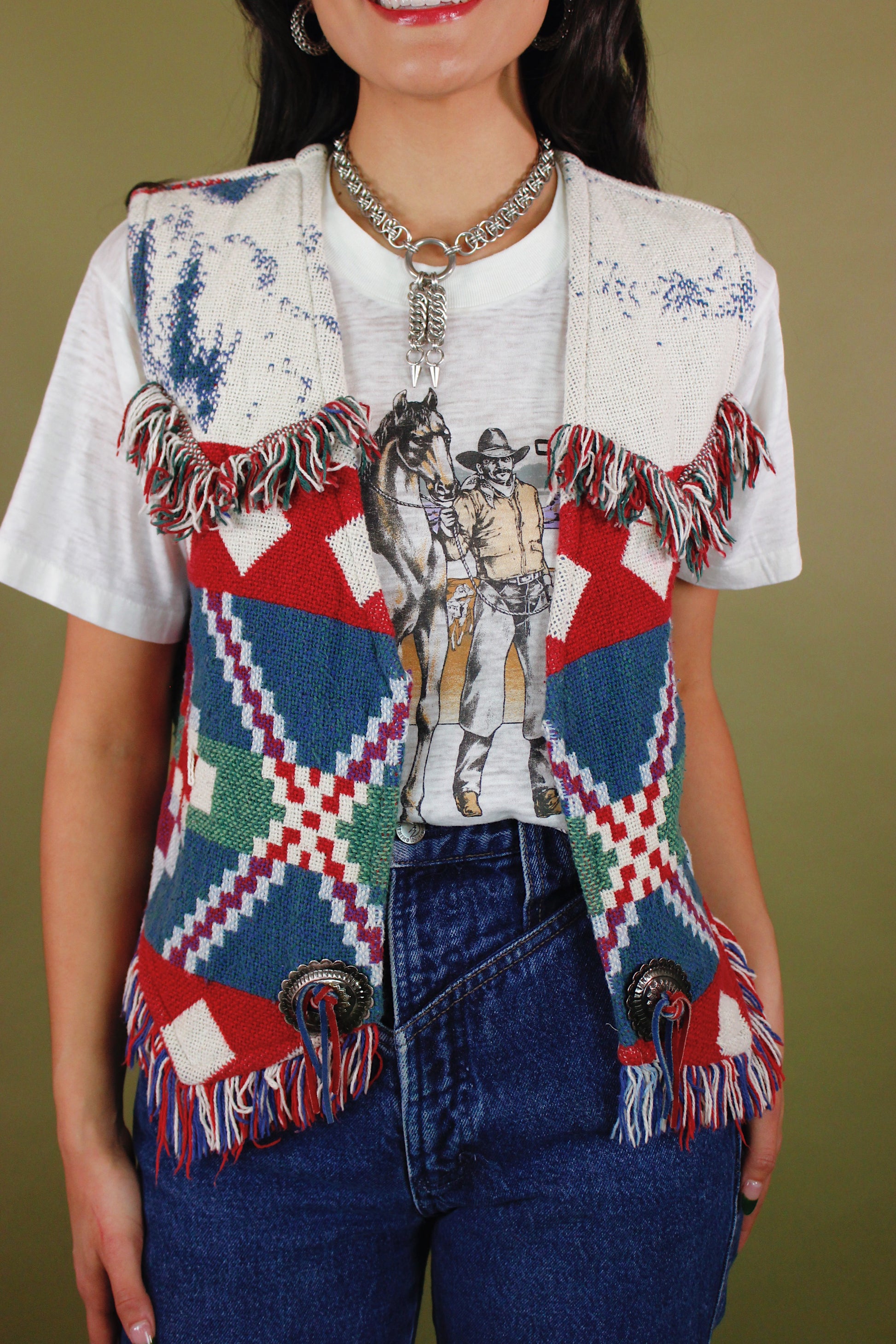 Vintage 90s quilt patterned blanket/ tapestry vest with fringe & concho details. Vibrant color palette and looks so good layered! By E. Clair Designs Austin, Texas. Tag size S/M, 100% Cotton. Best fits a S-M. Seen on Sarah.